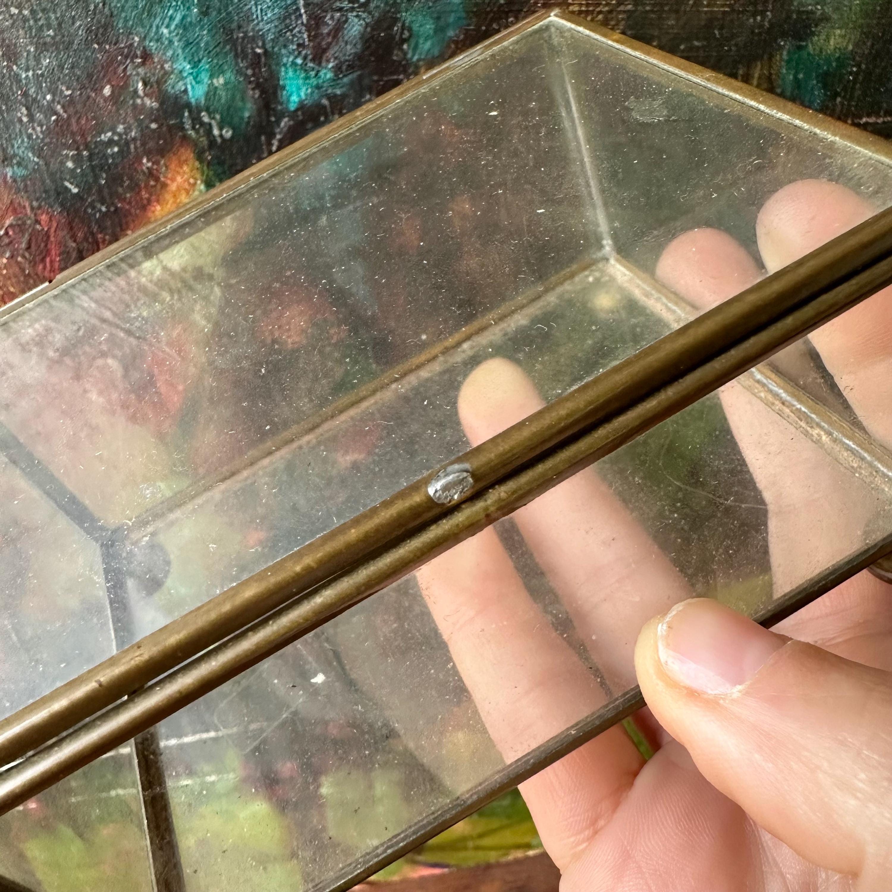 The box is in good condition for its age and use. The brass has tarnished all over. The glass is mostly clear with no cracks. The lid opens and shuts easily. It looks like the front latch is missing as there's a welding mark on the front where it would normally be.