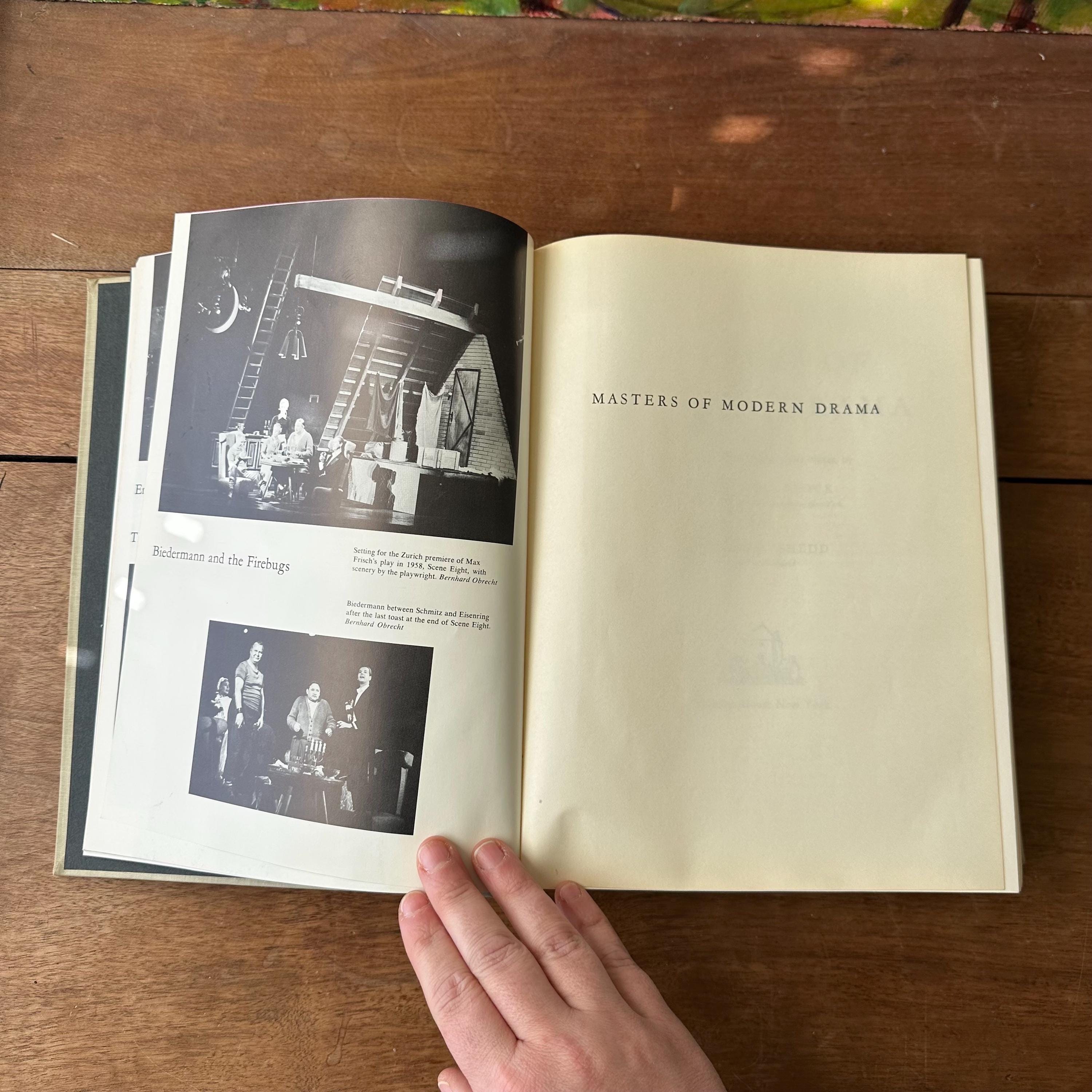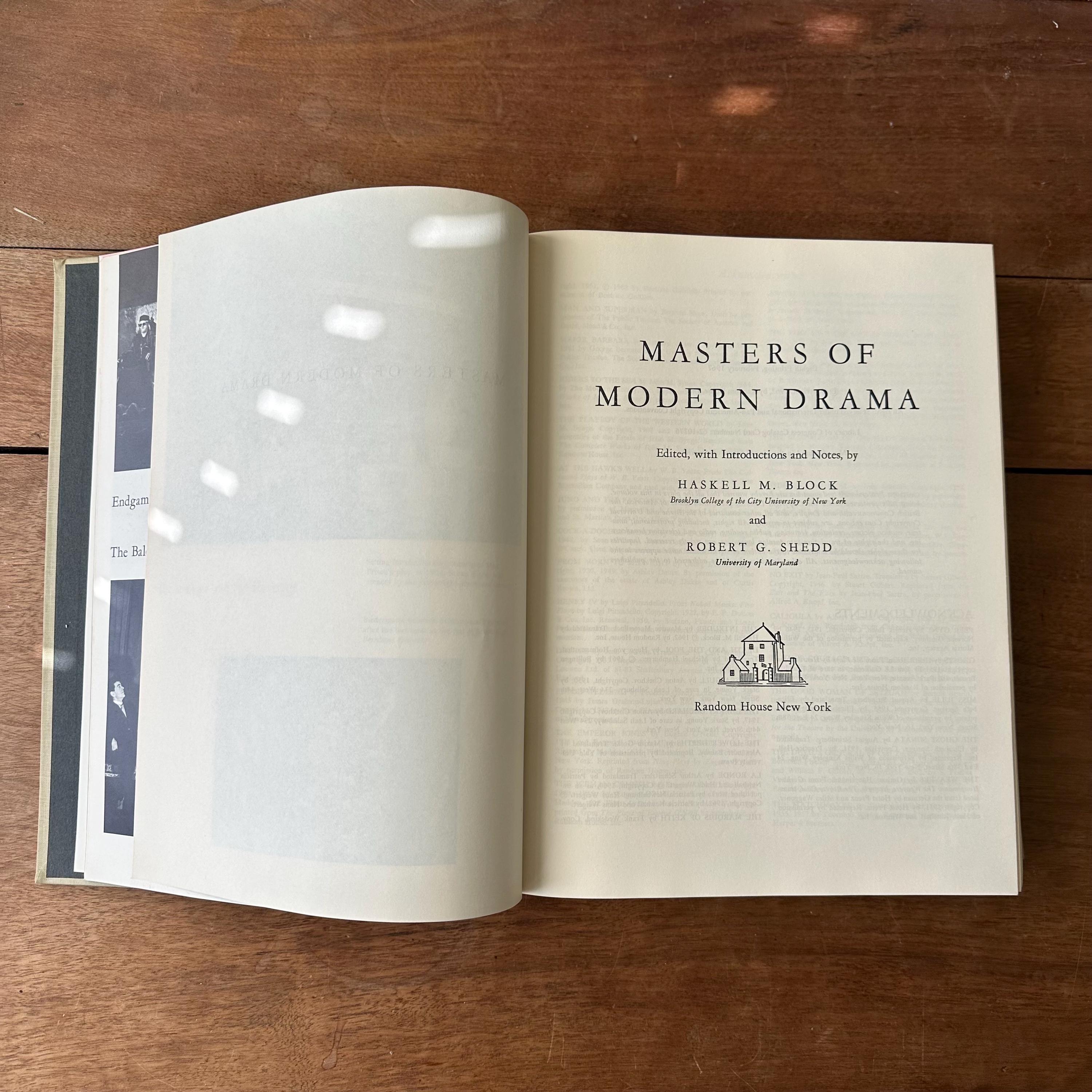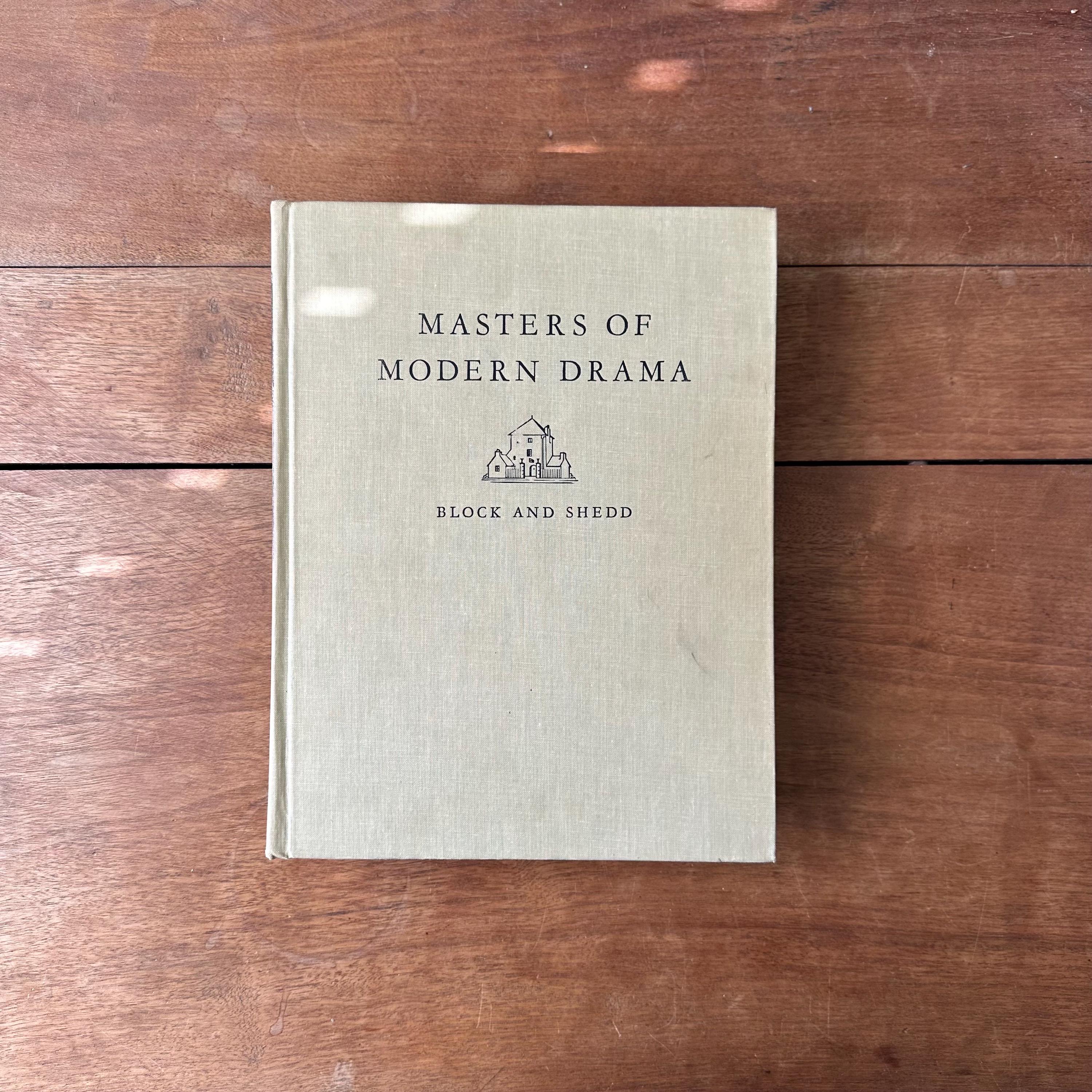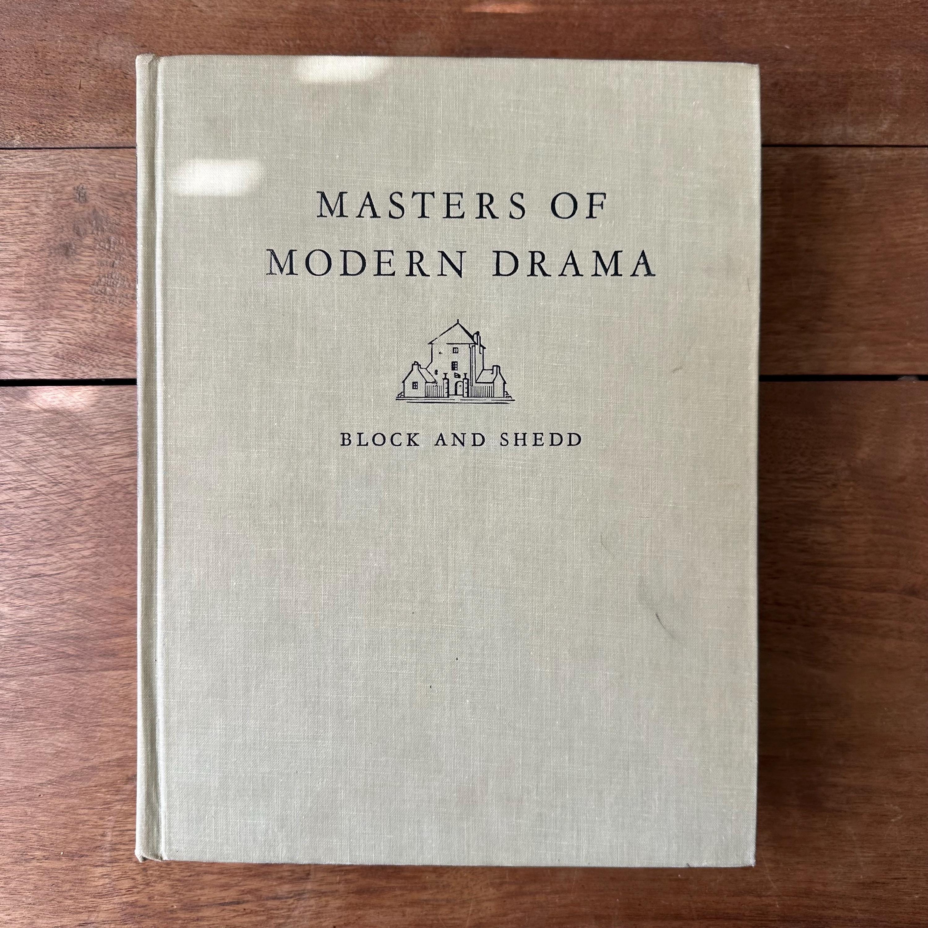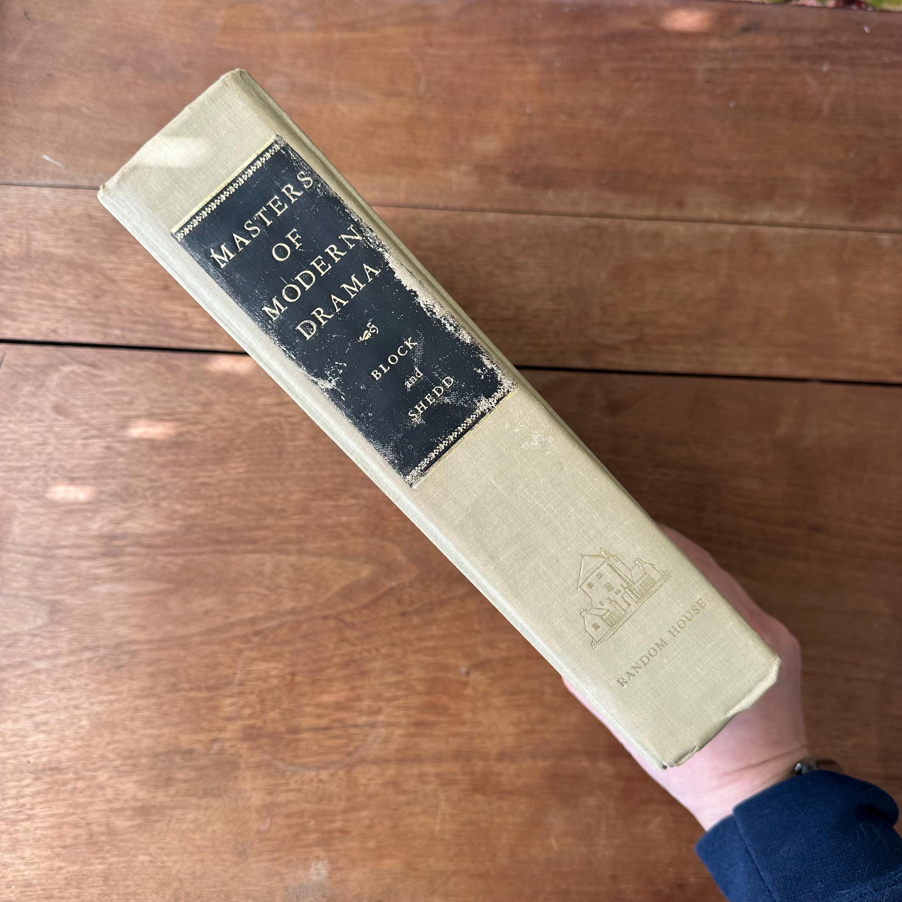 This is the 1962 edition of Msters of Modern Drama by Block and Shedd, published by Random House. The book has a grey cover with lettering in black. The spine has a black box for the title, which is lettered in gold. It includes the play scripts of popular playwrights like Ibsen, Anton Chekhov, Sartre, Bernard Shaw, Eugene O'Neill, Berthold Brecht, Thorton Wilder, Tennessee Williams, Arthur Miller, Samuel Beckett, and more. The plays are included in their entirety. The book begins with a large section of black and white photographs of the stage-version of the various plays. There are 1198 pages.