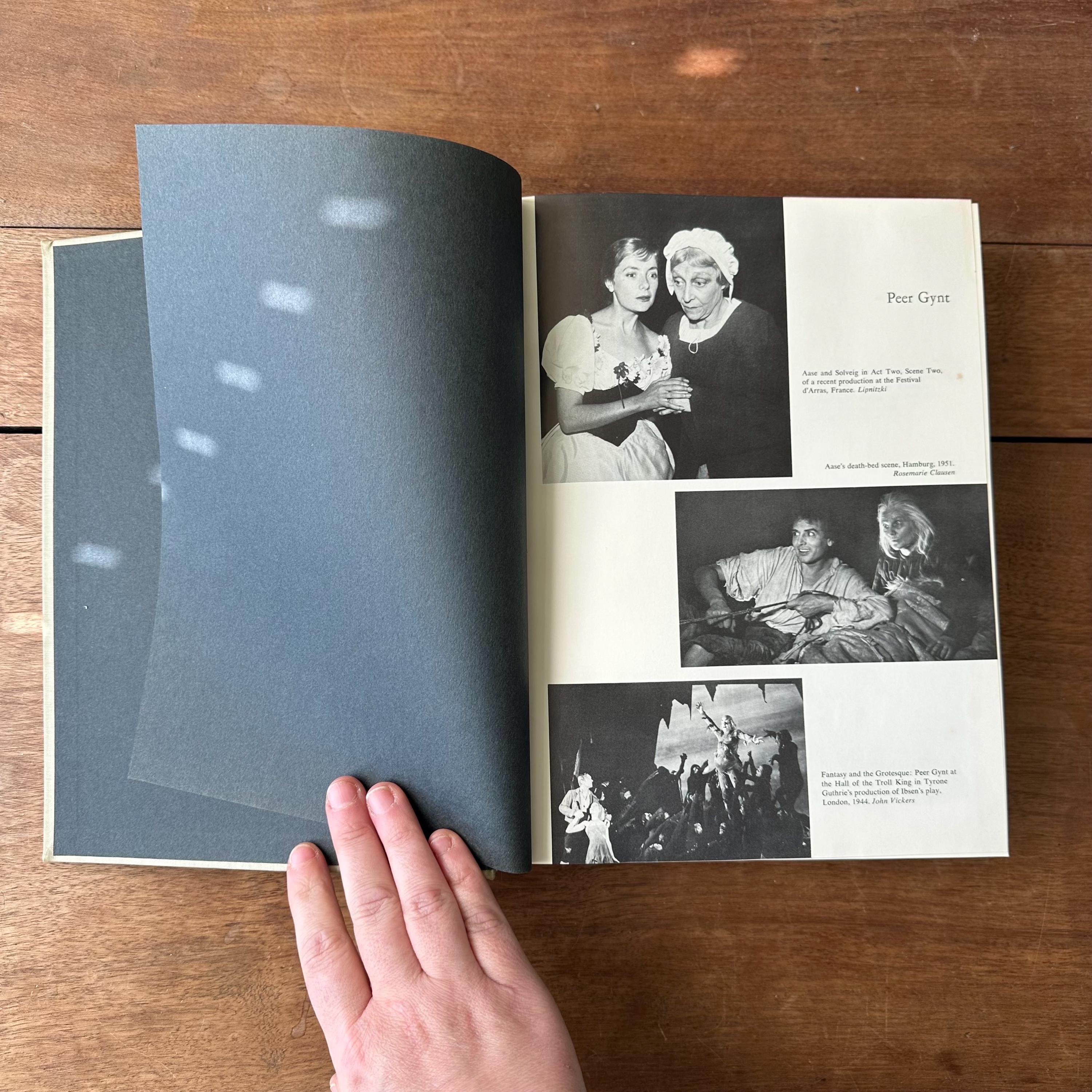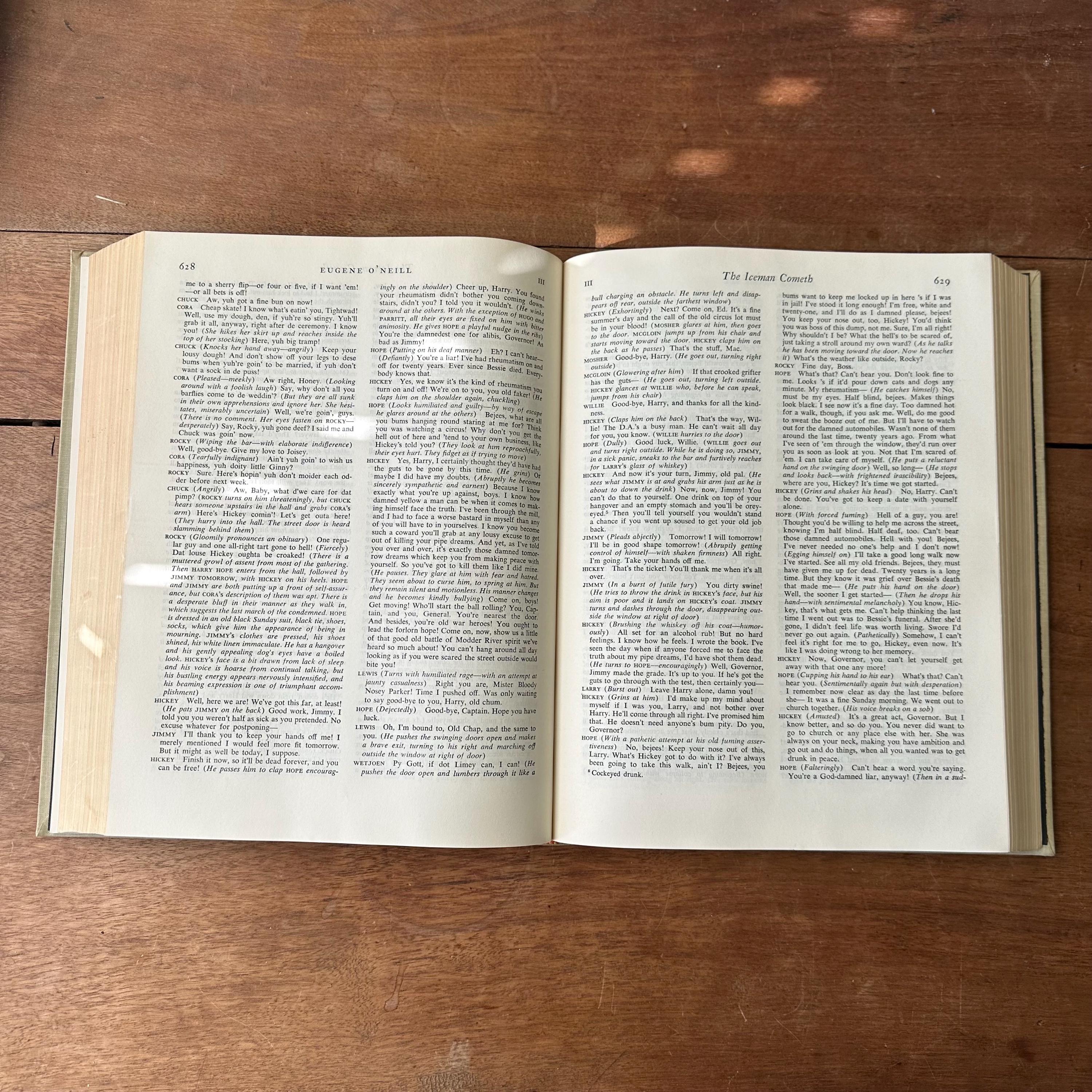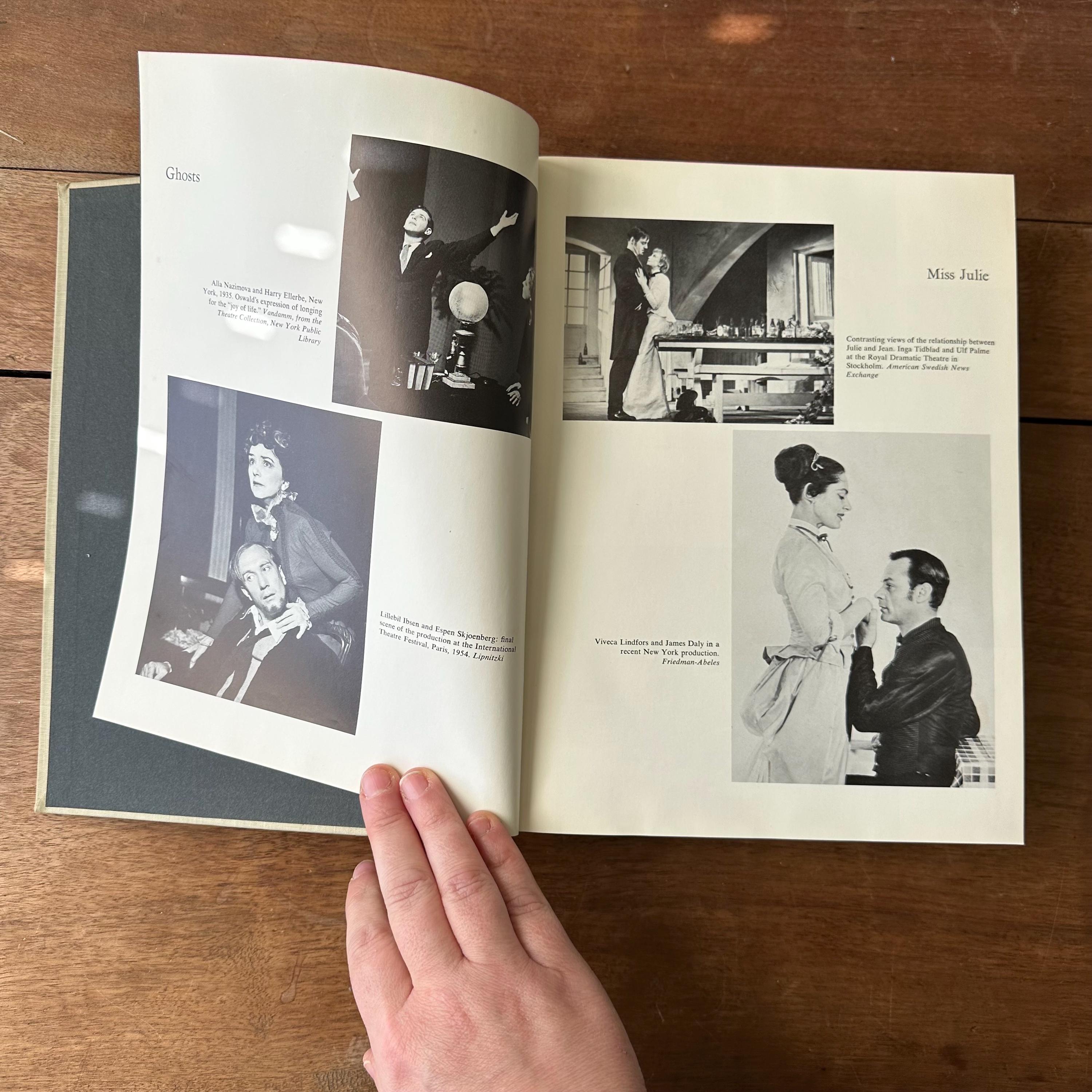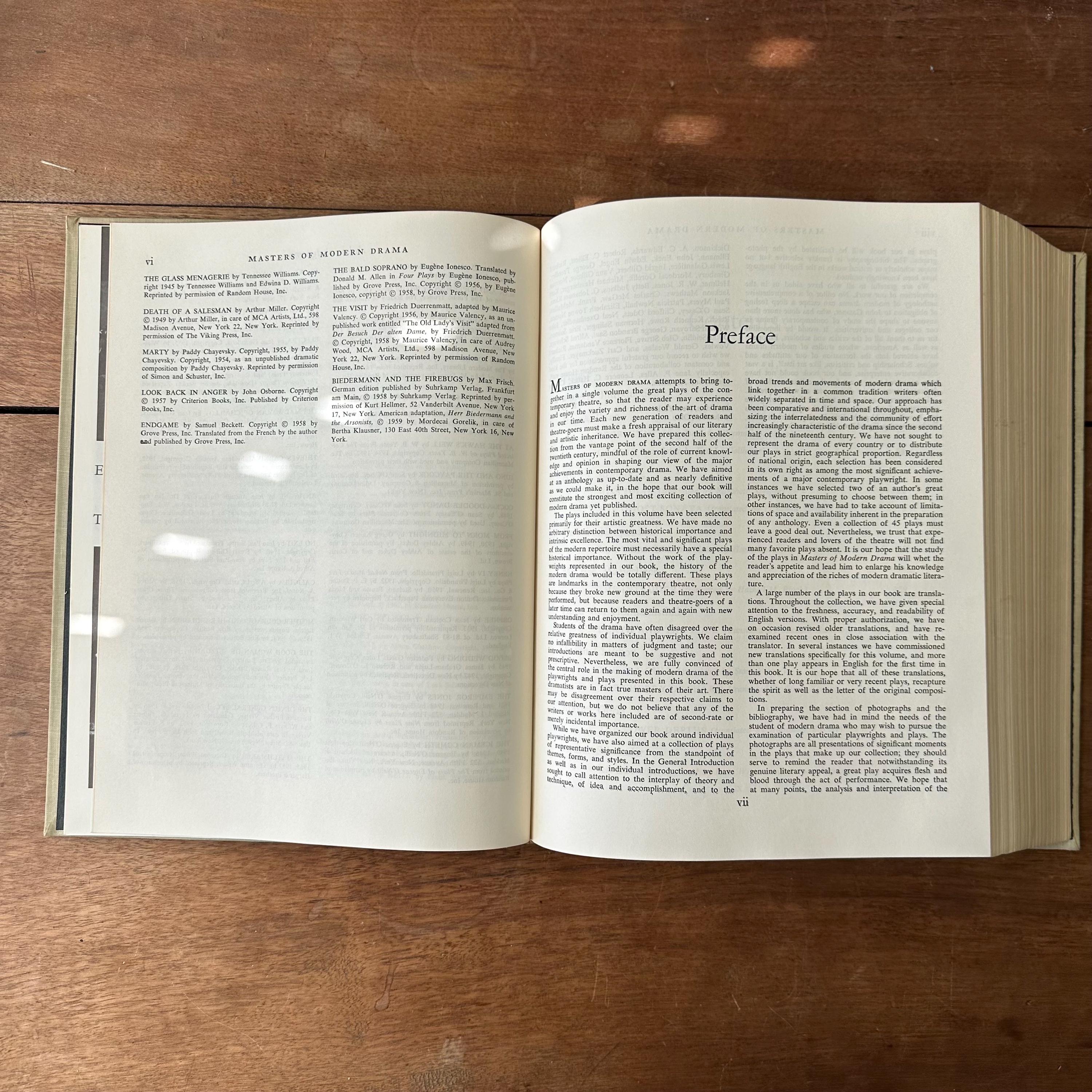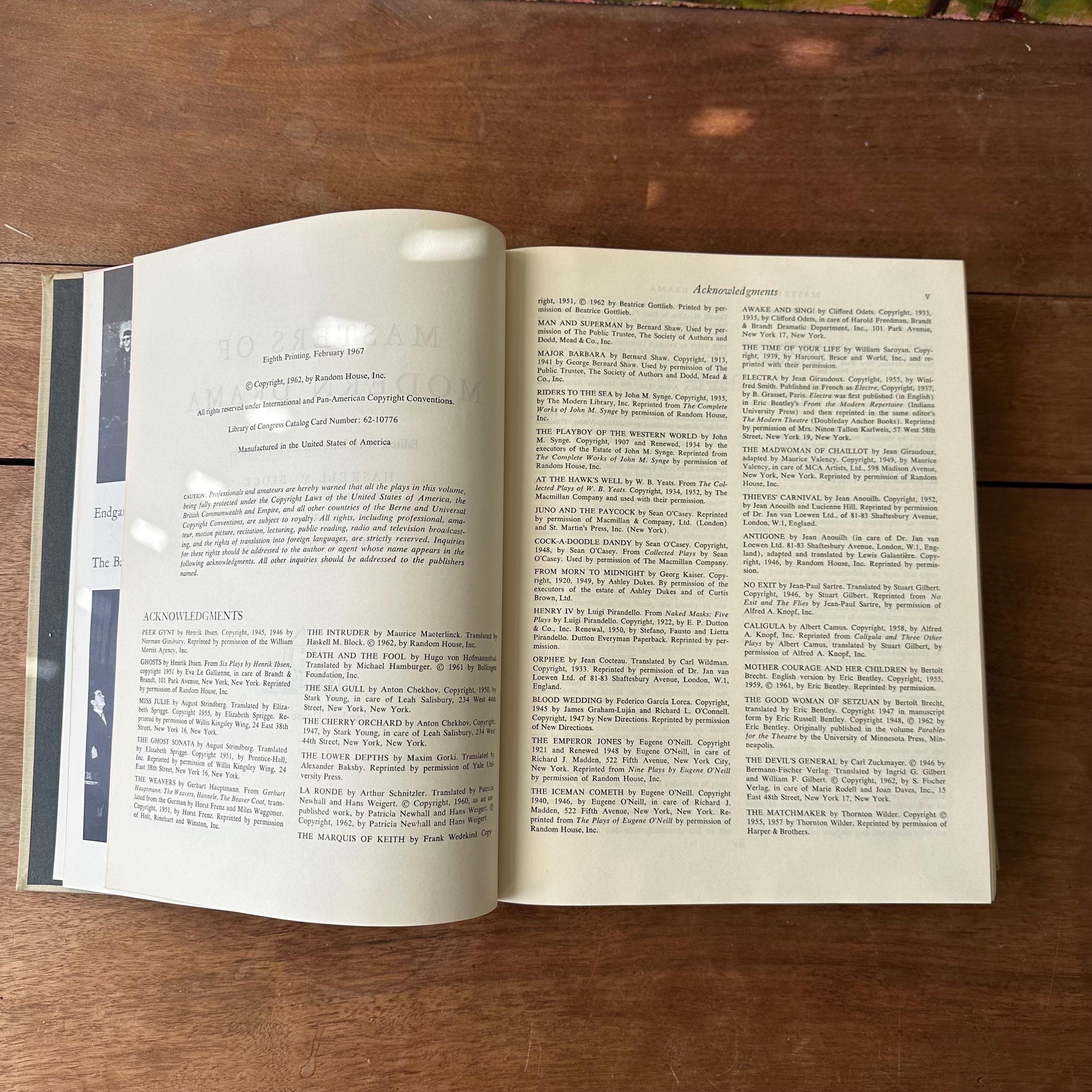 This is the 1962 edition of Msters of Modern Drama by Block and Shedd, published by Random House. The book has a grey cover with lettering in black. The spine has a black box for the title, which is lettered in gold. It includes the play scripts of popular playwrights like Ibsen, Anton Chekhov, Sartre, Bernard Shaw, Eugene O'Neill, Berthold Brecht, Thorton Wilder, Tennessee Williams, Arthur Miller, Samuel Beckett, and more. The plays are included in their entirety. The book begins with a large section of black and white photographs of the stage-version of the various plays. There are 1198 pages.