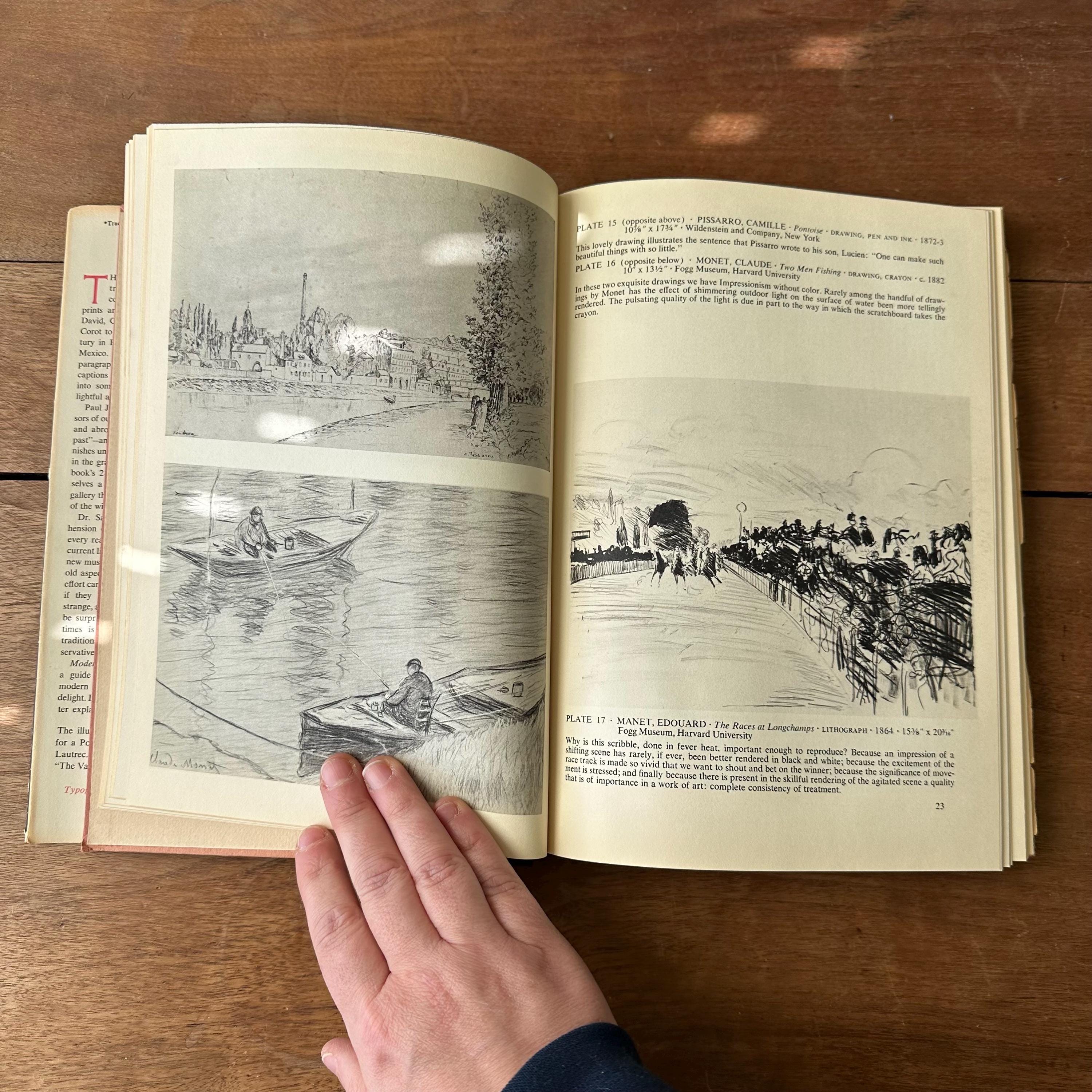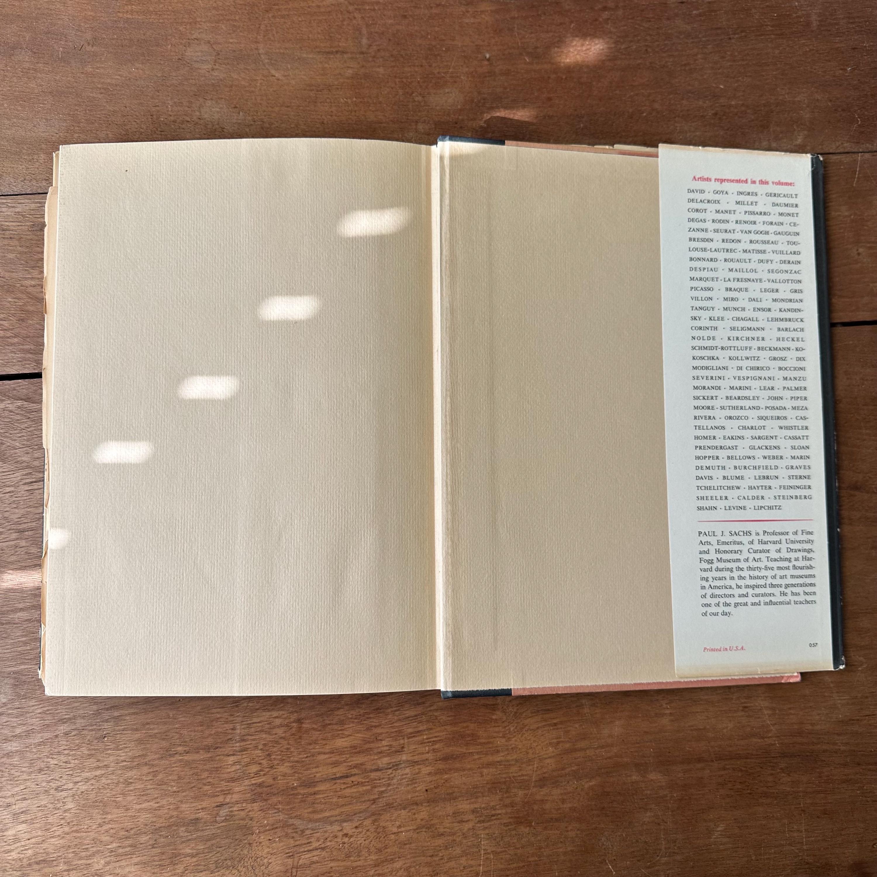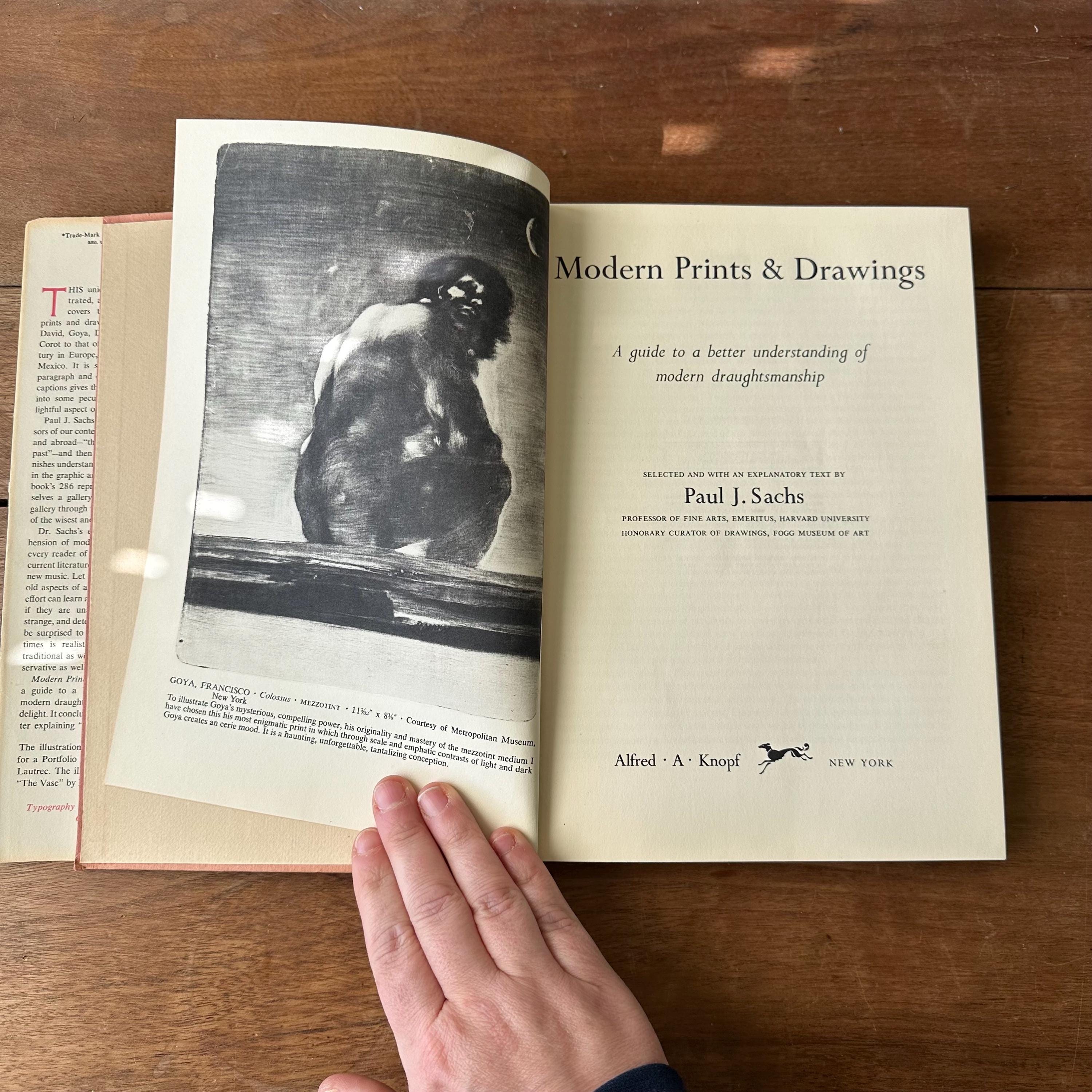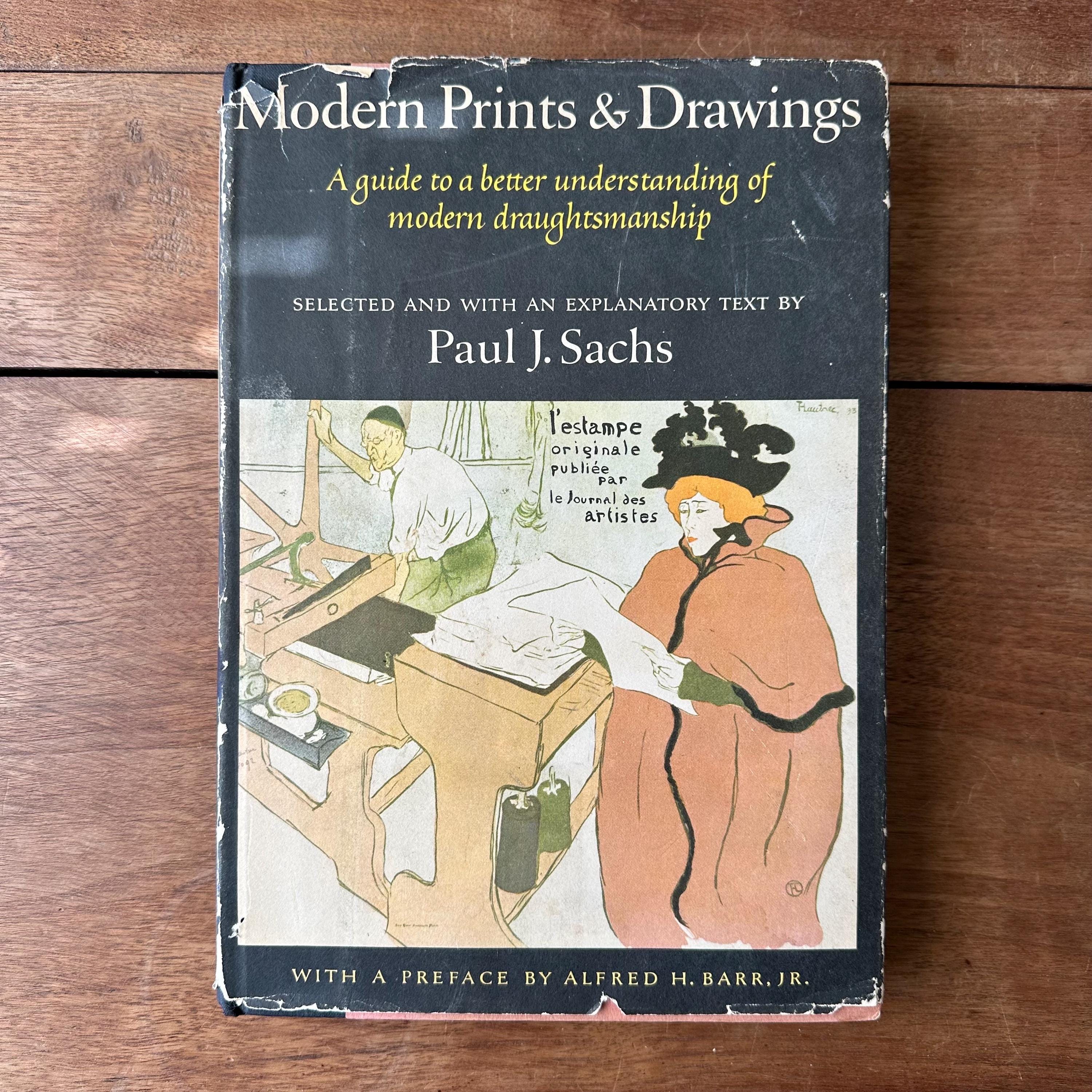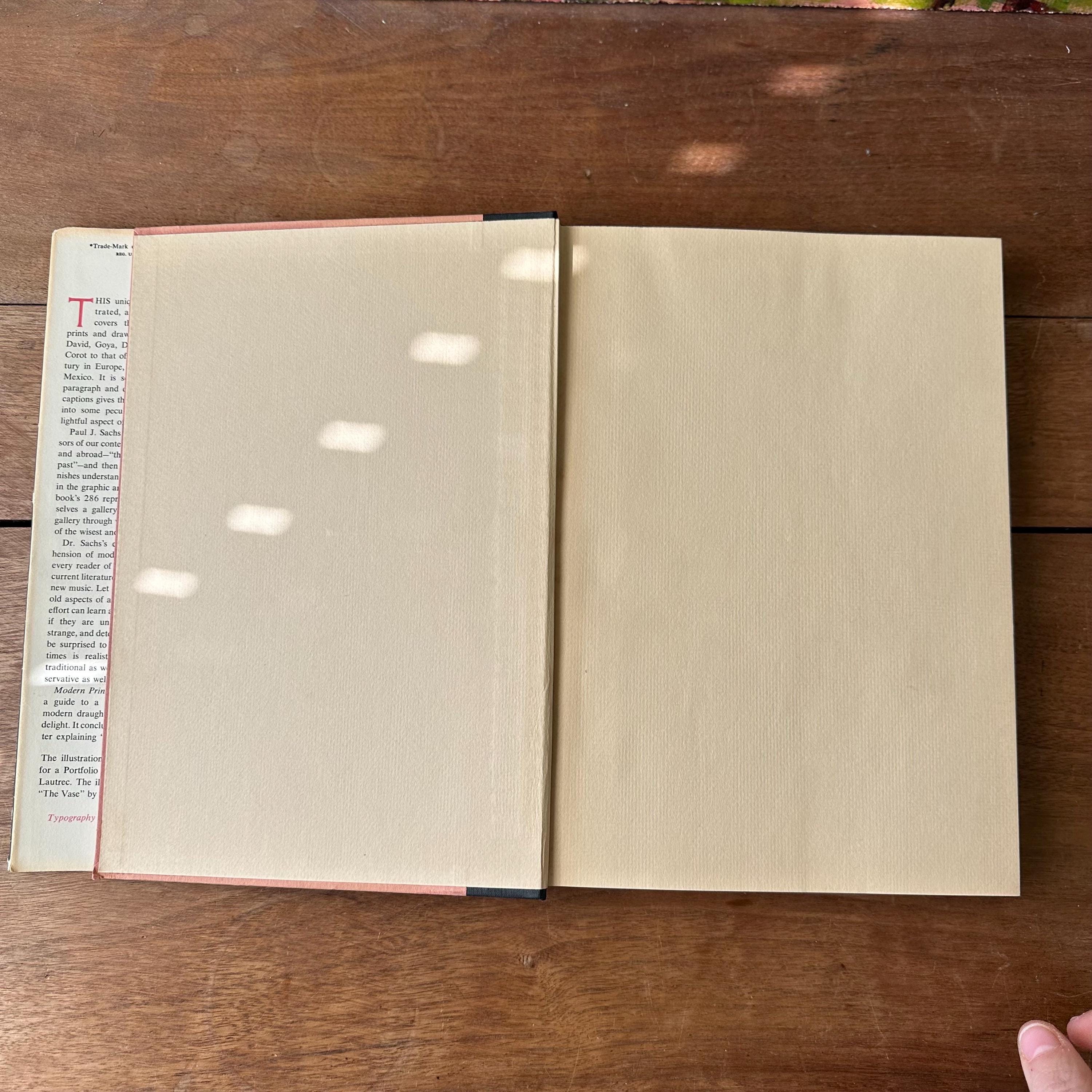 This is the 1954 Modern Prints & Drawings selected and with an explanatory text by Paul J. Sachs, published Alfred A. Knopf. It has the original full color dust jacket with a print by Toulouse-Lautrec. Underneath the covers are pink with a black spine and gold lettering. The book is filled with black and white prints from famous artists like Picasso, Van Gogh, and Monet as well as artists from other countries like Italy and Mexico. There is one separate print of a gargoyle that has been tucked in the pages. There are 261 pages.