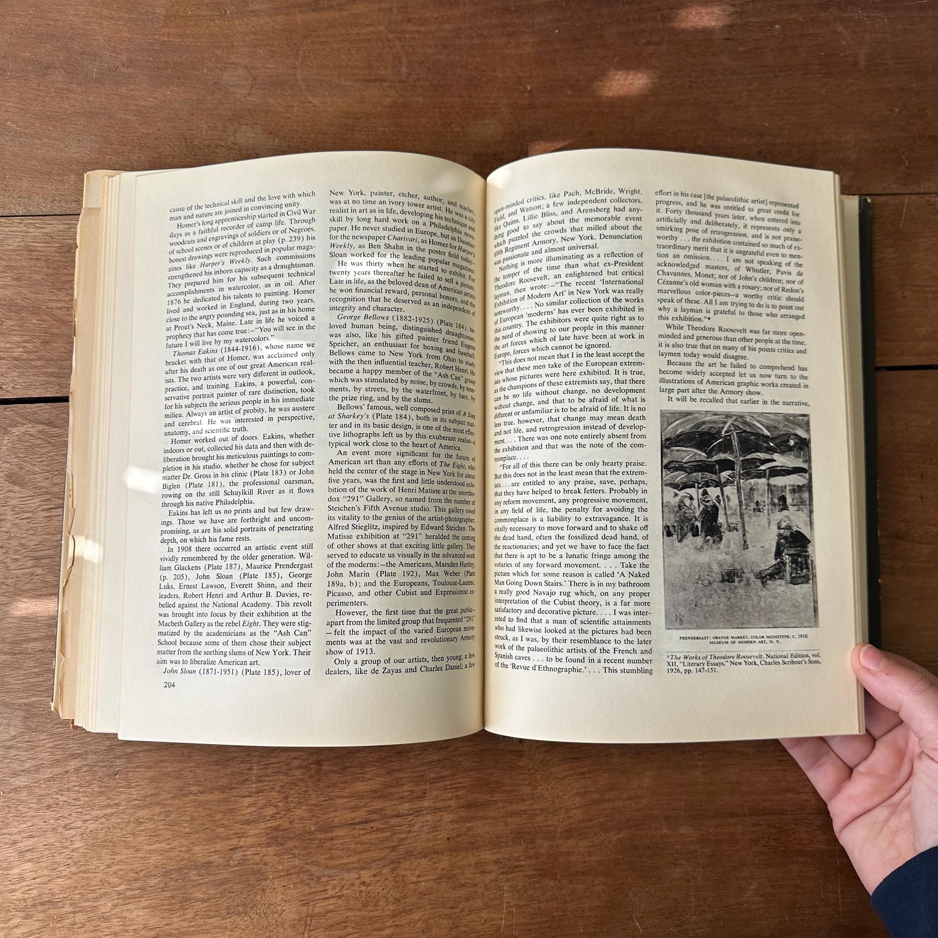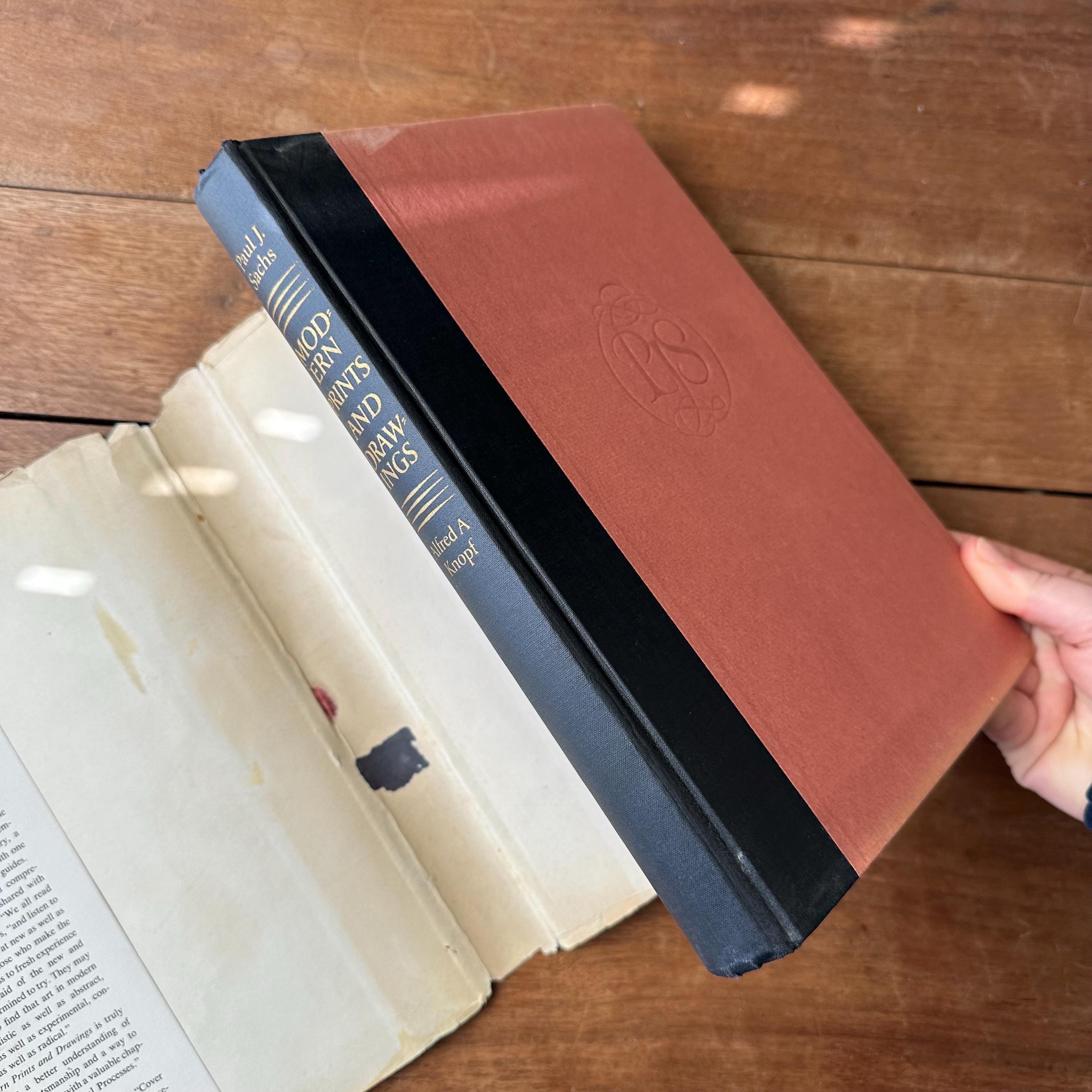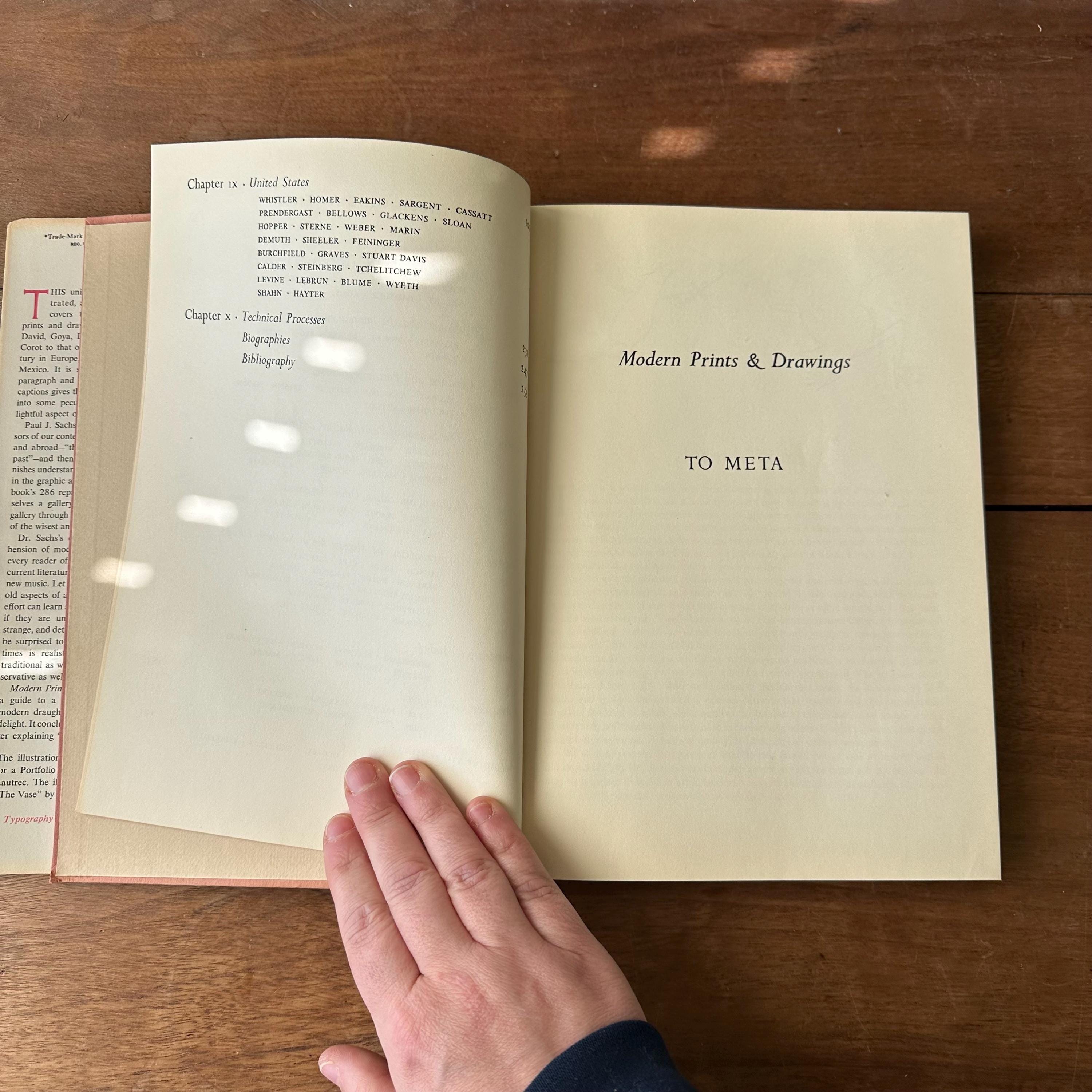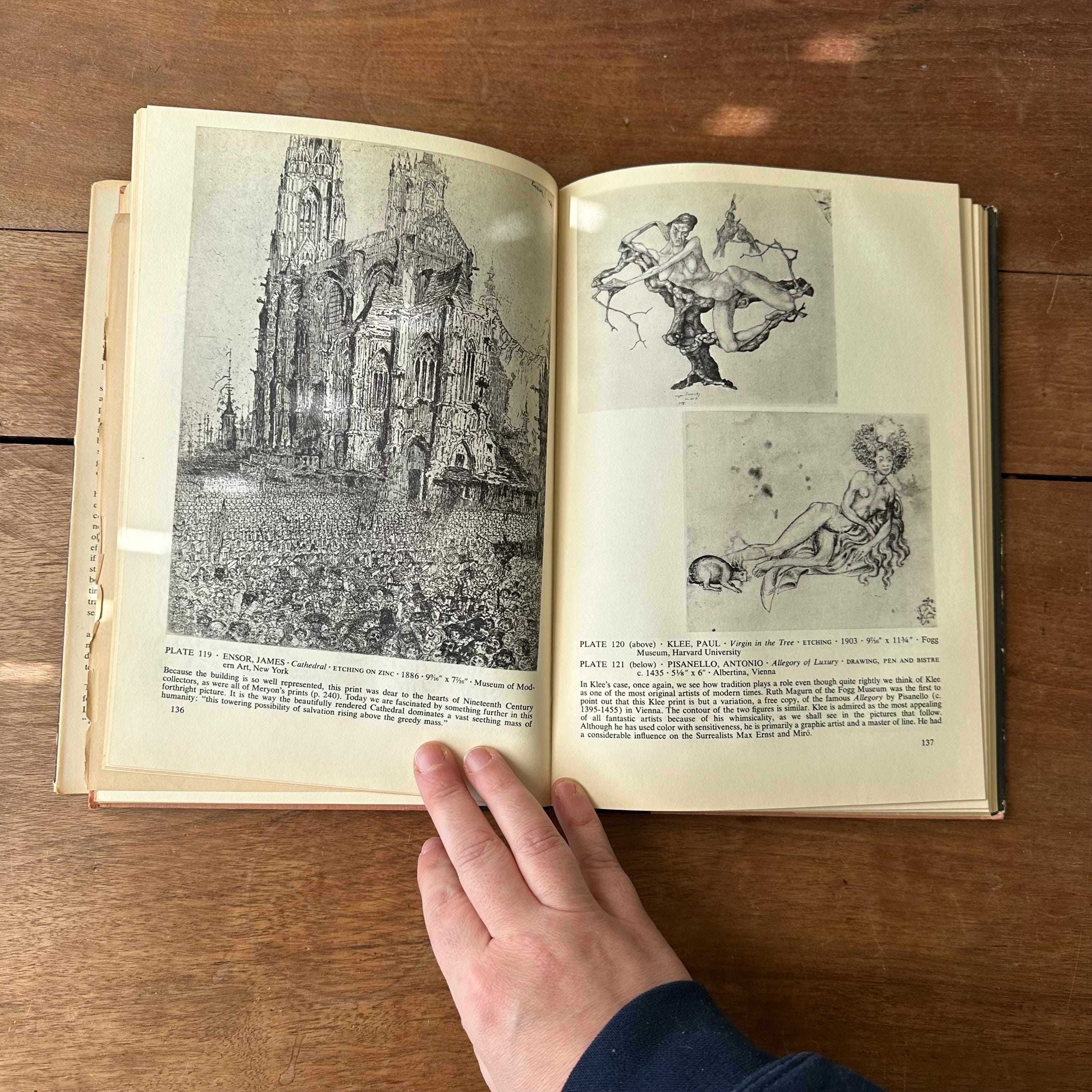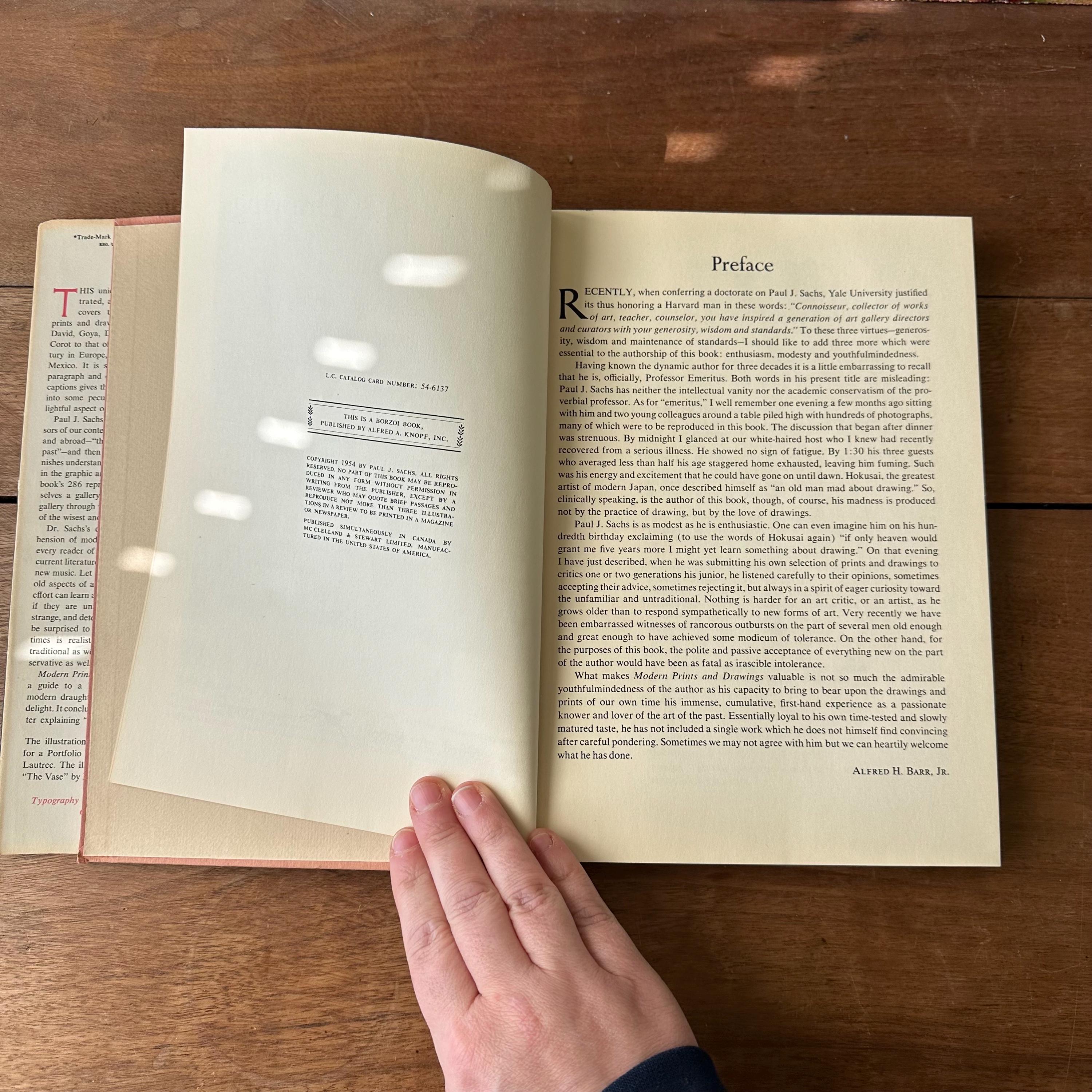 This is the 1954 Modern Prints & Drawings selected and with an explanatory text by Paul J. Sachs, published Alfred A. Knopf. It has the original full color dust jacket with a print by Toulouse-Lautrec. Underneath the covers are pink with a black spine and gold lettering. The book is filled with black and white prints from famous artists like Picasso, Van Gogh, and Monet as well as artists from other countries like Italy and Mexico. There is one separate print of a gargoyle that has been tucked in the pages. There are 261 pages.