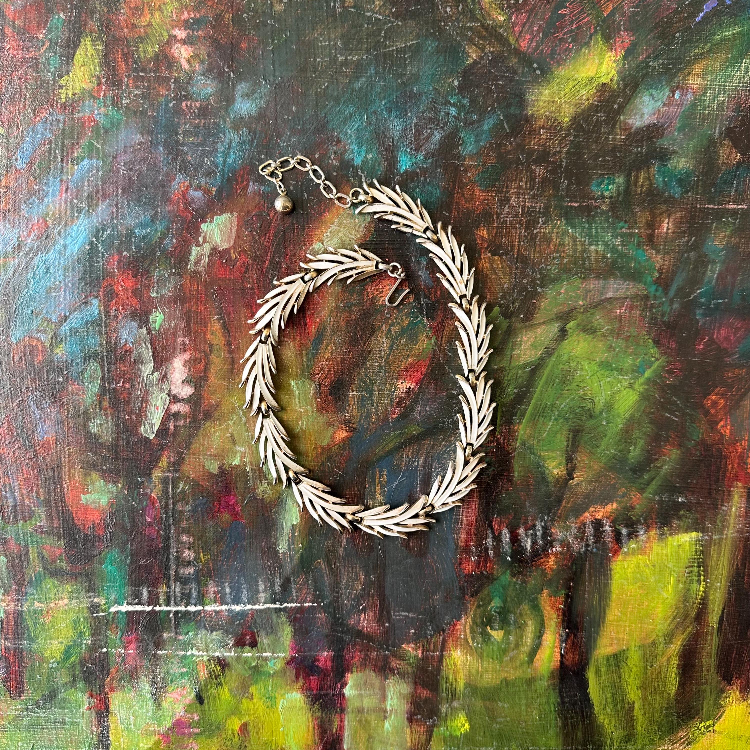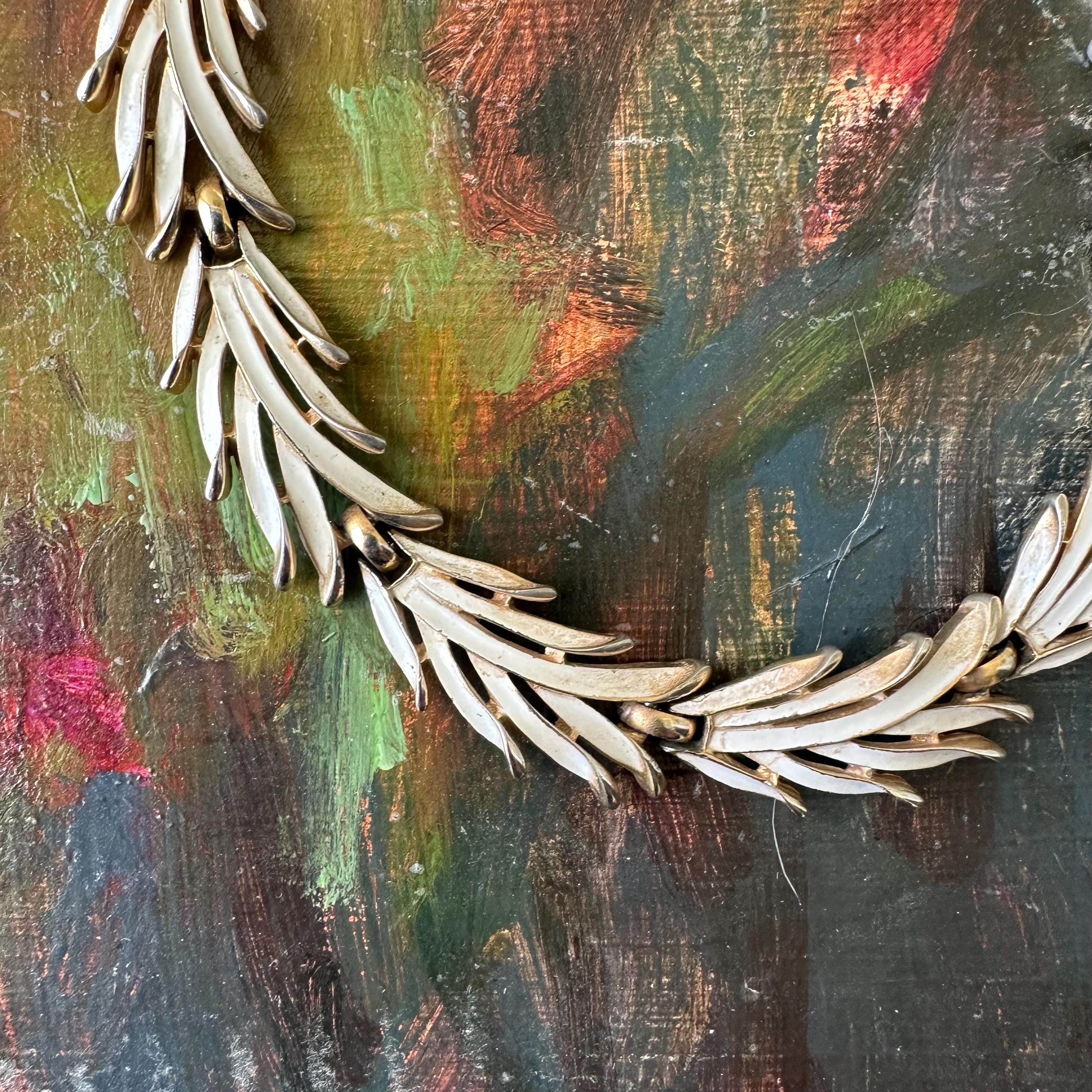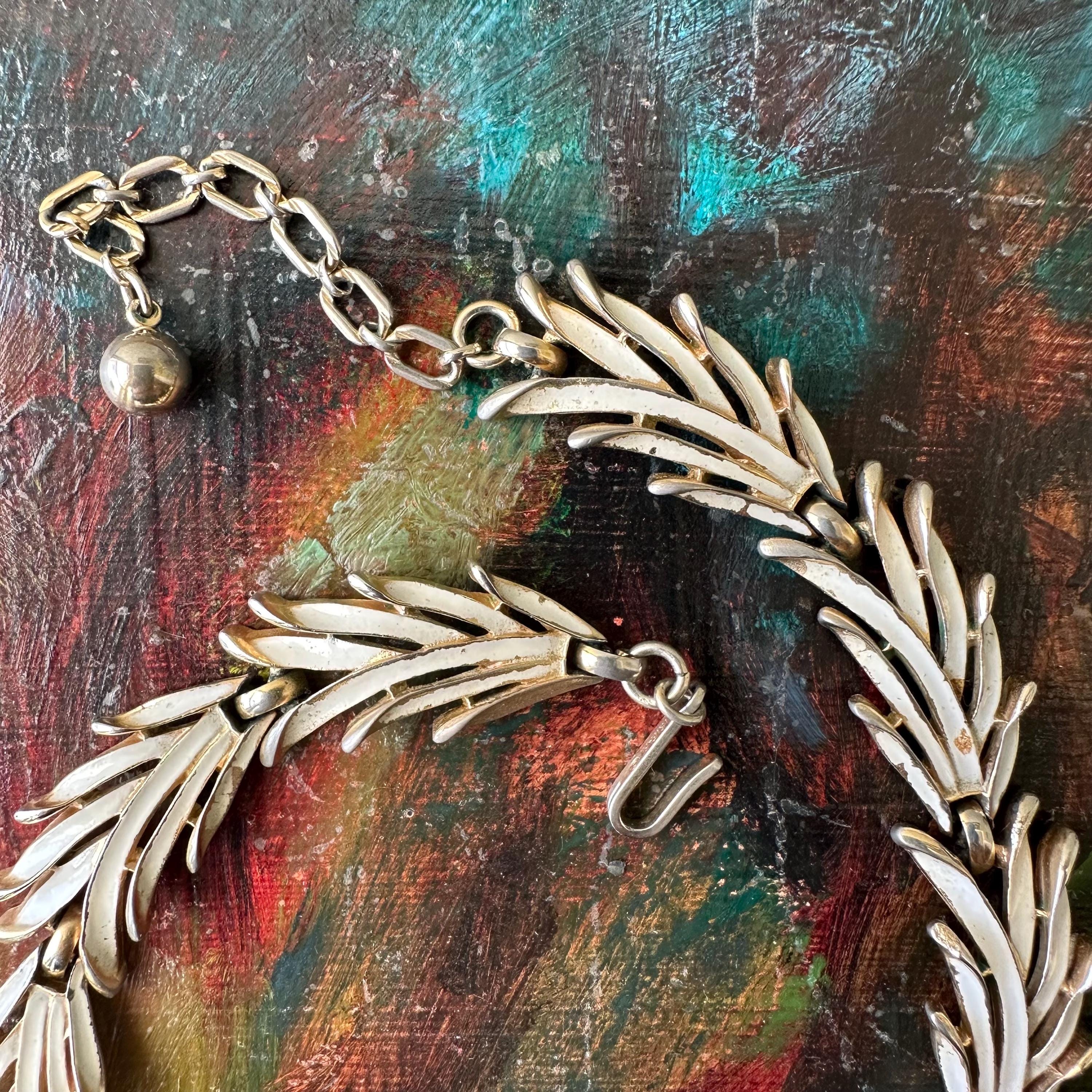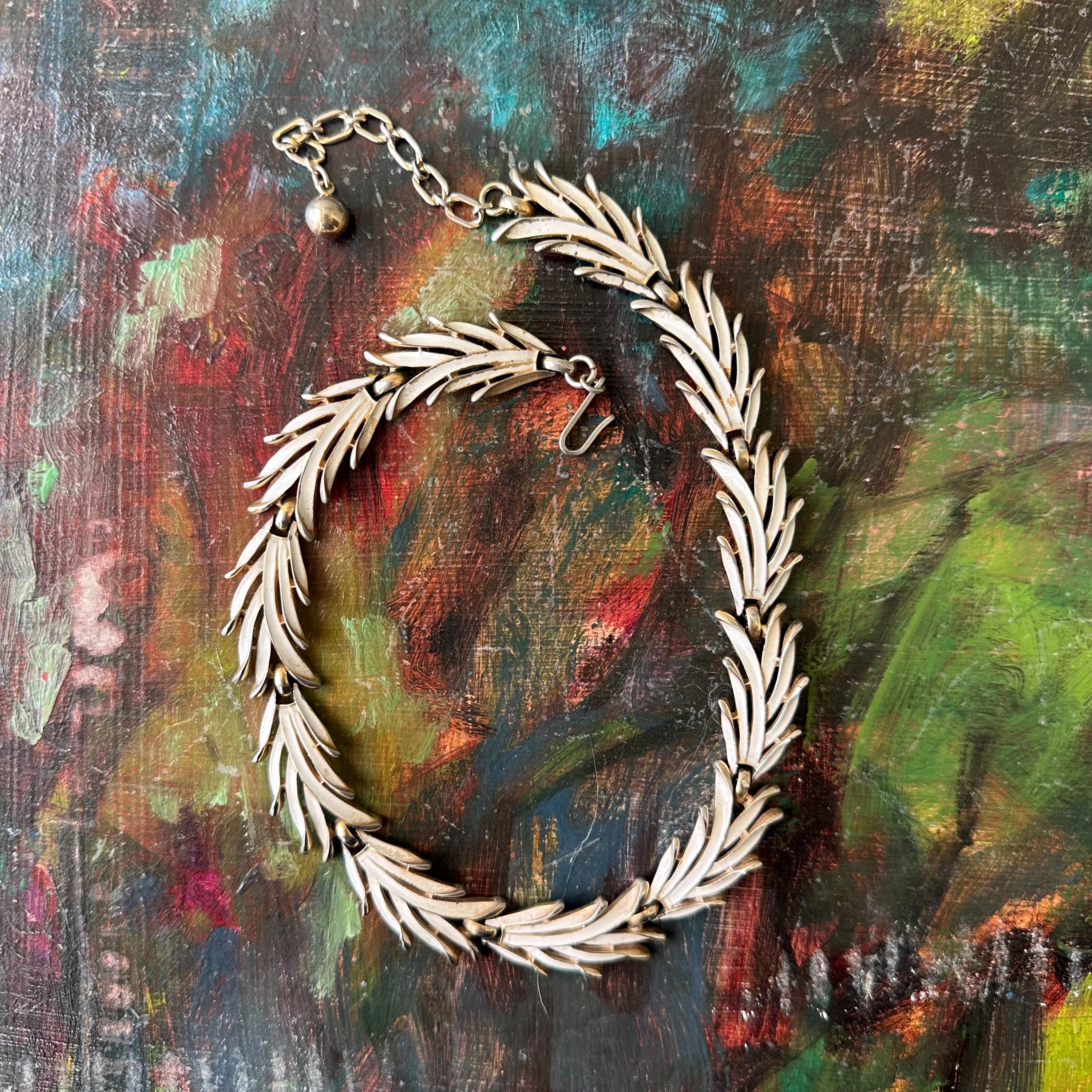 This is a vintage white enamel leaf choker necklace from Trifari. The necklace is made of individual tropical style leaves with white enamel on a gold tone metal backing. Each leaf is attached to the next with a small gold tone metal loop. The necklace has a chain and hook closure. The hook is marked Trifari.