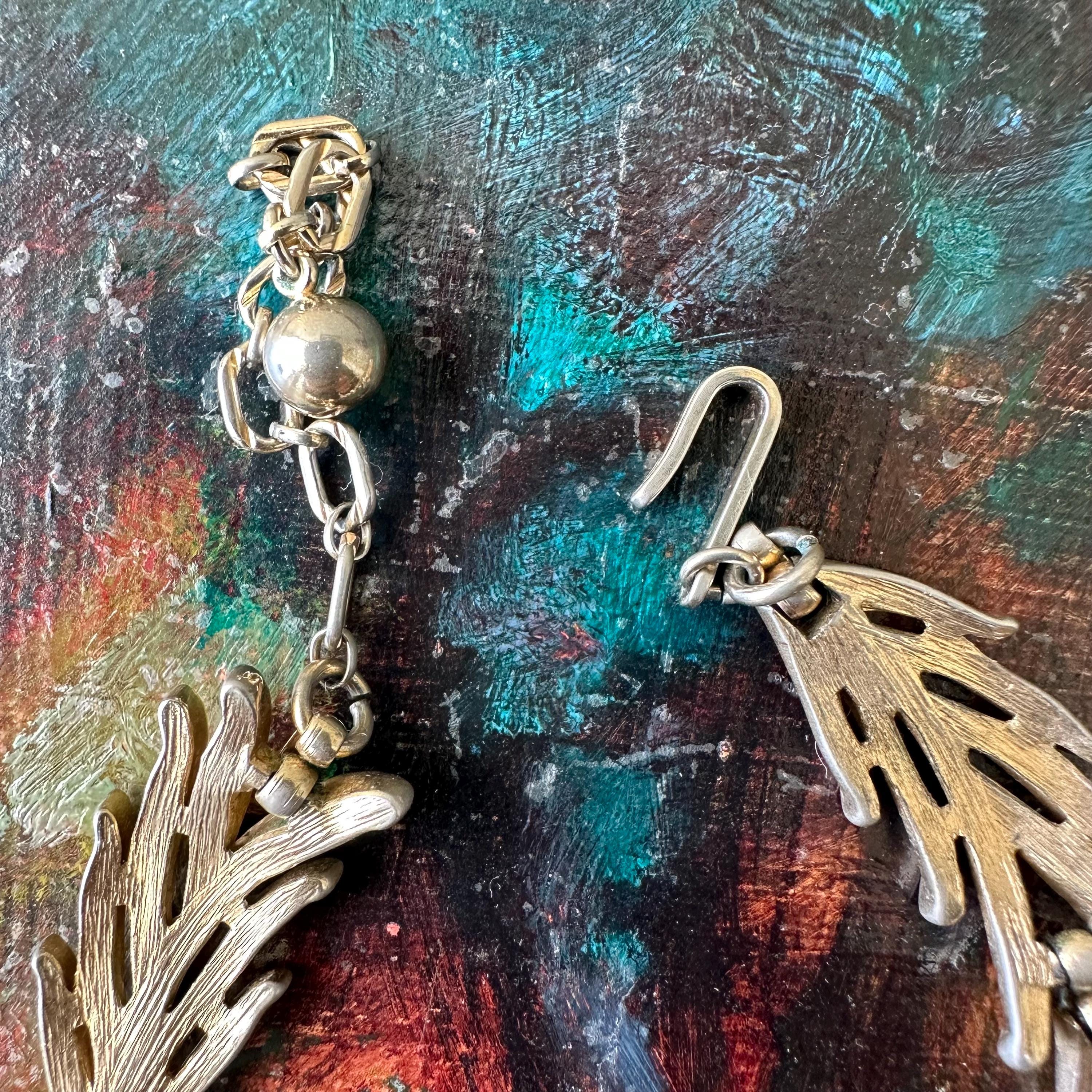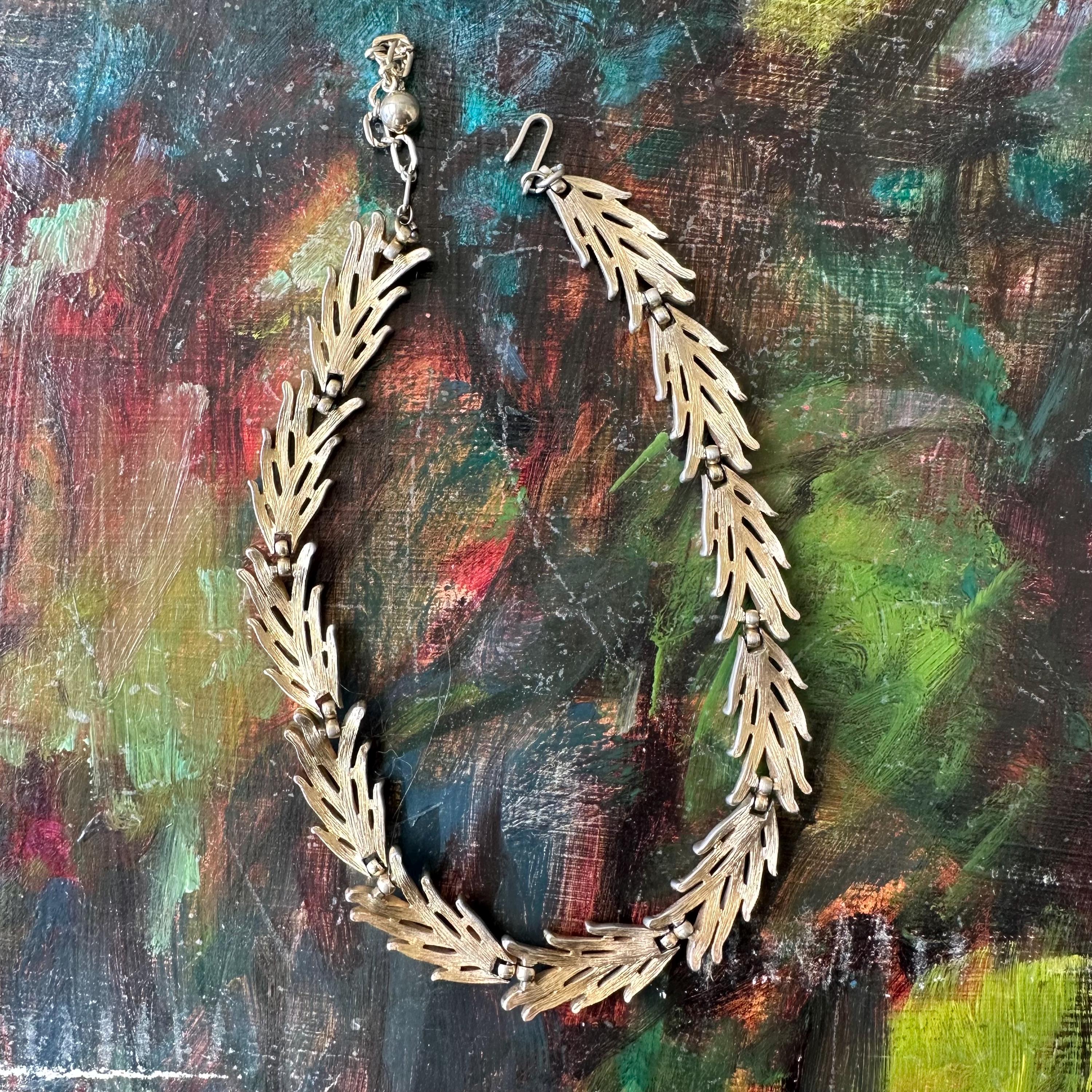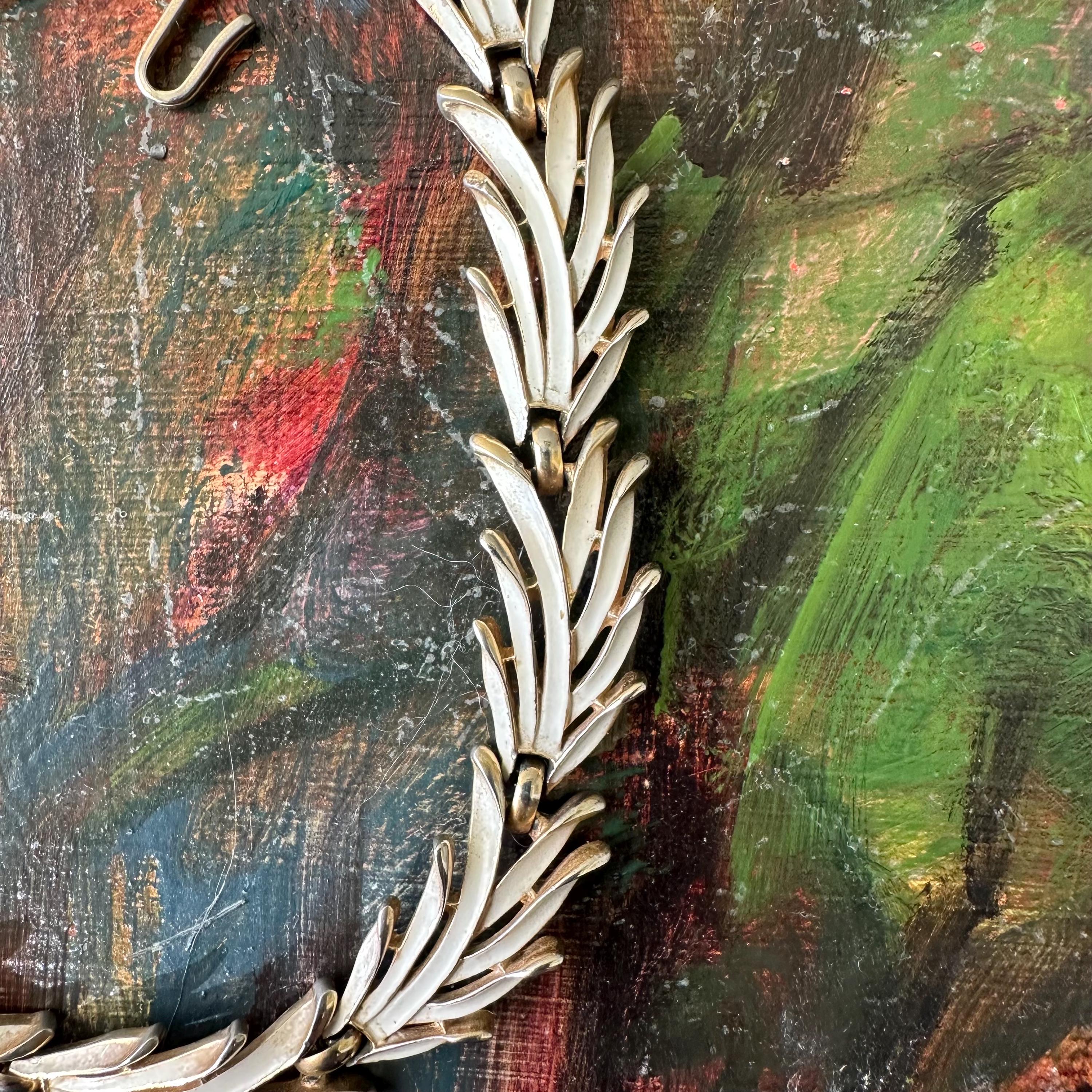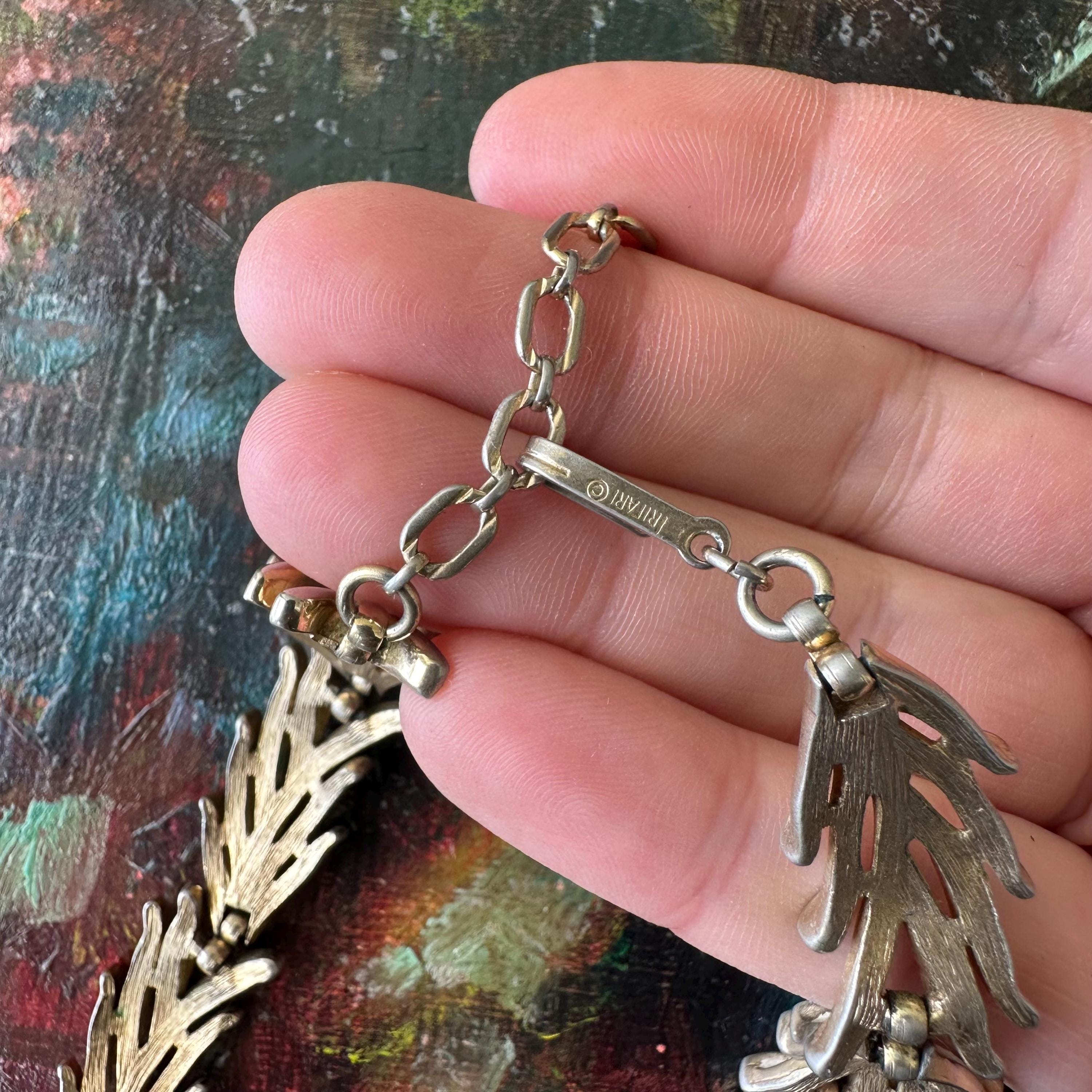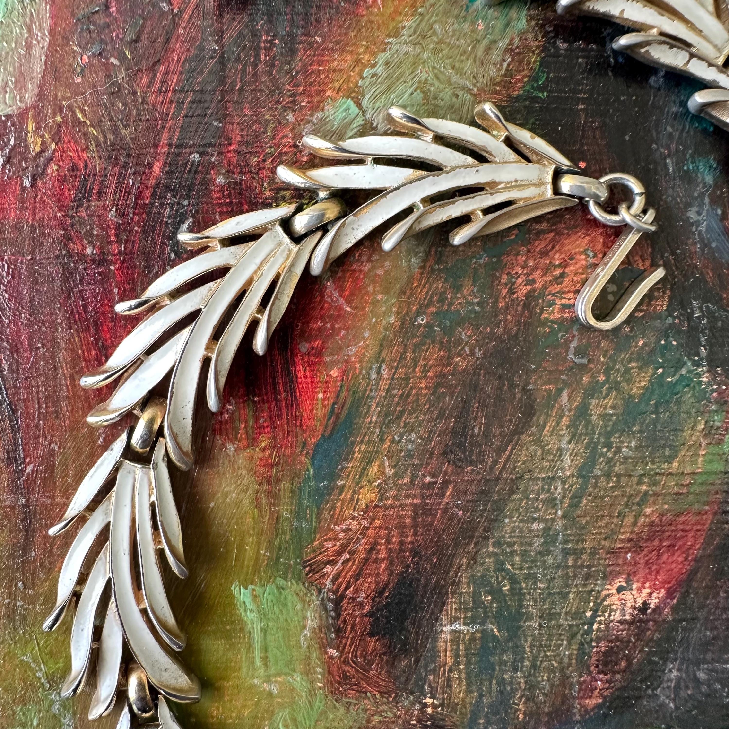 This is a vintage white enamel leaf choker necklace from Trifari. The necklace is made of individual tropical style leaves with white enamel on a gold tone metal backing. Each leaf is attached to the next with a small gold tone metal loop. The necklace has a chain and hook closure. The hook is marked Trifari.