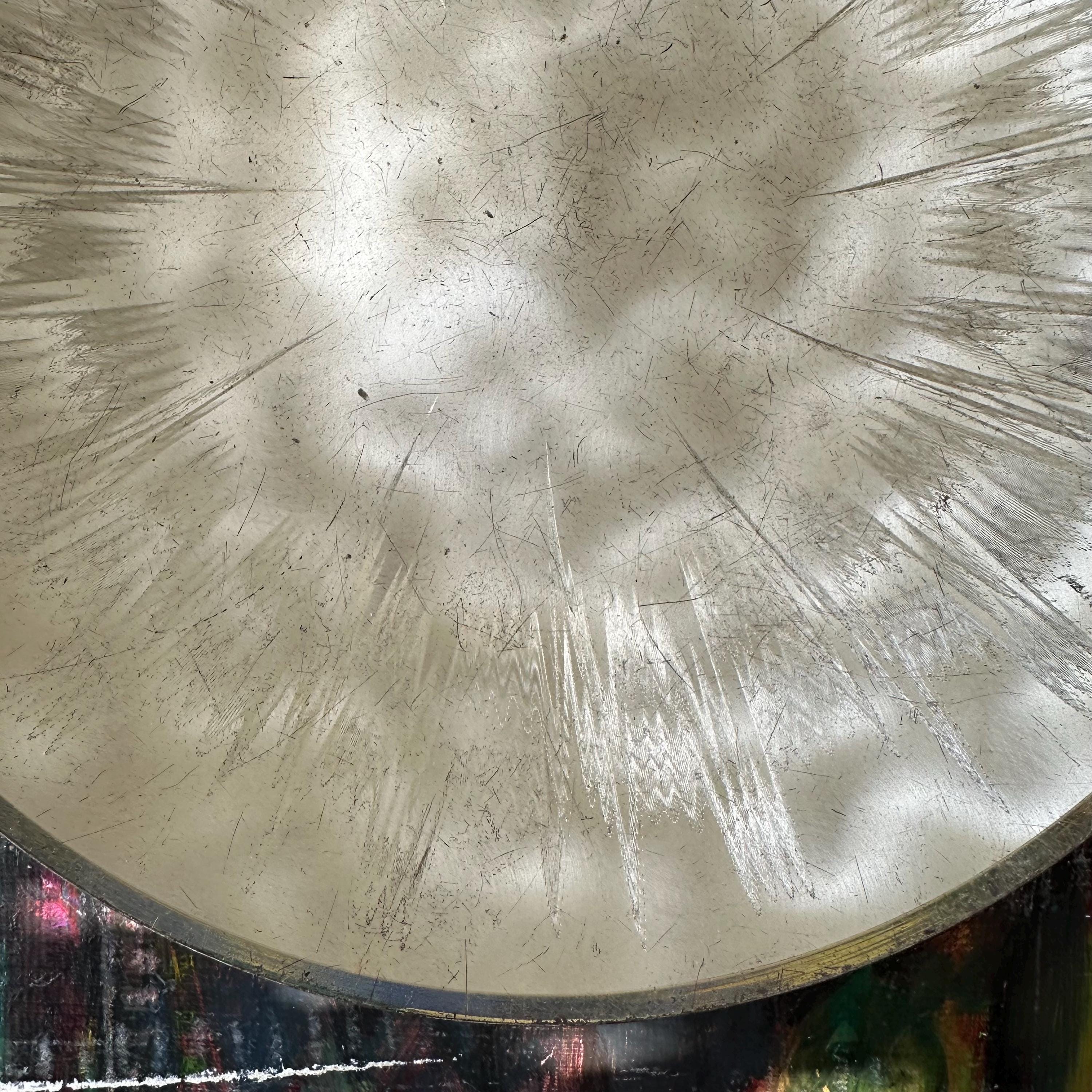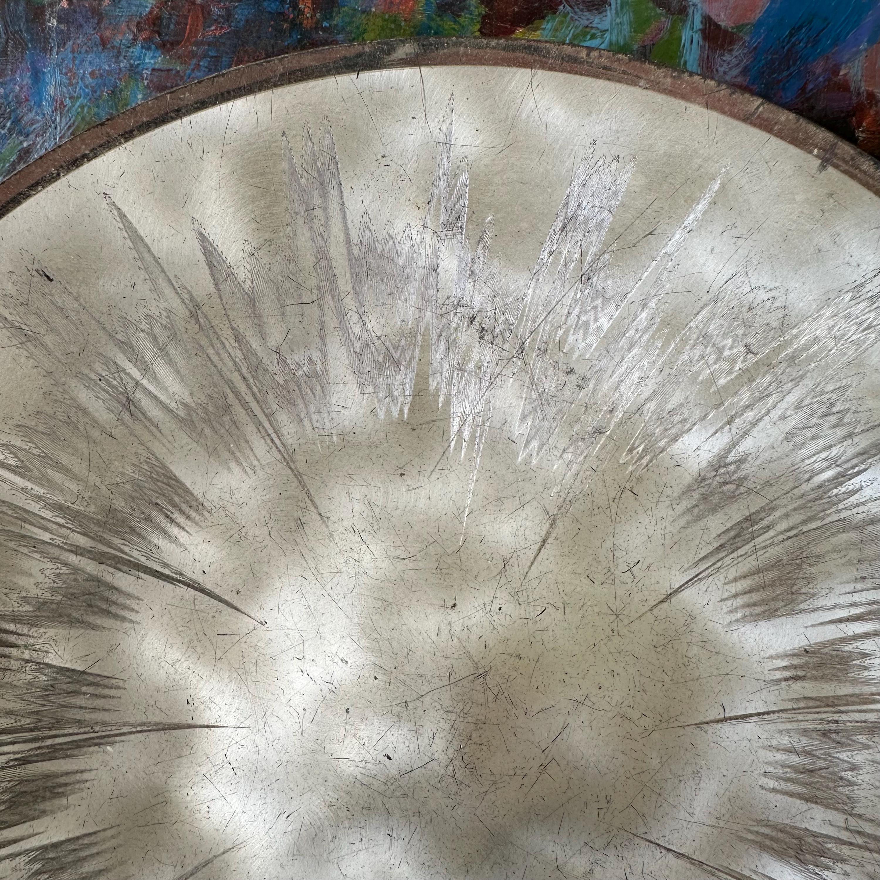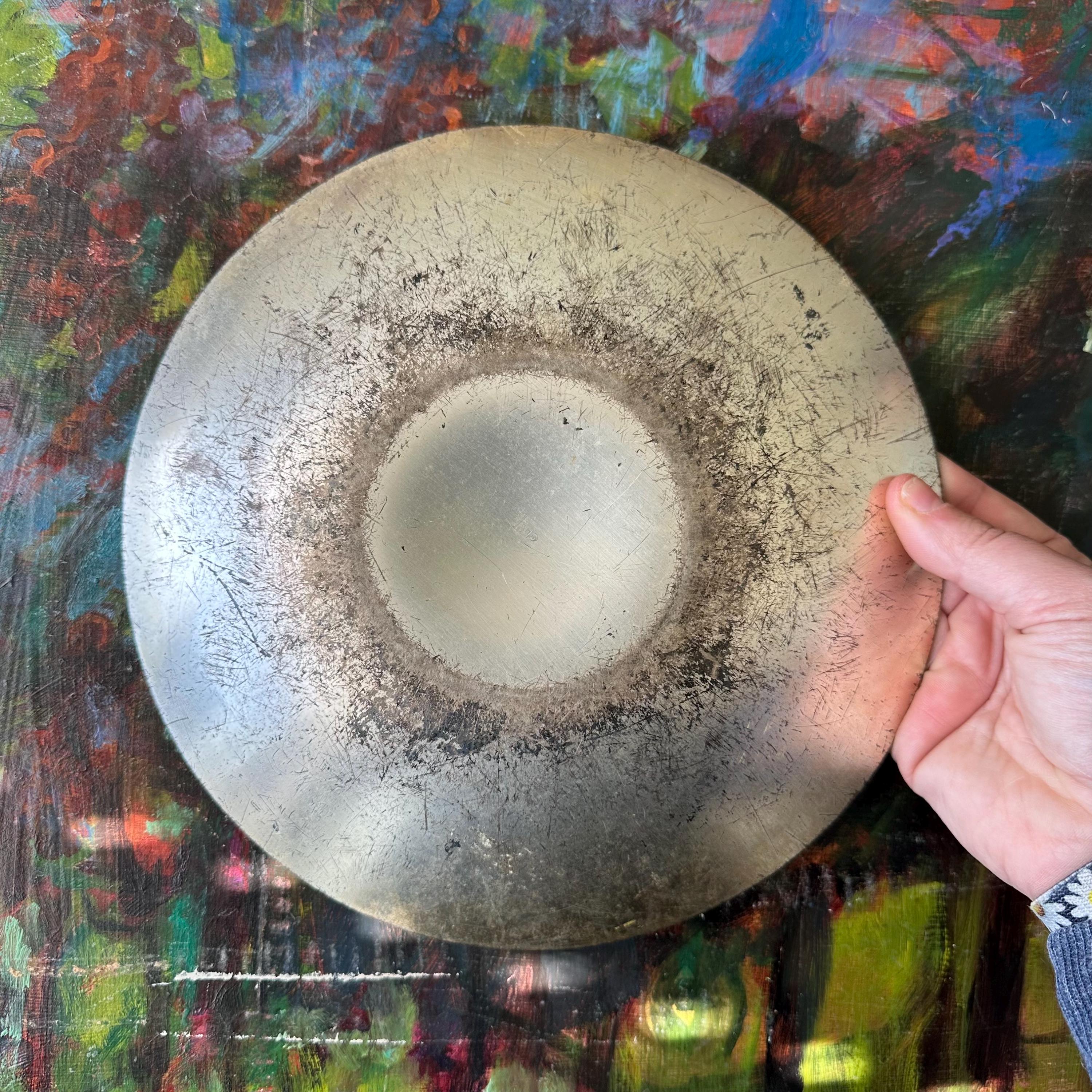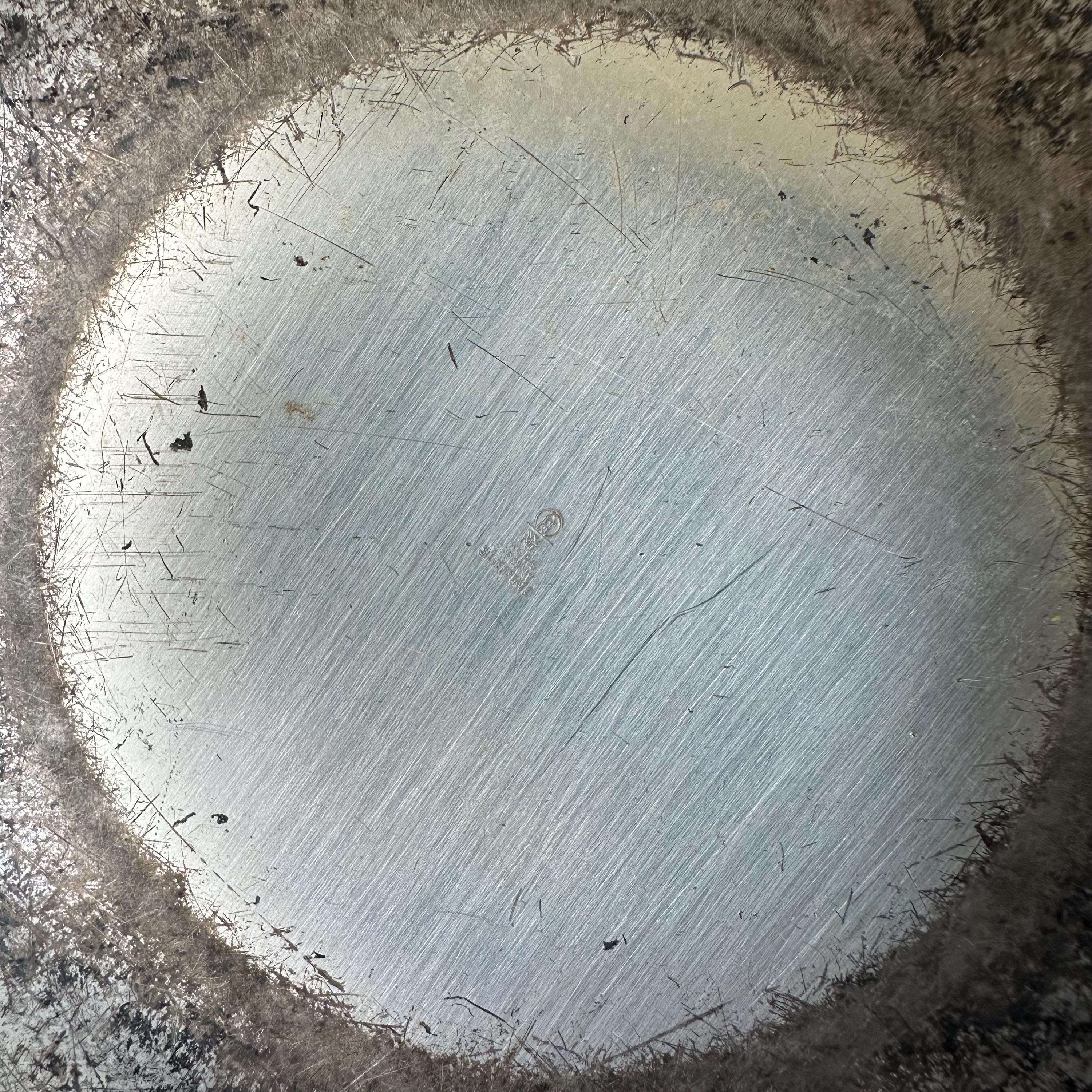 The bowl is in good vintage condition for its age and use. The top has scratches all over with some discoloration. The silver is still shiny. The bottom is heavily scratched. There are no dents.