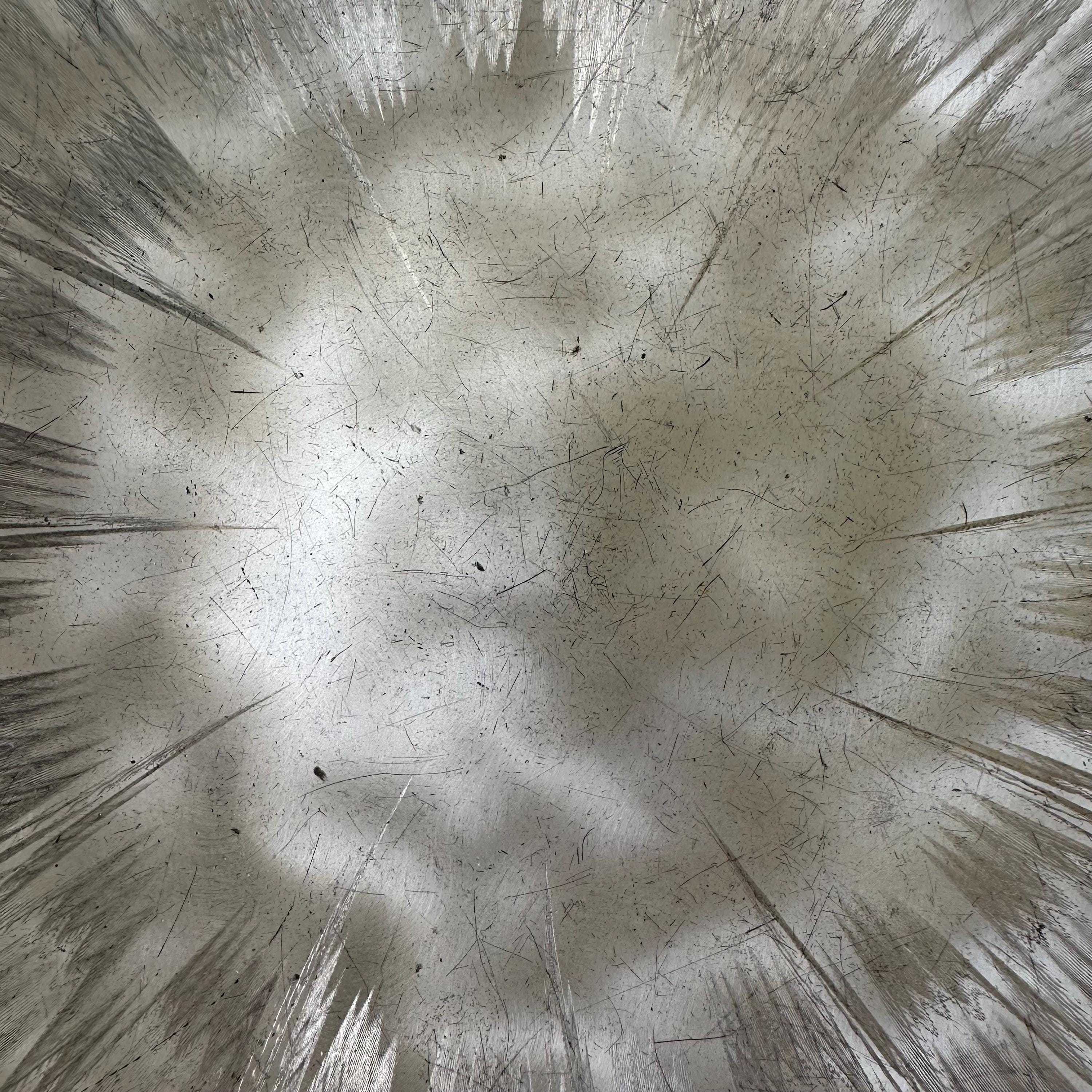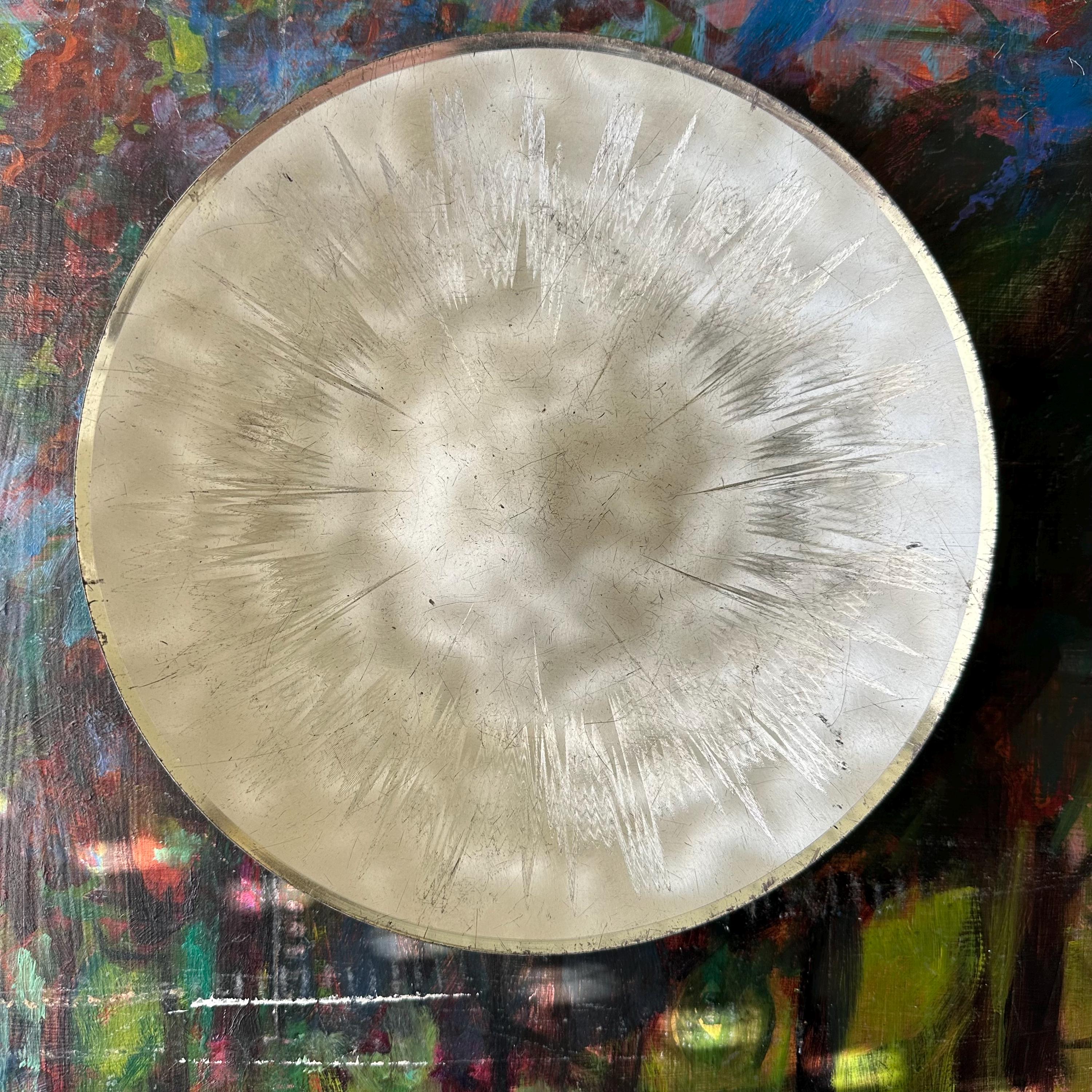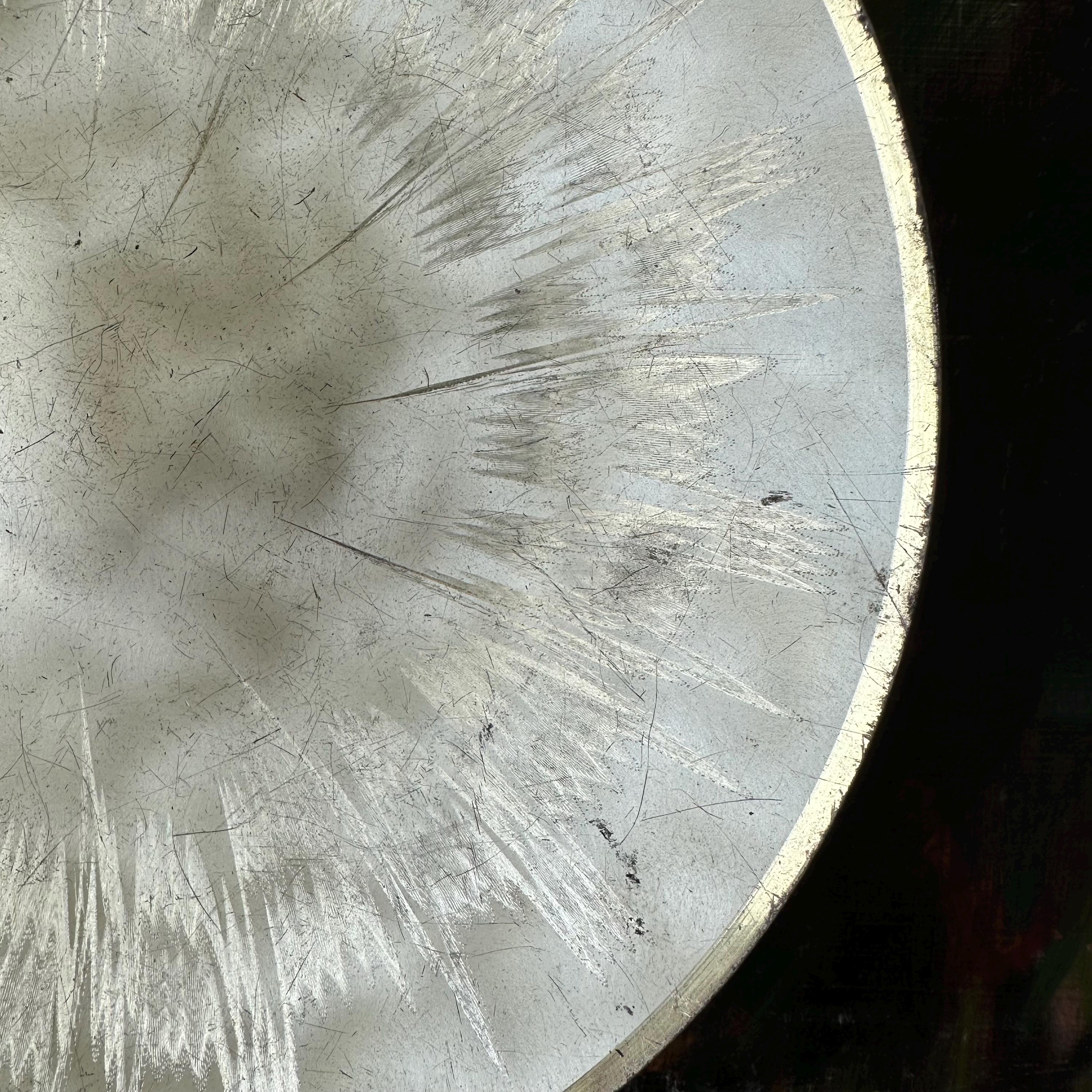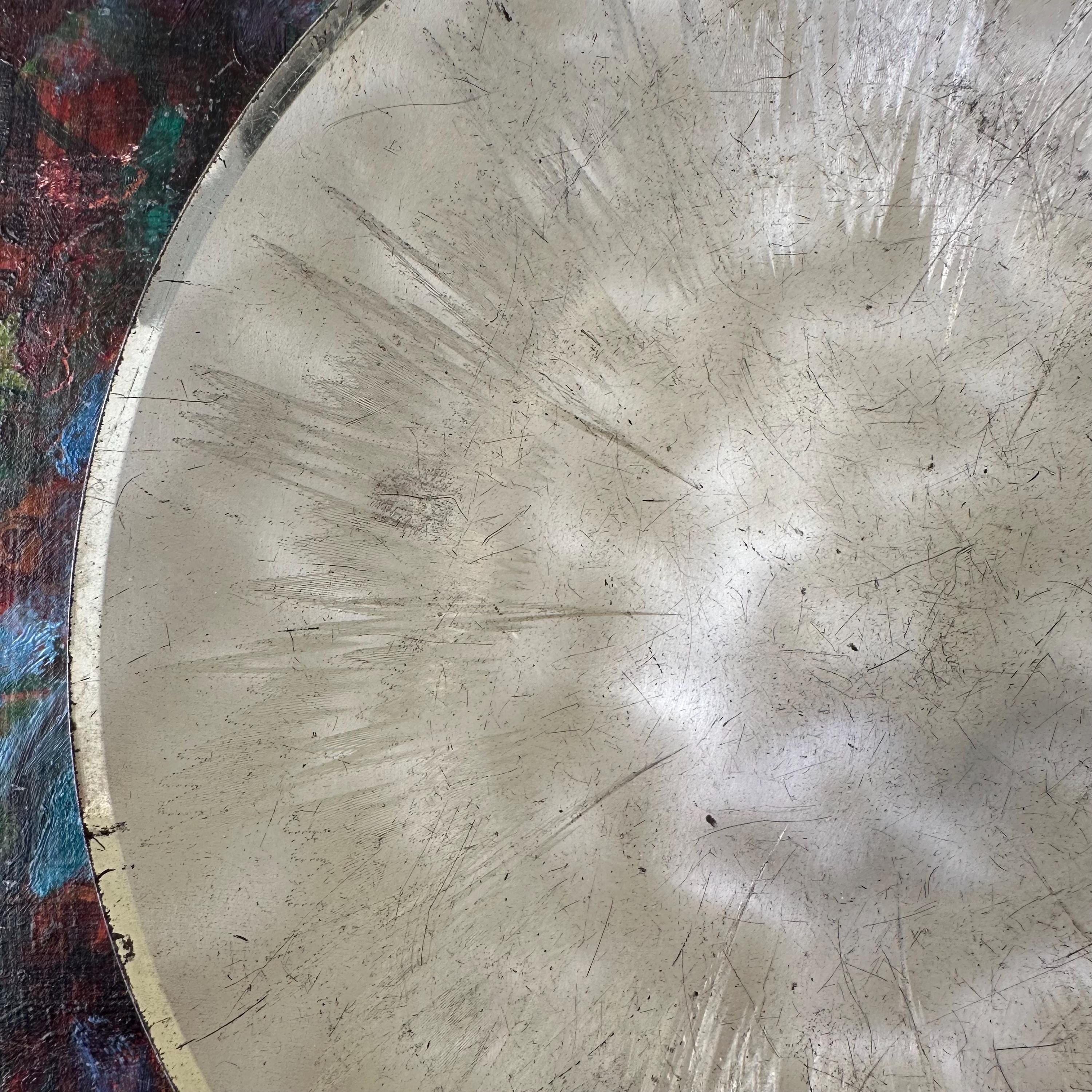 The bowl is in good vintage condition for its age and use. The top has scratches all over with some discoloration. The silver is still shiny. The bottom is heavily scratched. There are no dents.