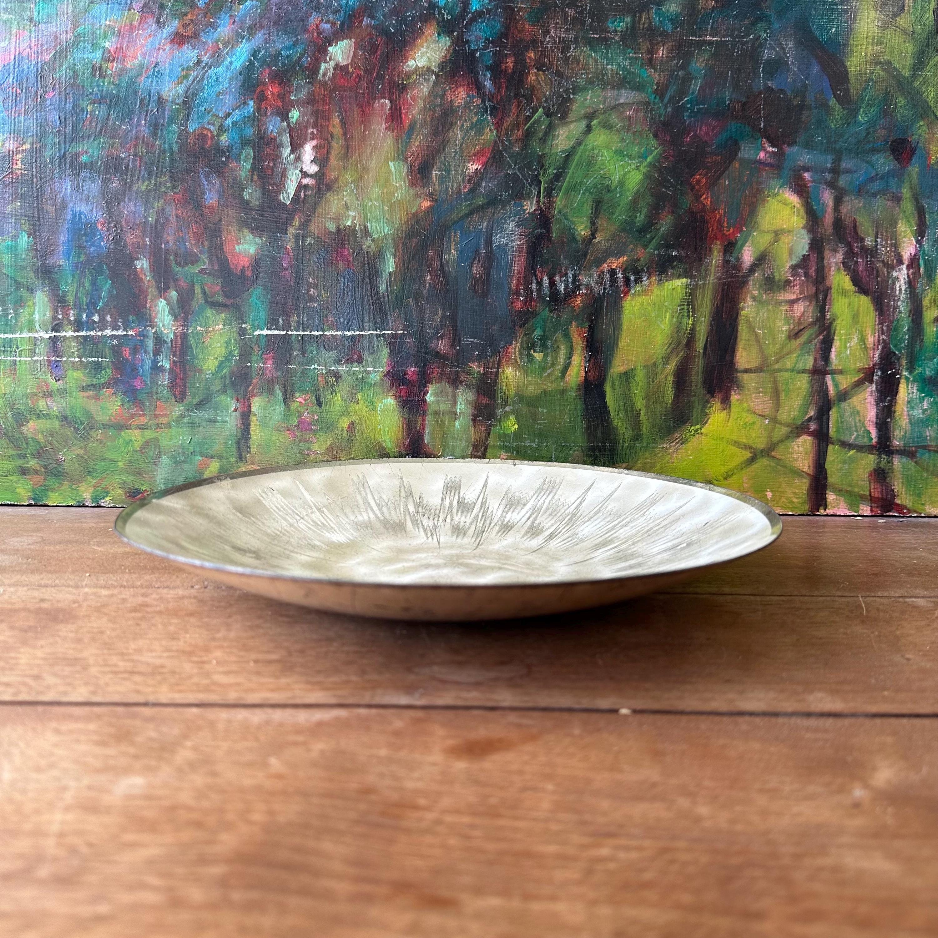 This is a midcentury modern style decorative bowl or round tray from Ikora. The bowl is silverplate with a embedded shiny wave all around the interior of the bowl. It has a silver edge with a frosted silver interior. The bottom is plain silver stamped Ikora Germany Silverplate.