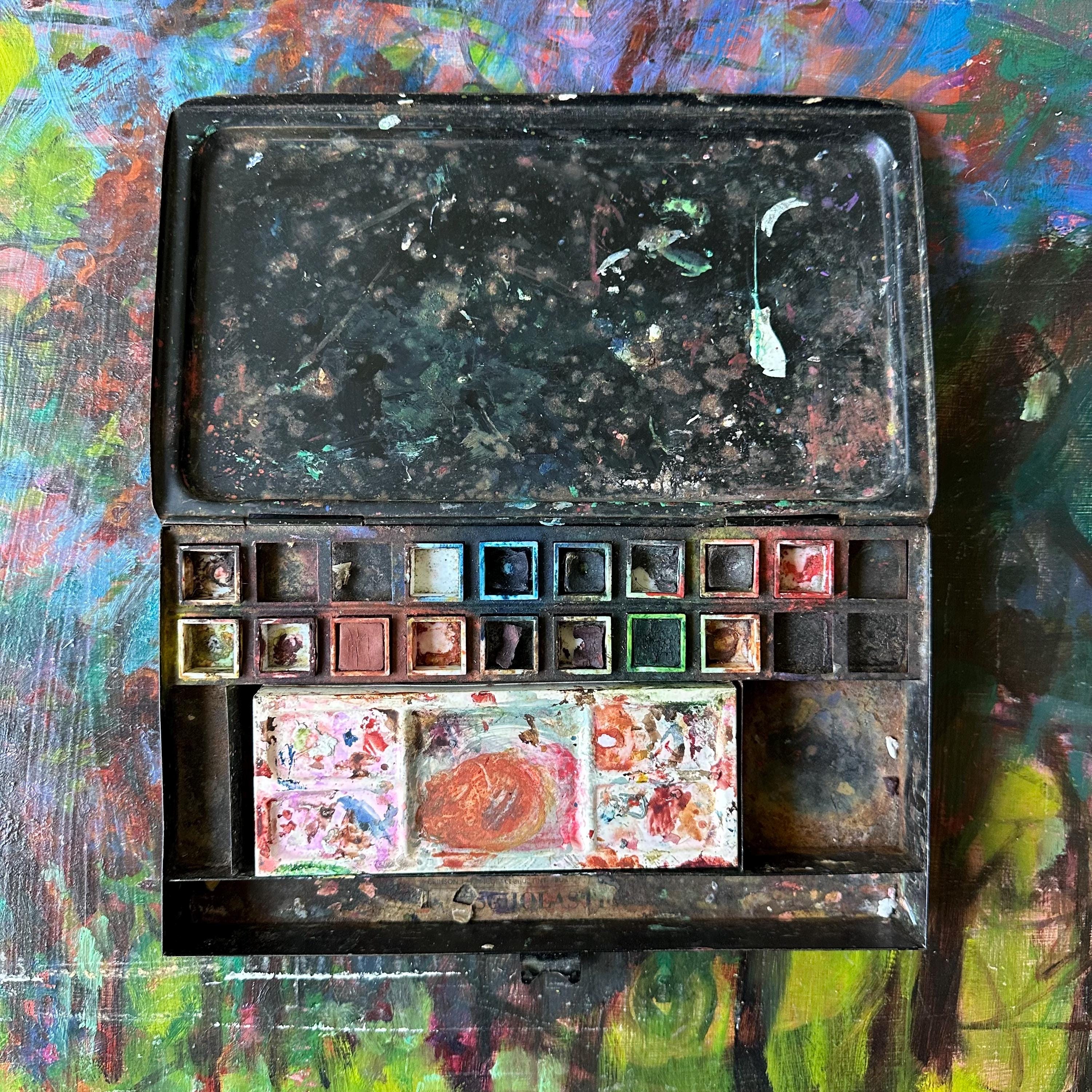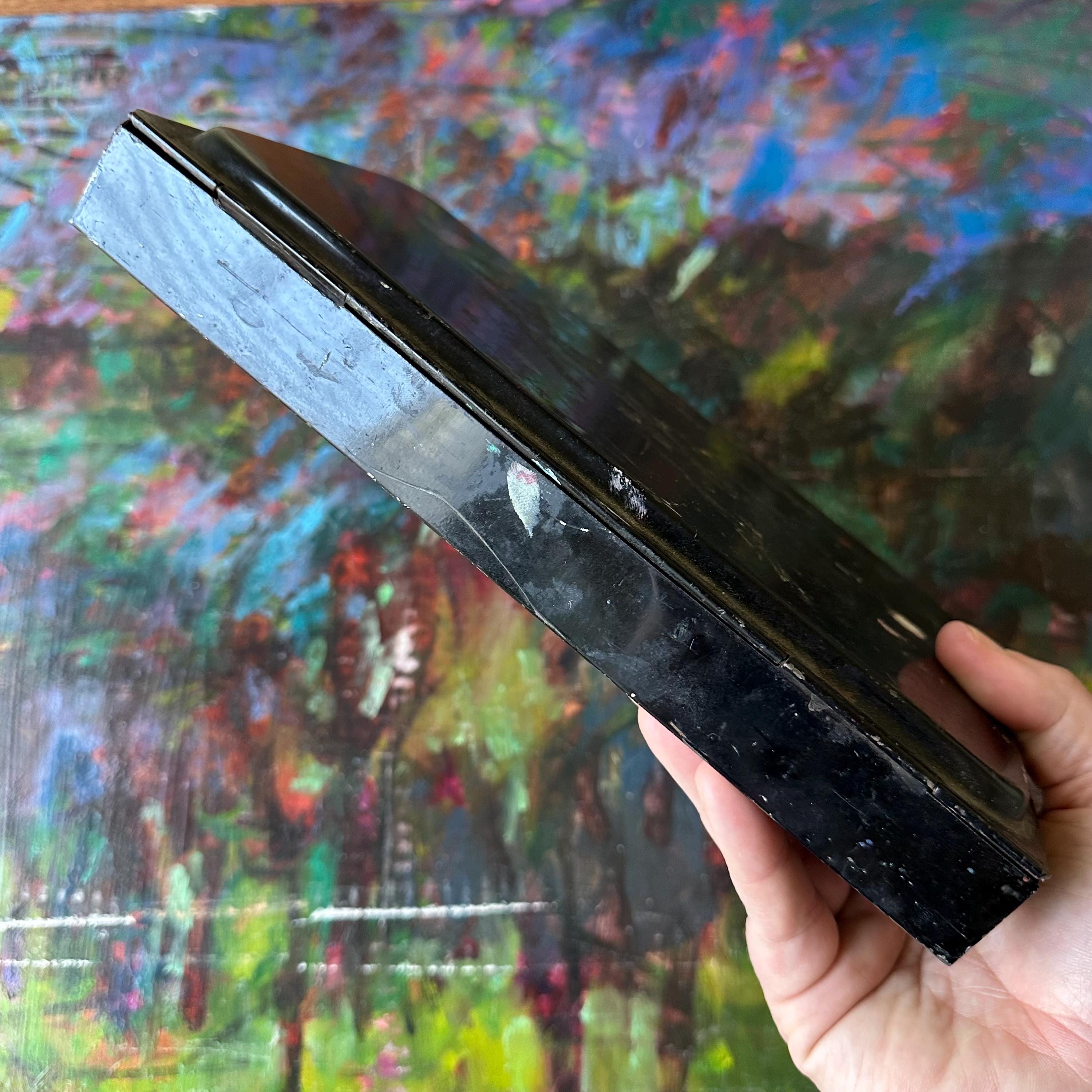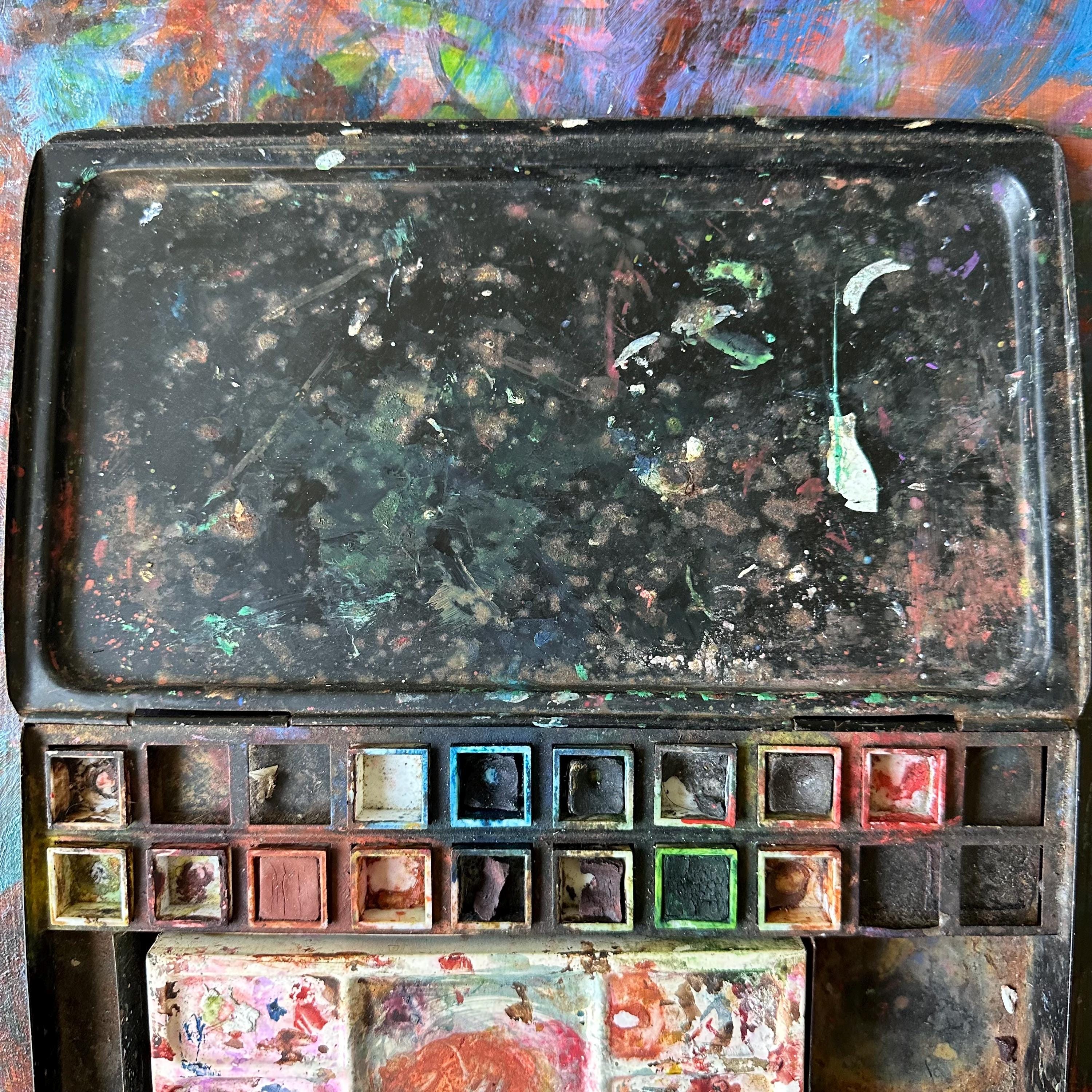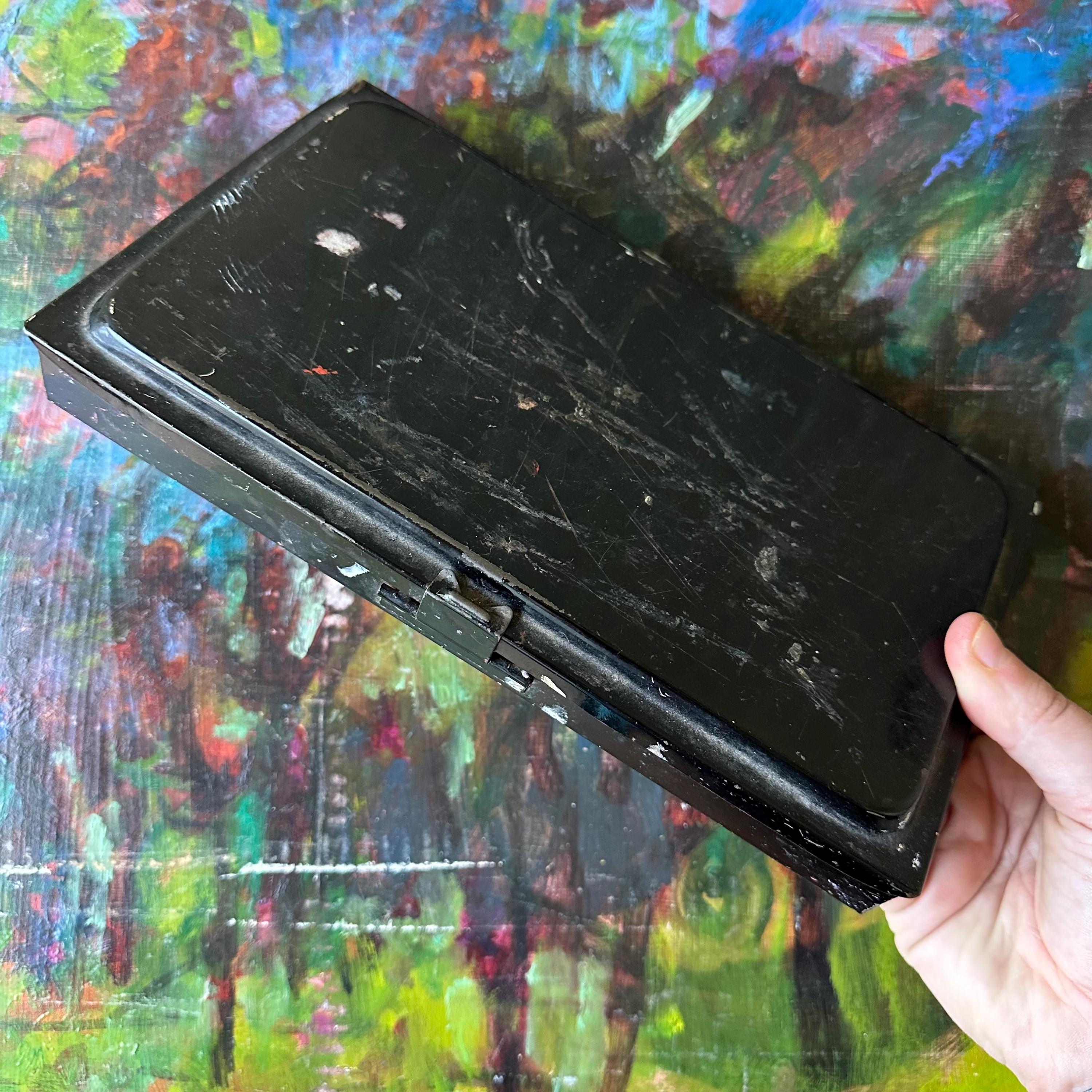 This a vintage Reeves & Sons black tin travel paint palette case. It has a plain black exterior with a rounded, raised area on the top lid. The front has a clasp latch to keep the case closed while traveling. Inside the tin, there are openings for 20 very small square paint pots. Fifteen of the squares are filled with white plastic tubs, some still with paint. The center is divided into 3 wells: one narrow rounded well, one large rectangle, and one large square. The rectangle is filled with a shallow white plastic tray with 5 shallow trays to mix paints. The bottom part of the inside is one long rectangle. There is the remnants of the Reeves & Sons label inside this bottom well.