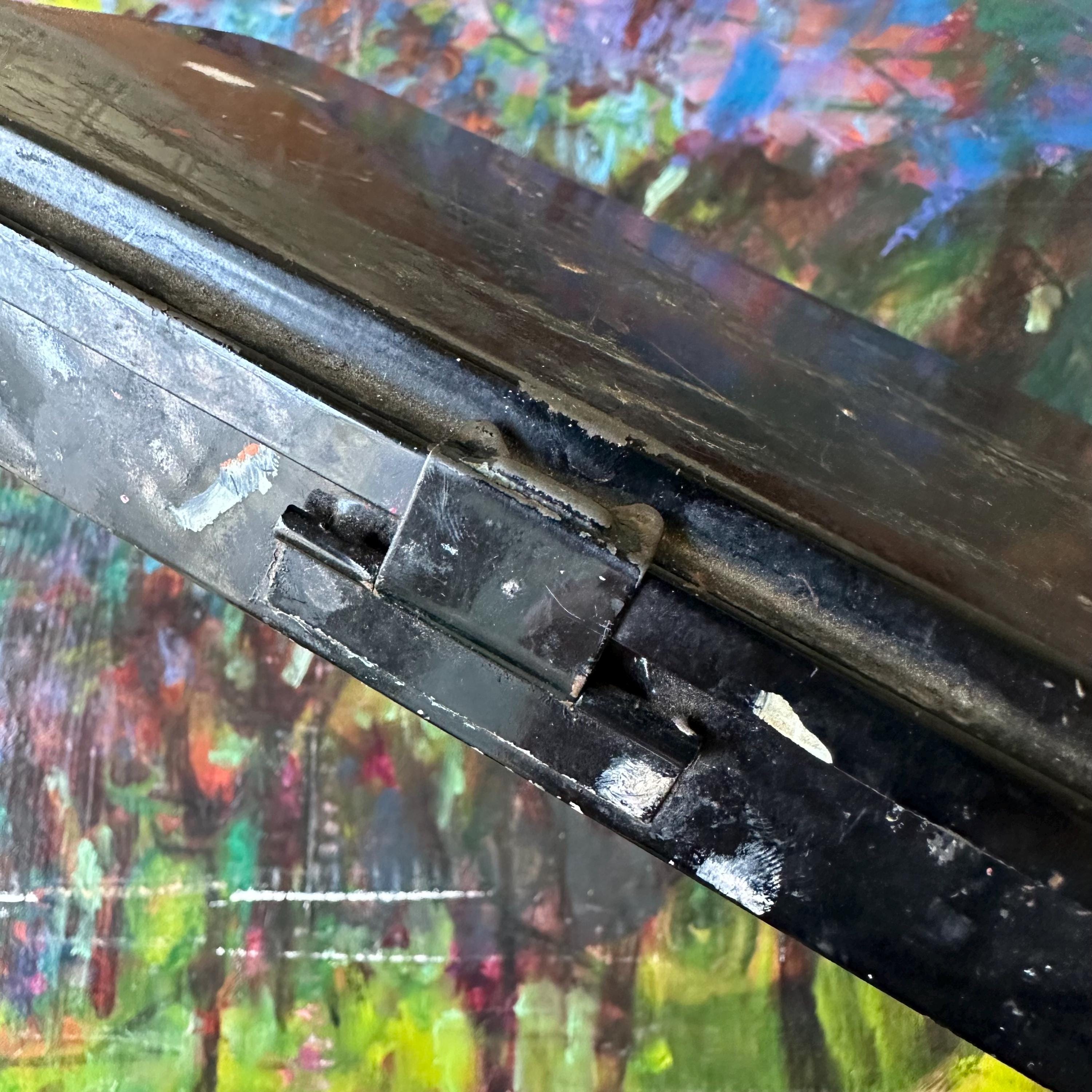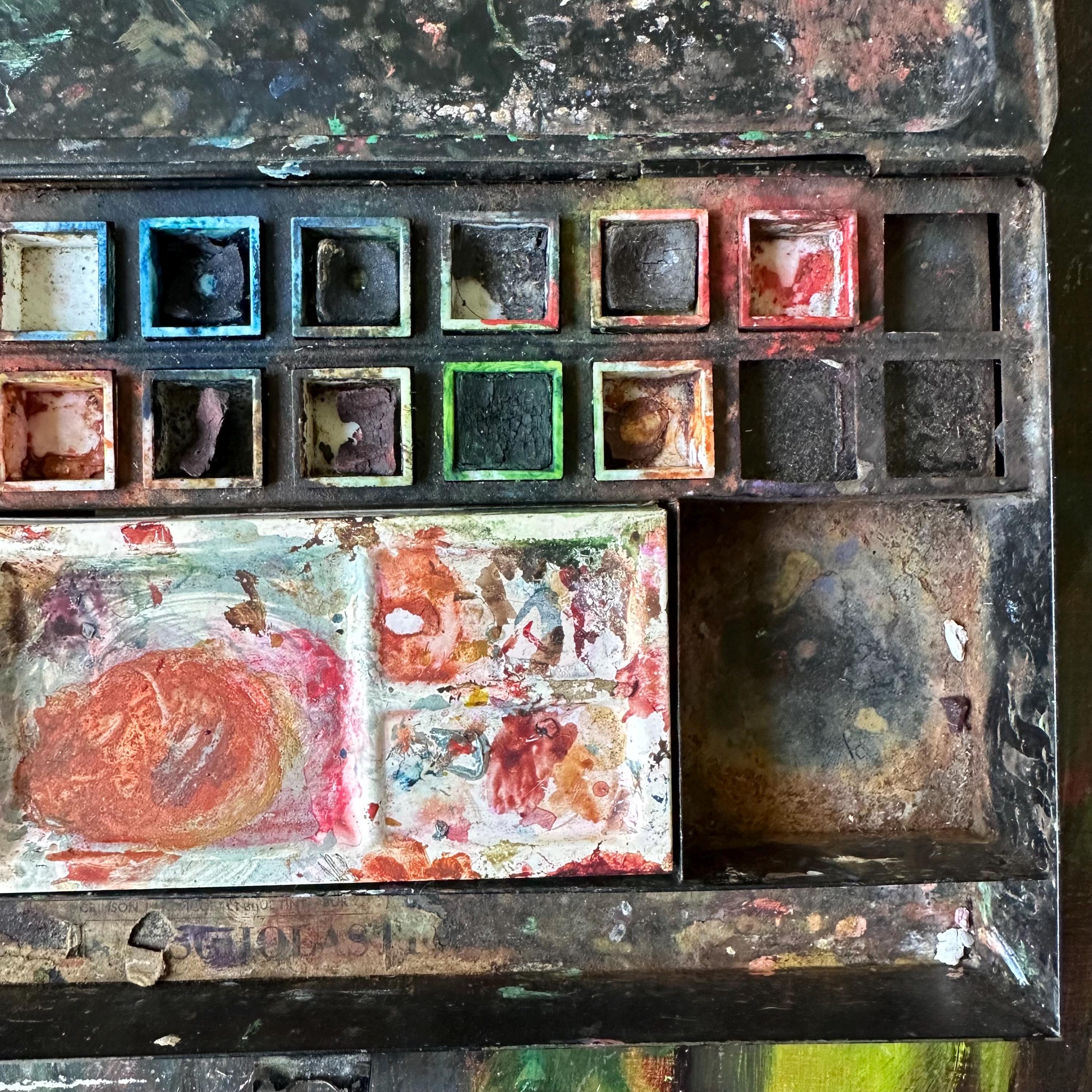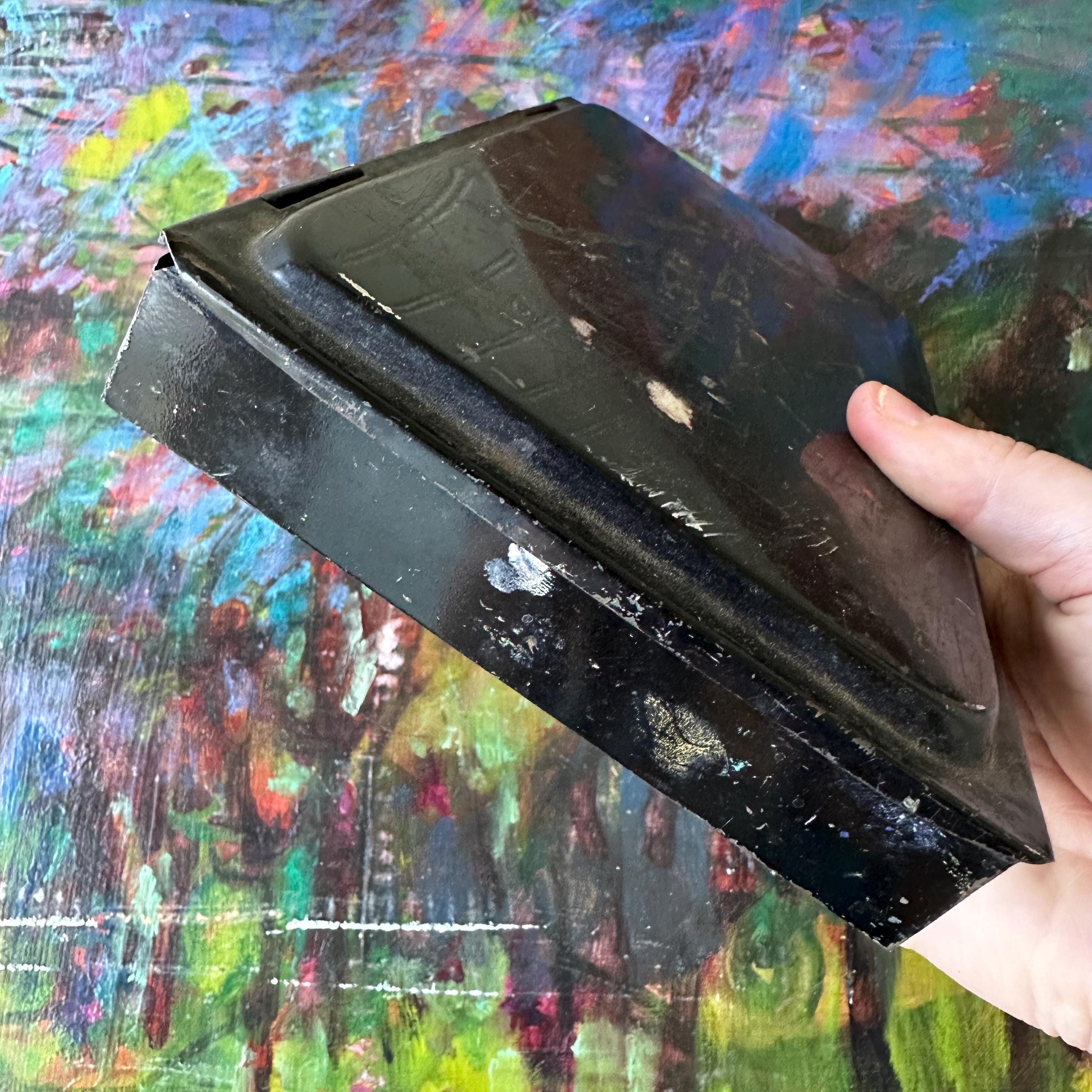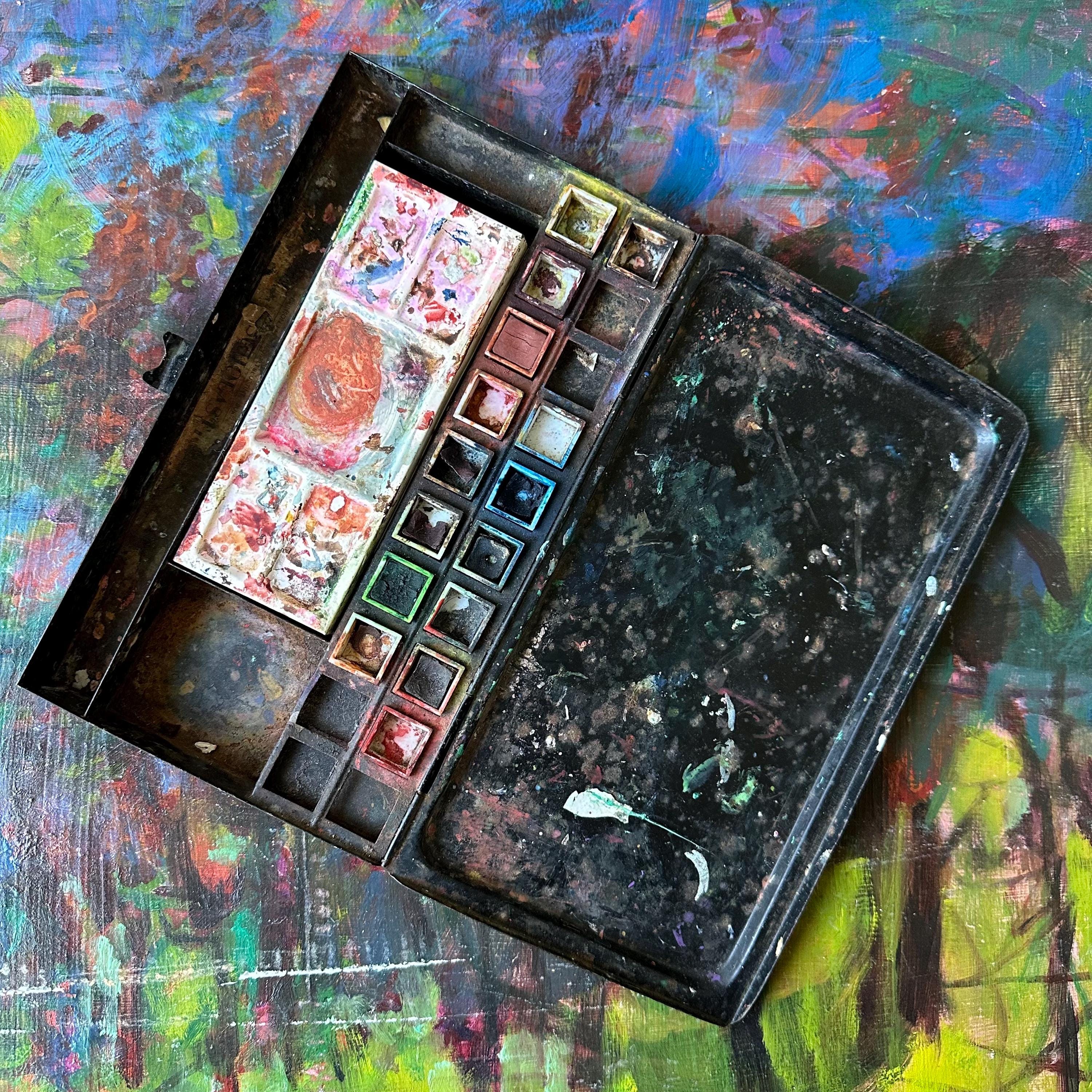This a vintage Reeves & Sons black tin travel paint palette case. It has a plain black exterior with a rounded, raised area on the top lid. The front has a clasp latch to keep the case closed while traveling. Inside the tin, there are openings for 20 very small square paint pots. Fifteen of the squares are filled with white plastic tubs, some still with paint. The center is divided into 3 wells: one narrow rounded well, one large rectangle, and one large square. The rectangle is filled with a shallow white plastic tray with 5 shallow trays to mix paints. The bottom part of the inside is one long rectangle. There is the remnants of the Reeves & Sons label inside this bottom well.