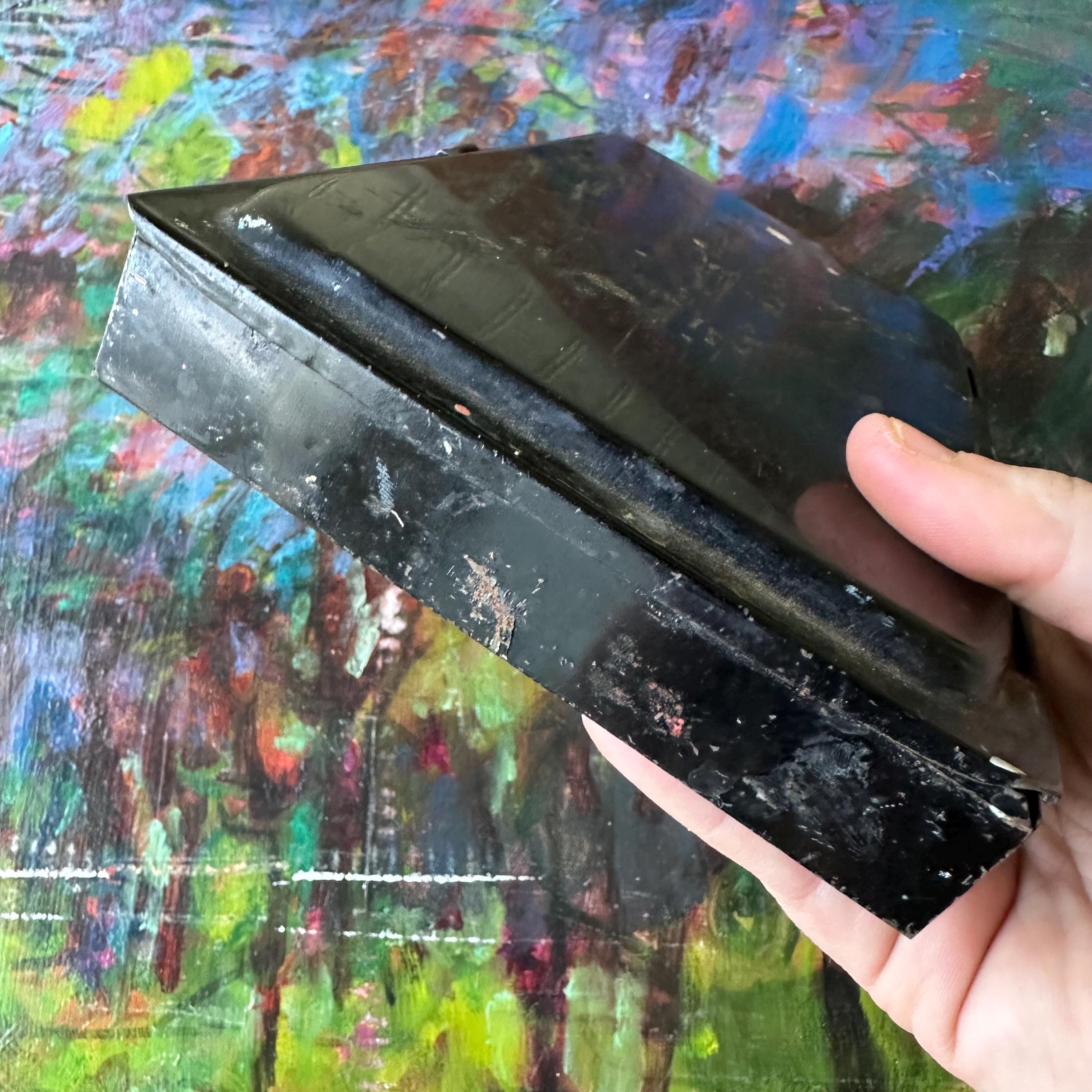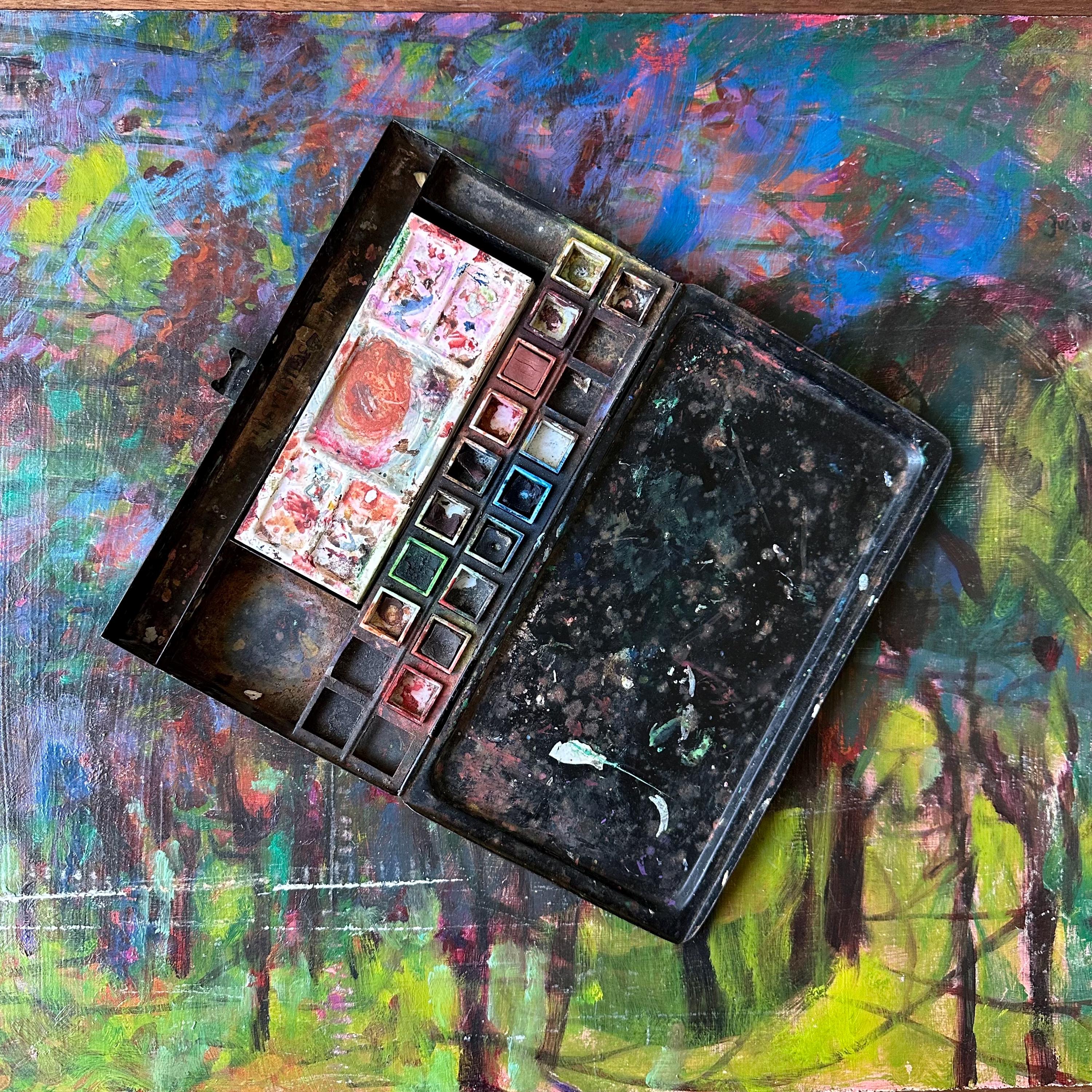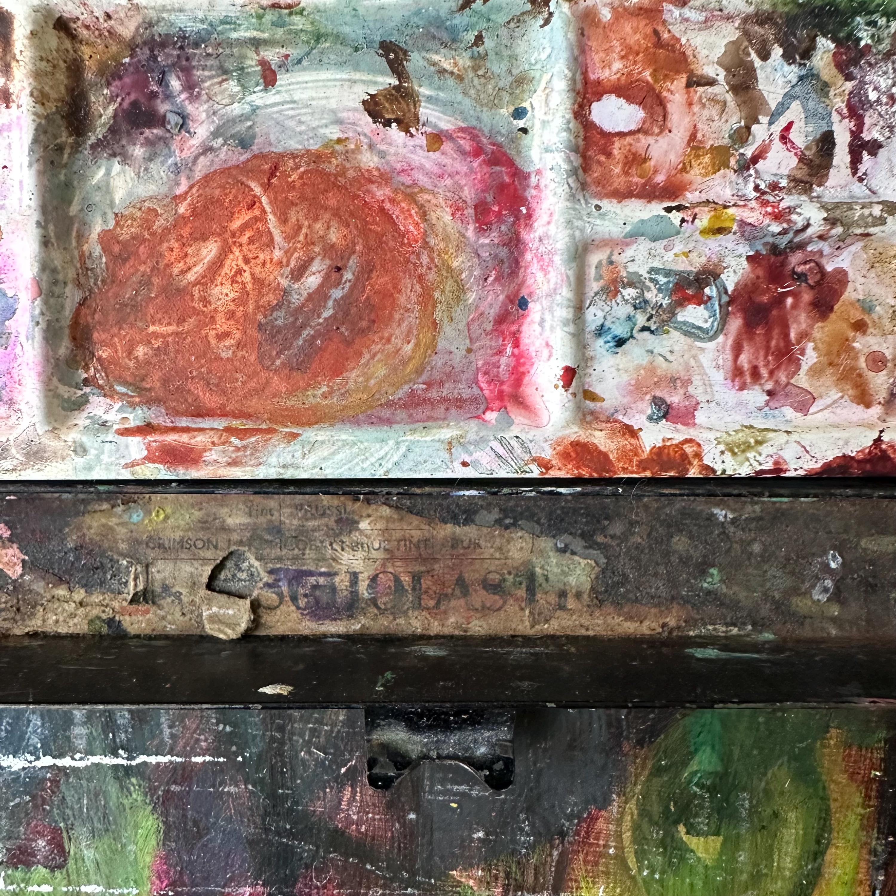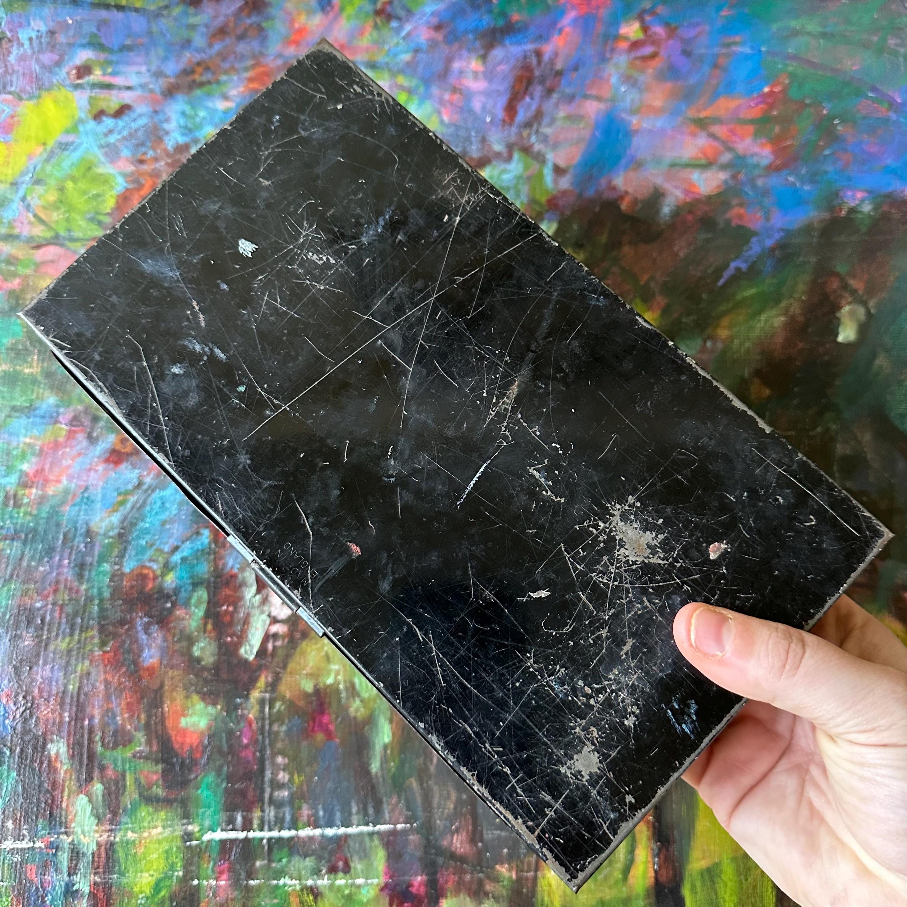 This a vintage Reeves & Sons black tin travel paint palette case. It has a plain black exterior with a rounded, raised area on the top lid. The front has a clasp latch to keep the case closed while traveling. Inside the tin, there are openings for 20 very small square paint pots. Fifteen of the squares are filled with white plastic tubs, some still with paint. The center is divided into 3 wells: one narrow rounded well, one large rectangle, and one large square. The rectangle is filled with a shallow white plastic tray with 5 shallow trays to mix paints. The bottom part of the inside is one long rectangle. There is the remnants of the Reeves & Sons label inside this bottom well.