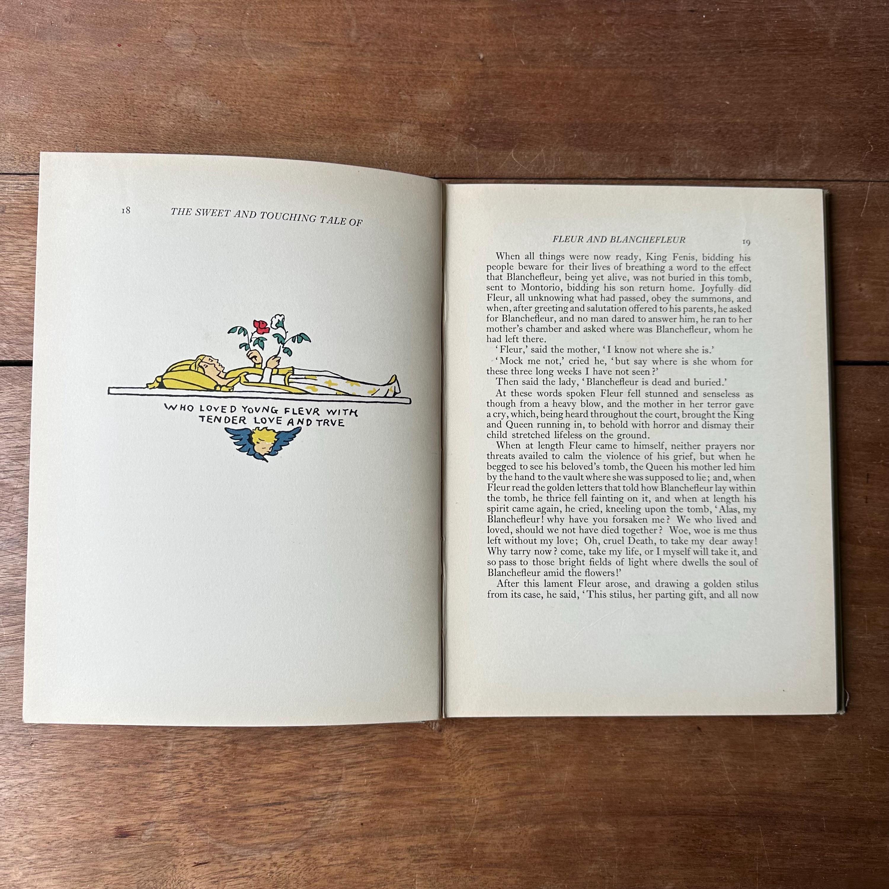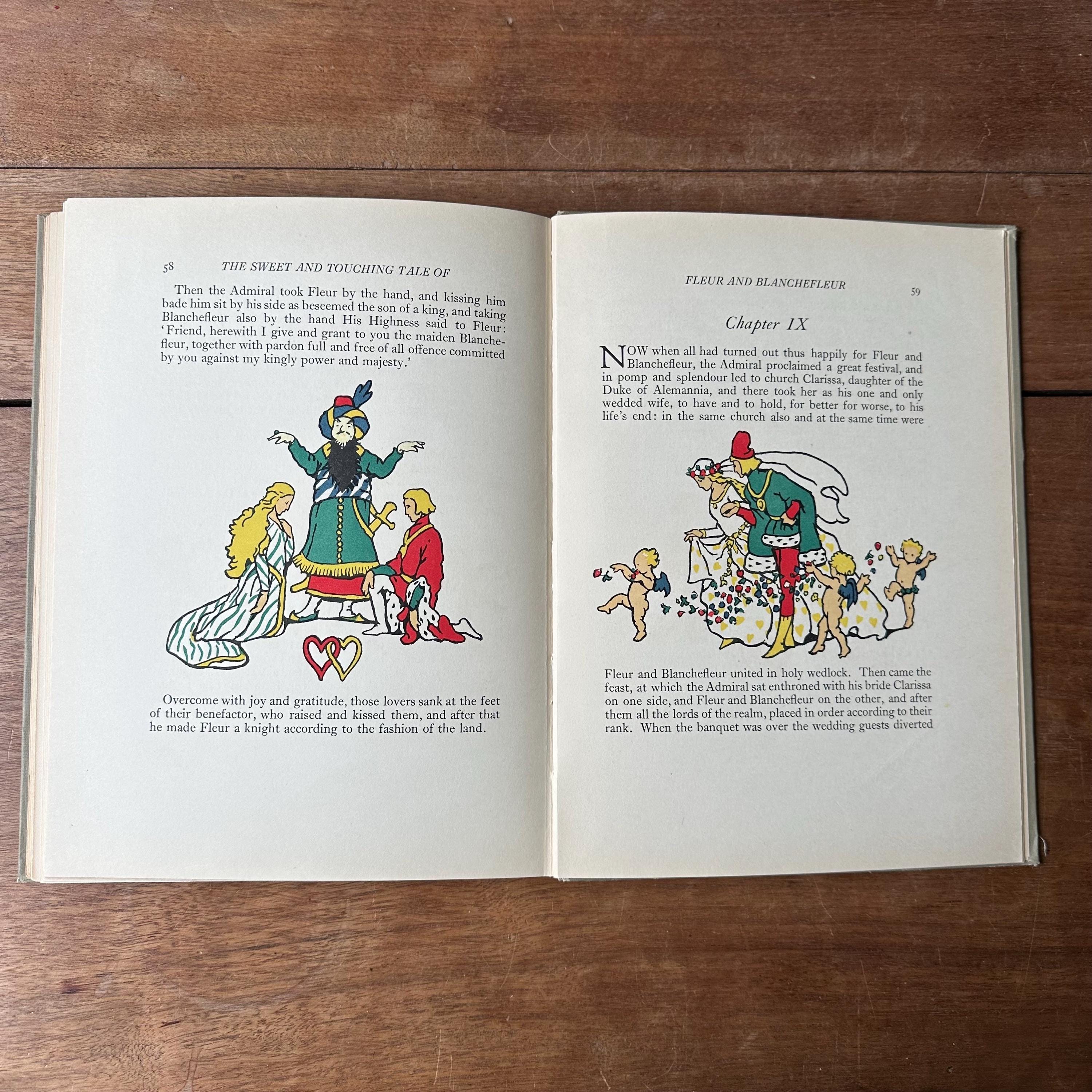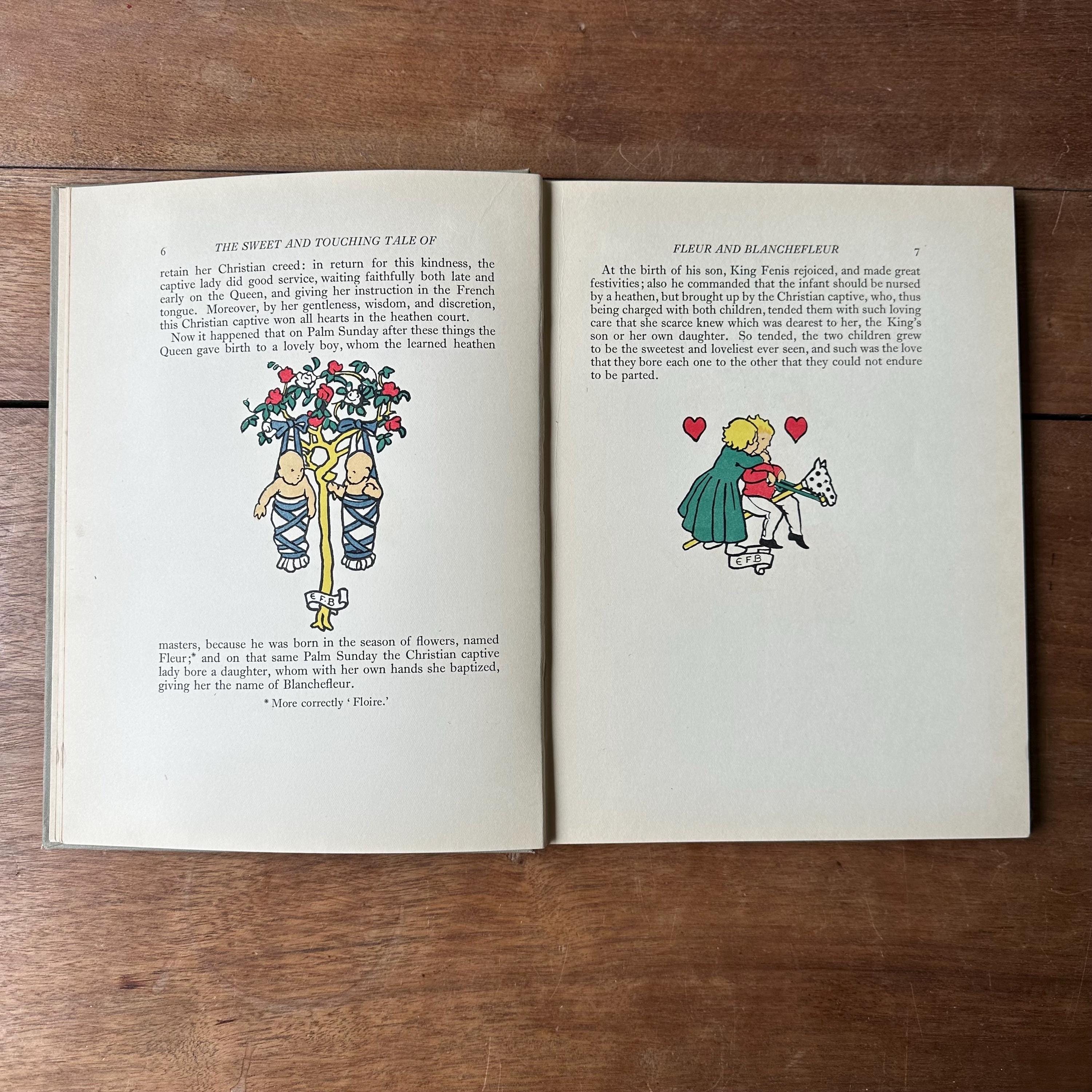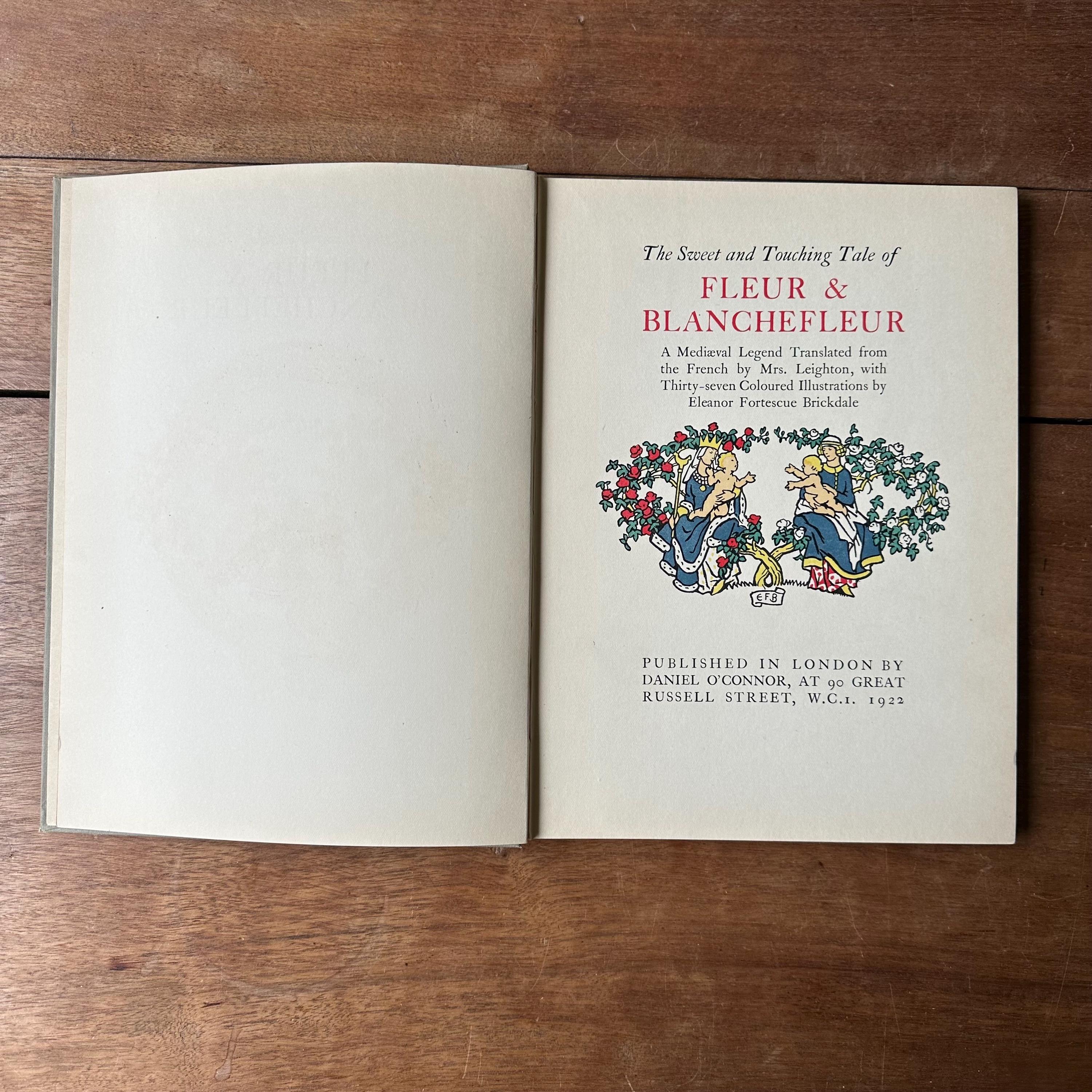 This is the 1922 edition of The Sweet & Touching Tale of Fleur & Blanchefleur: A Medieval Legend translated from the French by Mrs. Leighton, with thirty-seven coloured illustrations by Eleanor Fortescue Brickdale. It was published in London by Daniel O'Connor at 90 Great Russell Street. The covers are grey with blue lettering and a blue illustration of Fleur and Blanchefleur. The spine is also titled in blue. The book is also illustrated throughout with lovely Arts and Crafts Movement style illustrations. There are 61 pages.