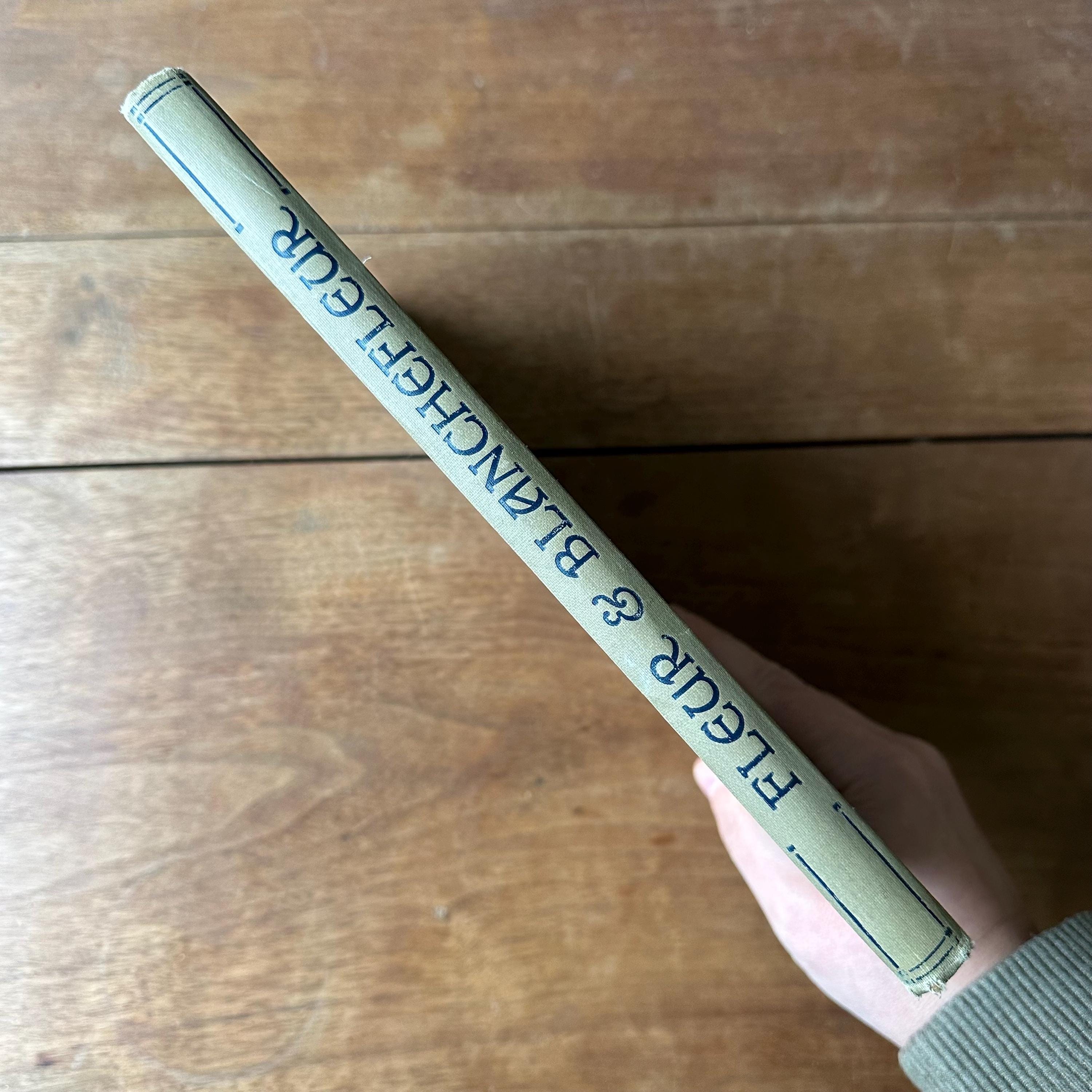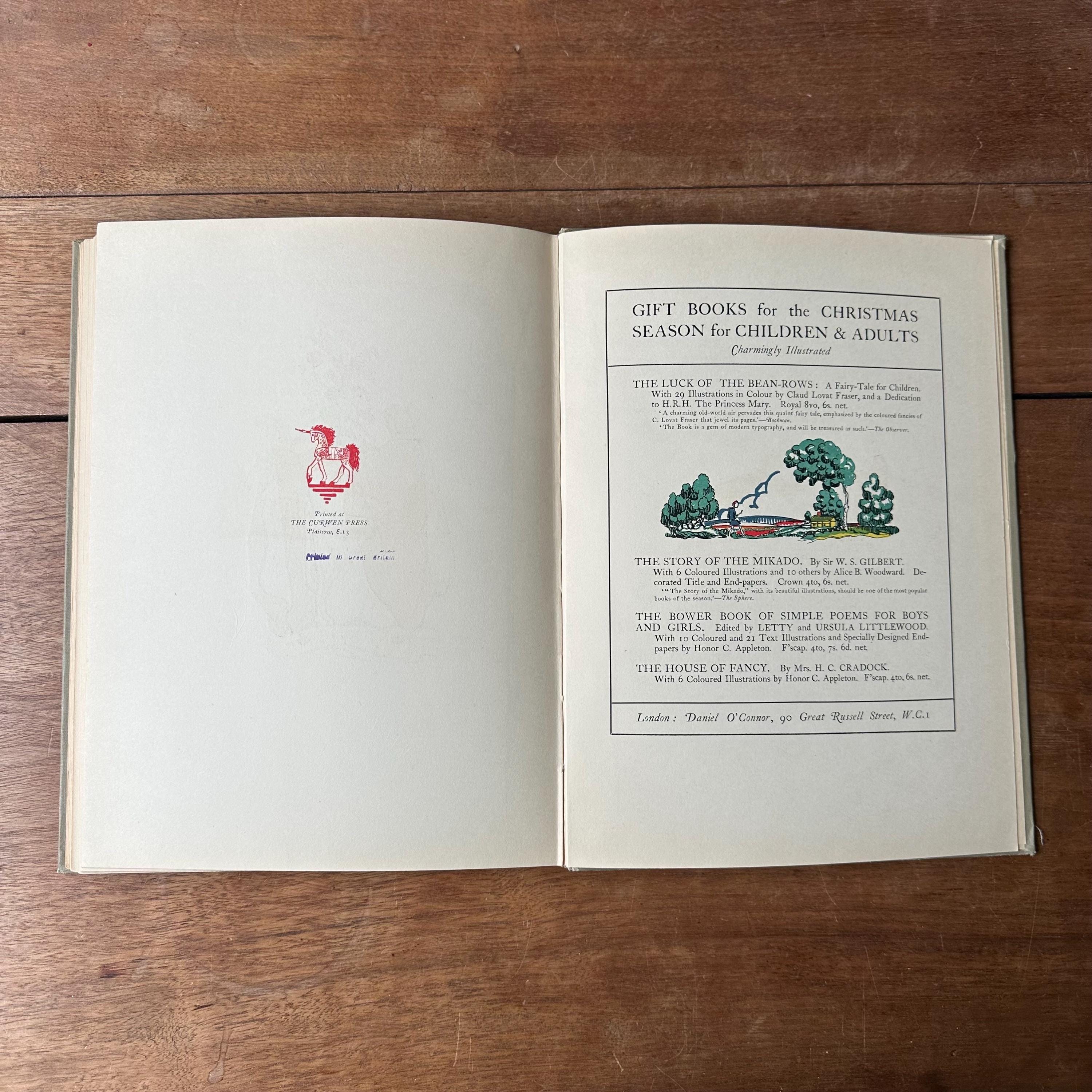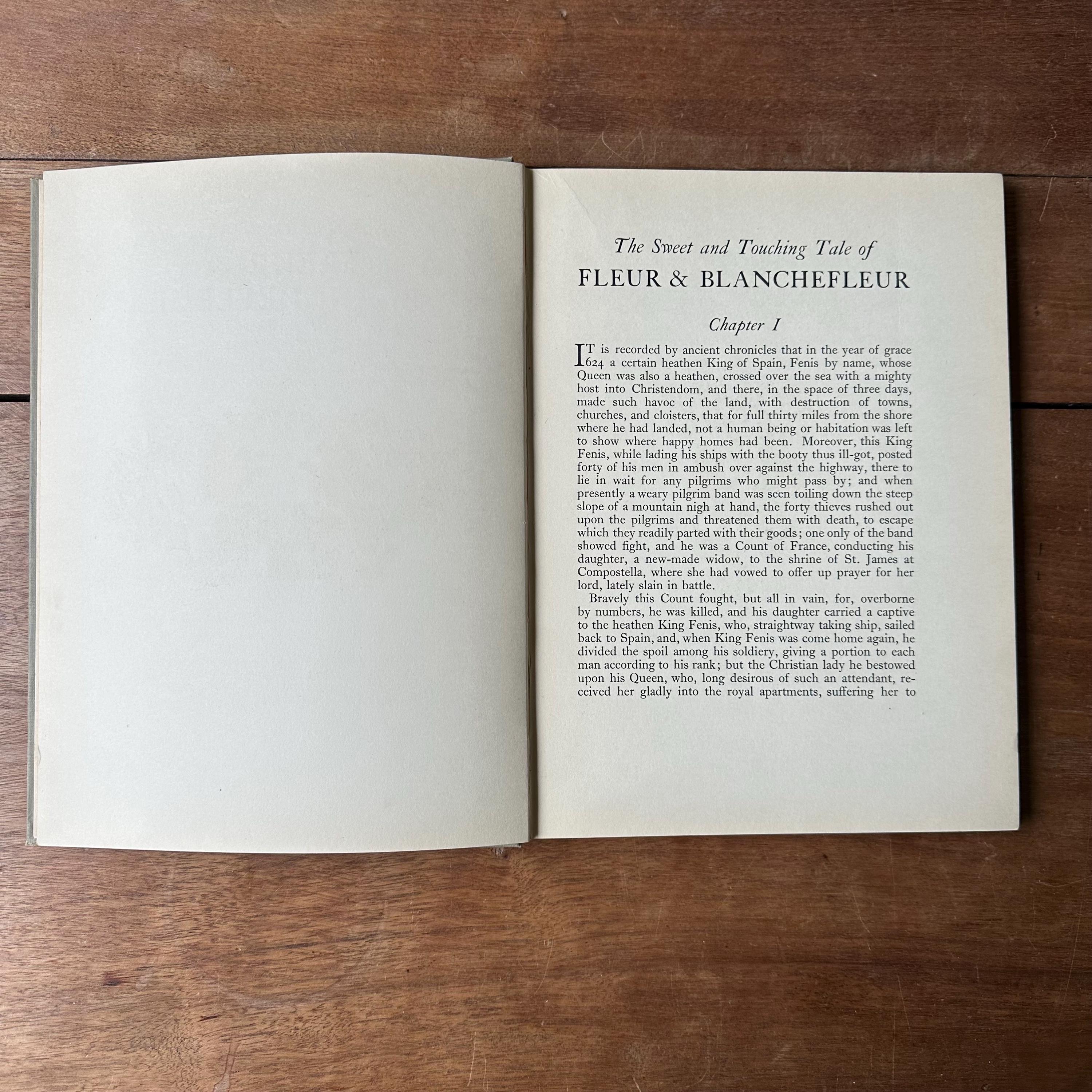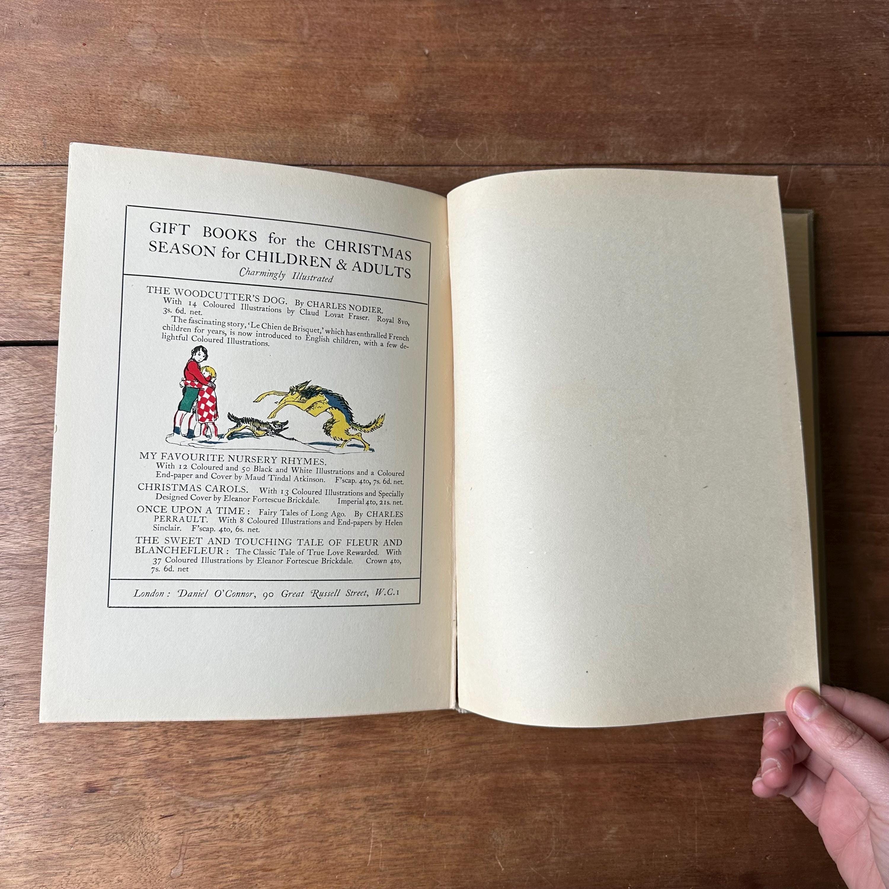 This is the 1922 edition of The Sweet & Touching Tale of Fleur & Blanchefleur: A Medieval Legend translated from the French by Mrs. Leighton, with thirty-seven coloured illustrations by Eleanor Fortescue Brickdale. It was published in London by Daniel O'Connor at 90 Great Russell Street. The covers are grey with blue lettering and a blue illustration of Fleur and Blanchefleur. The spine is also titled in blue. The book is also illustrated throughout with lovely Arts and Crafts Movement style illustrations. There are 61 pages.
