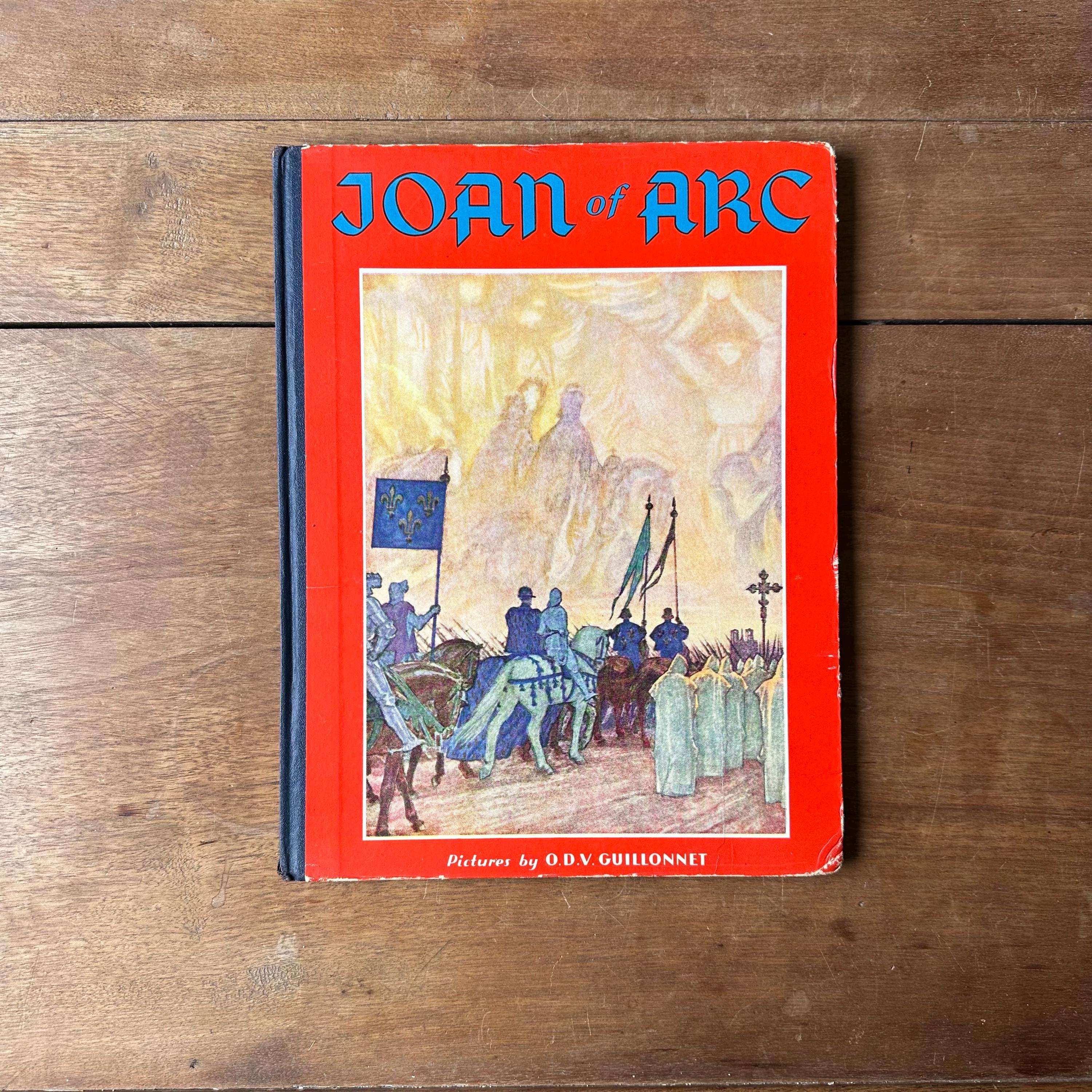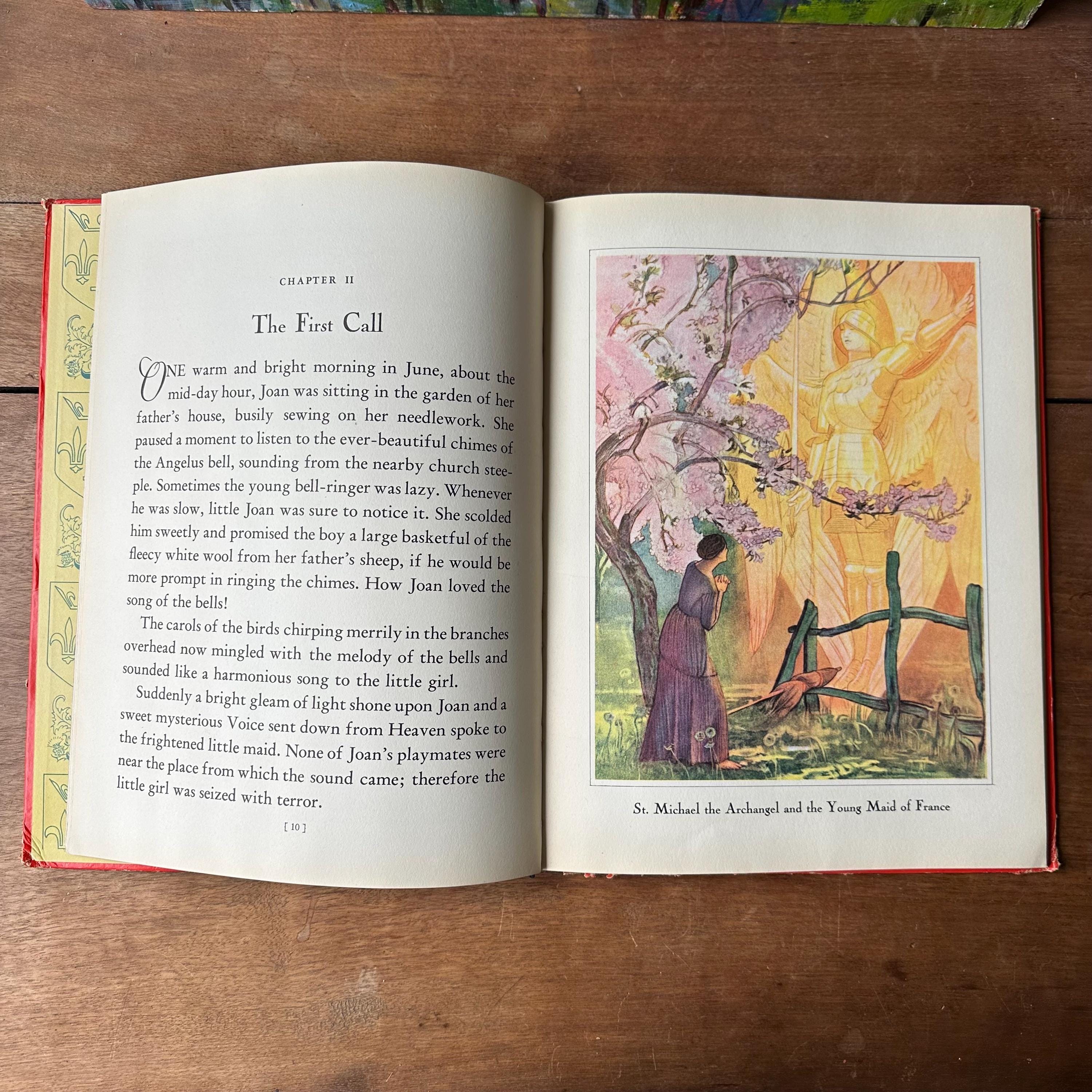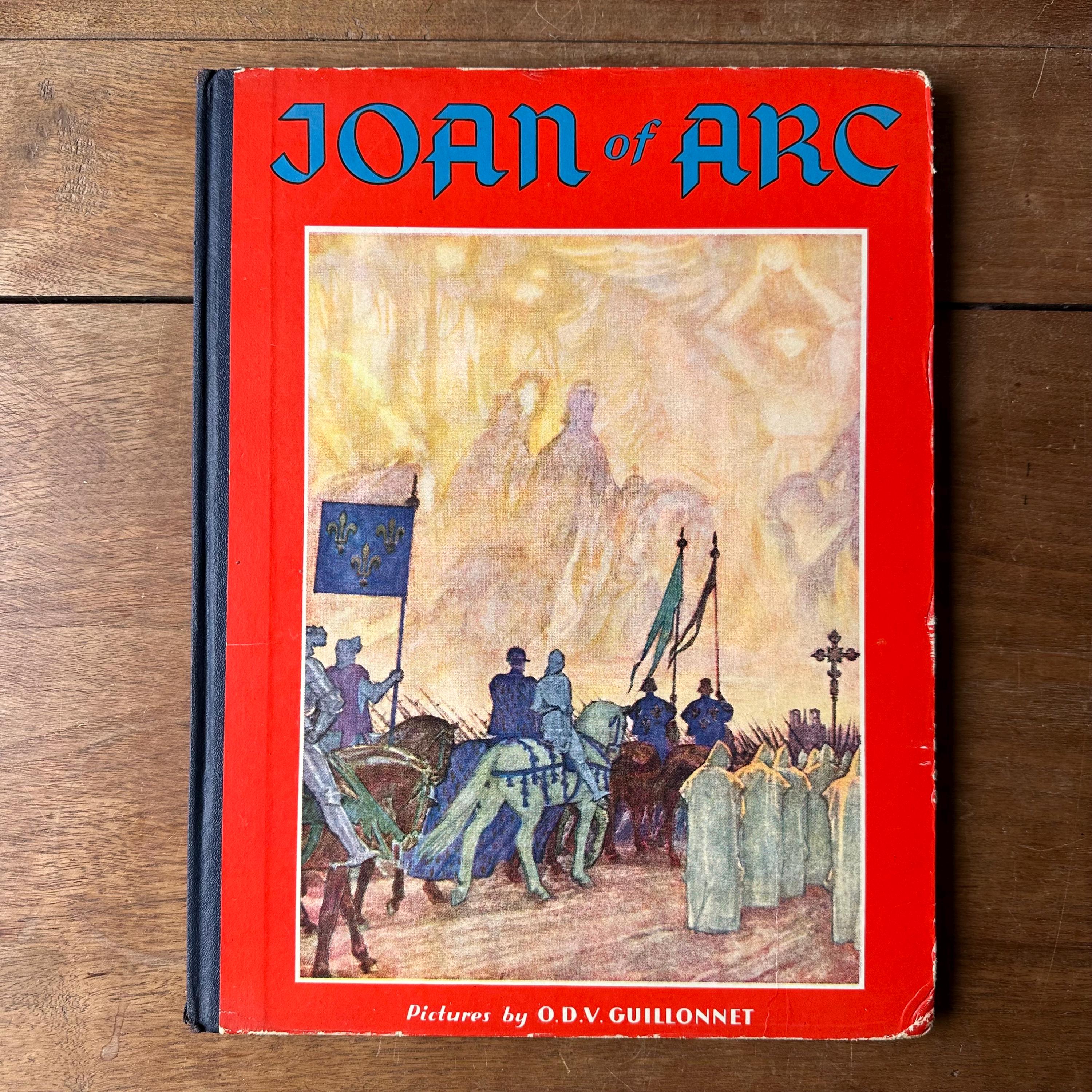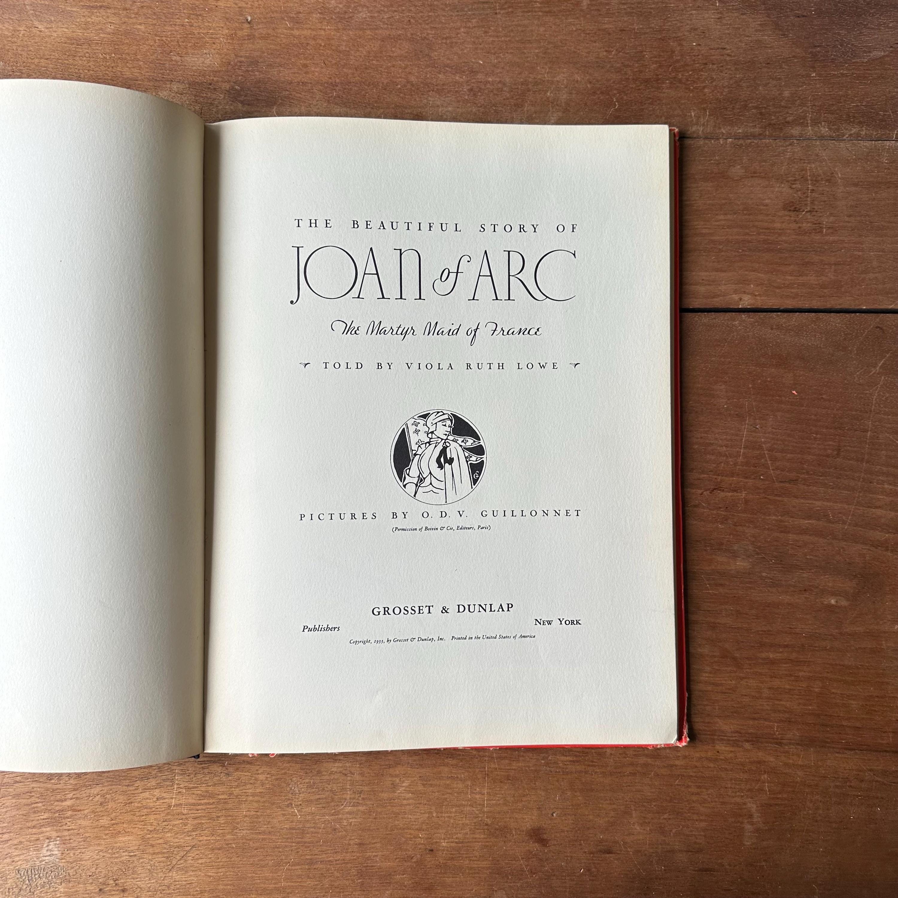 This is the 1933 edition of The Beautiful Story of Joan of Arc: The Martyr Maid of France, told by Viola Ruth Lowe with pictures by O.D.V. Guillonnet and published by Grosset & Dunlap. It has a beautiful full color illustration on the cover with a background of red and a spine of navy. The back cover also has a small portrait of Saint Joan. The inside front and back endpapers are a repeating pattern of a heraldic shield alternating with J for Joan. The book is fully illustrated with full color illustrations. There are 60 pages.