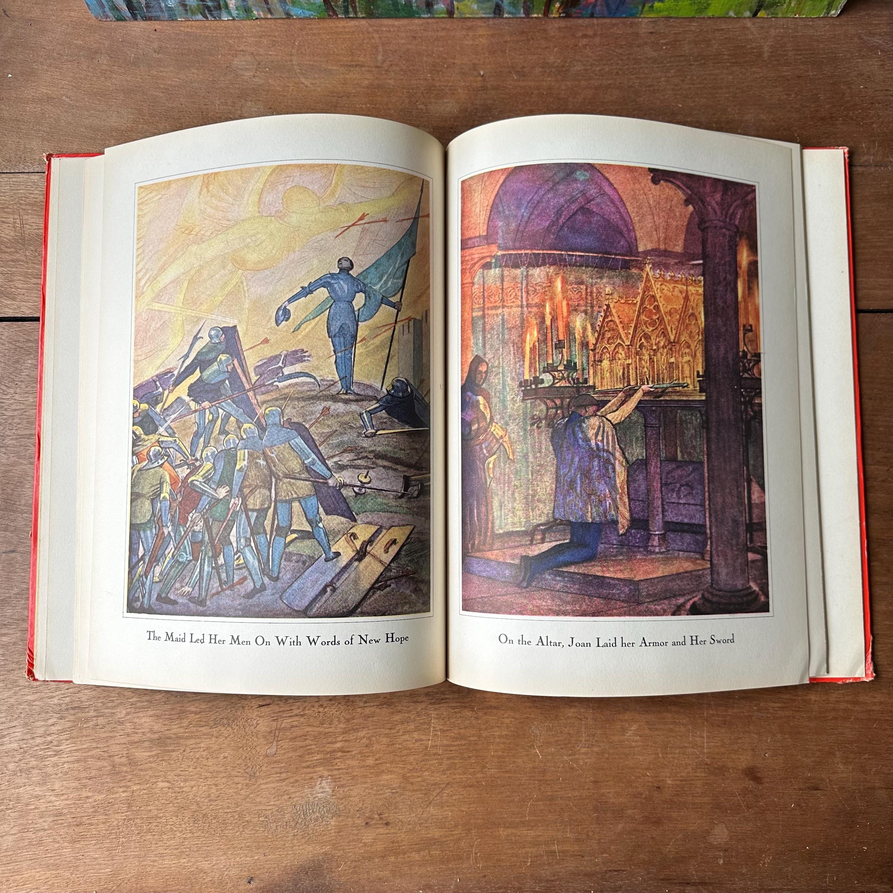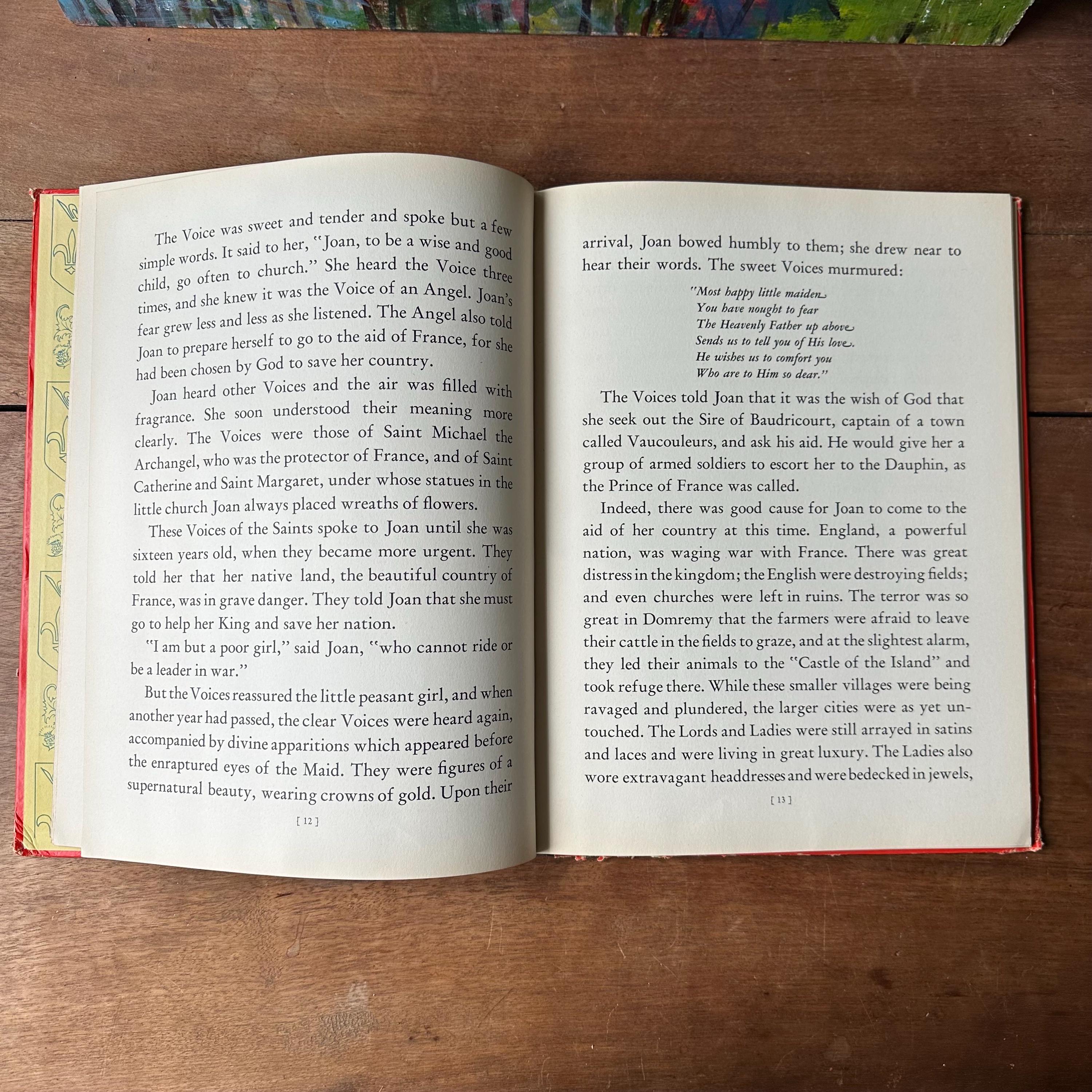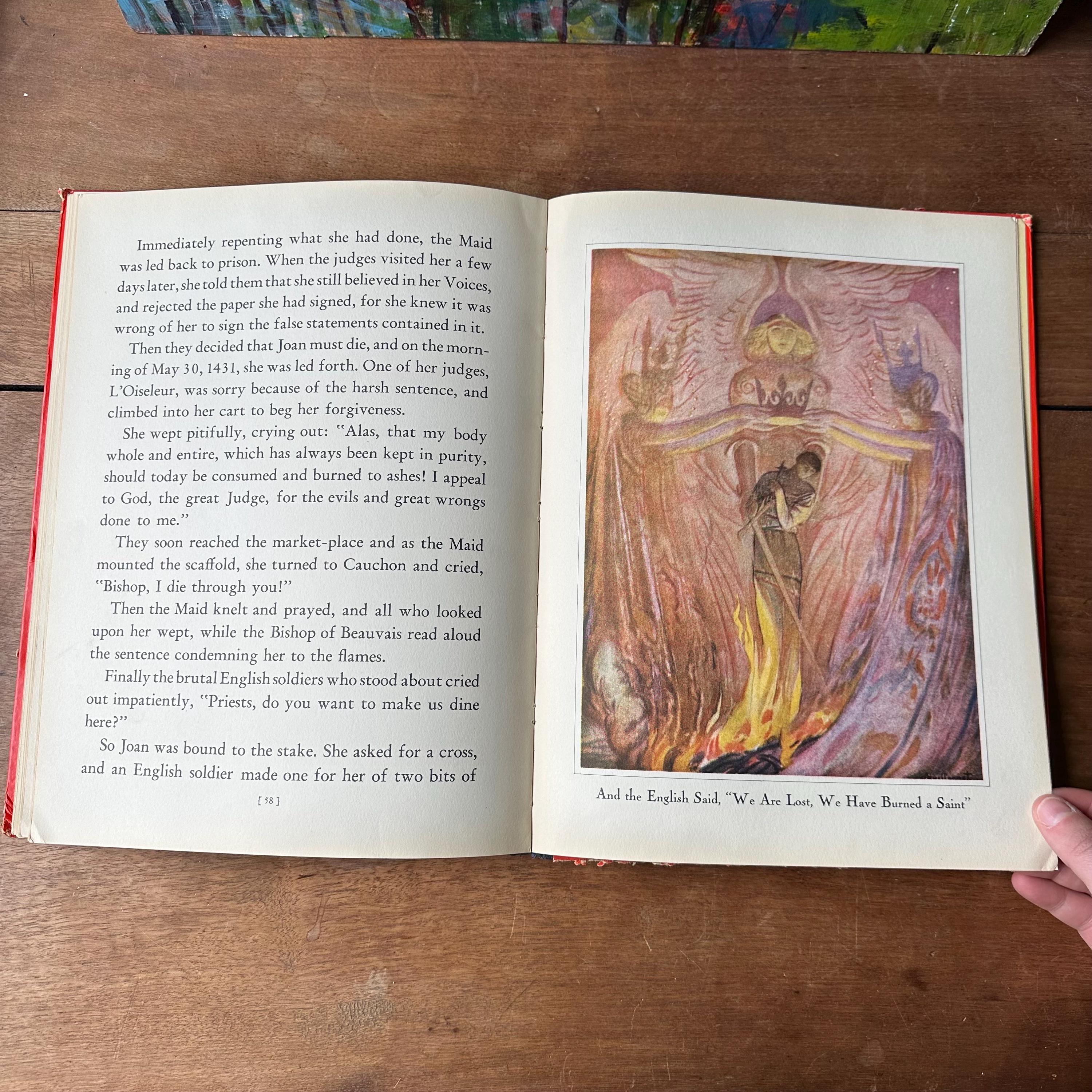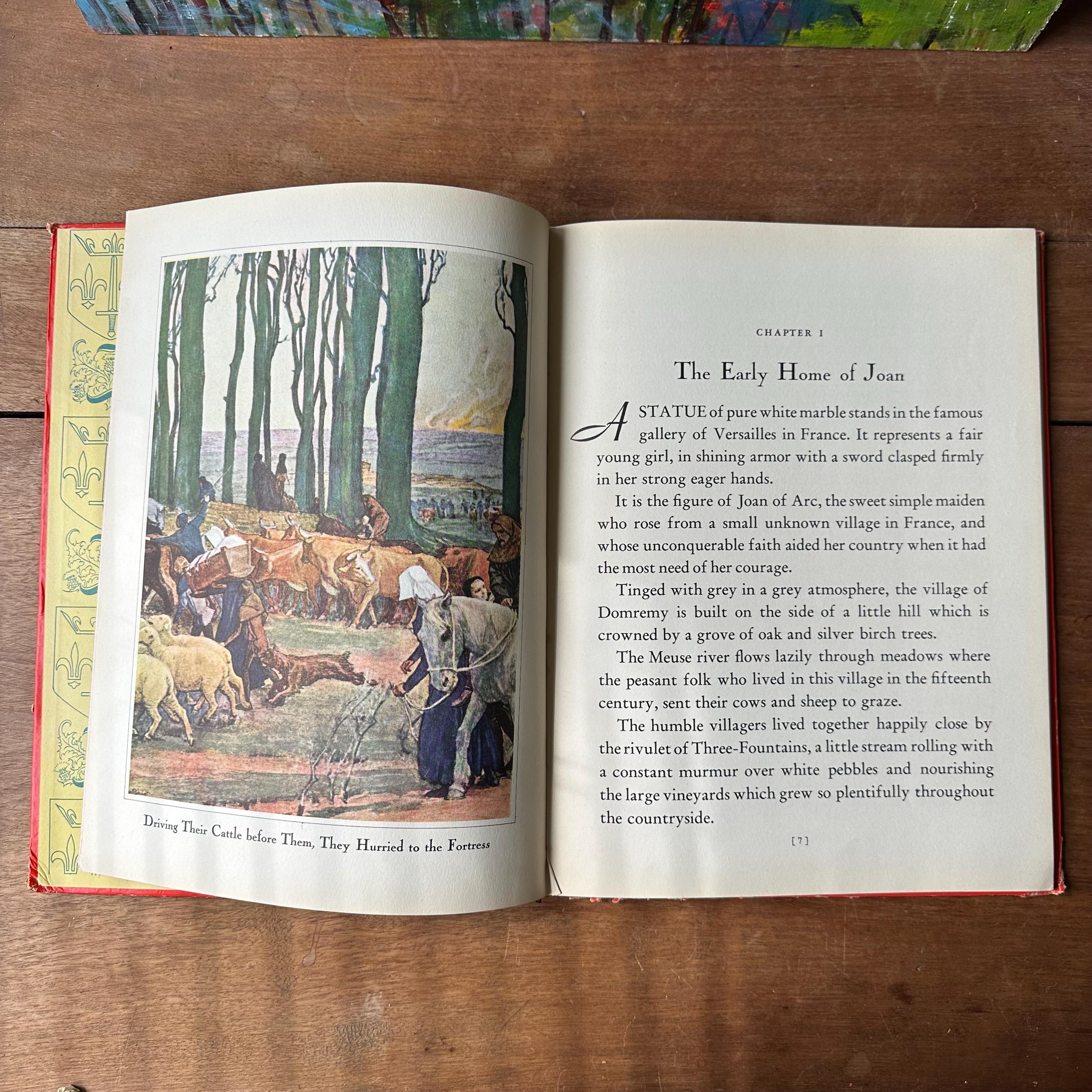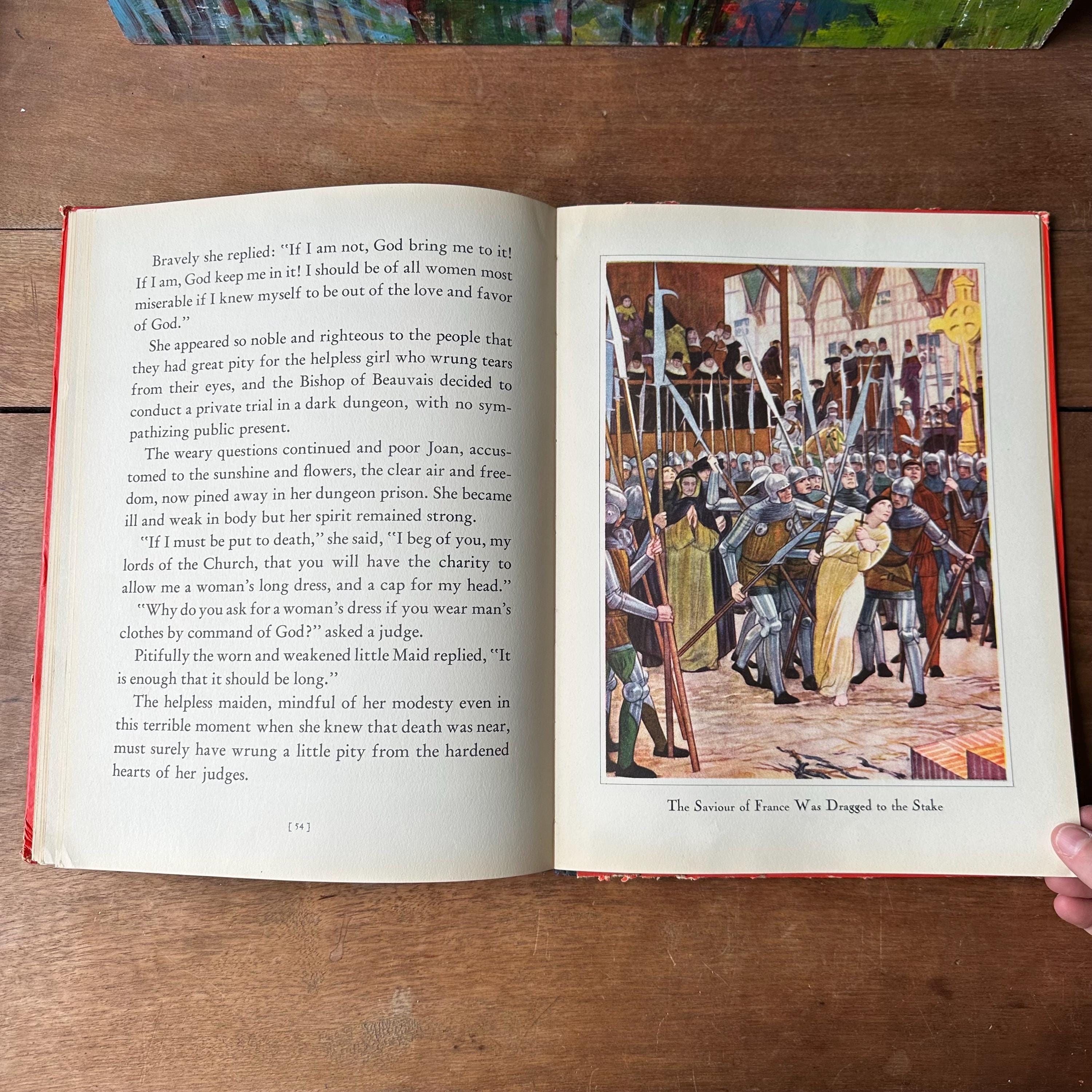 This is the 1933 edition of The Beautiful Story of Joan of Arc: The Martyr Maid of France, told by Viola Ruth Lowe with pictures by O.D.V. Guillonnet and published by Grosset & Dunlap. It has a beautiful full color illustration on the cover with a background of red and a spine of navy. The back cover also has a small portrait of Saint Joan. The inside front and back endpapers are a repeating pattern of a heraldic shield alternating with J for Joan. The book is fully illustrated with full color illustrations. There are 60 pages.