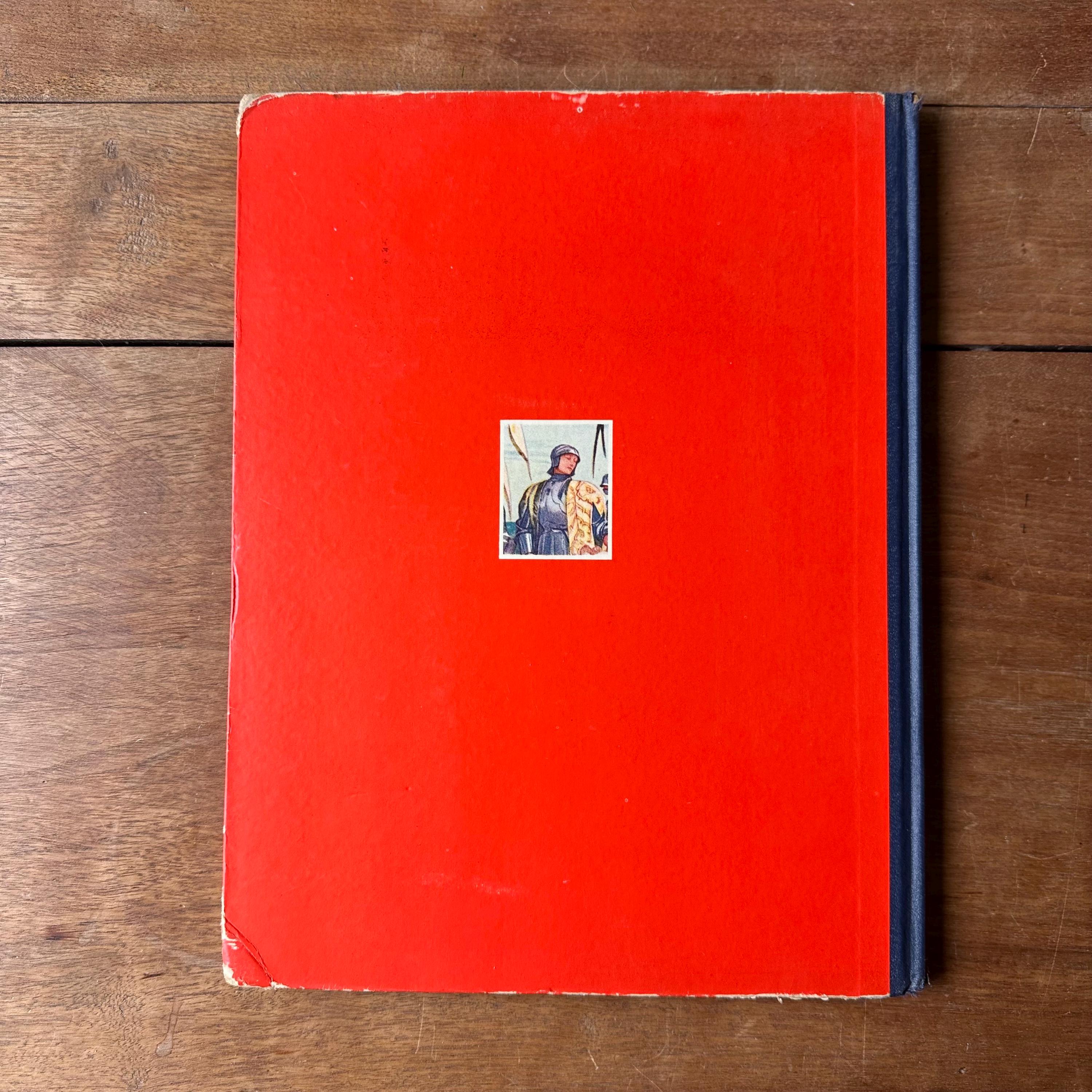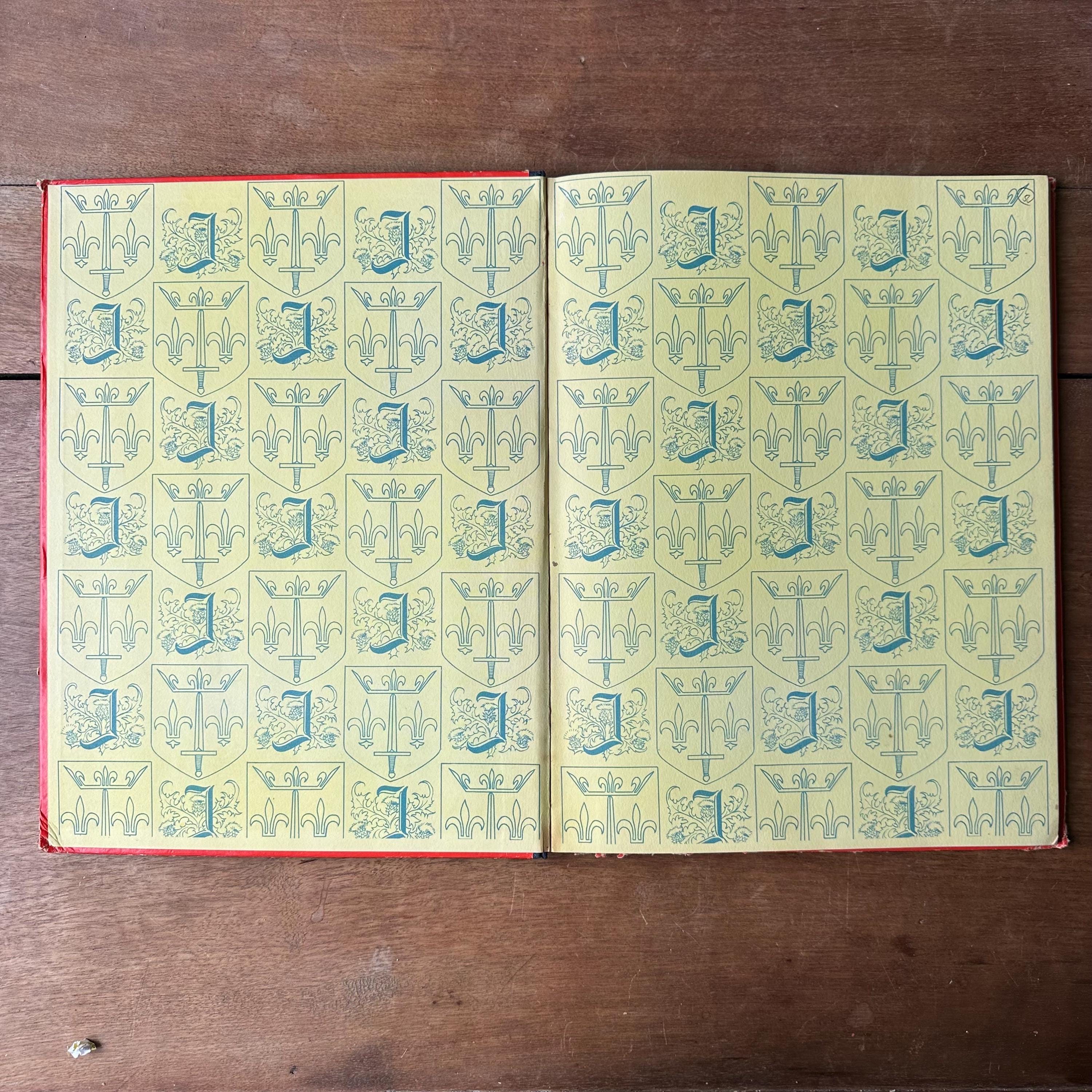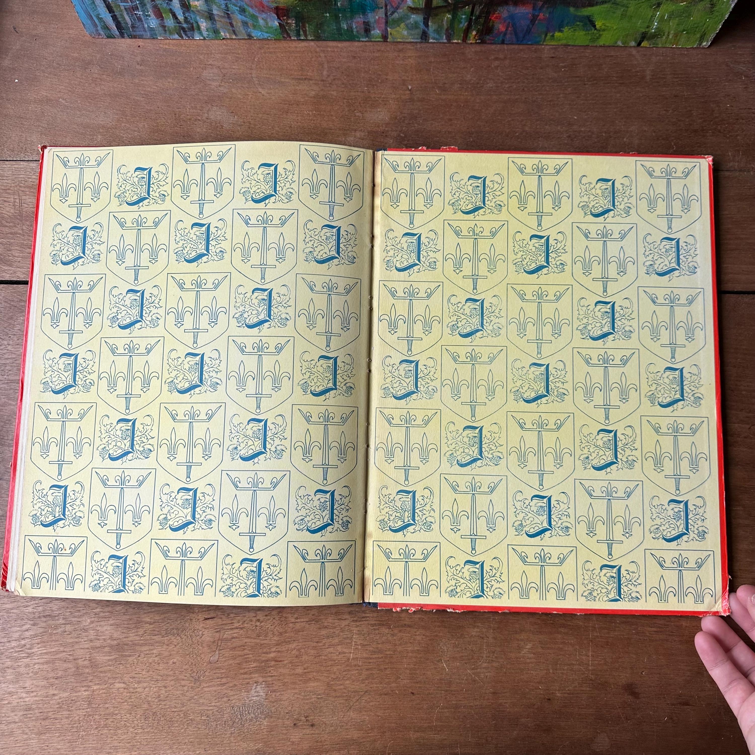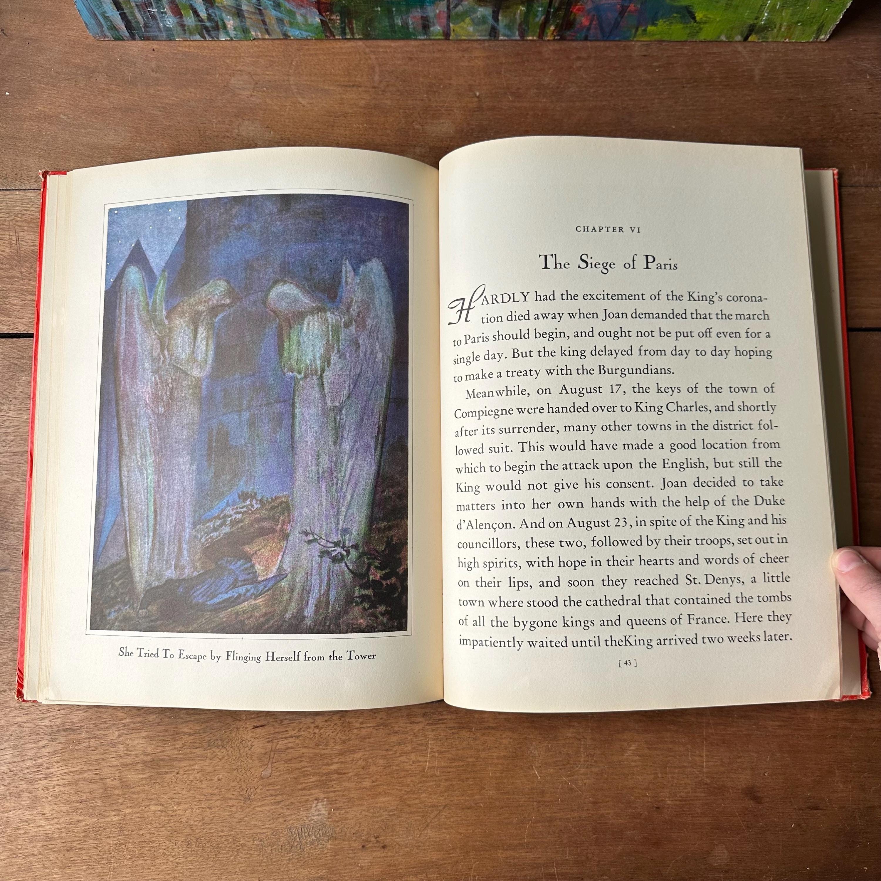 This is the 1933 edition of The Beautiful Story of Joan of Arc: The Martyr Maid of France, told by Viola Ruth Lowe with pictures by O.D.V. Guillonnet and published by Grosset & Dunlap. It has a beautiful full color illustration on the cover with a background of red and a spine of navy. The back cover also has a small portrait of Saint Joan. The inside front and back endpapers are a repeating pattern of a heraldic shield alternating with J for Joan. The book is fully illustrated with full color illustrations. There are 60 pages.