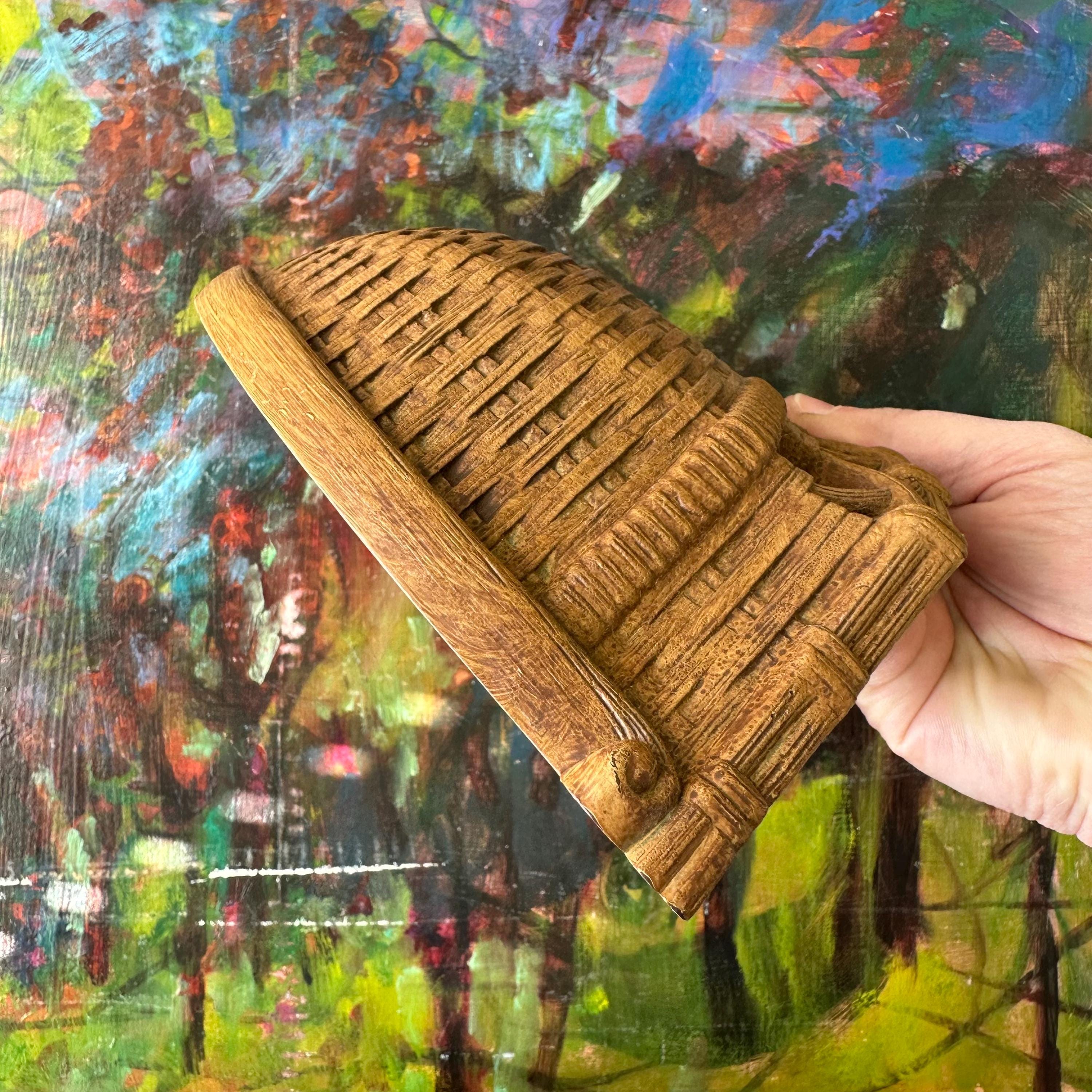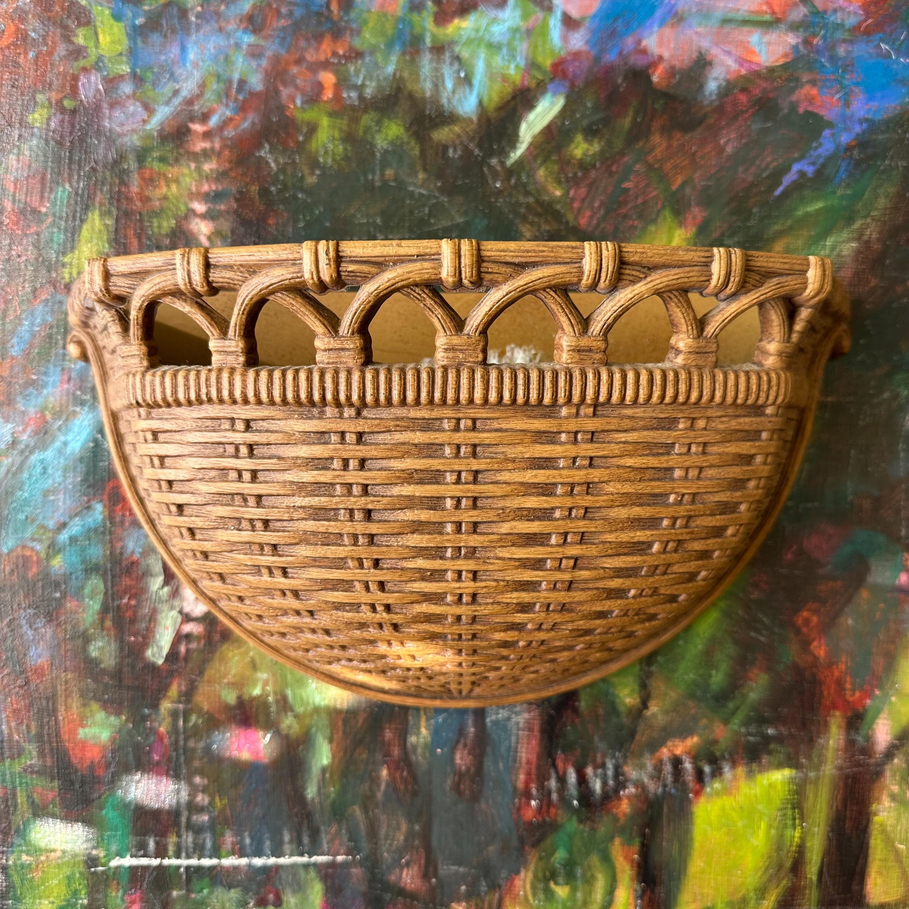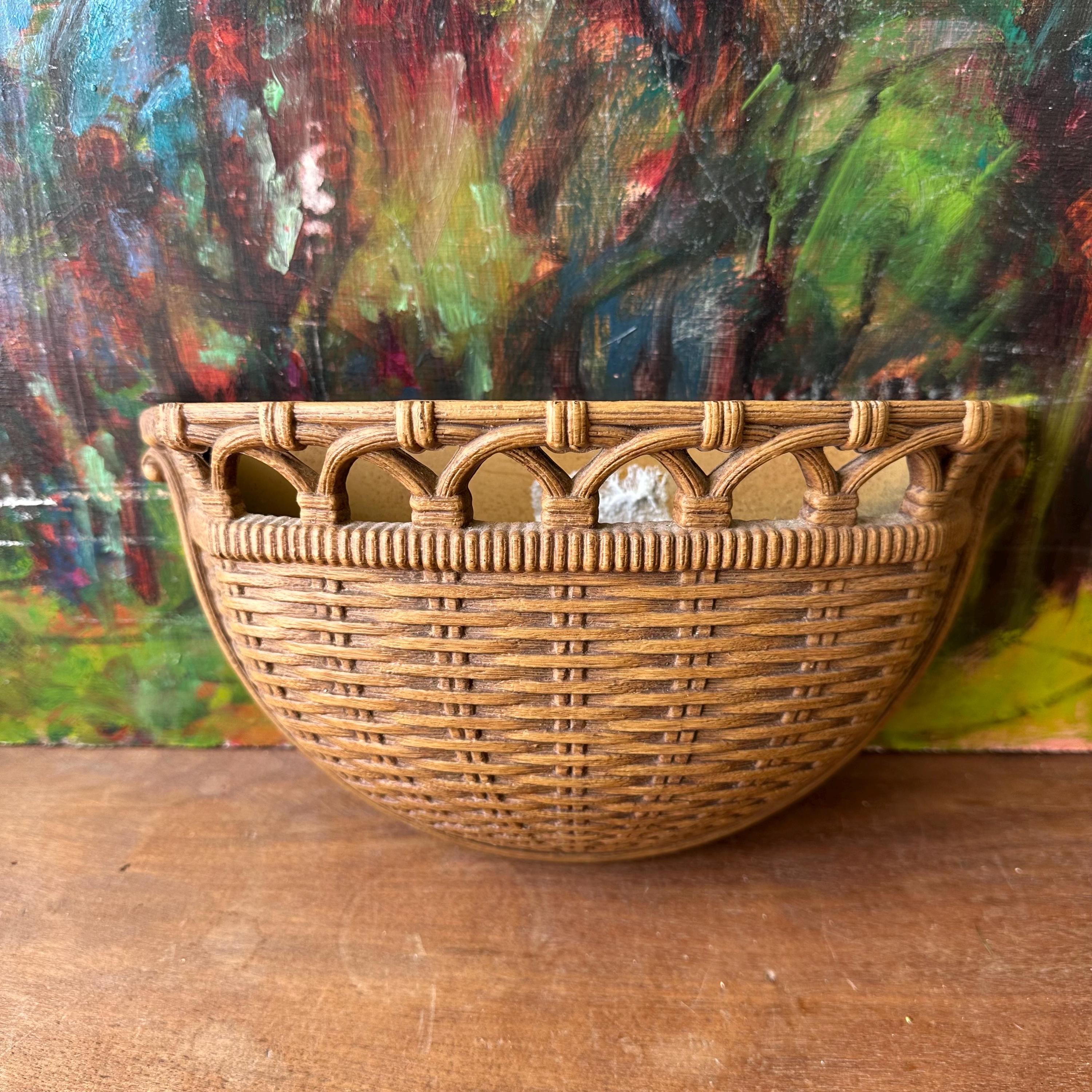 This is a brown resin-plastic basket wall pocket from Homco, made in 1978. It's a great half circle shape with an arched top detail and a little flourish at the top sides. The bottom has the classic rattan weave. The inside and back are both flat plastic. There are two holes at the back for hanging. The back is marked Homco and 1978 in Roman numerals.