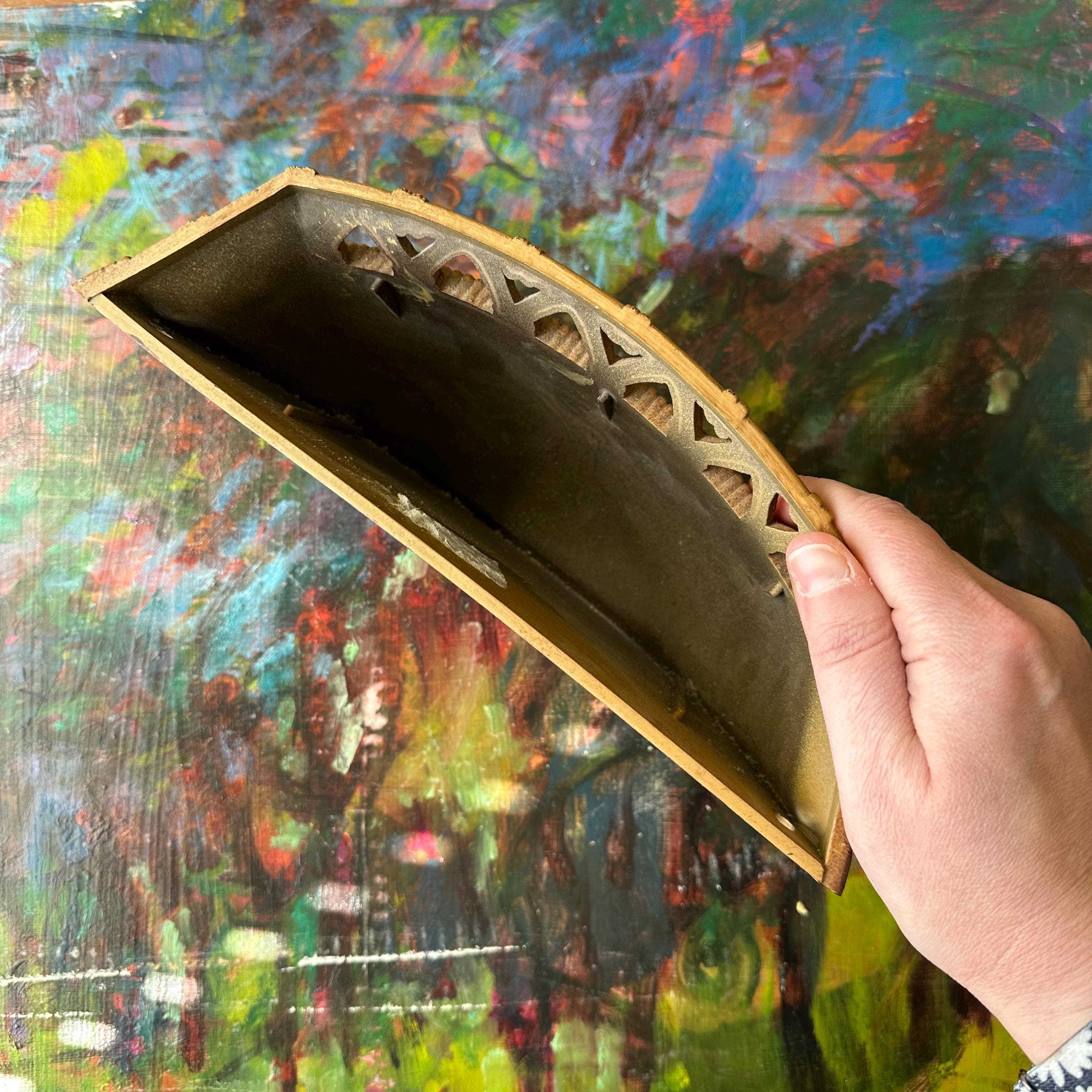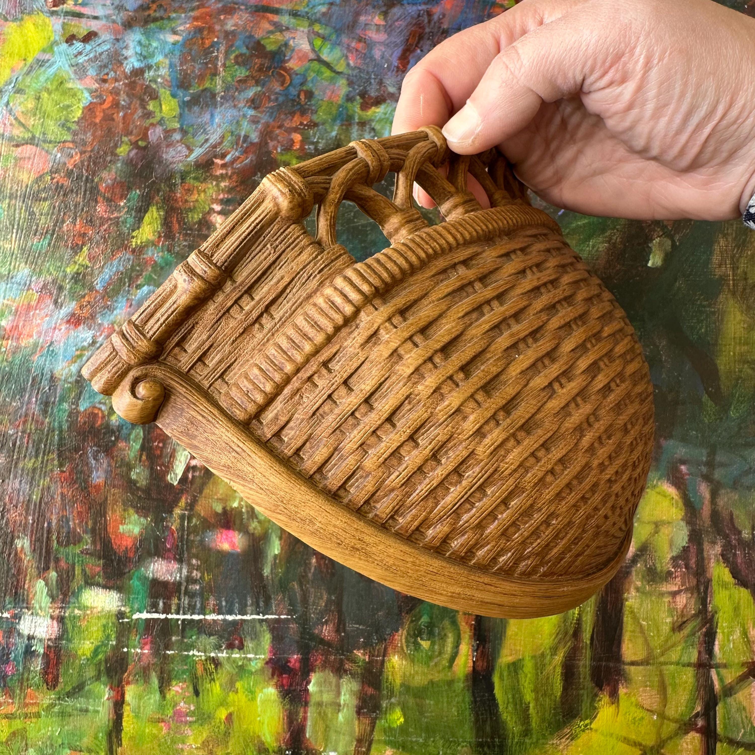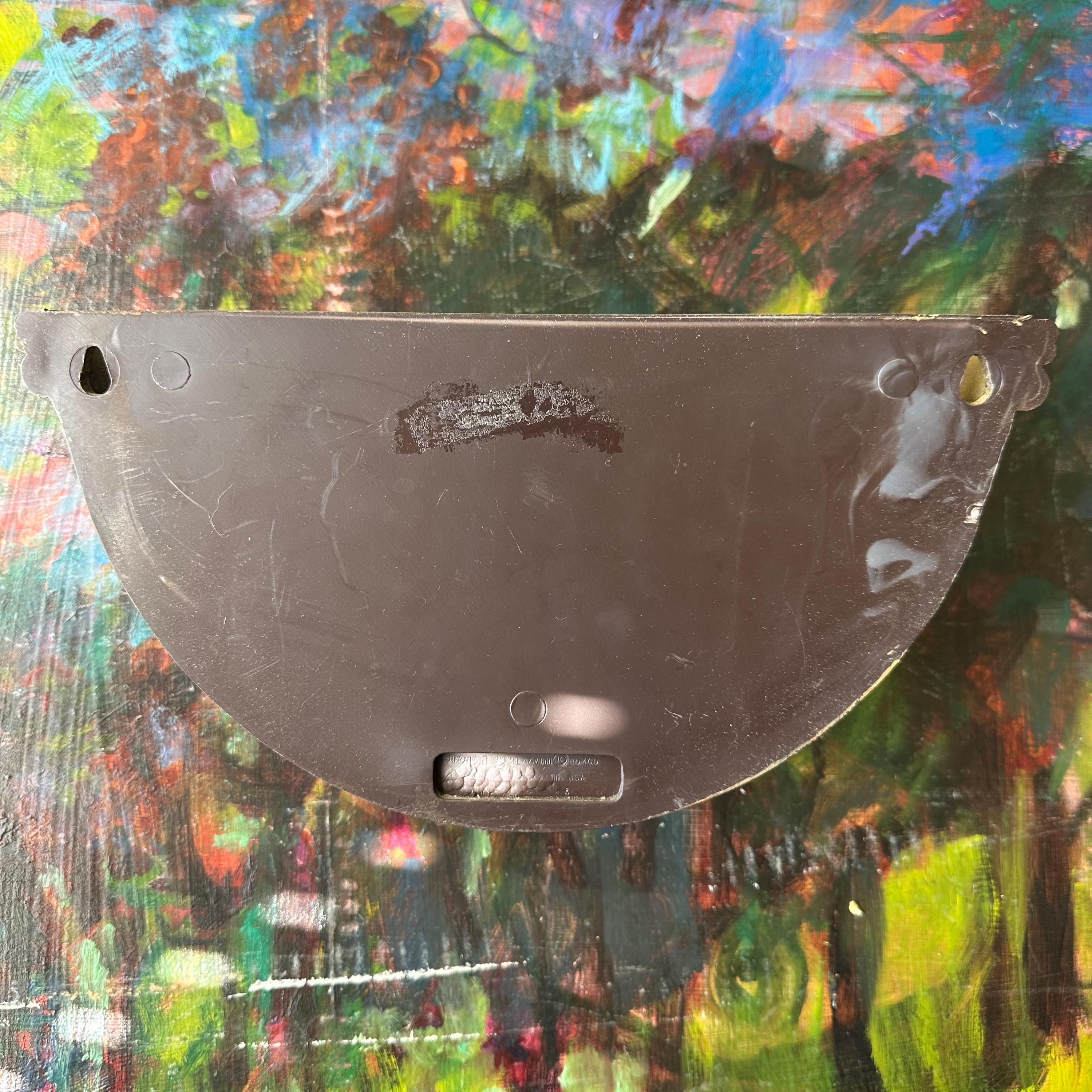 This is a brown resin-plastic basket wall pocket from Homco, made in 1978. It's a great half circle shape with an arched top detail and a little flourish at the top sides. The bottom has the classic rattan weave. The inside and back are both flat plastic. There are two holes at the back for hanging. The back is marked Homco and 1978 in Roman numerals.