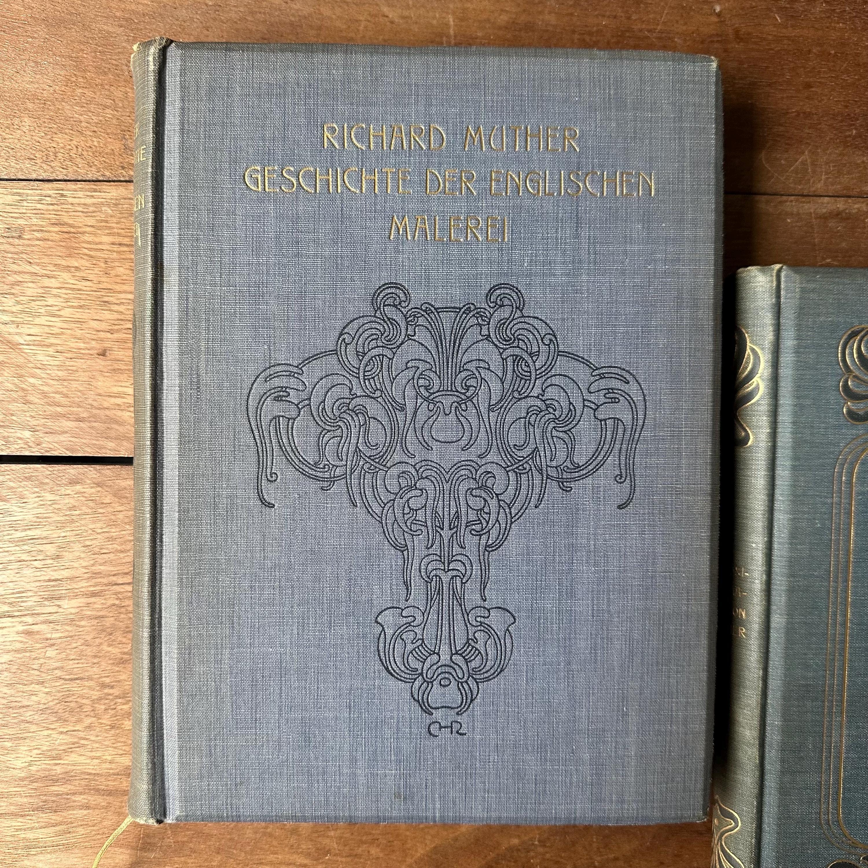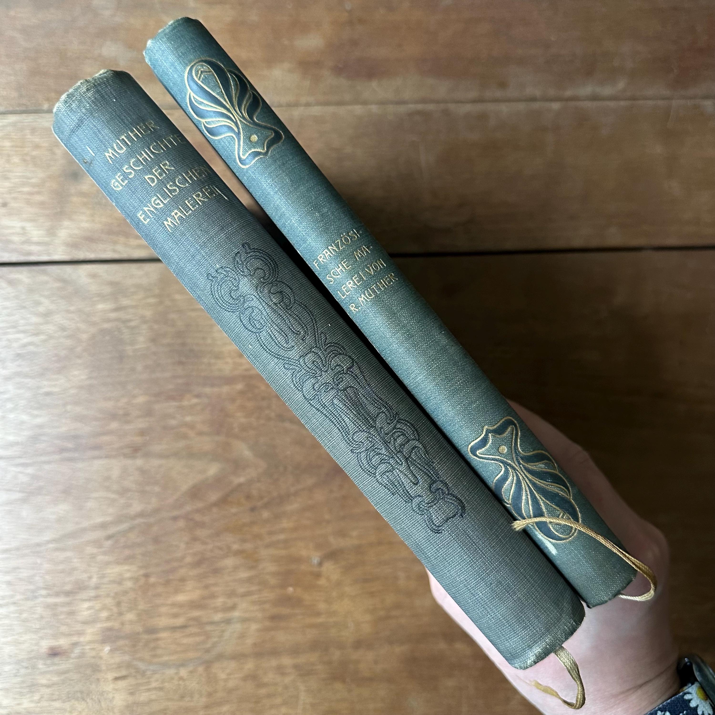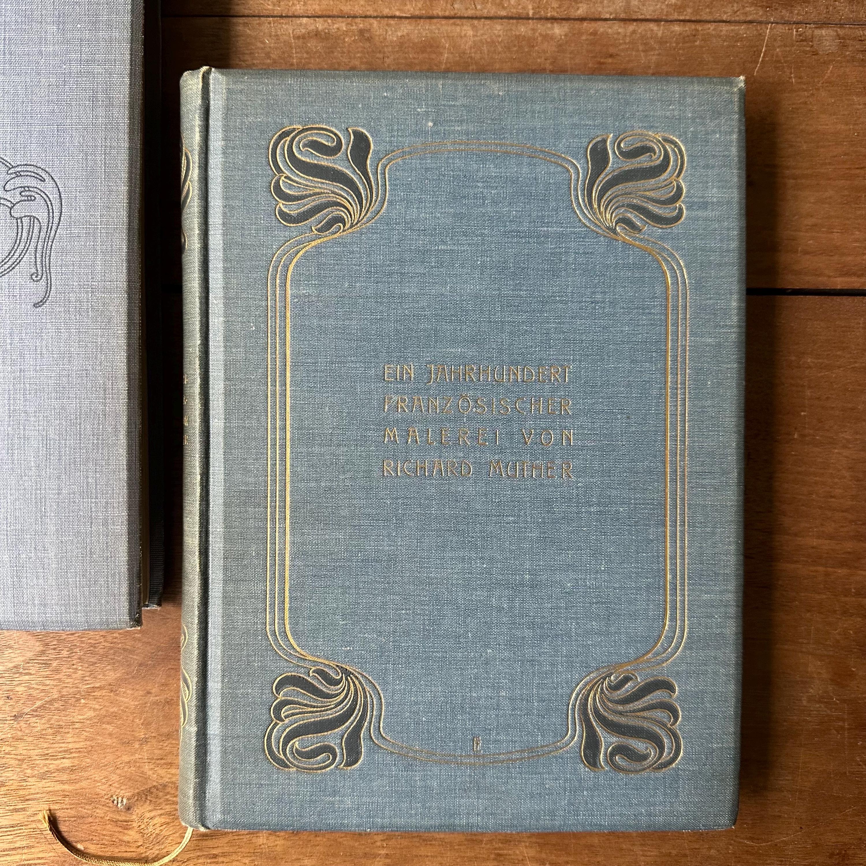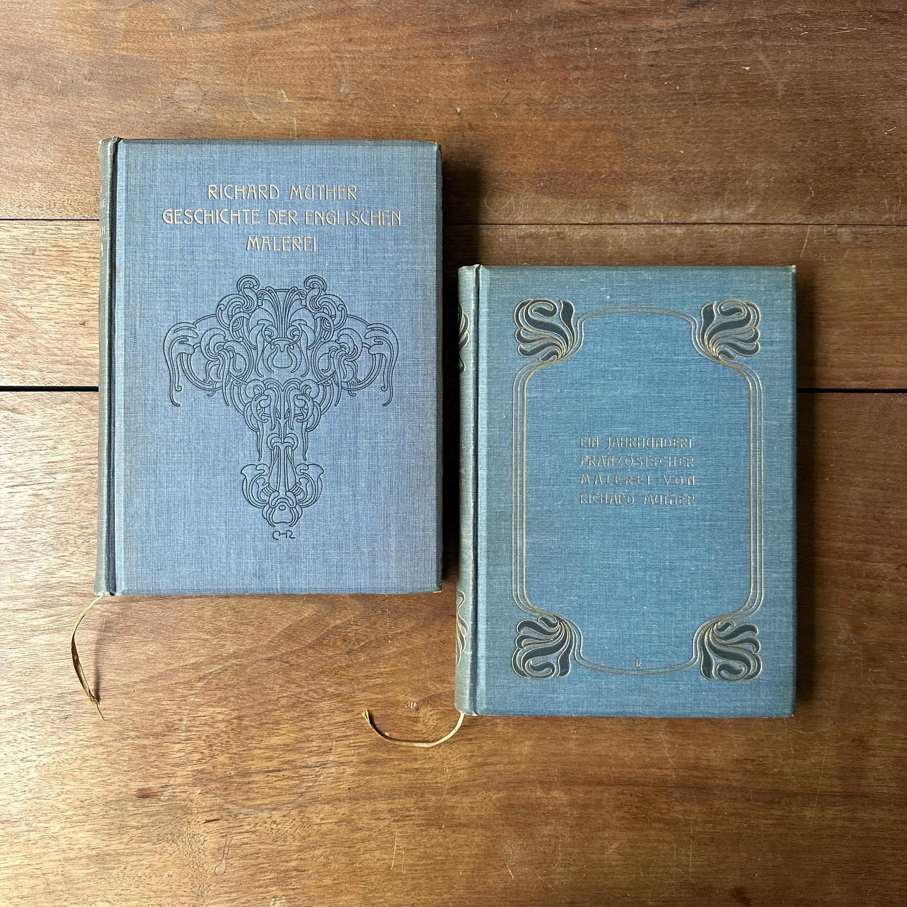 This is a gorgeous set of Art Nouveau inspired antique art history texts by Richard Muther. There are two books in the set both with blue-gray covers, gold detailing, and gold lettering. The set includes Ein Jahrhundert Franzosischer Malerei (A History of French Painting) published in 1901 and Geschichte der Englischen Malerei (A History of English Painting) published in 1903. Both published by S. Fischer. French Painting has brown and gold endpapers. Both books have black and white illustration plates of famous paintings. Both have gold ribbon bookmarks. English Painting has 400 pages and French Painting has 323 pages.