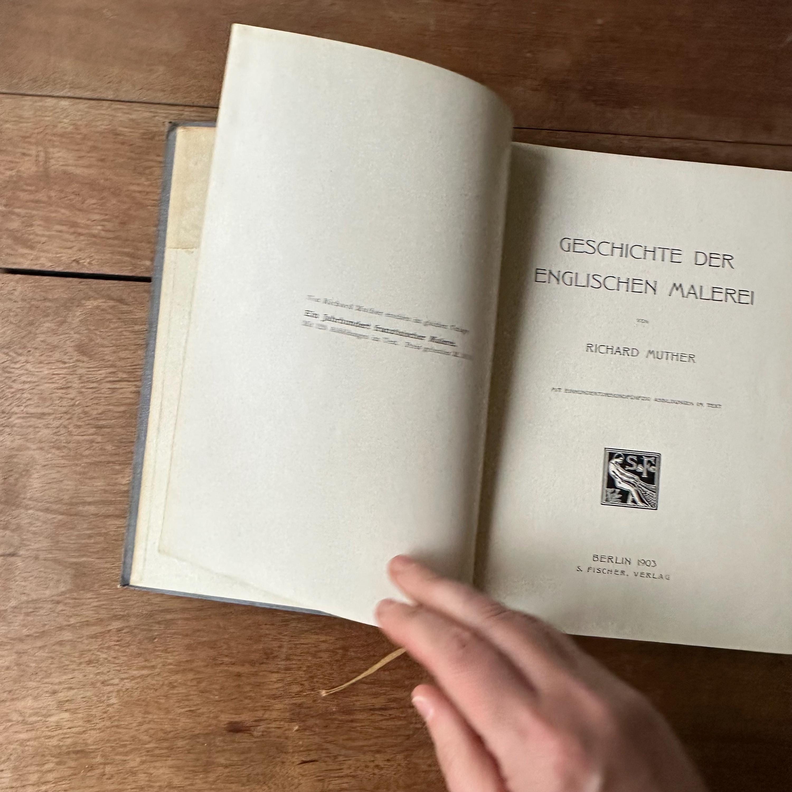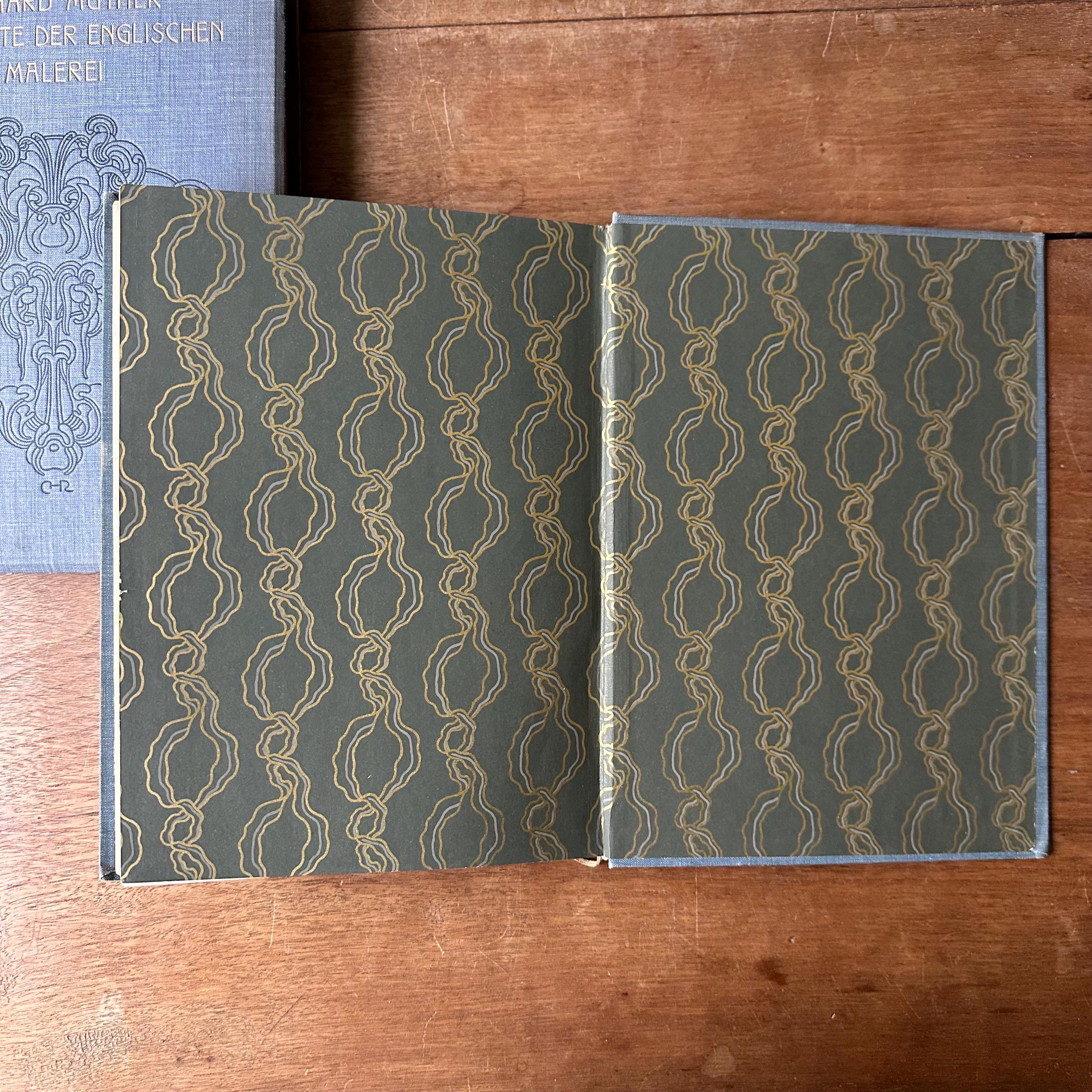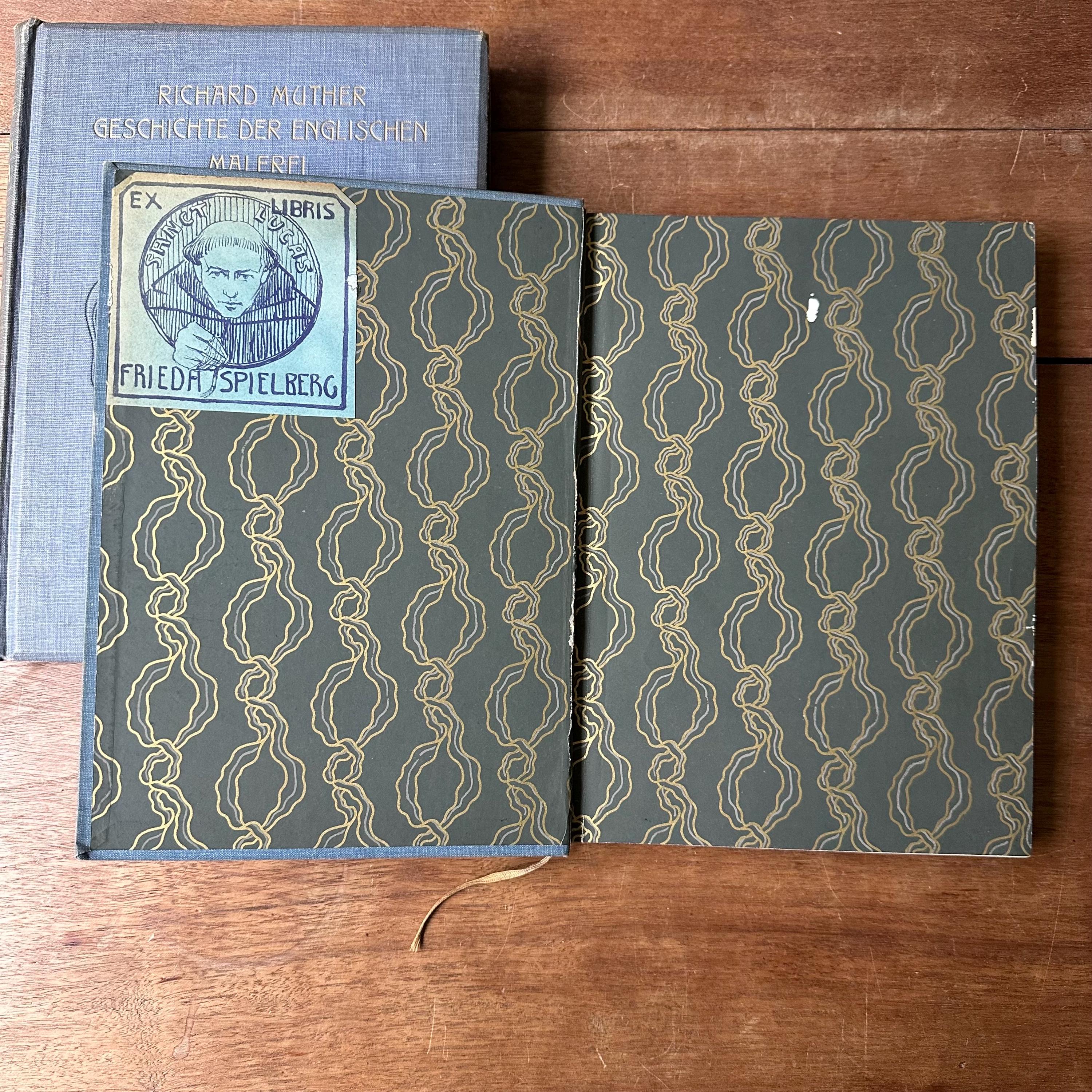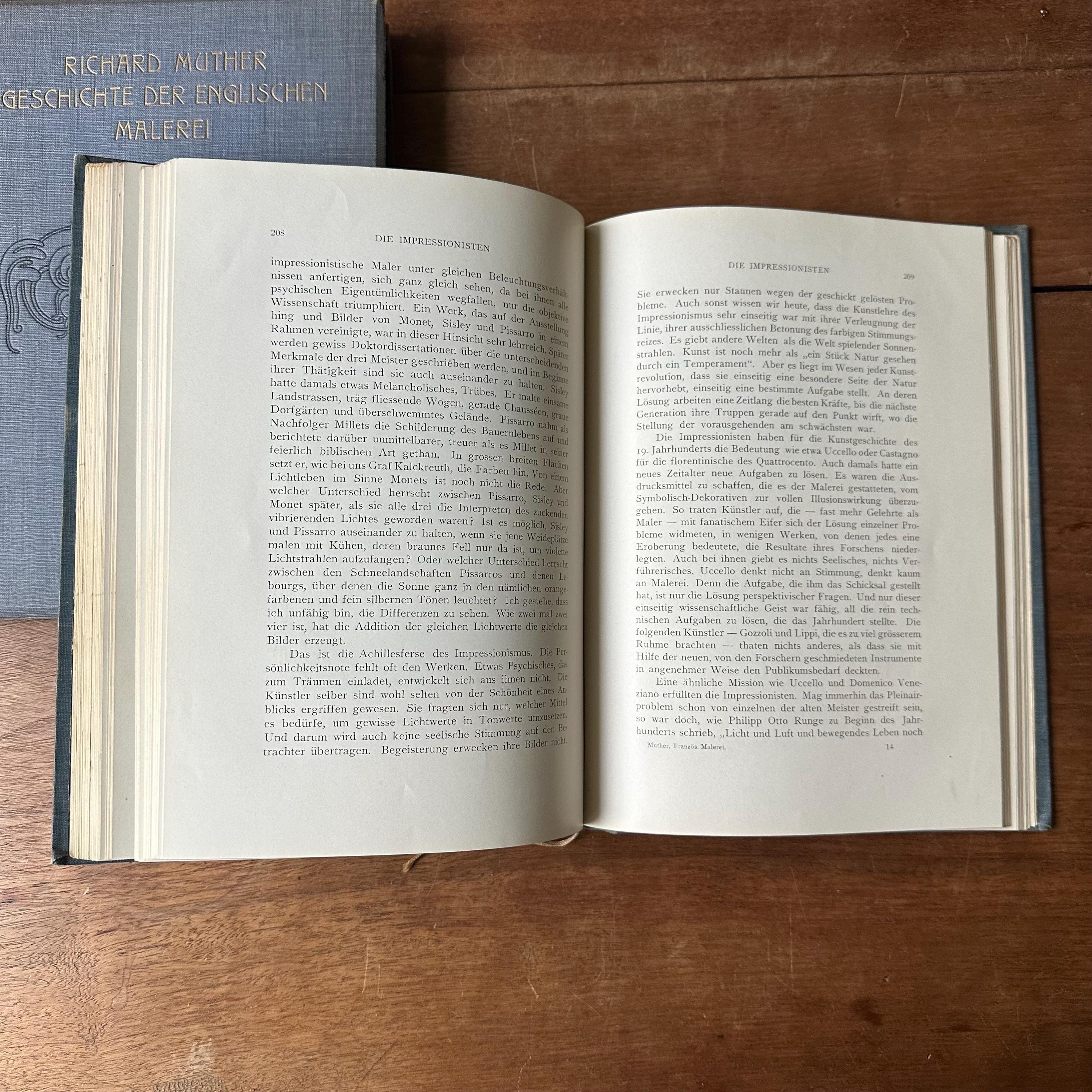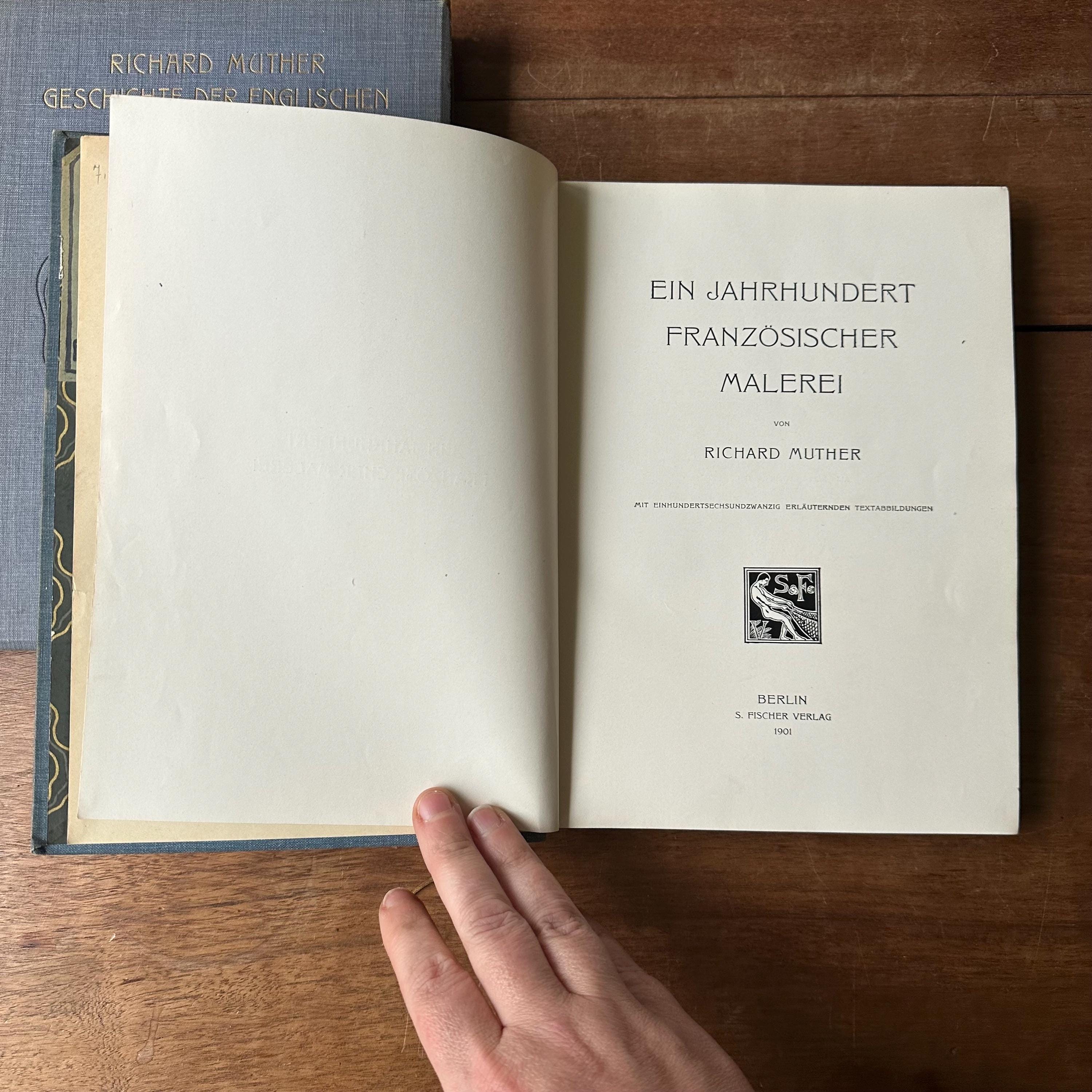 This is a gorgeous set of Art Nouveau inspired antique art history texts by Richard Muther. There are two books in the set both with blue-gray covers, gold detailing, and gold lettering. The set includes Ein Jahrhundert Franzosischer Malerei (A History of French Painting) published in 1901 and Geschichte der Englischen Malerei (A History of English Painting) published in 1903. Both published by S. Fischer. French Painting has brown and gold endpapers. Both books have black and white illustration plates of famous paintings. Both have gold ribbon bookmarks. English Painting has 400 pages and French Painting has 323 pages.