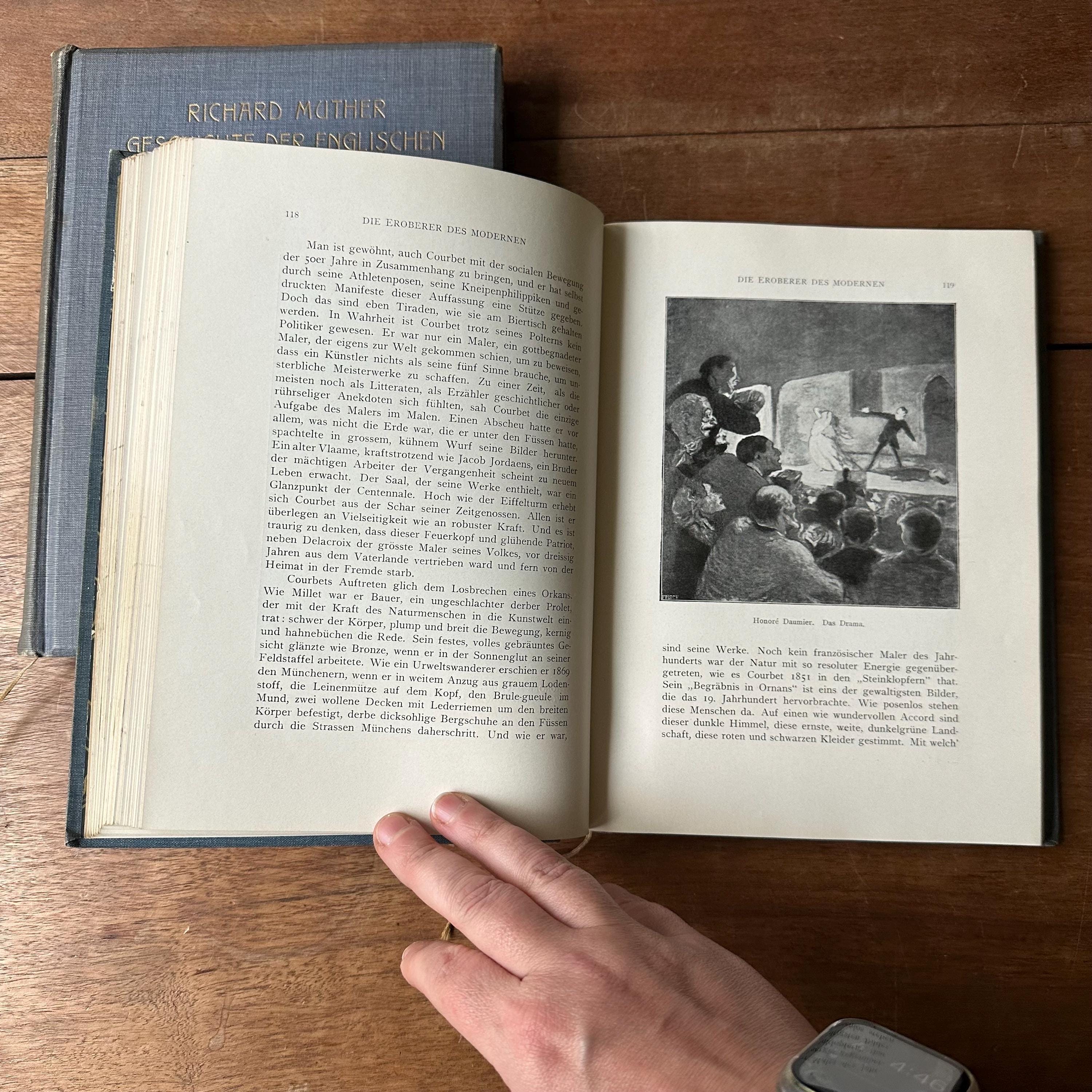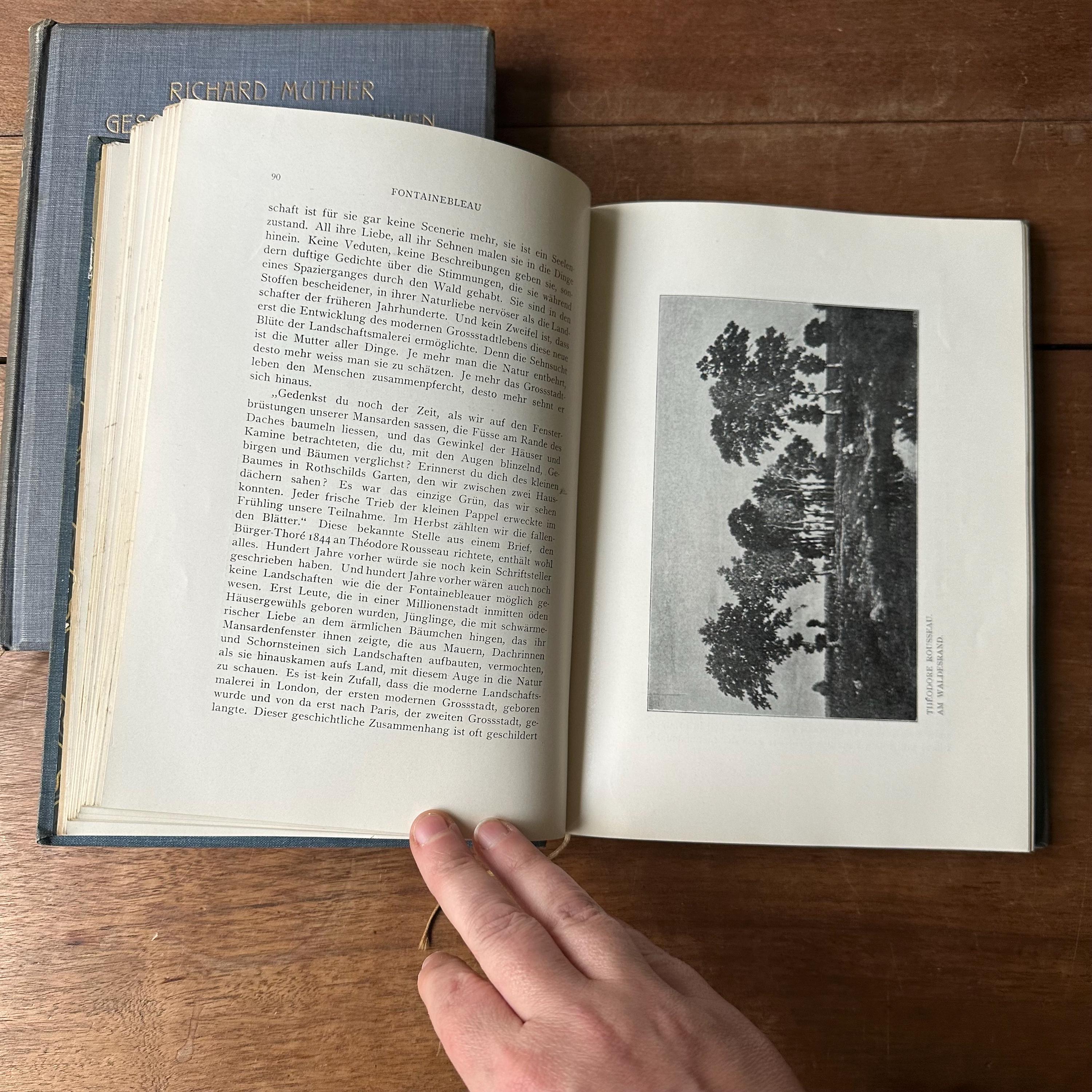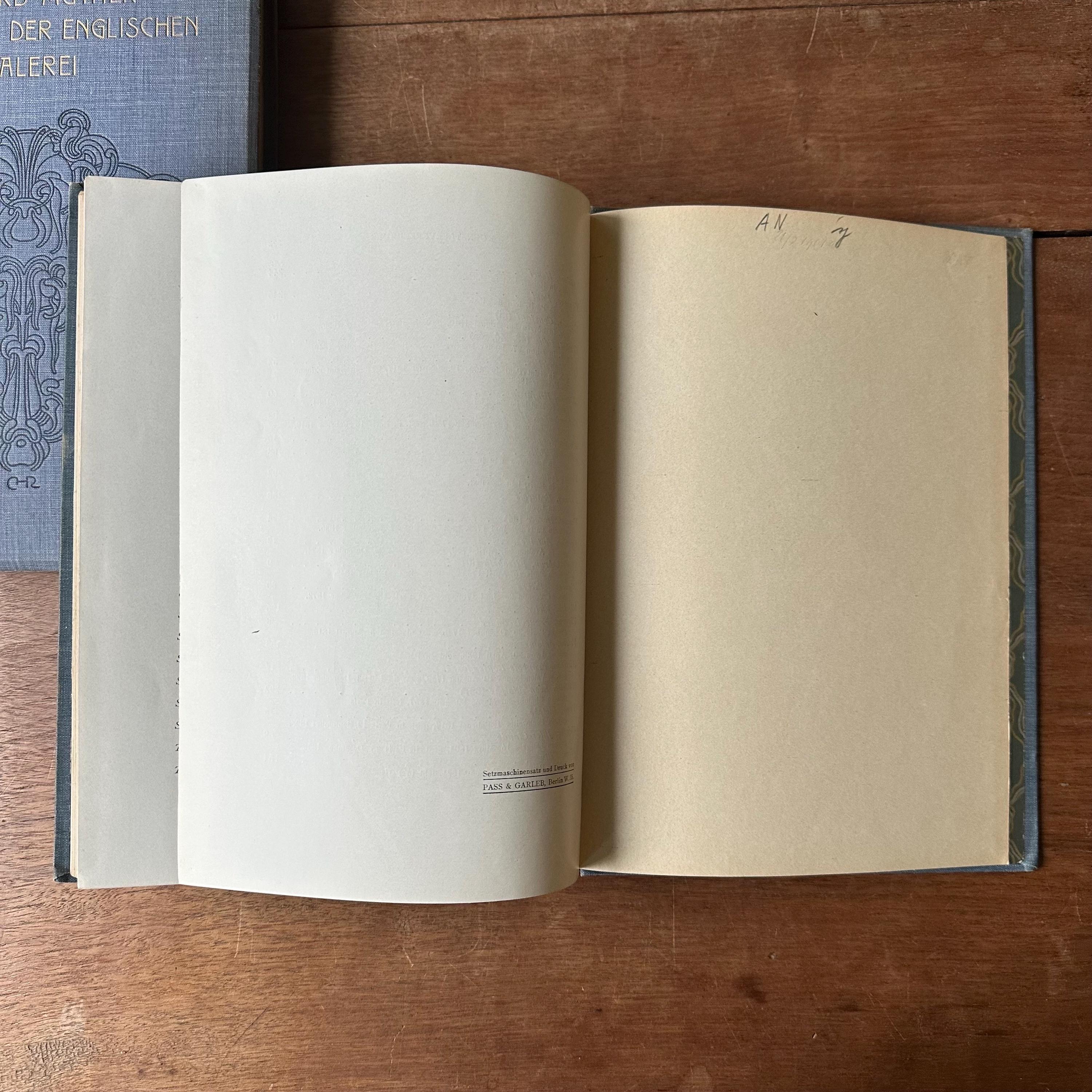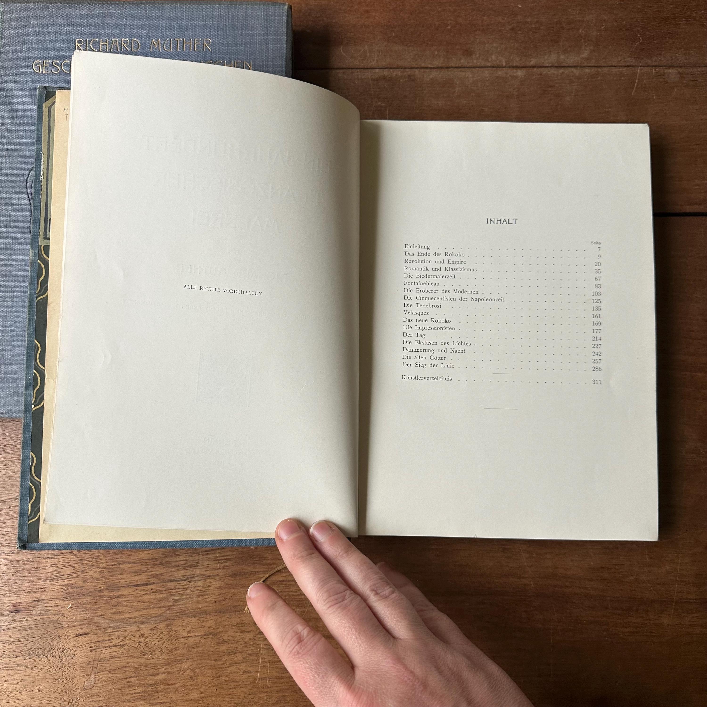 This is a gorgeous set of Art Nouveau inspired antique art history texts by Richard Muther. There are two books in the set both with blue-gray covers, gold detailing, and gold lettering. The set includes Ein Jahrhundert Franzosischer Malerei (A History of French Painting) published in 1901 and Geschichte der Englischen Malerei (A History of English Painting) published in 1903. Both published by S. Fischer. French Painting has brown and gold endpapers. Both books have black and white illustration plates of famous paintings. Both have gold ribbon bookmarks. English Painting has 400 pages and French Painting has 323 pages.