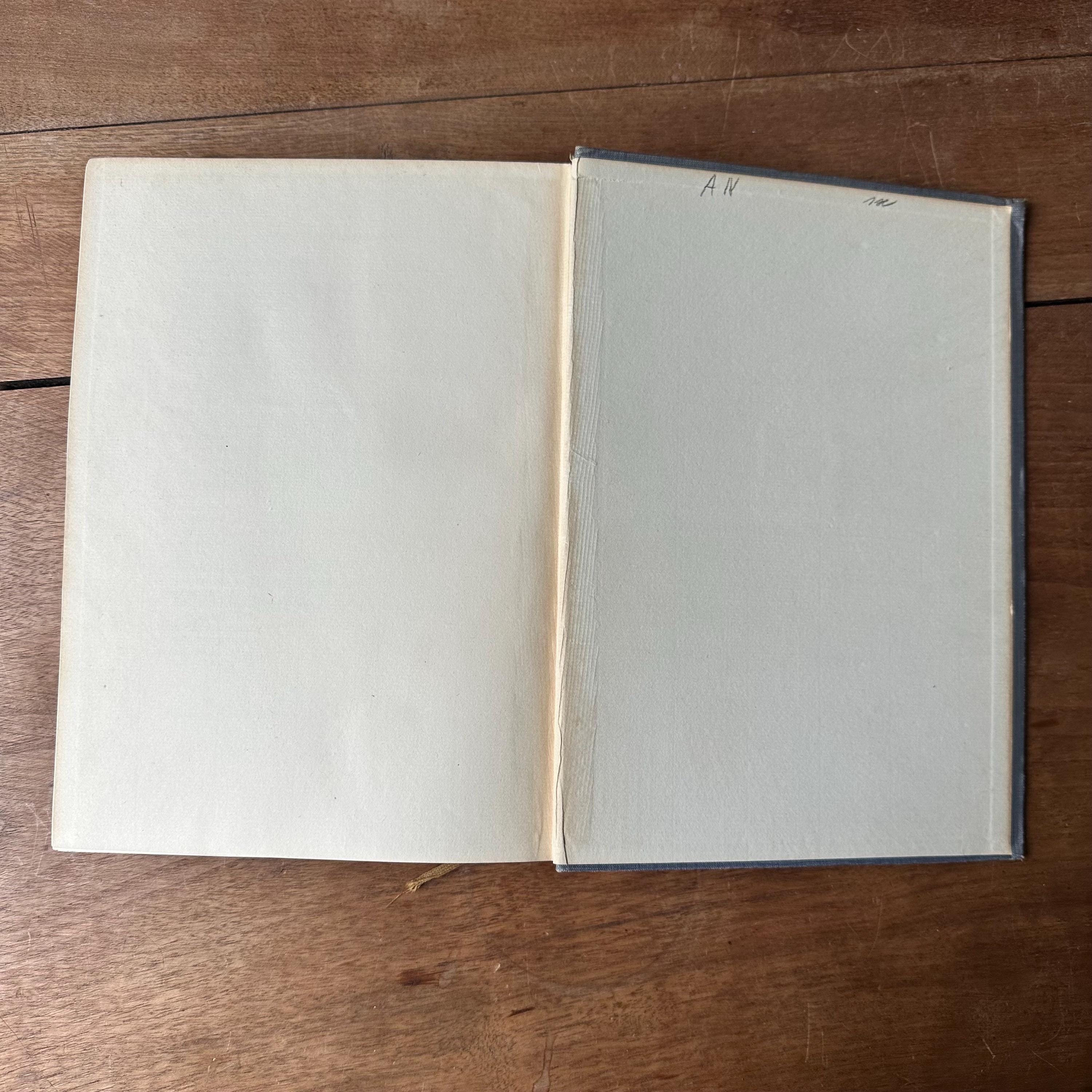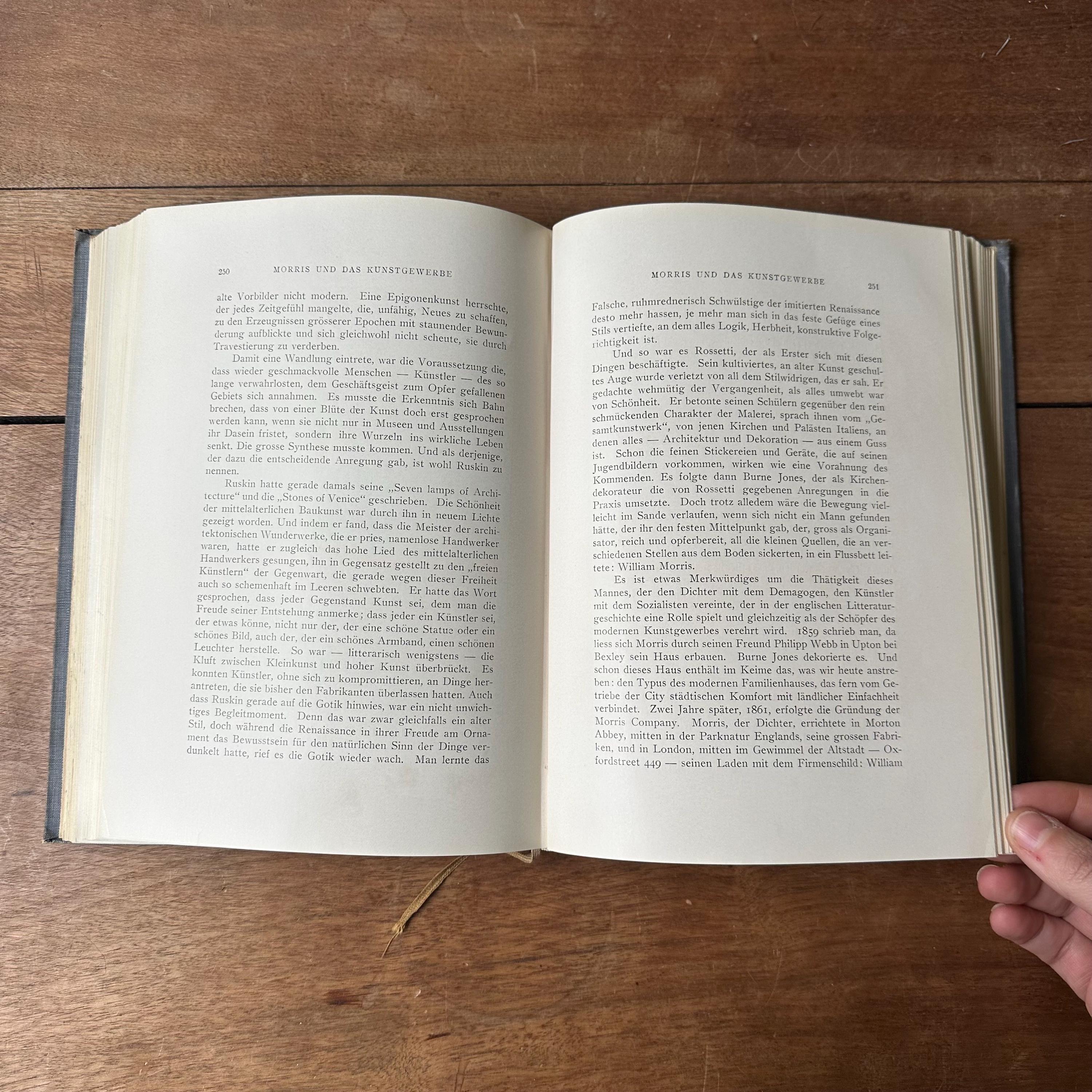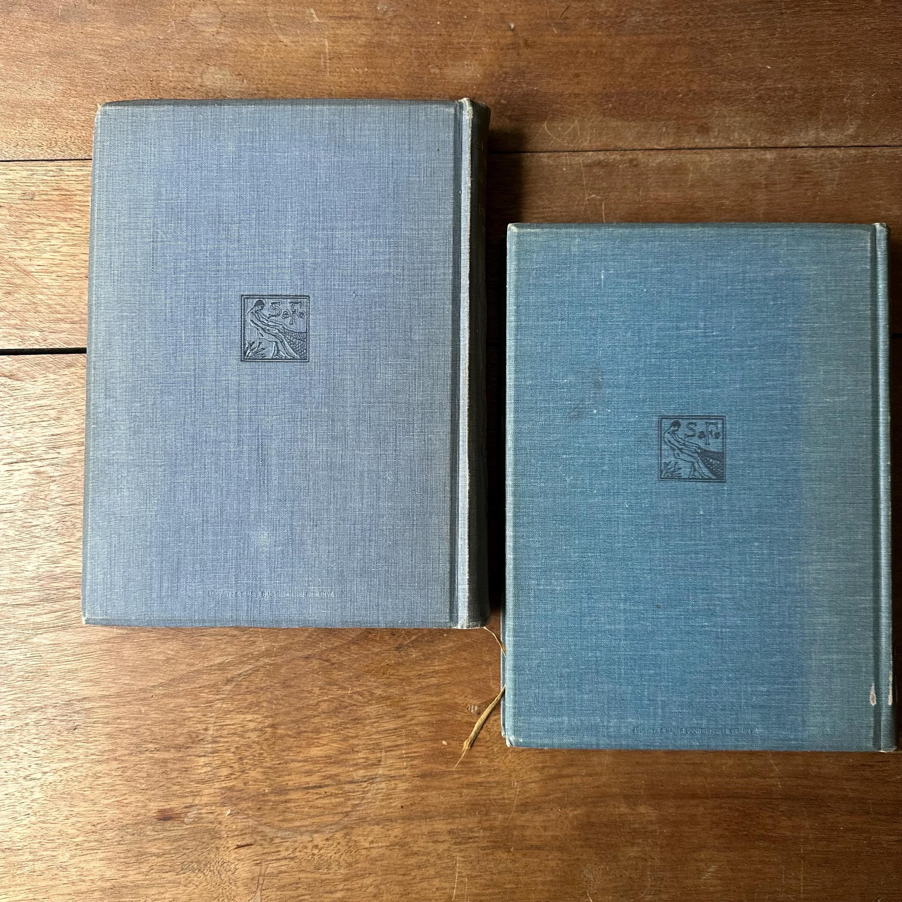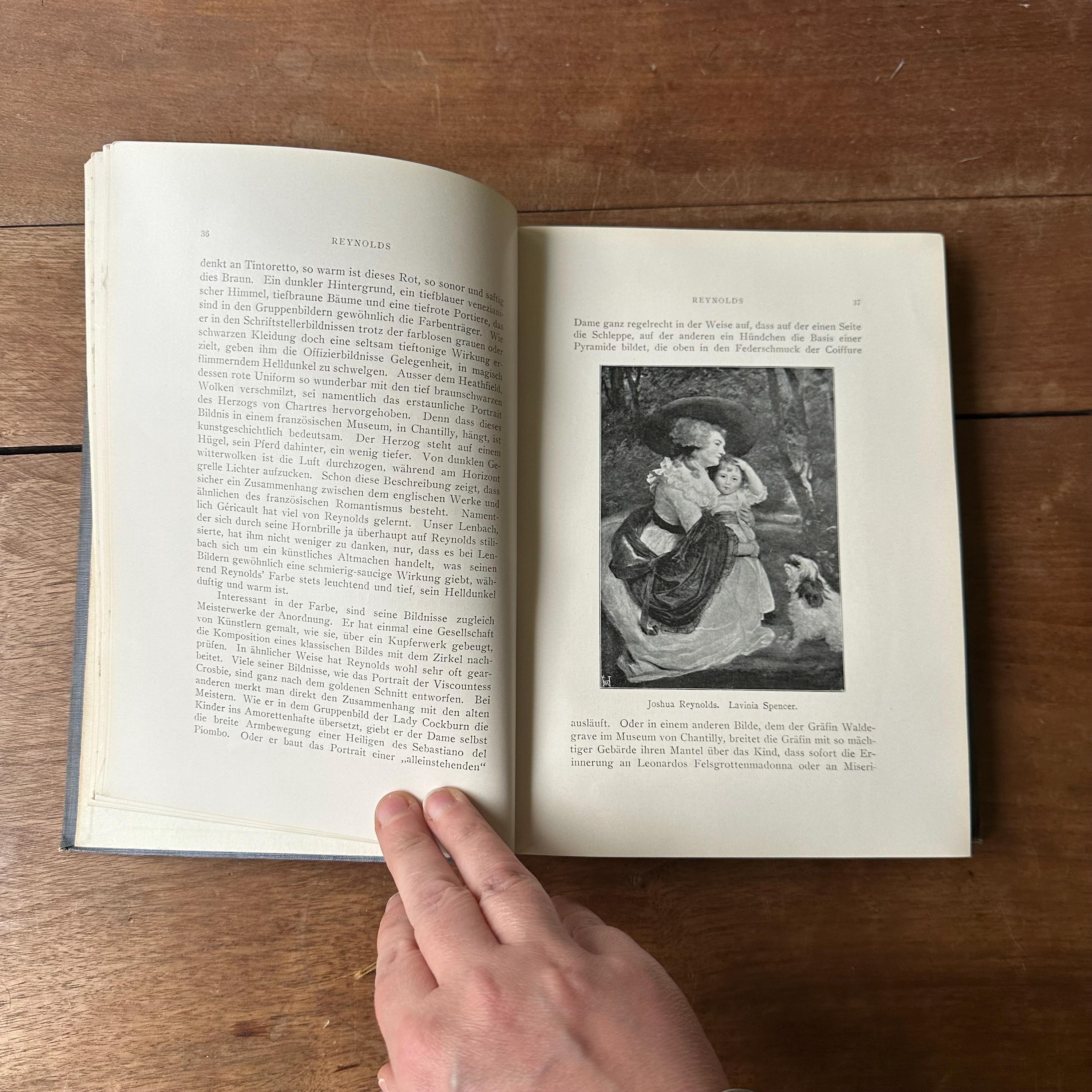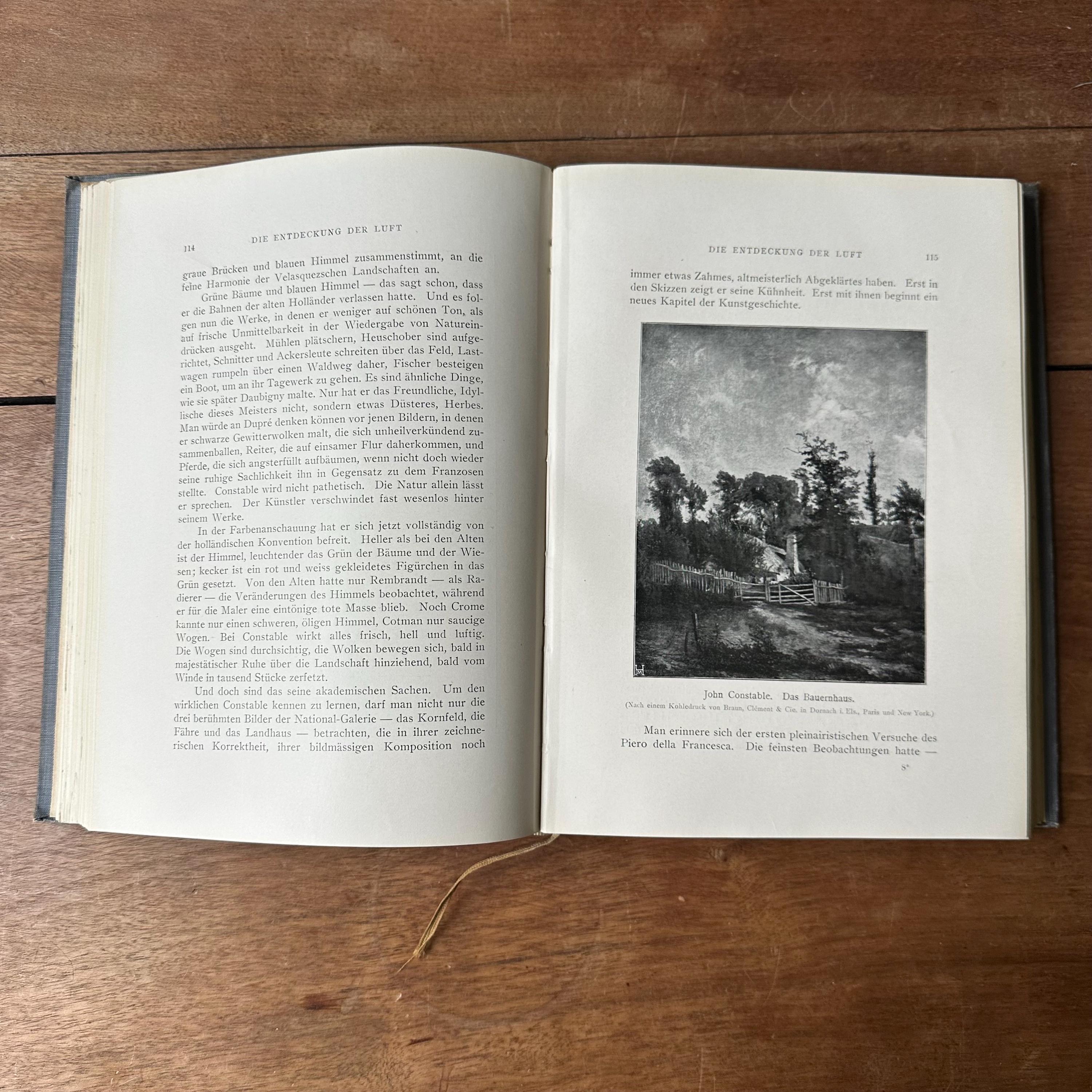 This is a gorgeous set of Art Nouveau inspired antique art history texts by Richard Muther. There are two books in the set both with blue-gray covers, gold detailing, and gold lettering. The set includes Ein Jahrhundert Franzosischer Malerei (A History of French Painting) published in 1901 and Geschichte der Englischen Malerei (A History of English Painting) published in 1903. Both published by S. Fischer. French Painting has brown and gold endpapers. Both books have black and white illustration plates of famous paintings. Both have gold ribbon bookmarks. English Painting has 400 pages and French Painting has 323 pages.