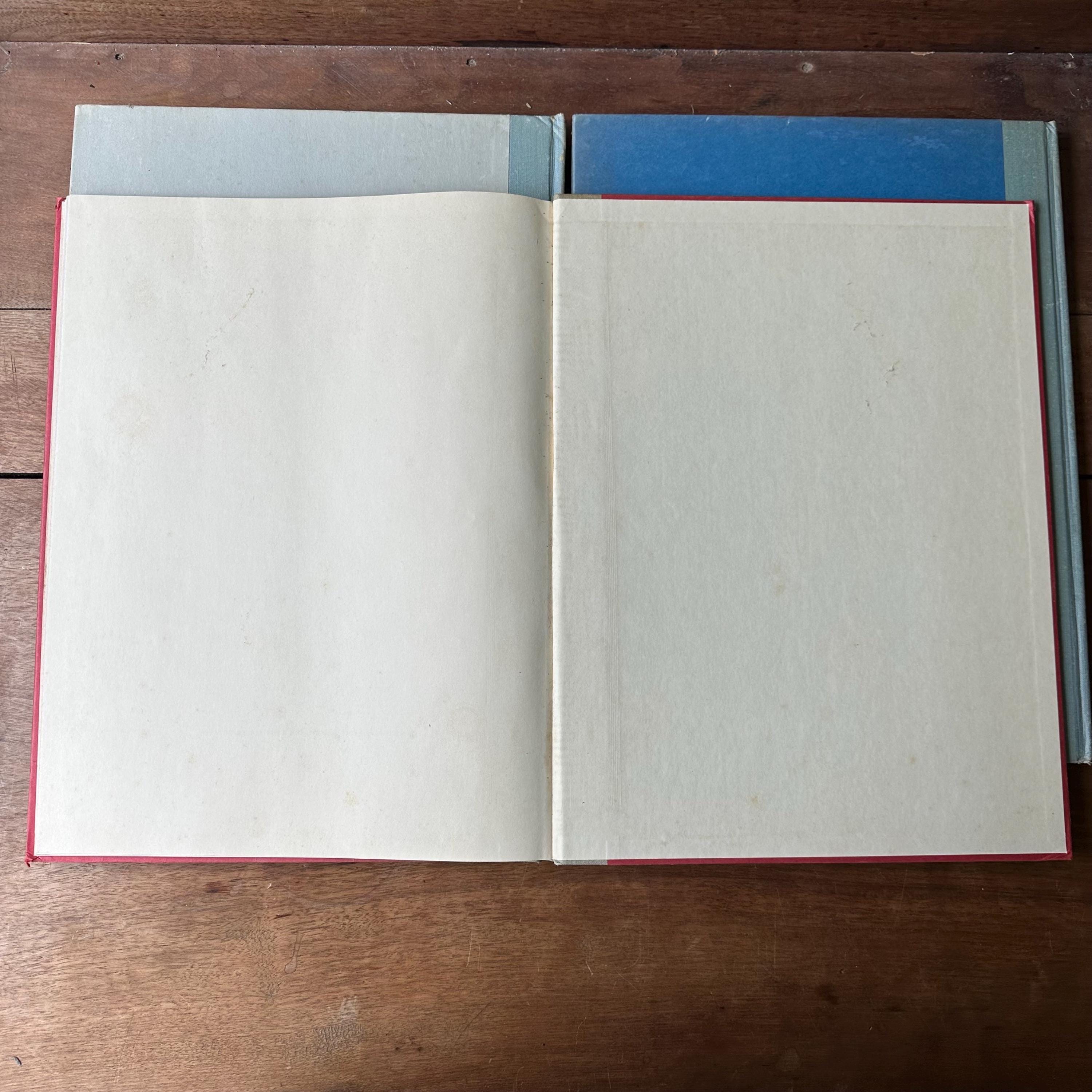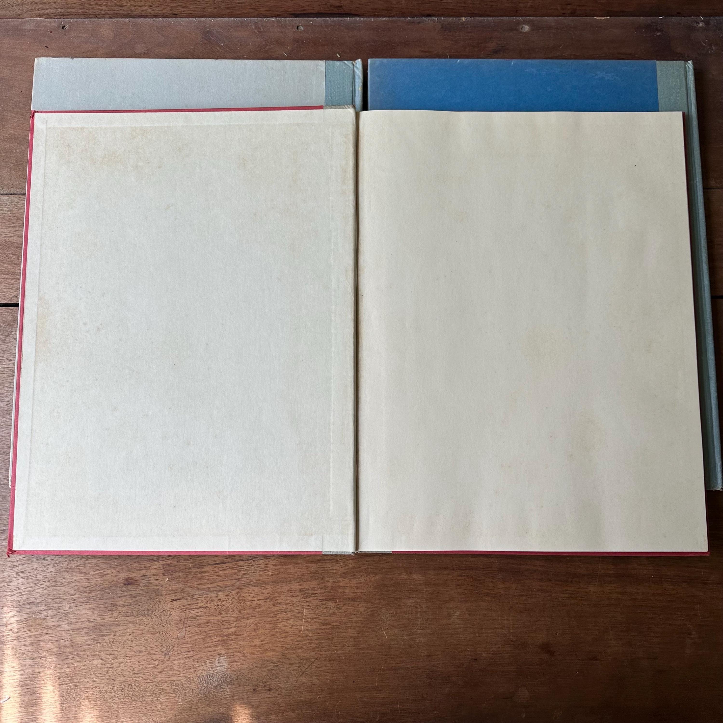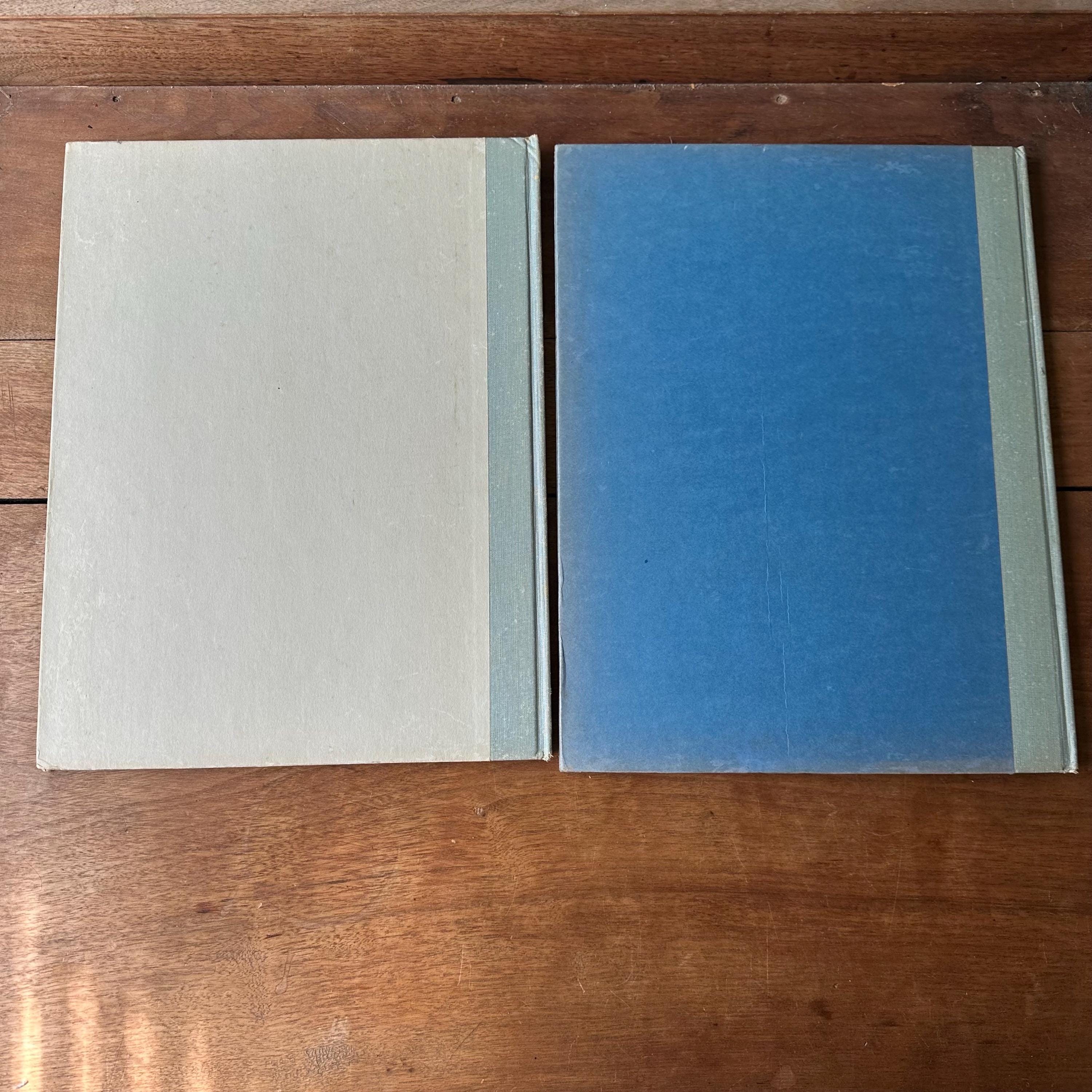 The books are in good vintage condition for their age and use. The covers have general wear with some discoloration and staining. The pages do have some yellowing and foxing but the reproductions are still bright. The covers are attached at the spines.
