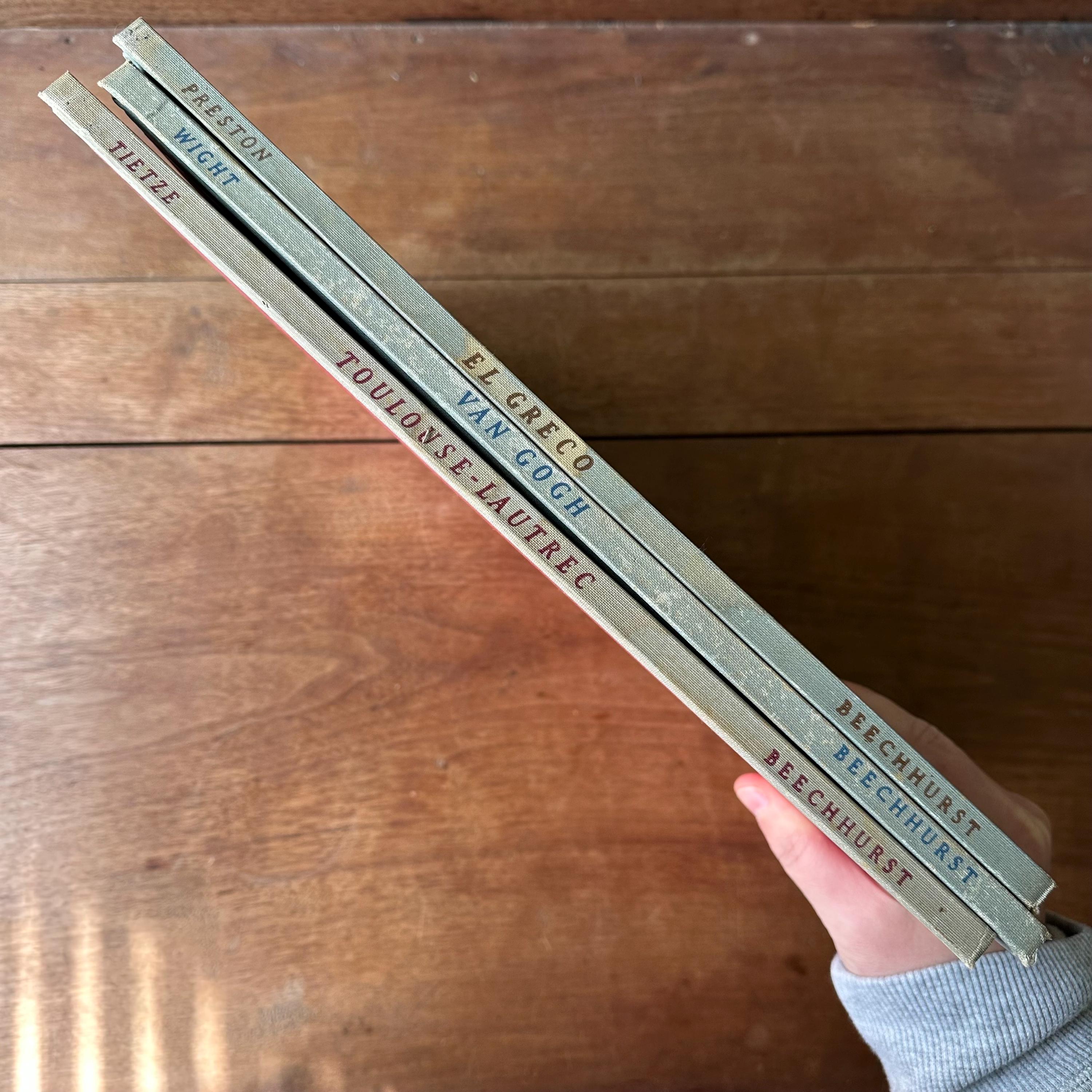 This is a set of 3 artist profile book published by Beechhurst, featuring the lives of Toulouse-Lautrec, El Greco, and Van Gogh. They are first editions. They are oversized editions with covers in blue, red, and gray. The lettering for each is either blue or red. The books are illustrated with both black and white and full color reproductions of each artist's work. El Greco and Toulouse-Lautrec have 61 pages while Van Gogh has 63.
