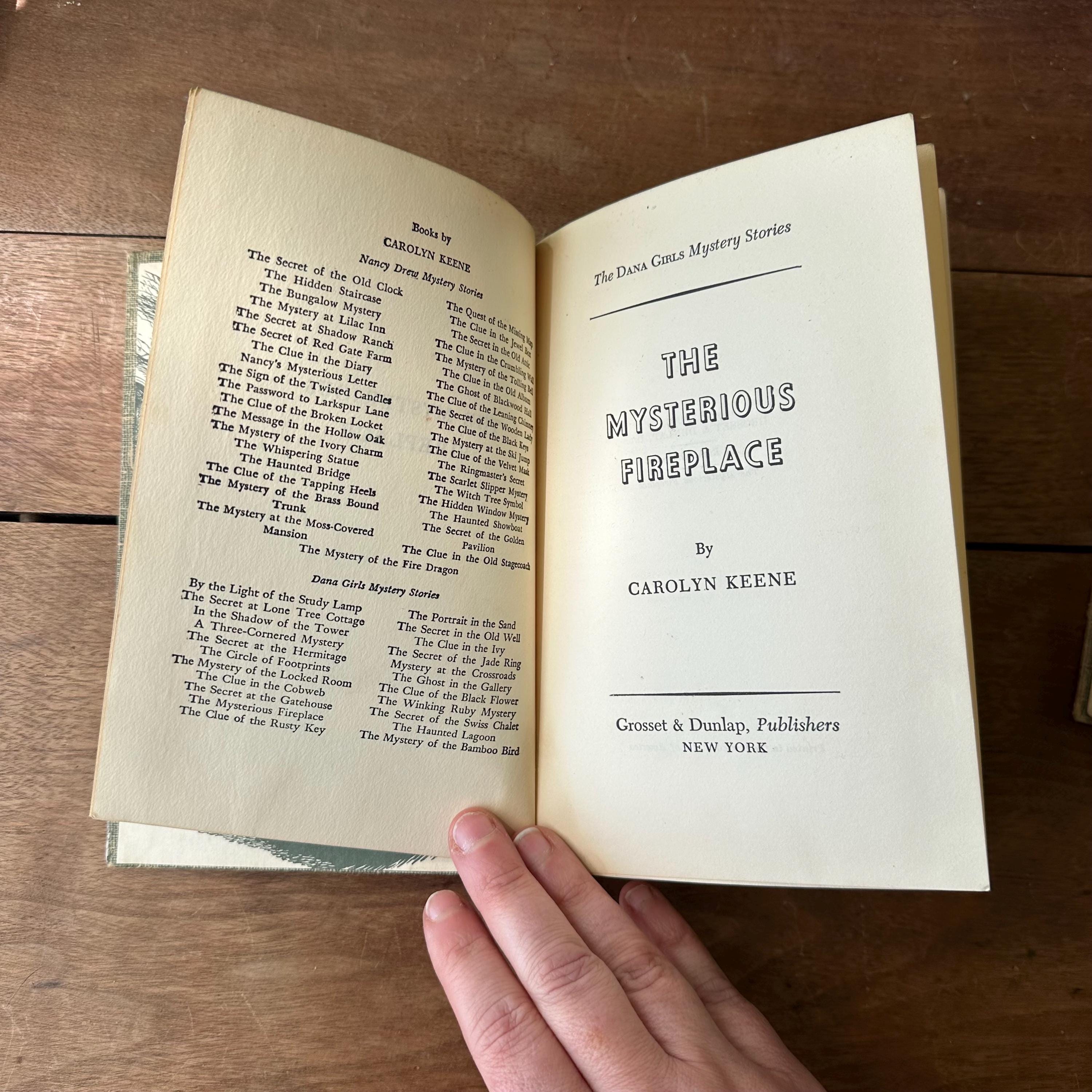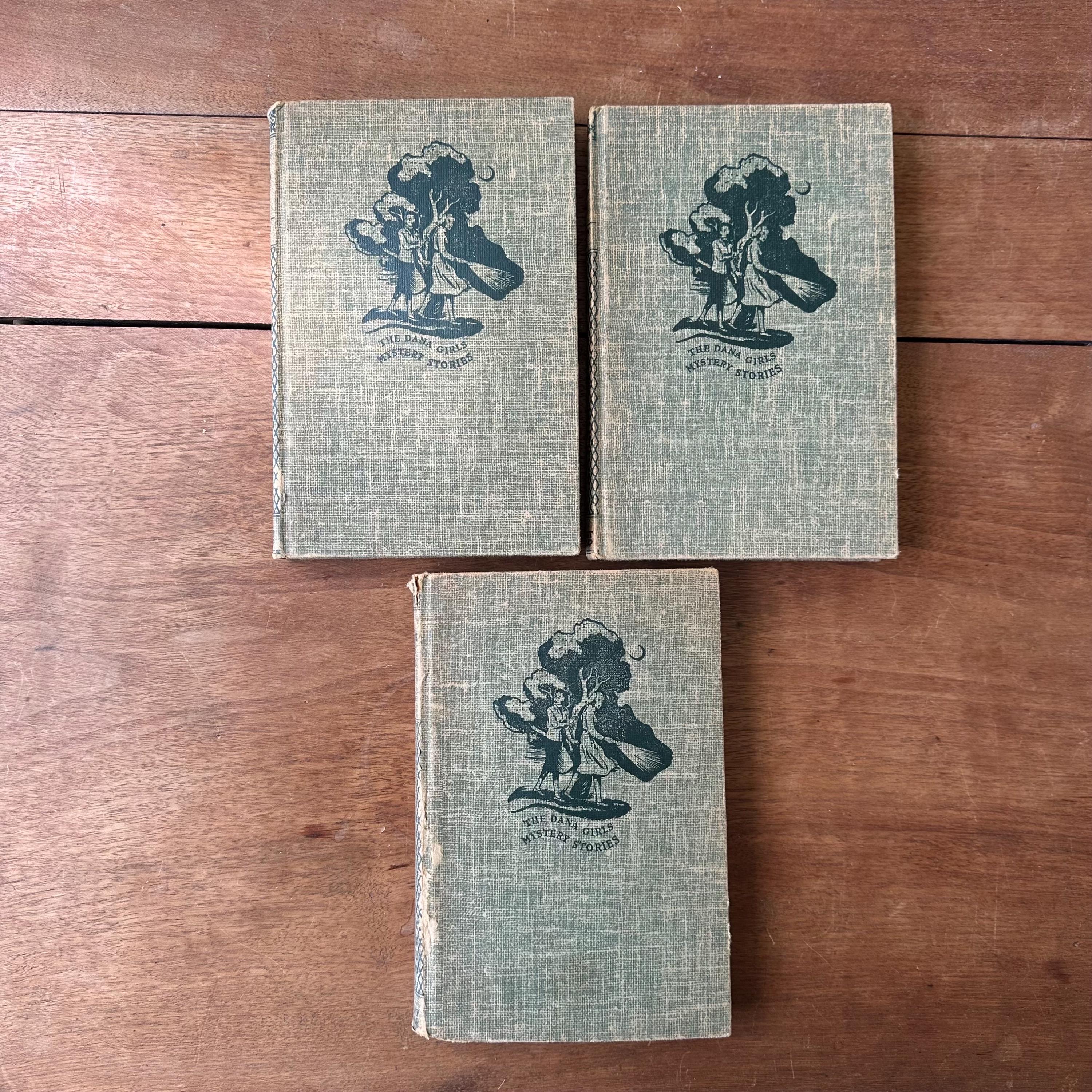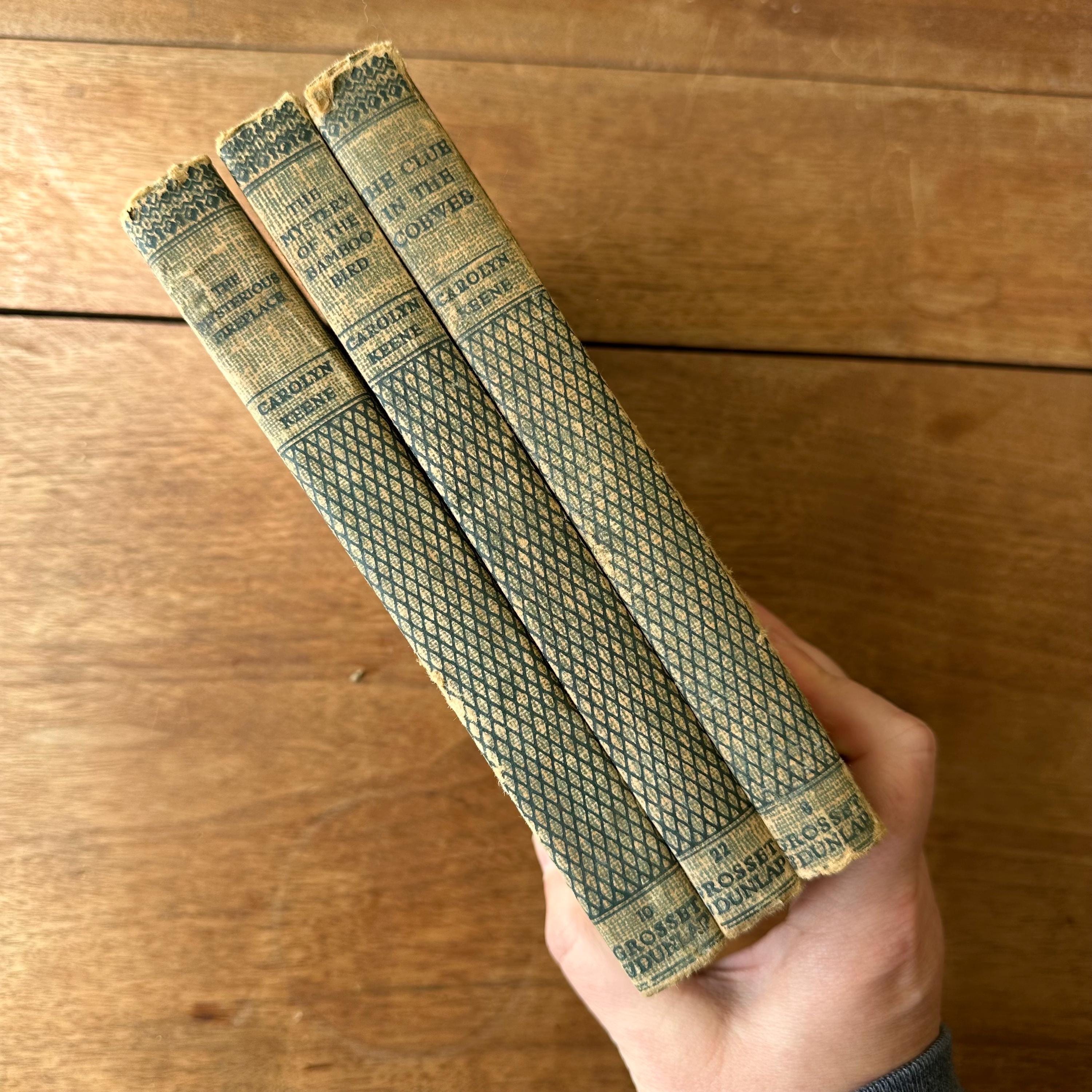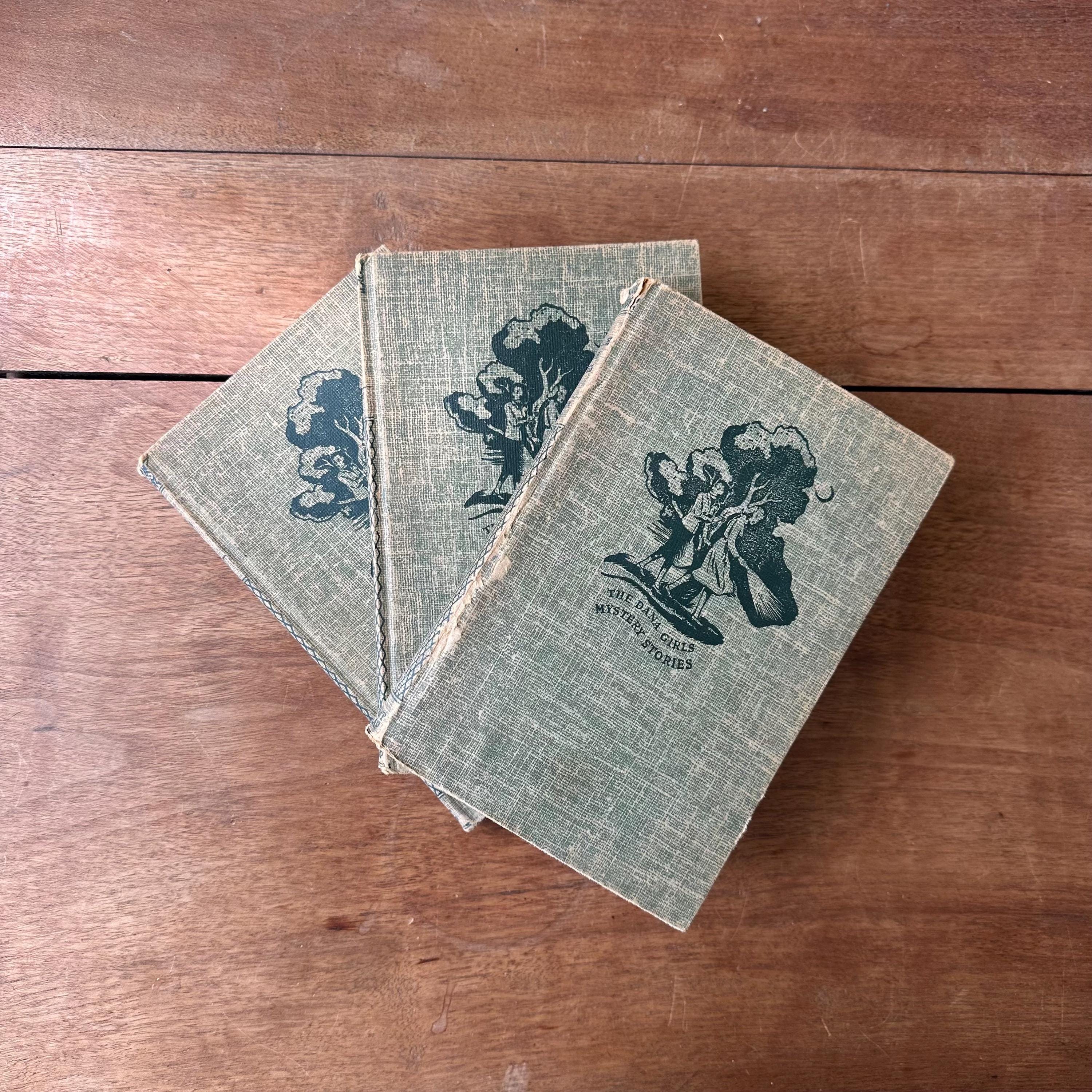 This is a set of 3 blue tweed cover Dana Girl Mystery Stories by Carolyn Keene, the author of the Nancy Drew series. The set includes The Mysterious Fireplace, The Clue in the Cobweb, and The Mystery of the Bamboo Bird. The books have illustrated endpapers showing the Dana Girls in action. All three books have one illustration, either at the title page or the first chapter. They have about 200 pages, give or take a few.