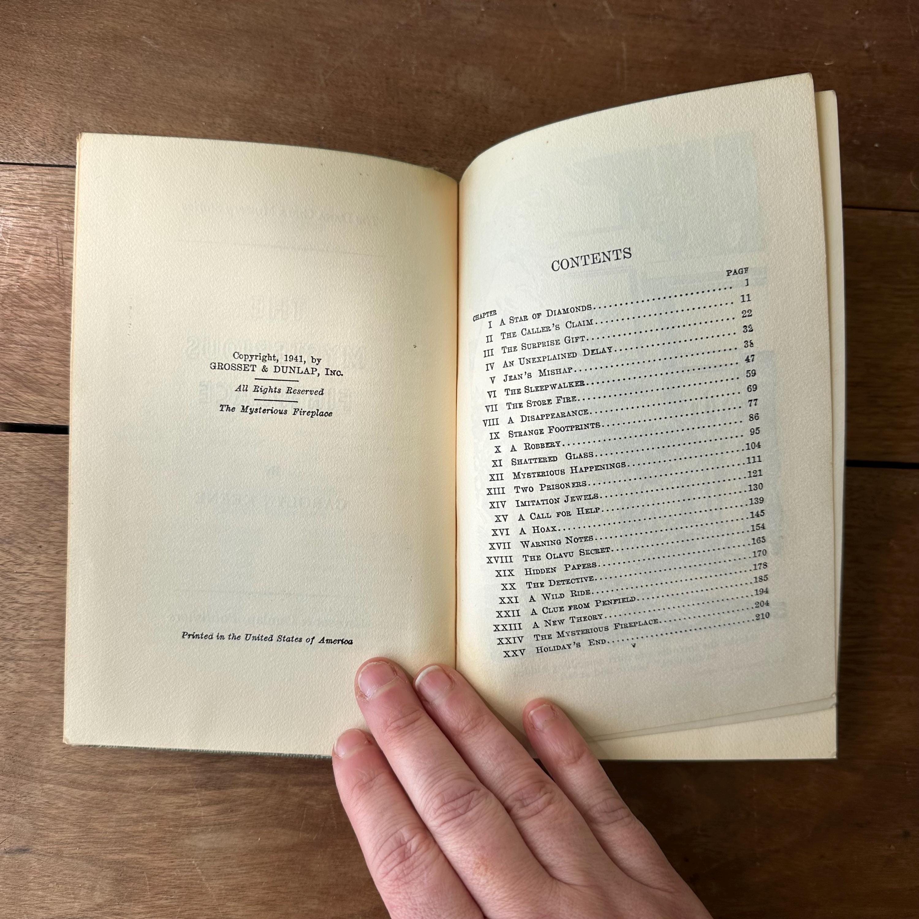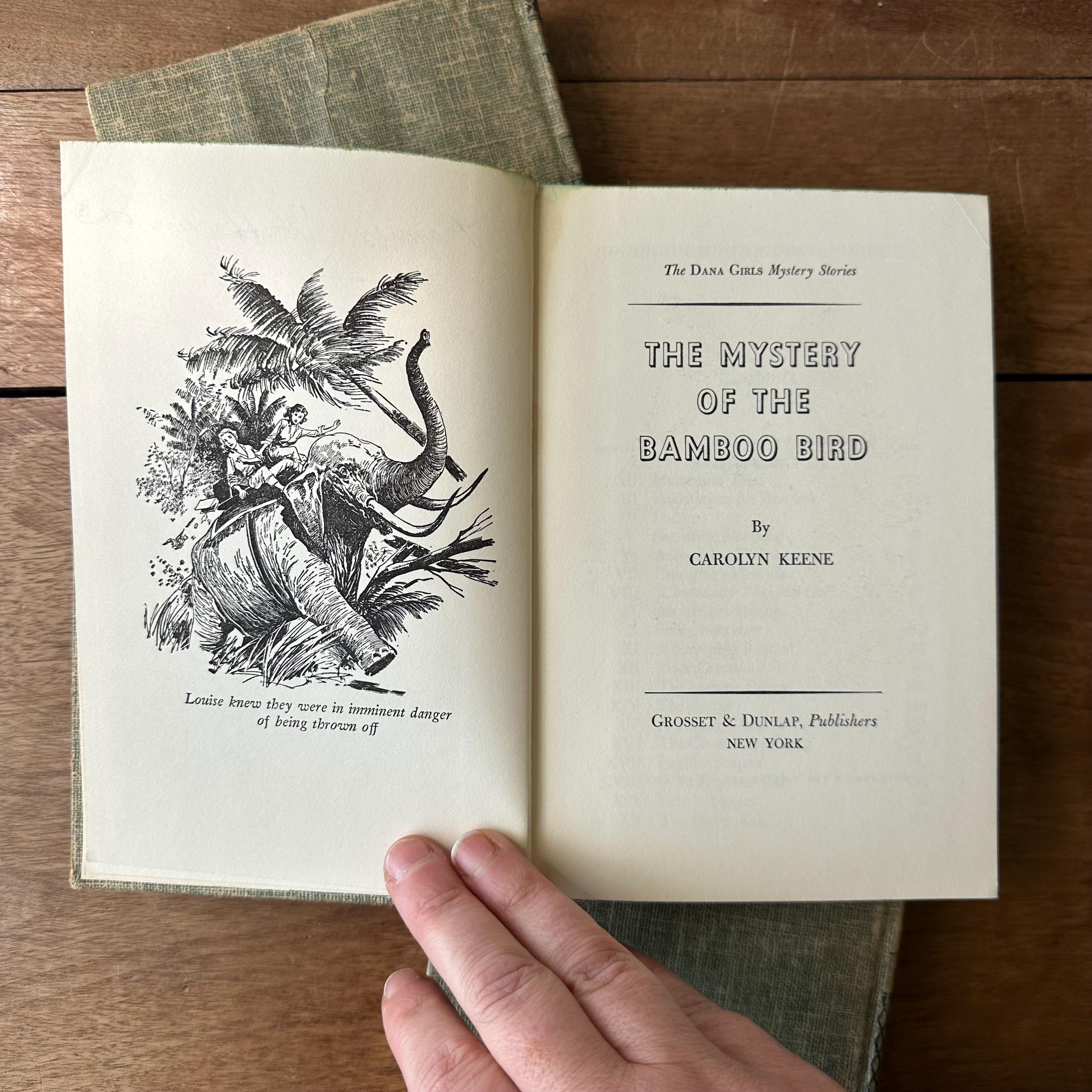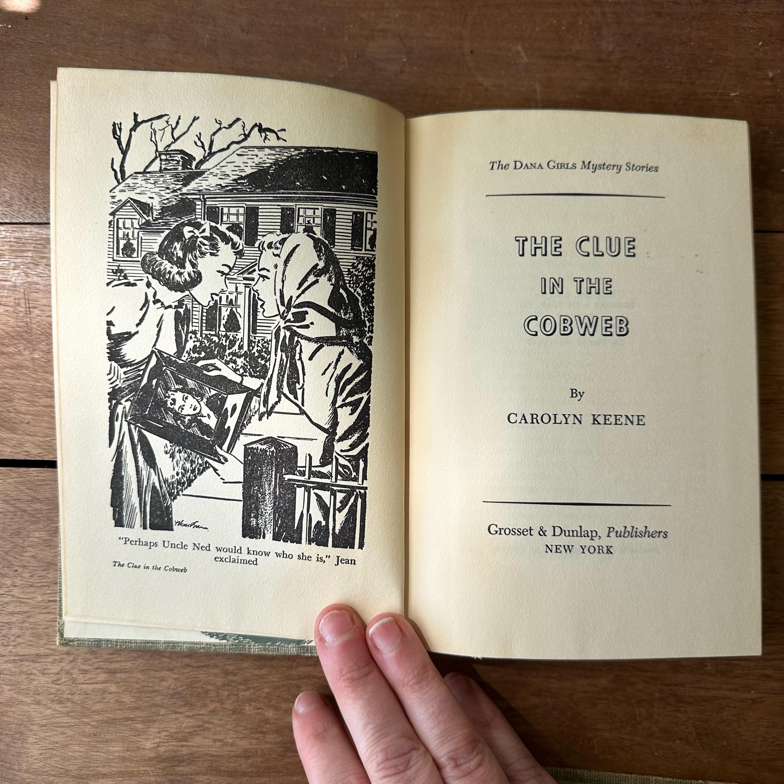 This is a set of 3 blue tweed cover Dana Girl Mystery Stories by Carolyn Keene, the author of the Nancy Drew series. The set includes The Mysterious Fireplace, The Clue in the Cobweb, and The Mystery of the Bamboo Bird. The books have illustrated endpapers showing the Dana Girls in action. All three books have one illustration, either at the title page or the first chapter. They have about 200 pages, give or take a few.