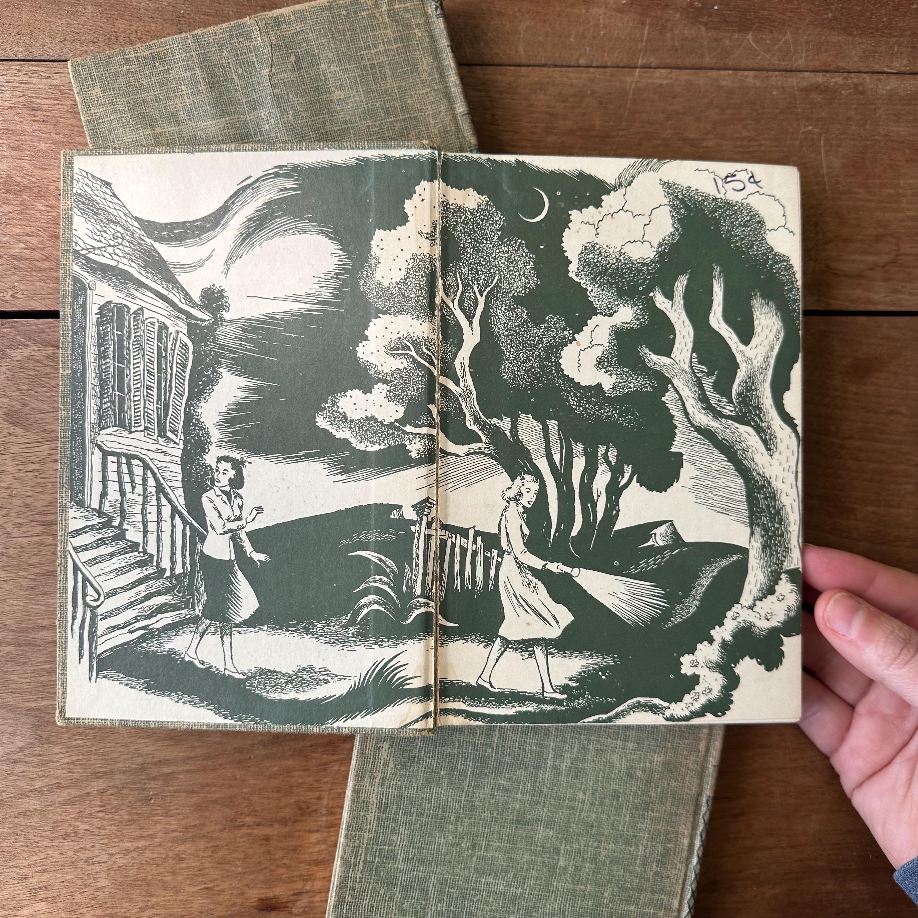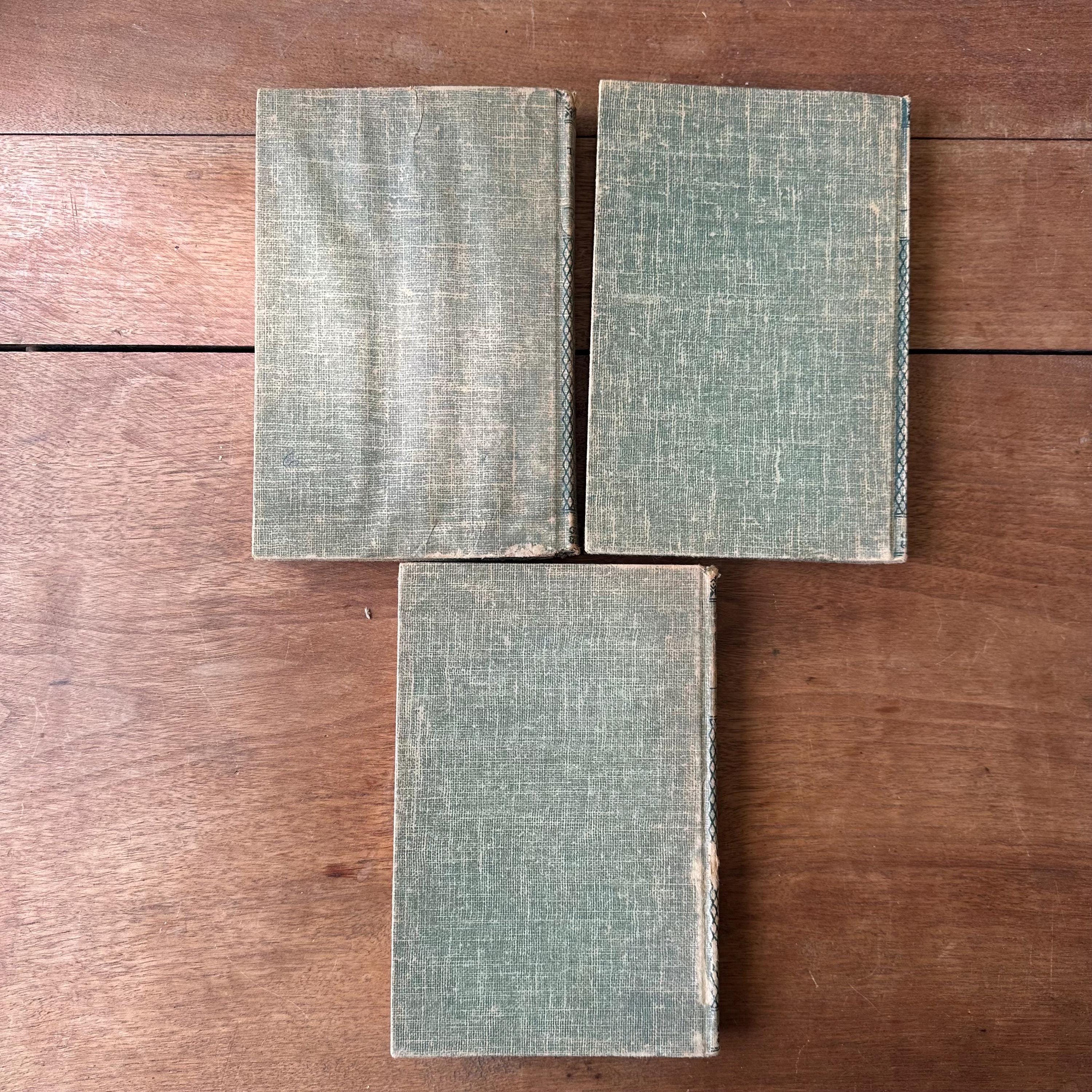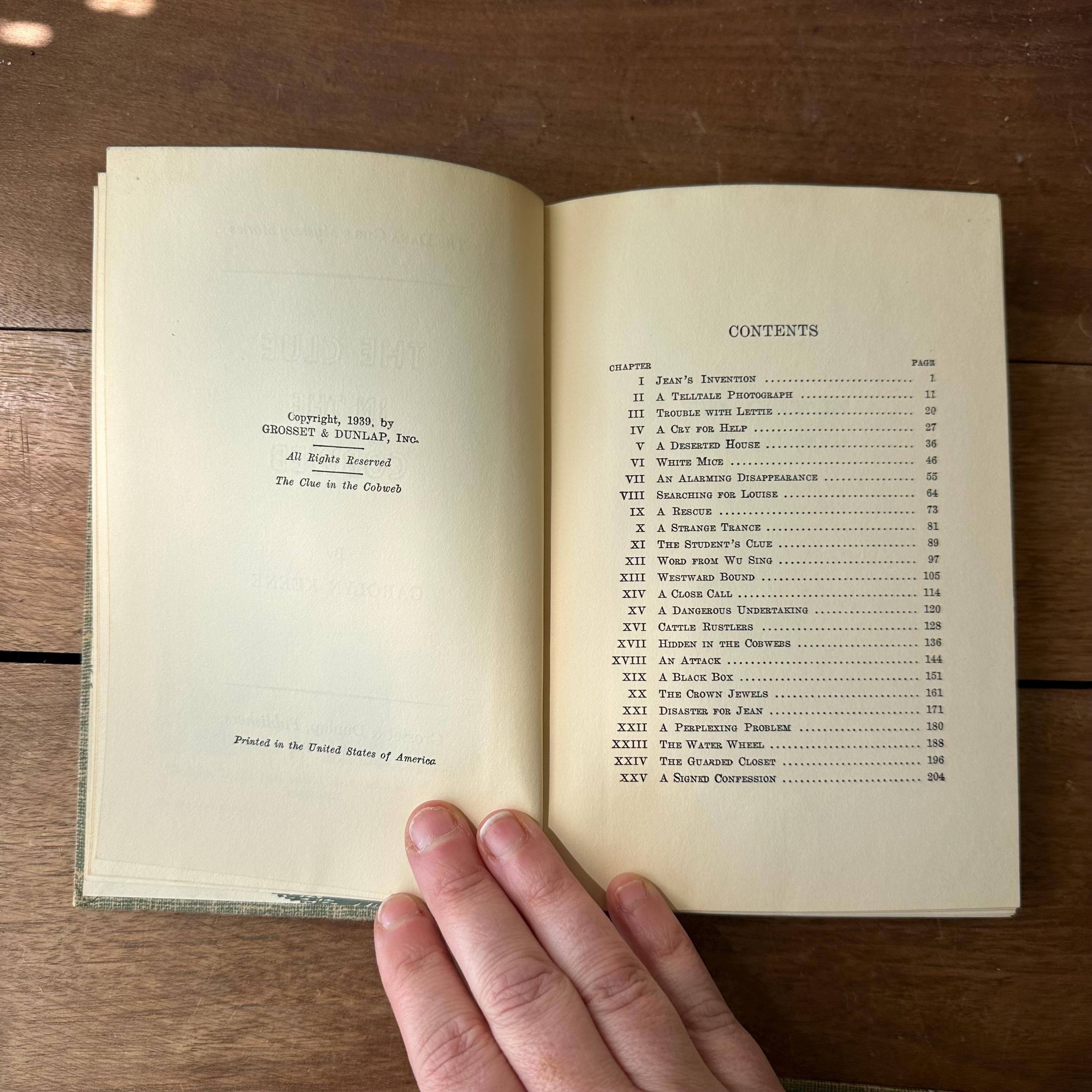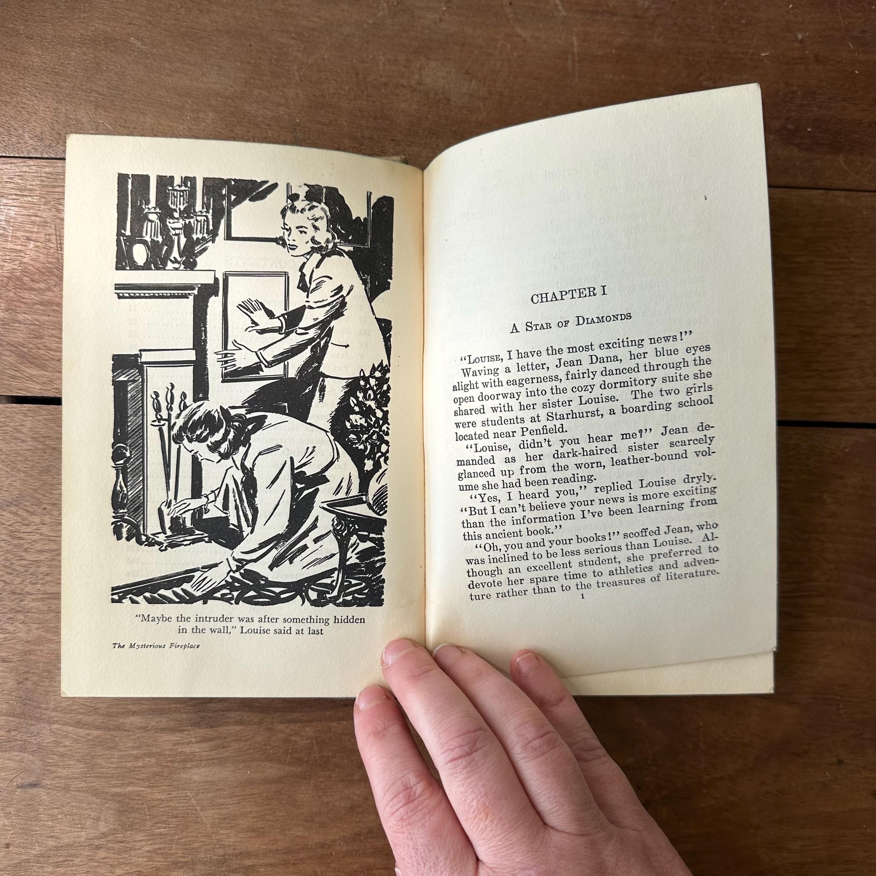 This is a set of 3 blue tweed cover Dana Girl Mystery Stories by Carolyn Keene, the author of the Nancy Drew series. The set includes The Mysterious Fireplace, The Clue in the Cobweb, and The Mystery of the Bamboo Bird. The books have illustrated endpapers showing the Dana Girls in action. All three books have one illustration, either at the title page or the first chapter. They have about 200 pages, give or take a few.
