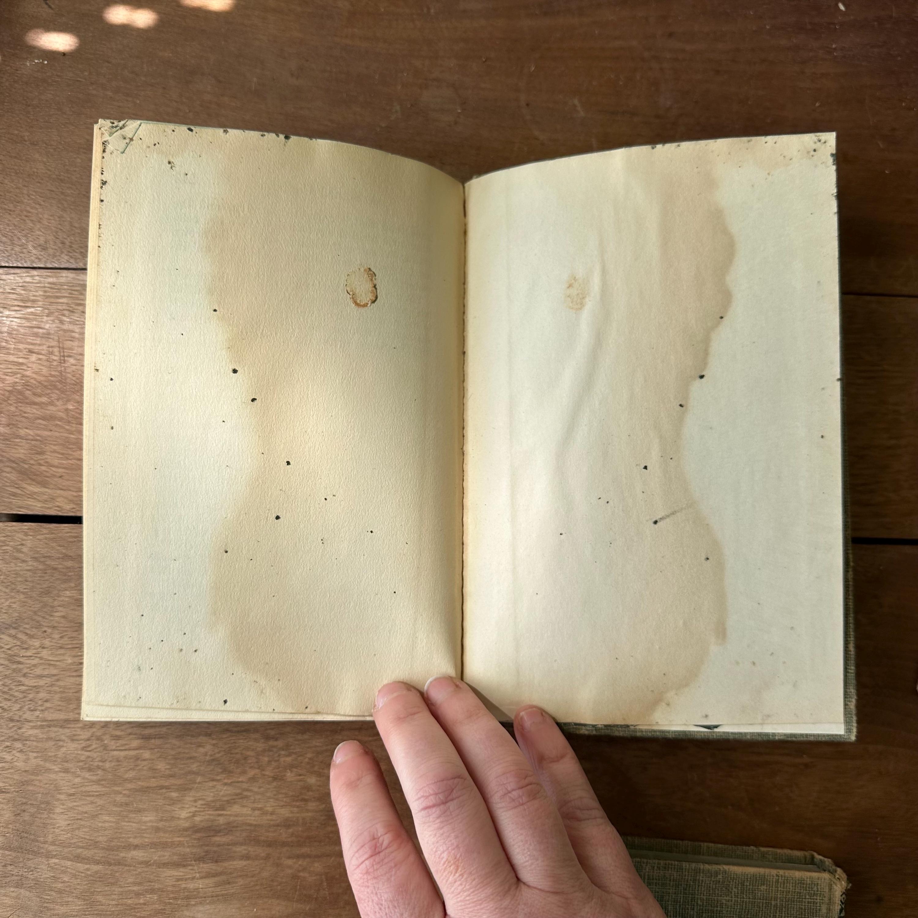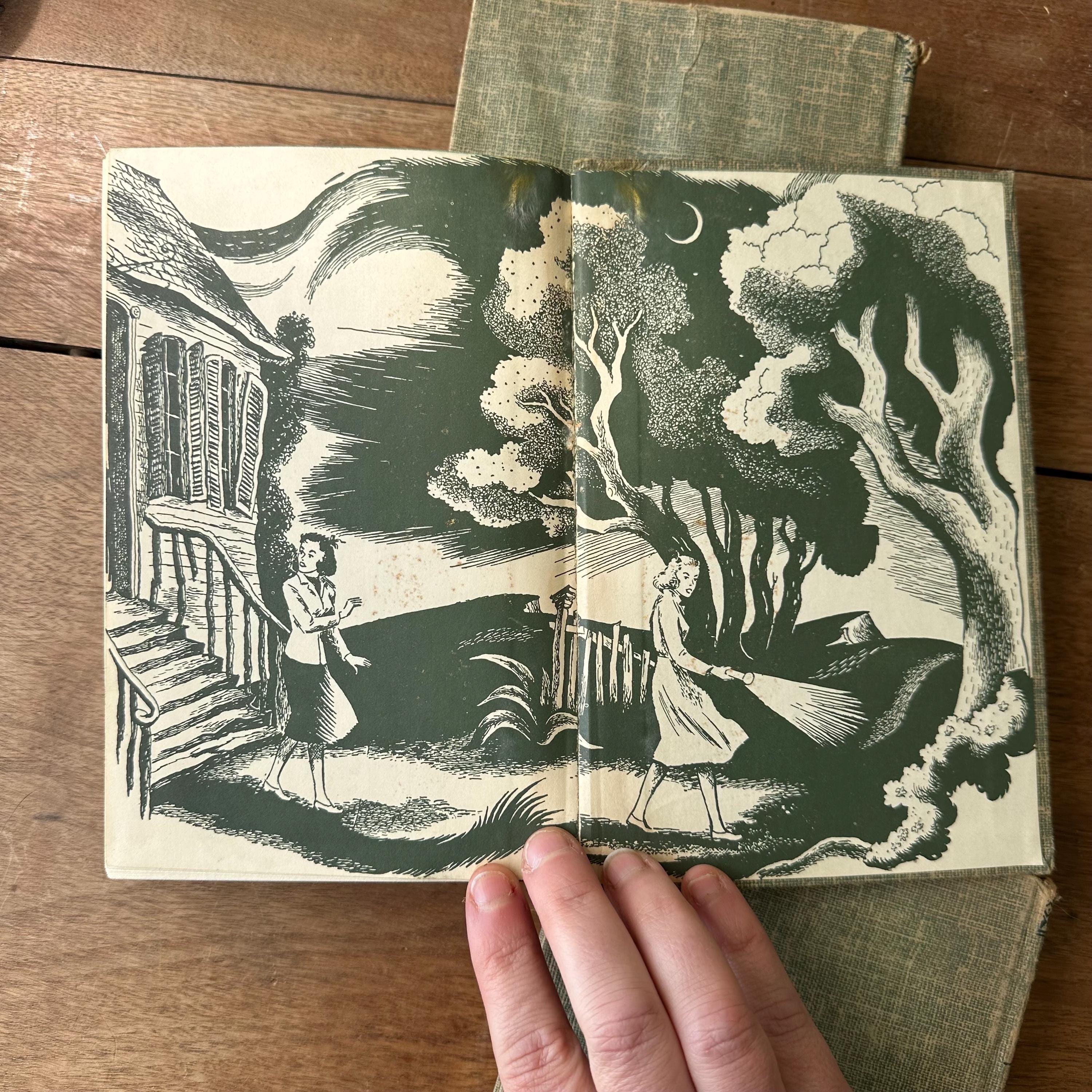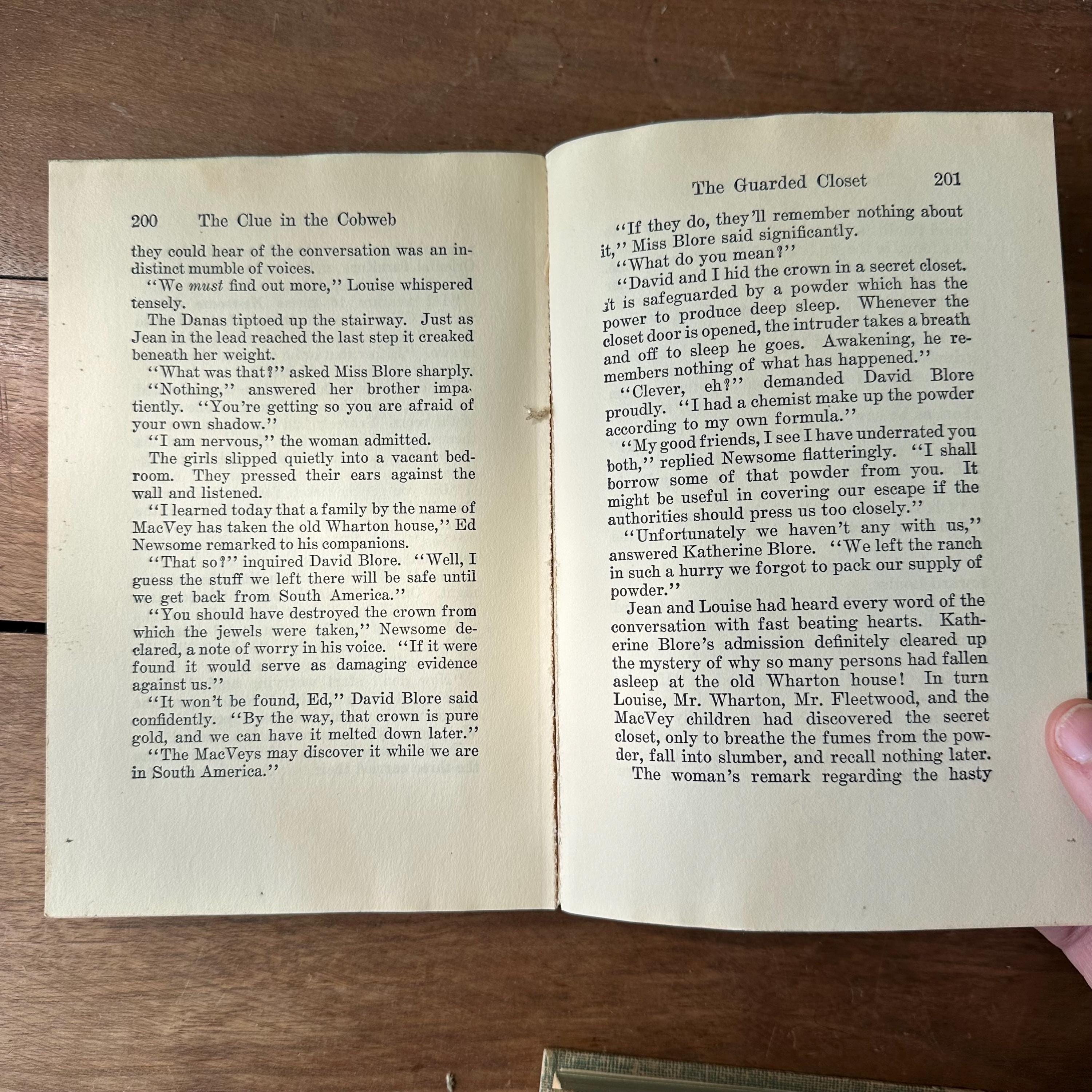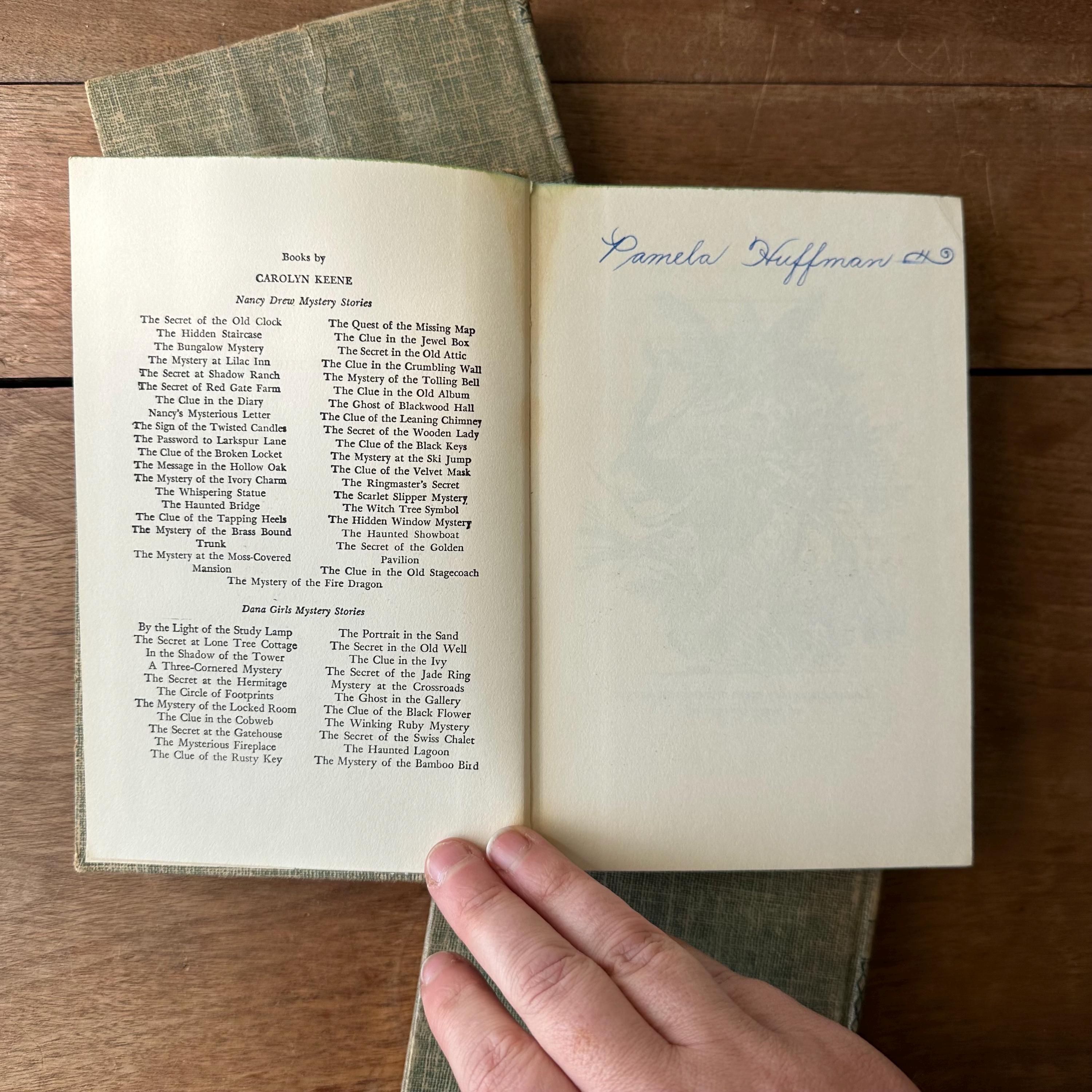 The books are in good vintage condition for their age and use. They all have wear to their covers, including what looks like some water damage to The Mysterious Fireplace and The Clue in the Cobweb. All three have been marked 15 cents inside the front cover. Pamela Huffman wrote her name in ink inside the front cover of The Mystery of the Bamboo Bird. The covers are all attached at the spine. The pages are yellowed.