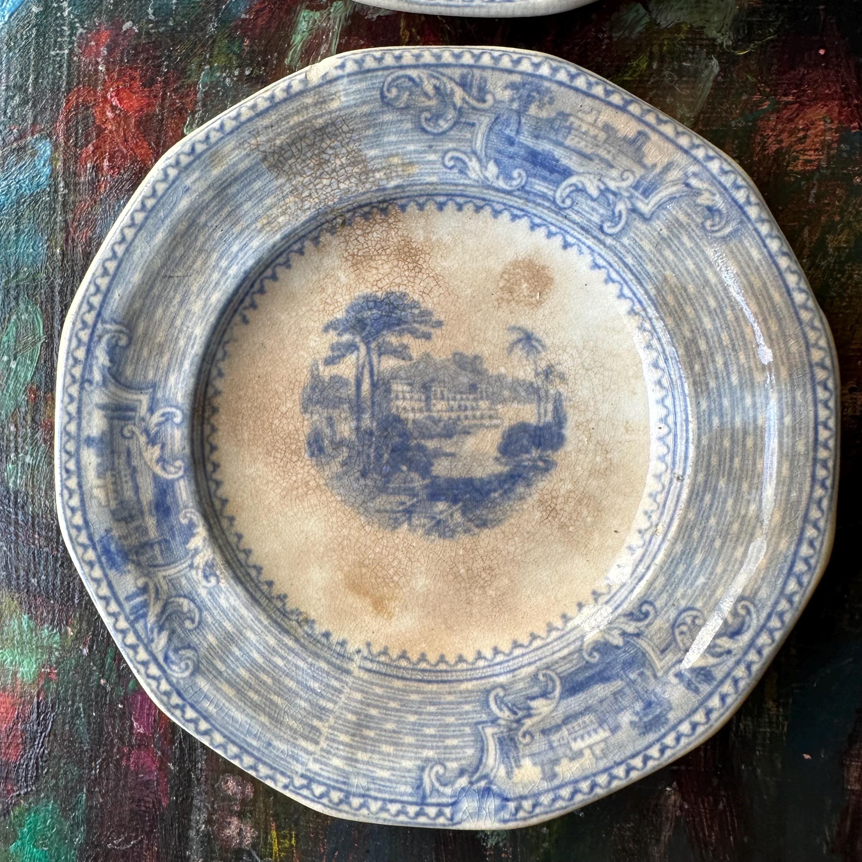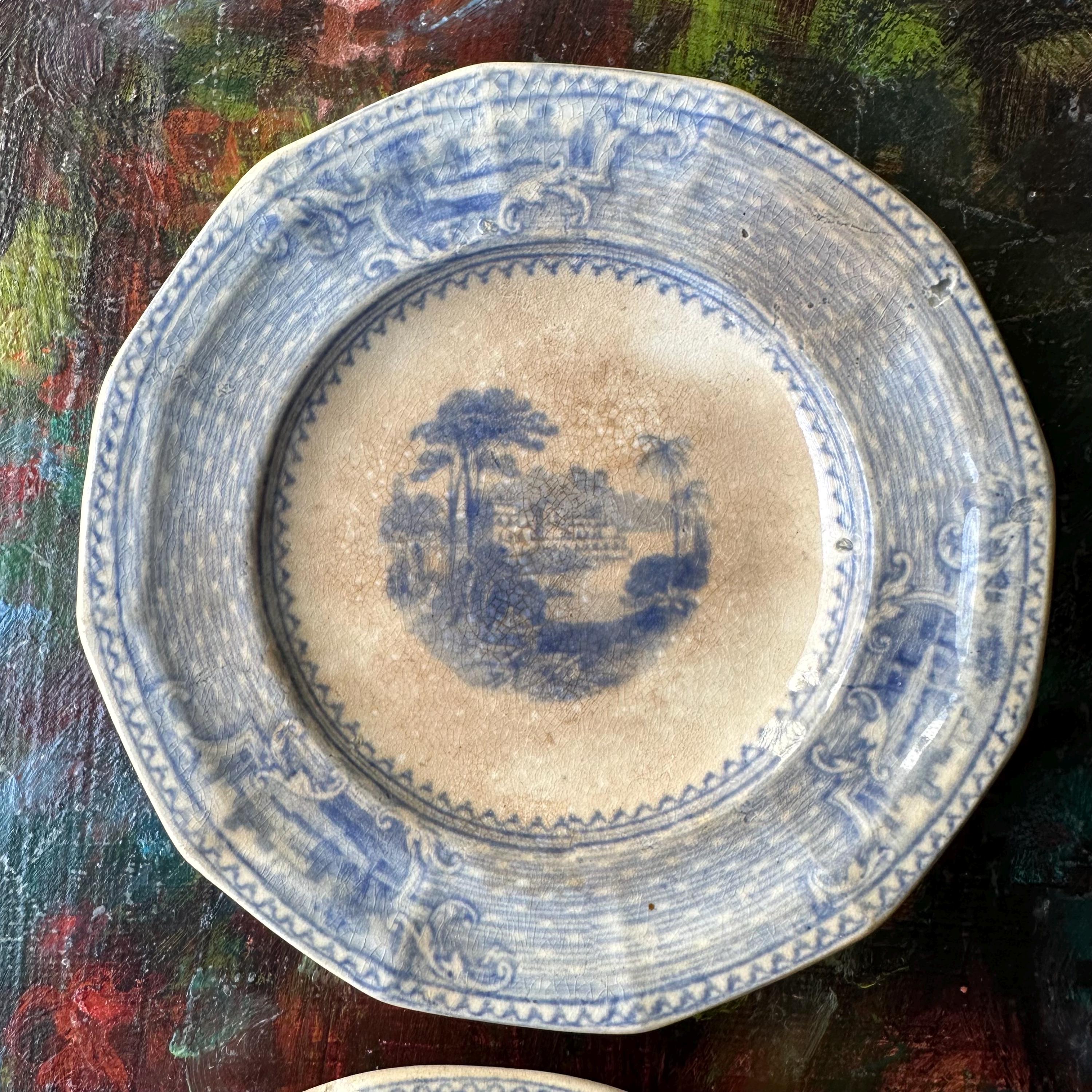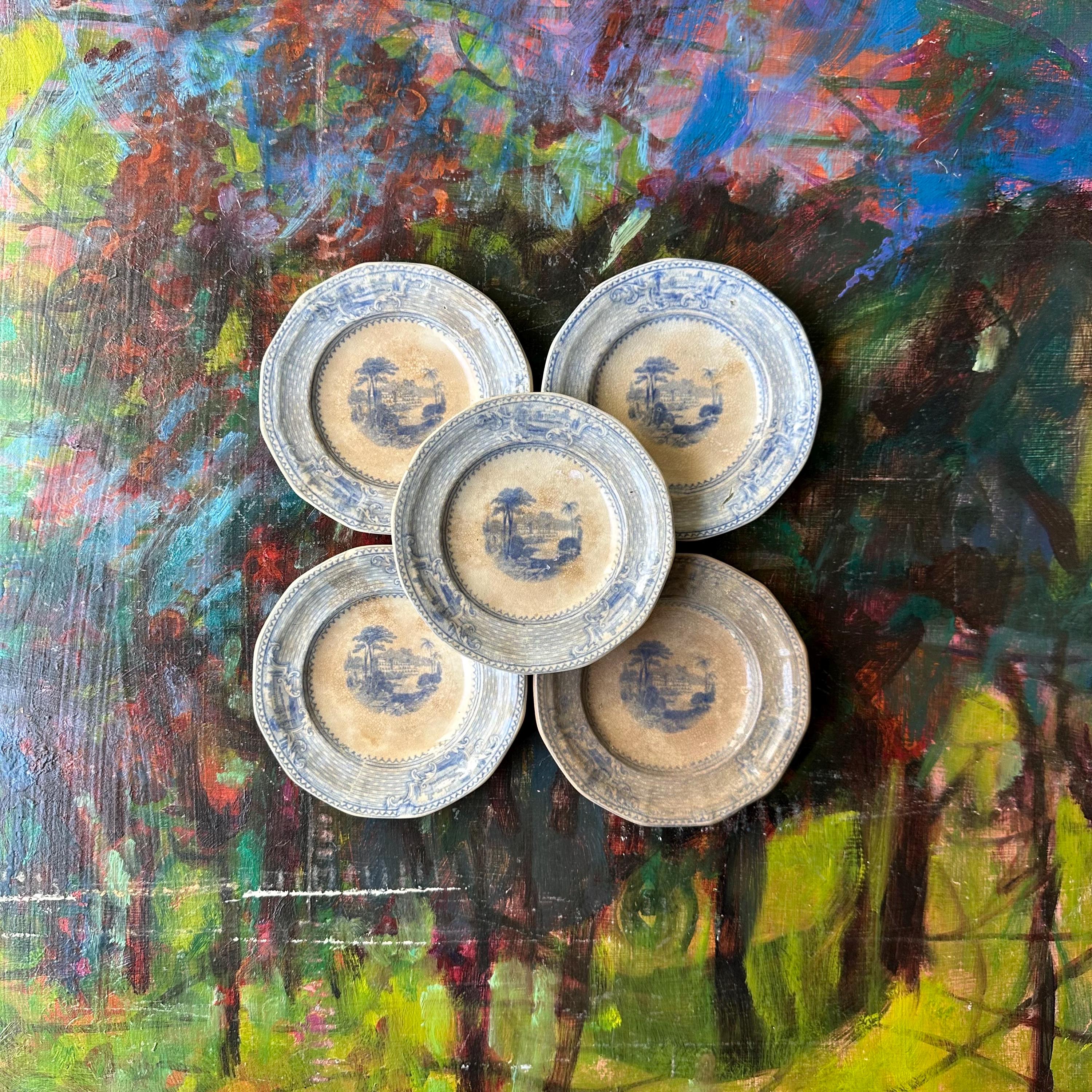 This a set of 5 ironstone blue transferware butter pat dishes, mostly likely antique John Ridgway dishes in the Palestine pattern. They are round with slightly angled sides, creating a soft octagon shape. The pattern has a basketweave pattern around the sides with three inset flourishes showing off three different buildings, most likely places around Palestine. The center has another building with surrounding trees and palm trees. They are not marked on the bottoms, but they do match the Palestine pattern exactly.