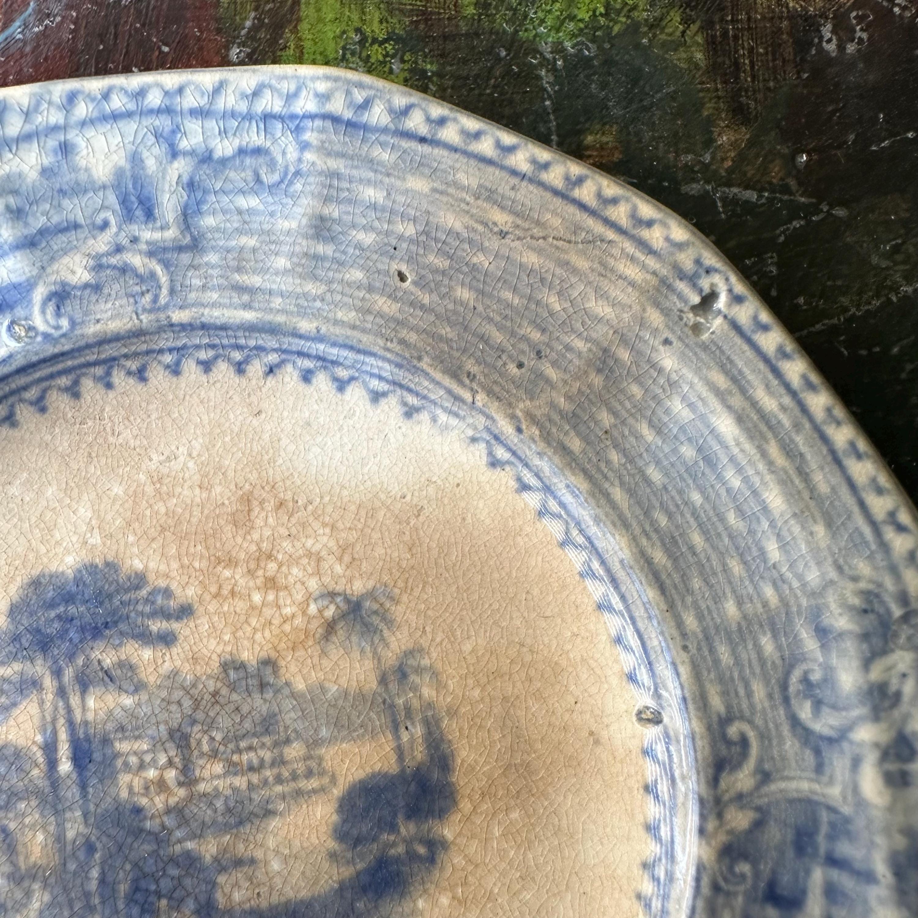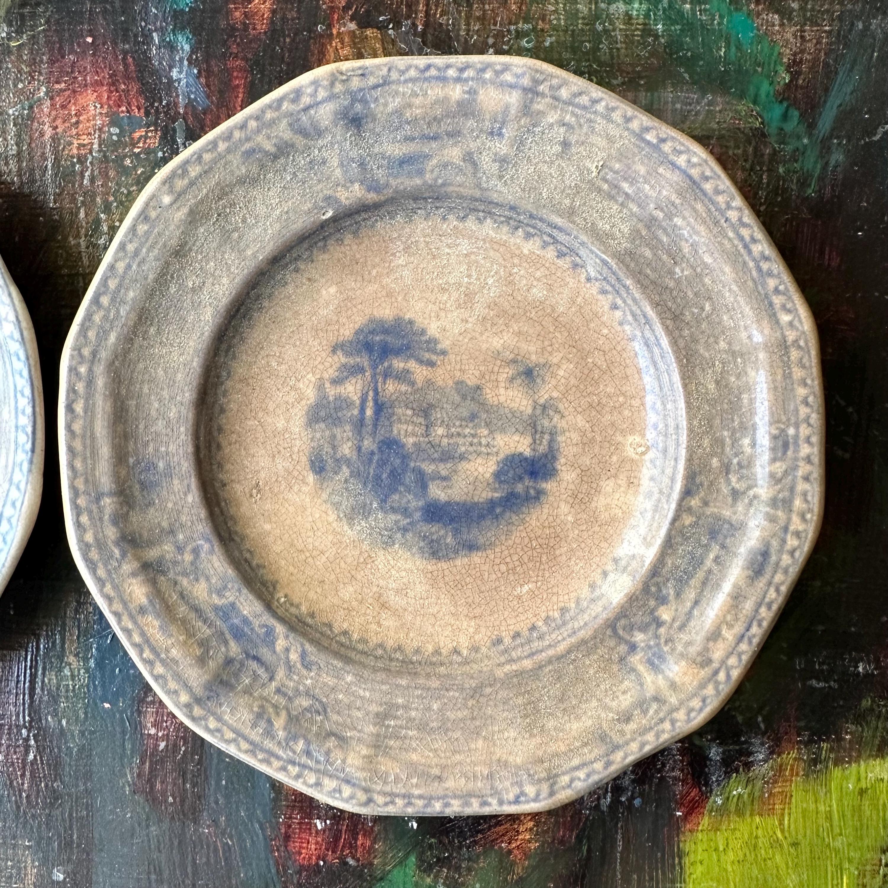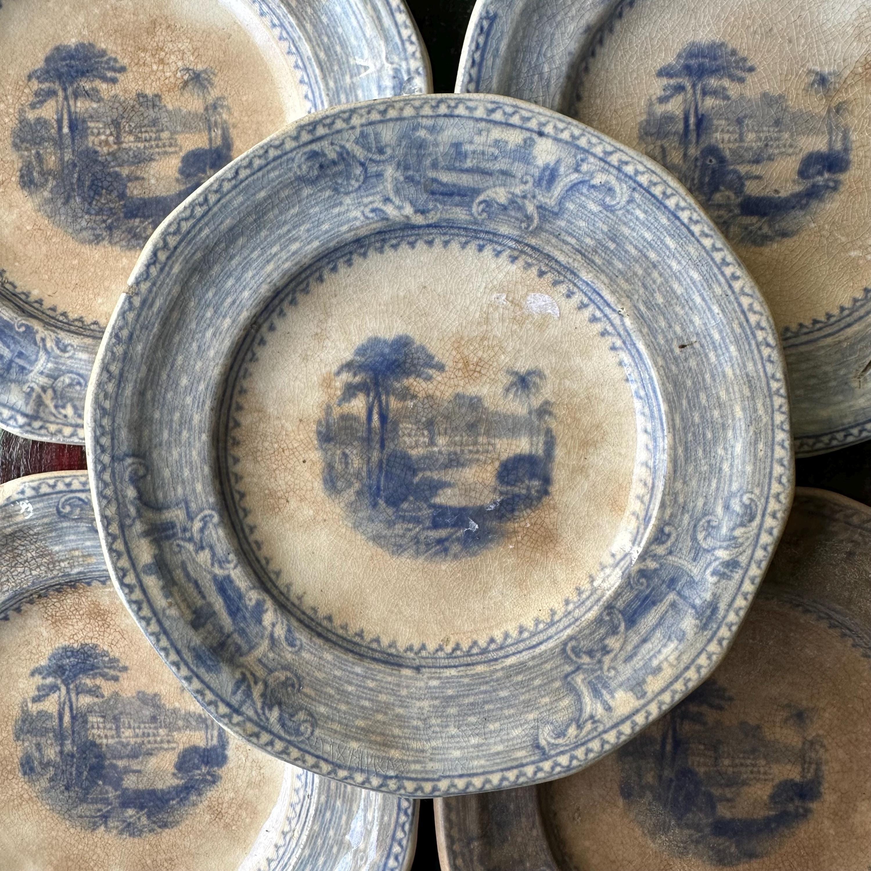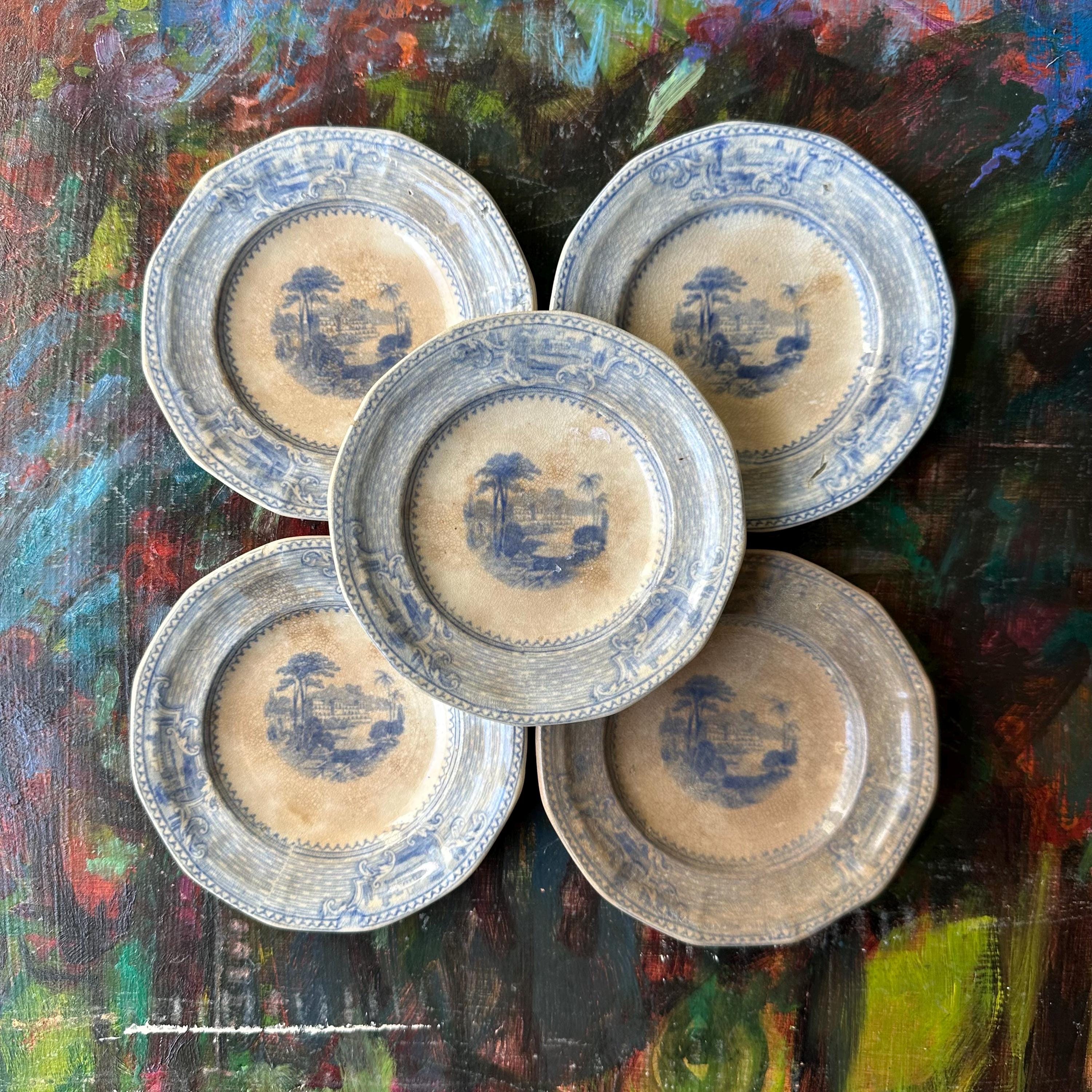 This a set of 5 ironstone blue transferware butter pat dishes, mostly likely antique John Ridgway dishes in the Palestine pattern. They are round with slightly angled sides, creating a soft octagon shape. The pattern has a basketweave pattern around the sides with three inset flourishes showing off three different buildings, most likely places around Palestine. The center has another building with surrounding trees and palm trees. They are not marked on the bottoms, but they do match the Palestine pattern exactly.