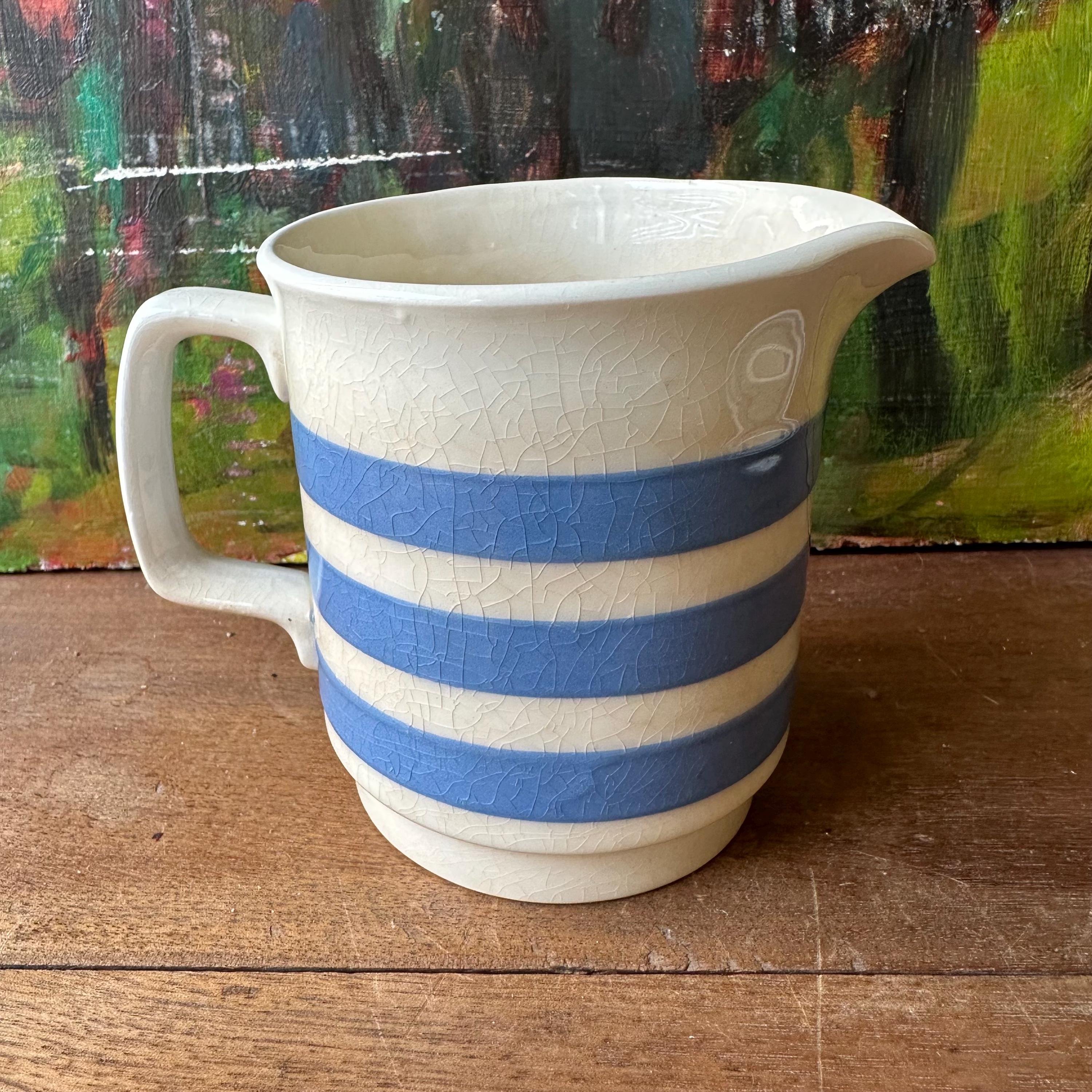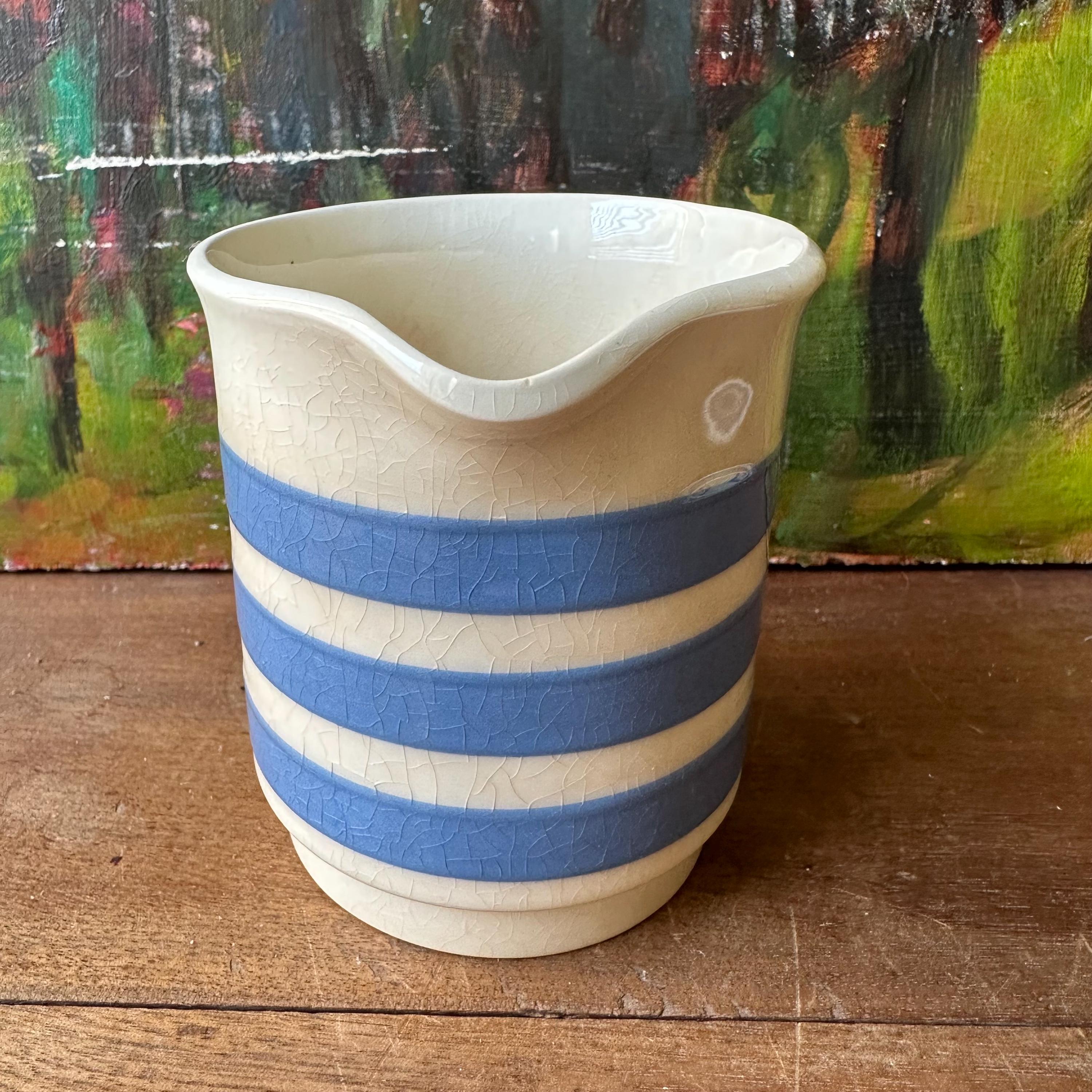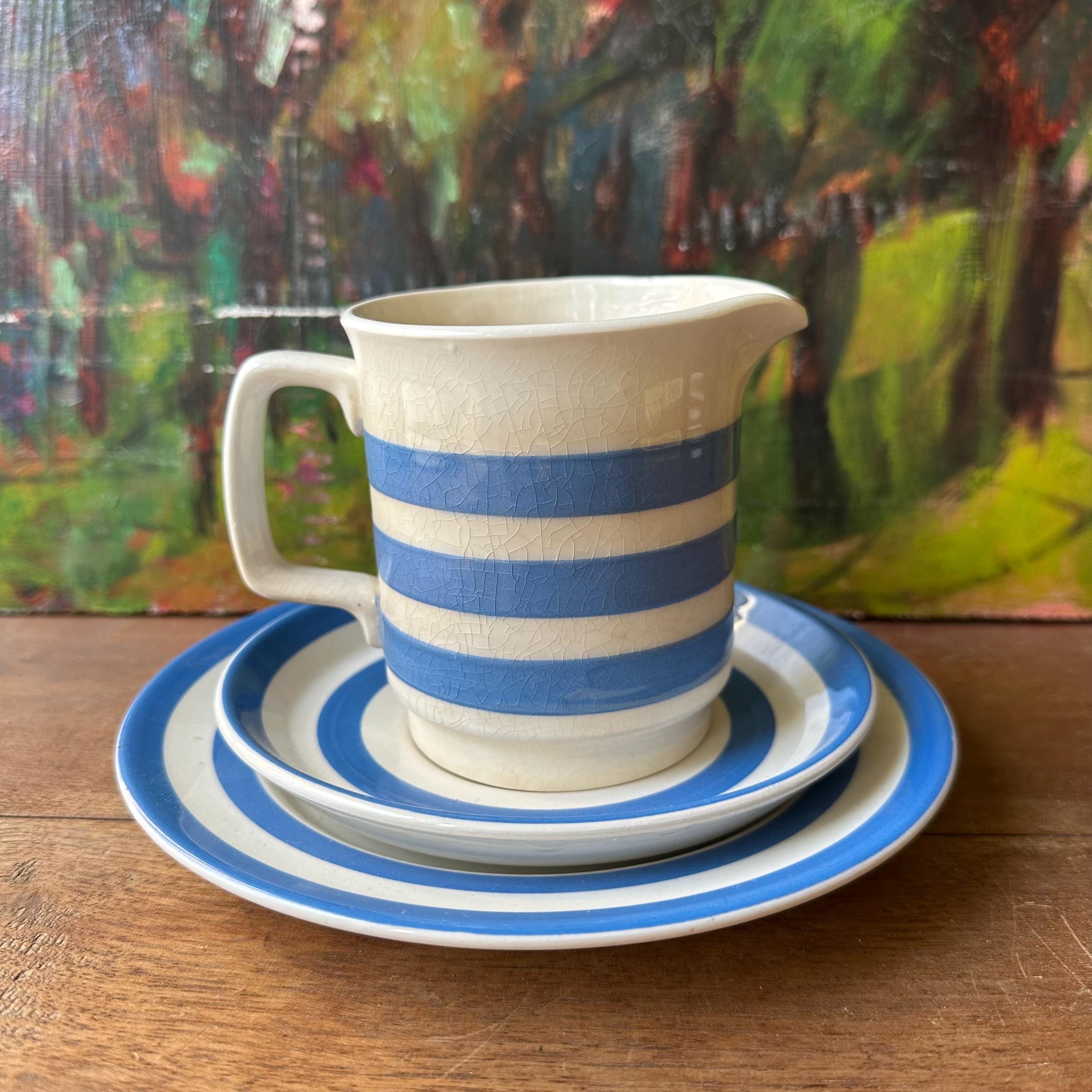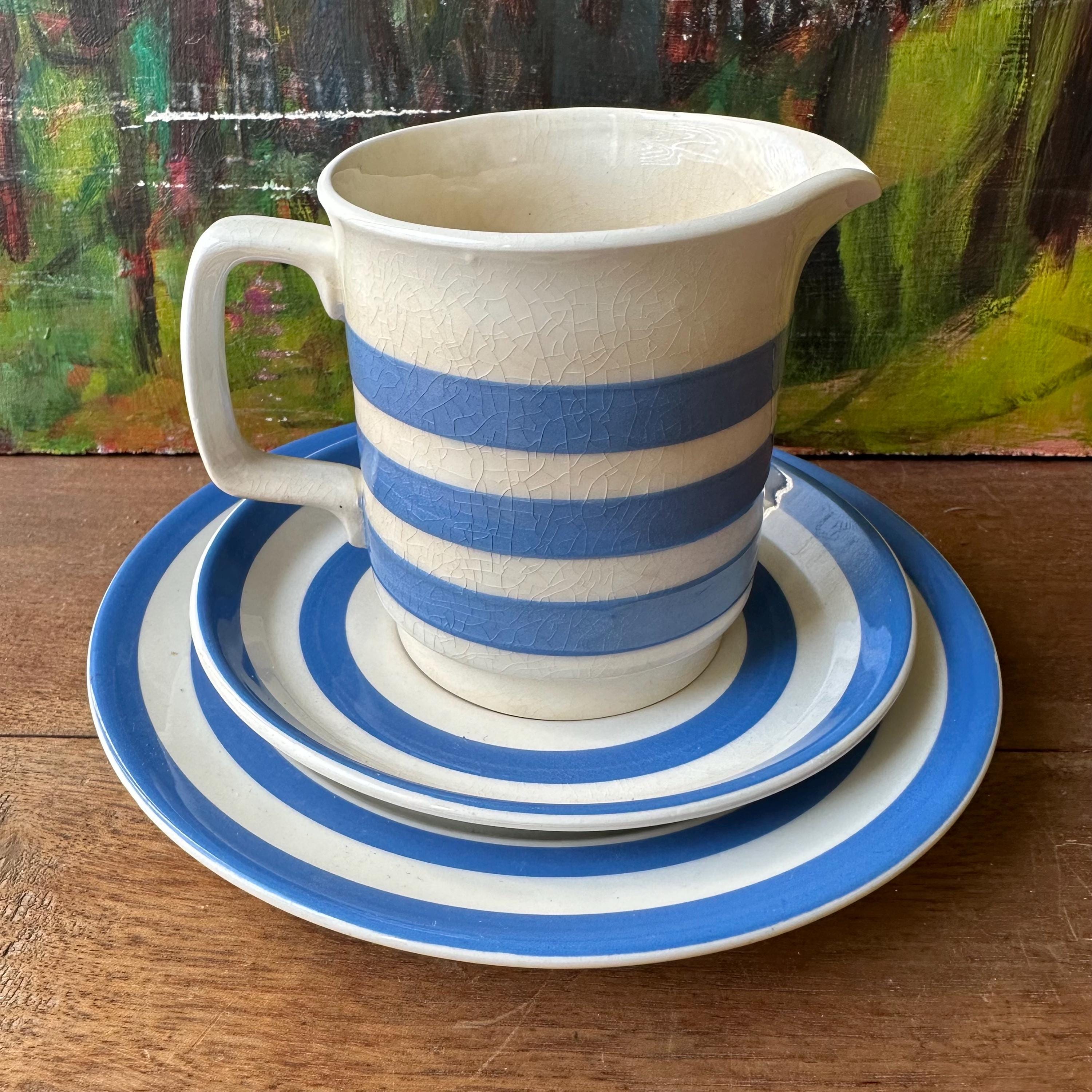 This is a set of blue stripe ceramic dishes, which includes a Carrigaline Pottery pitcher and two Restyled by Judith Onions Cornish Kitchenware plates. The pitcher is a creamer size in bright white with a wide mouth and slightly footed bottom. The pitcher is decorated with inset stripes that have been painted blue. The pitcher has a squared off handle. The bottom is embossed Carrigaline and Republic of Ireland. The plates are two different sizes. One is a saucer and one is a dessert plate. Both are striped blue and stamped on the bottom with T.G. Green Ltd. Church Gresley Original Cornish Kitchenware Made in England Restyled by Judith Onions.