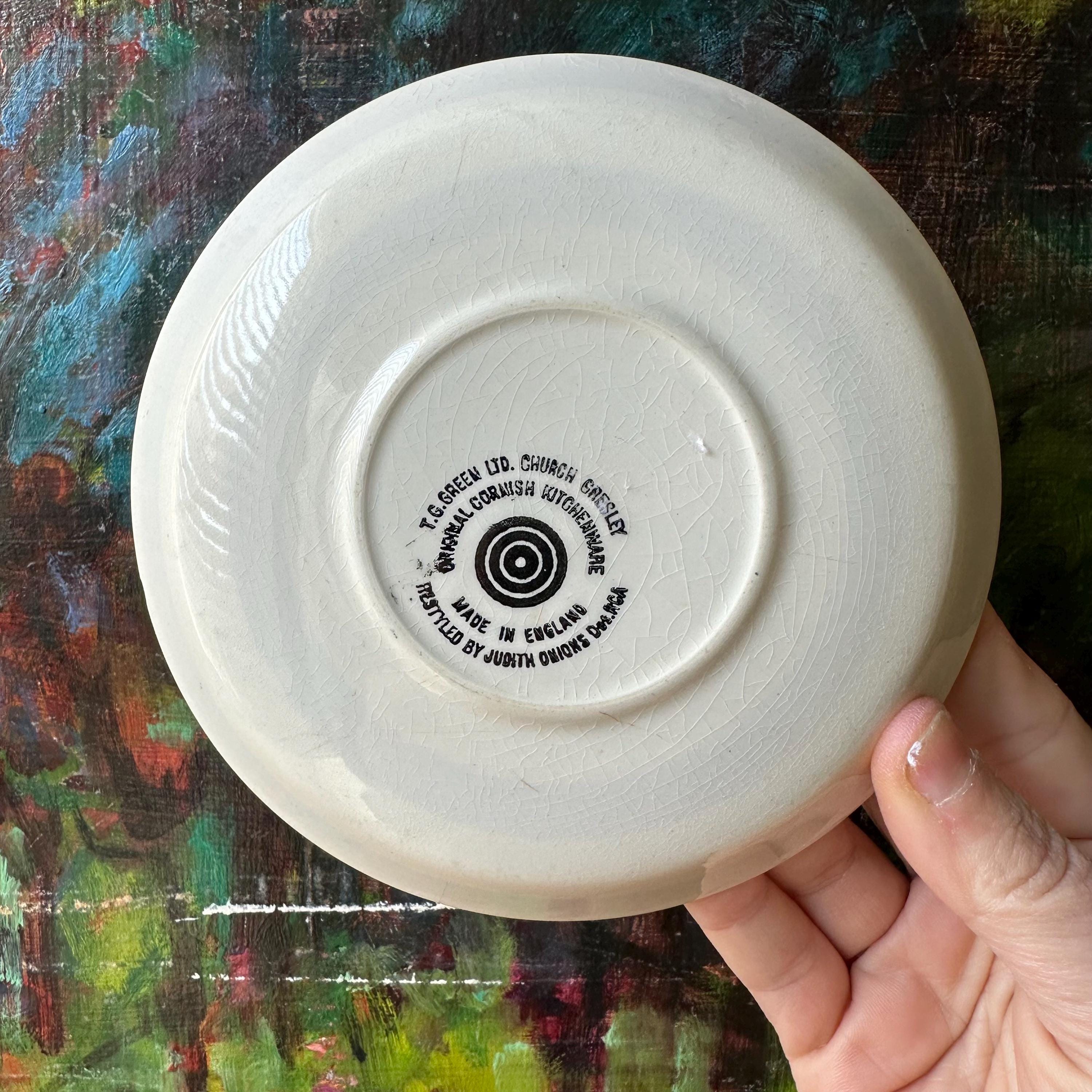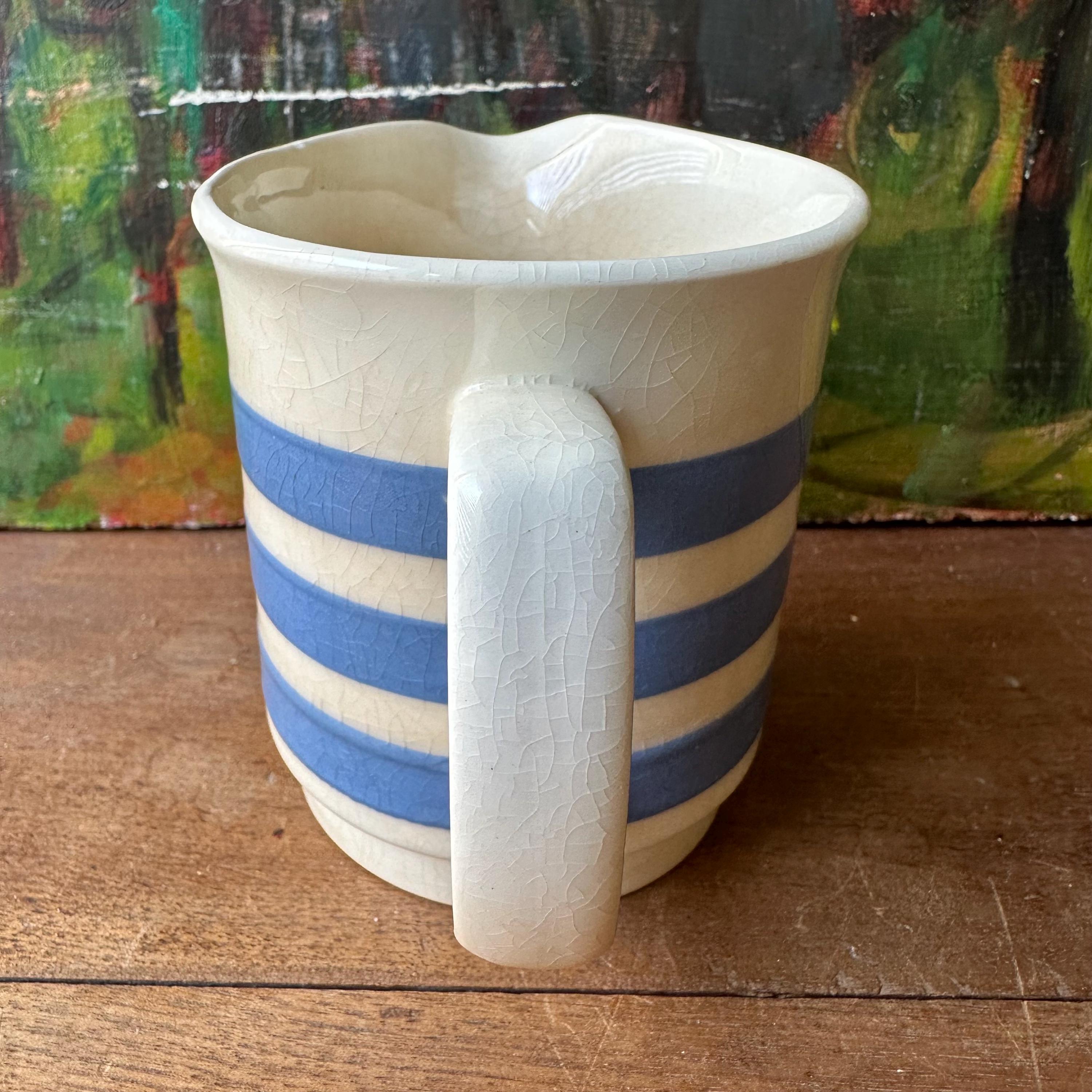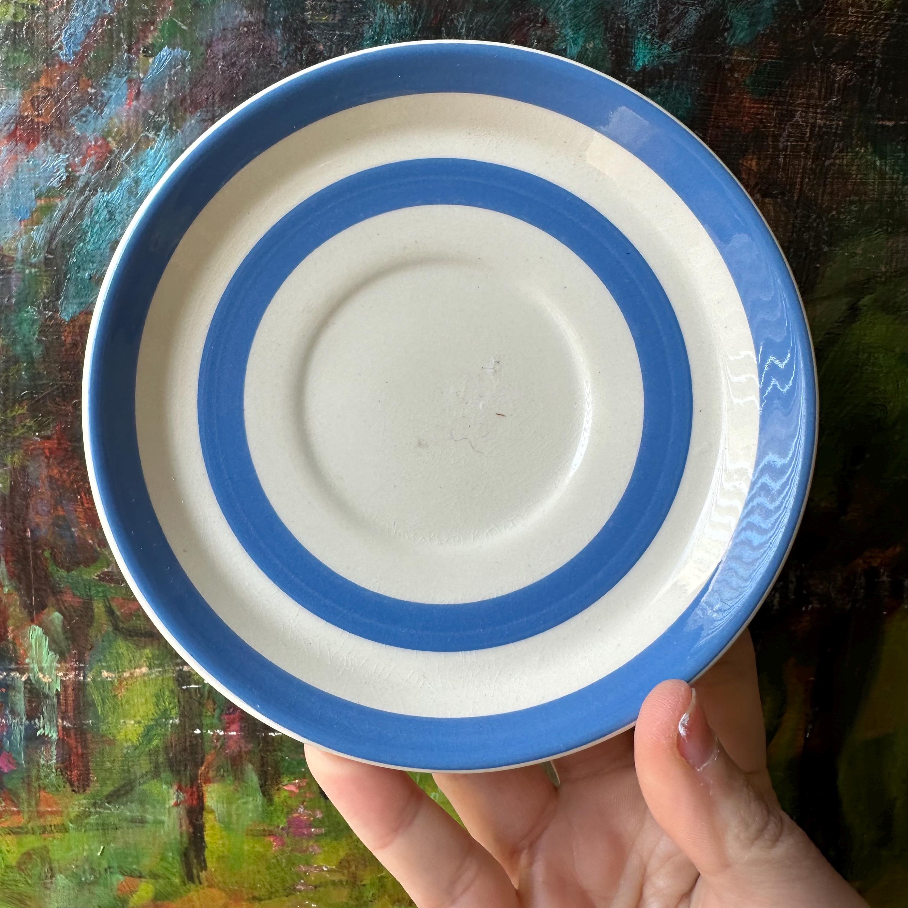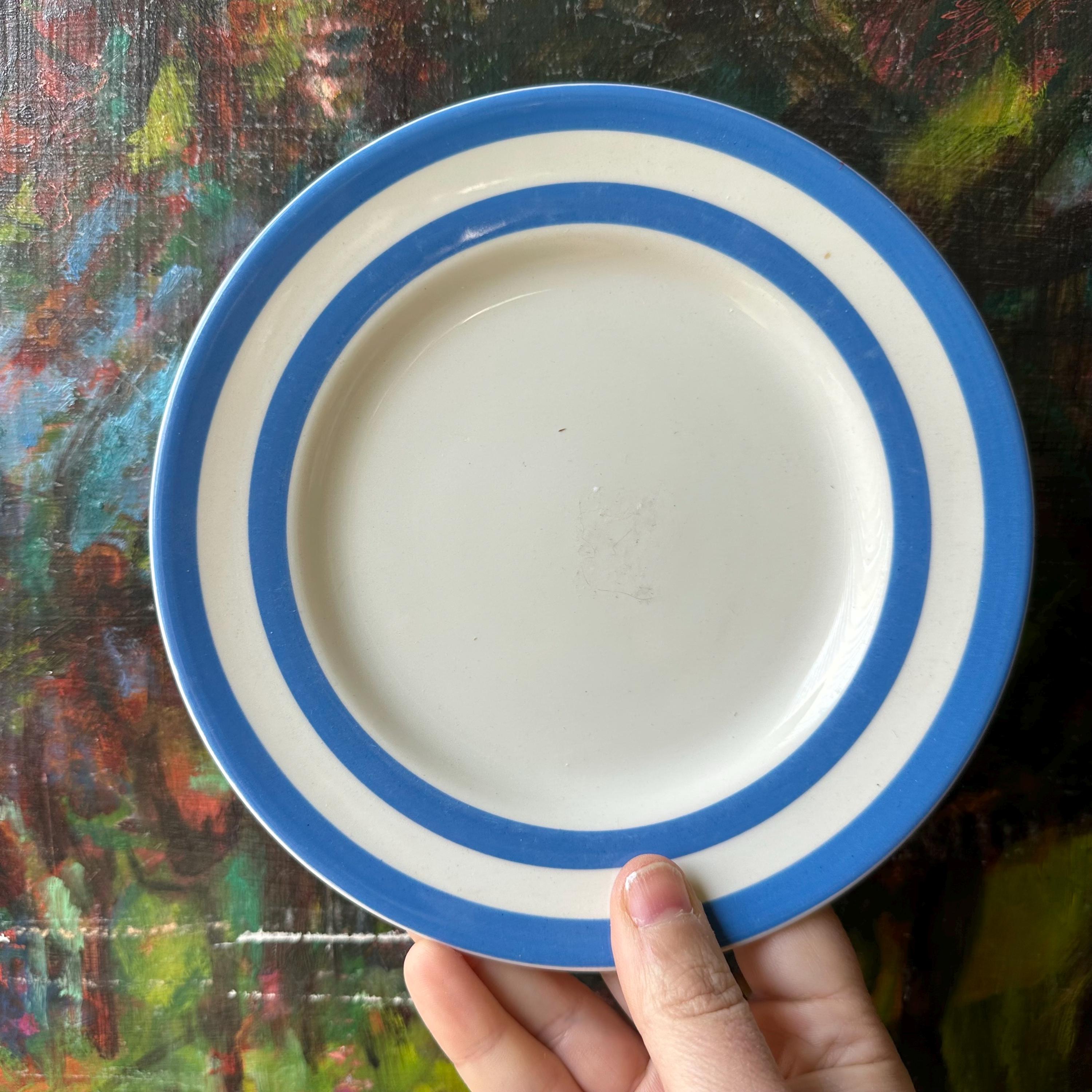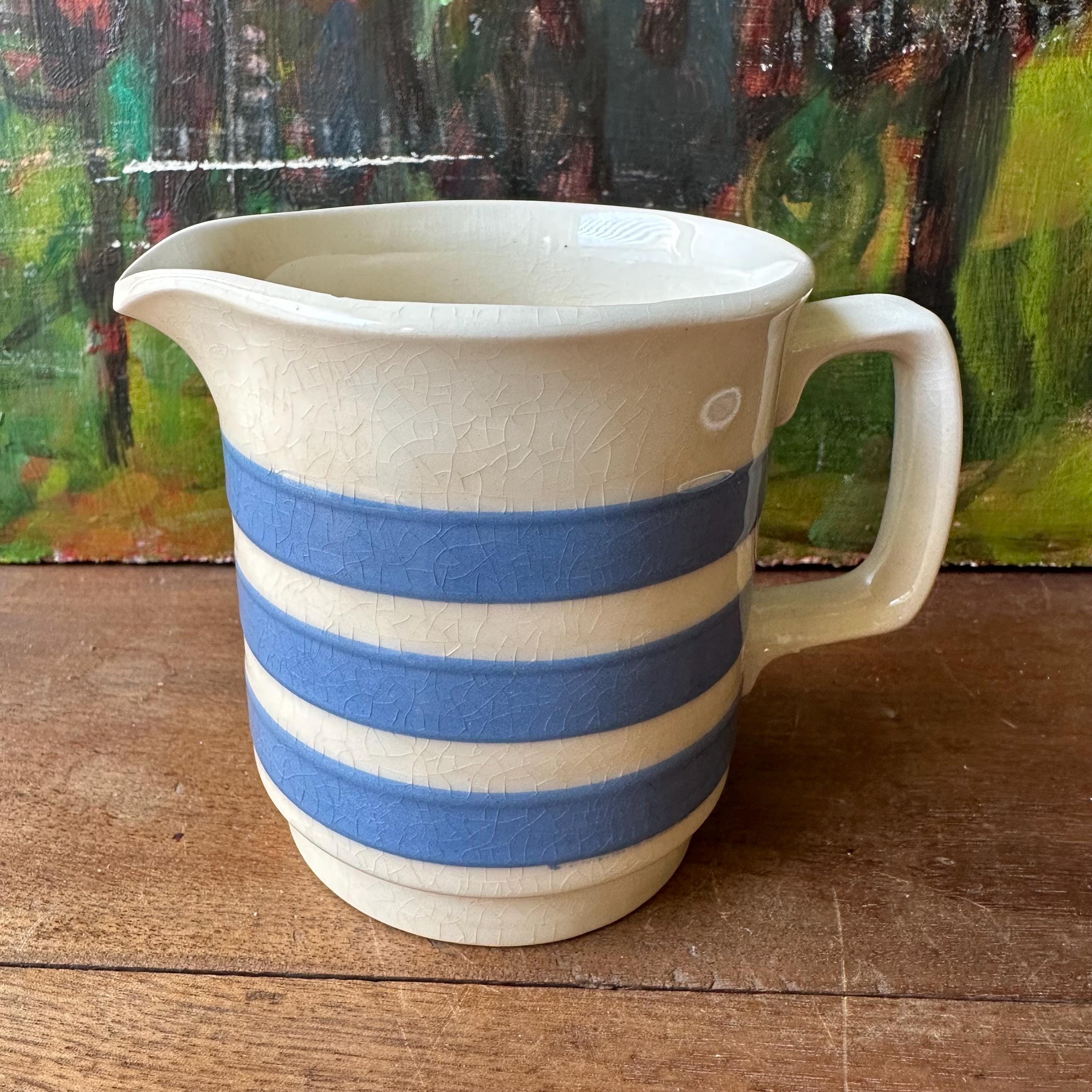 This is a set of blue stripe ceramic dishes, which includes a Carrigaline Pottery pitcher and two Restyled by Judith Onions Cornish Kitchenware plates. The pitcher is a creamer size in bright white with a wide mouth and slightly footed bottom. The pitcher is decorated with inset stripes that have been painted blue. The pitcher has a squared off handle. The bottom is embossed Carrigaline and Republic of Ireland. The plates are two different sizes. One is a saucer and one is a dessert plate. Both are striped blue and stamped on the bottom with T.G. Green Ltd. Church Gresley Original Cornish Kitchenware Made in England Restyled by Judith Onions.