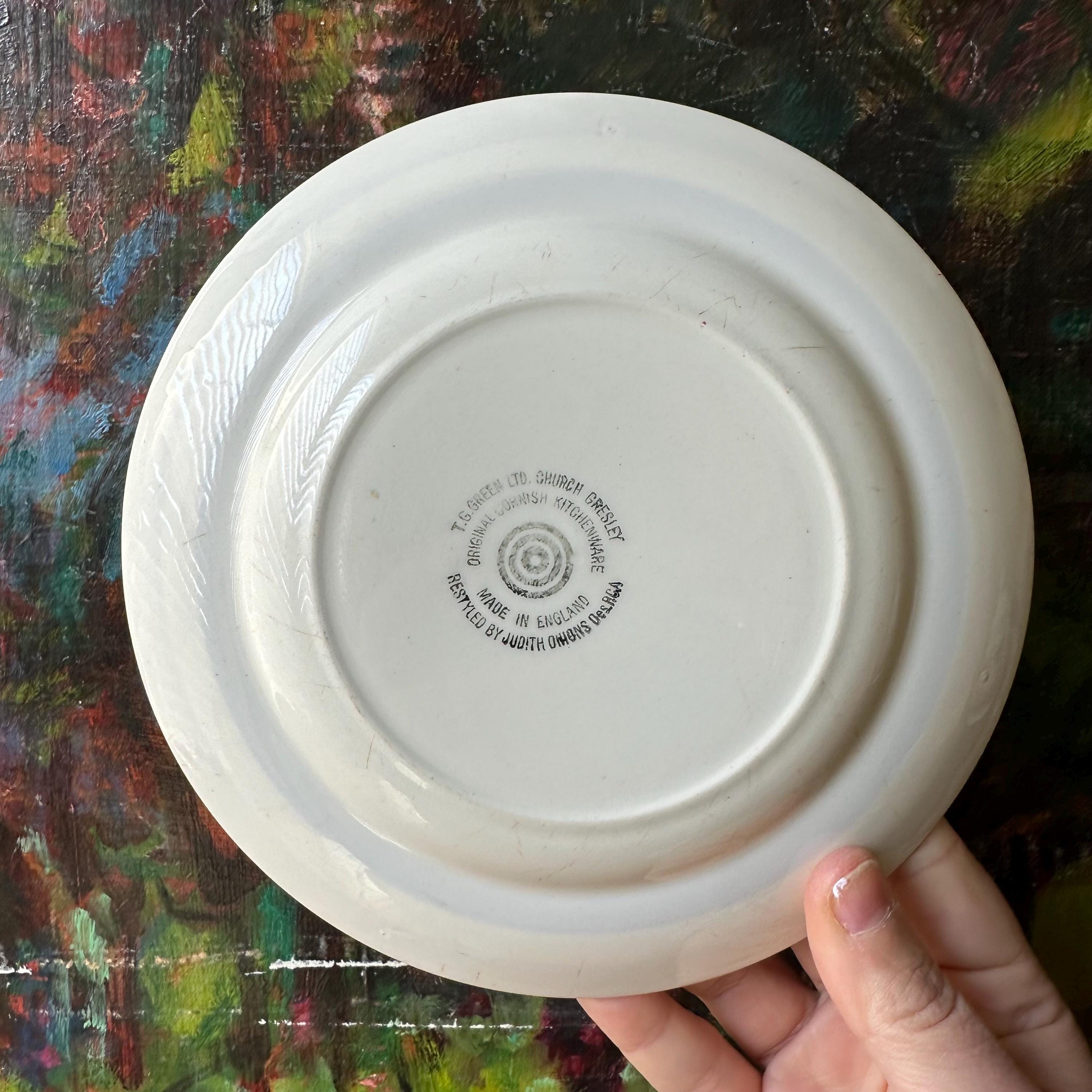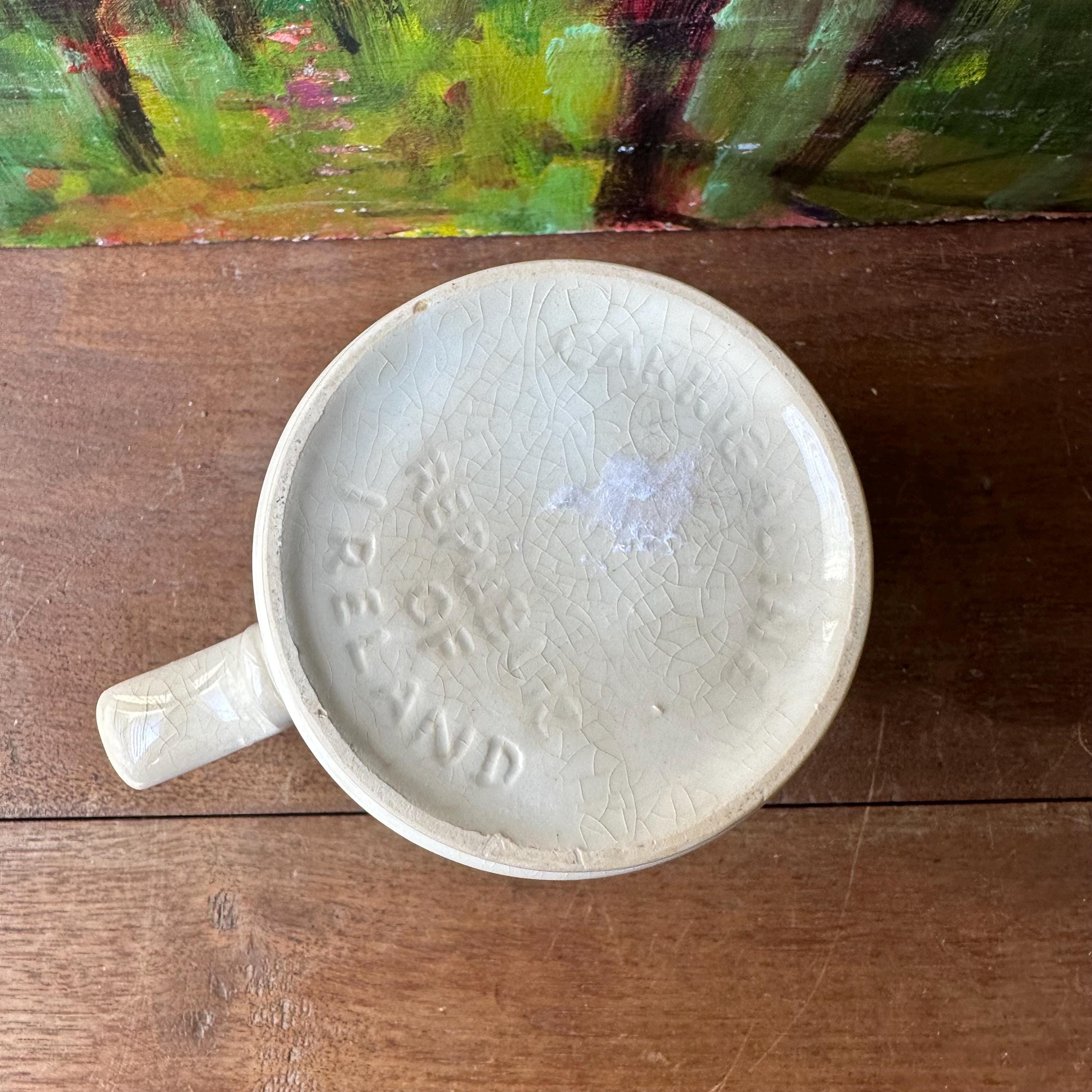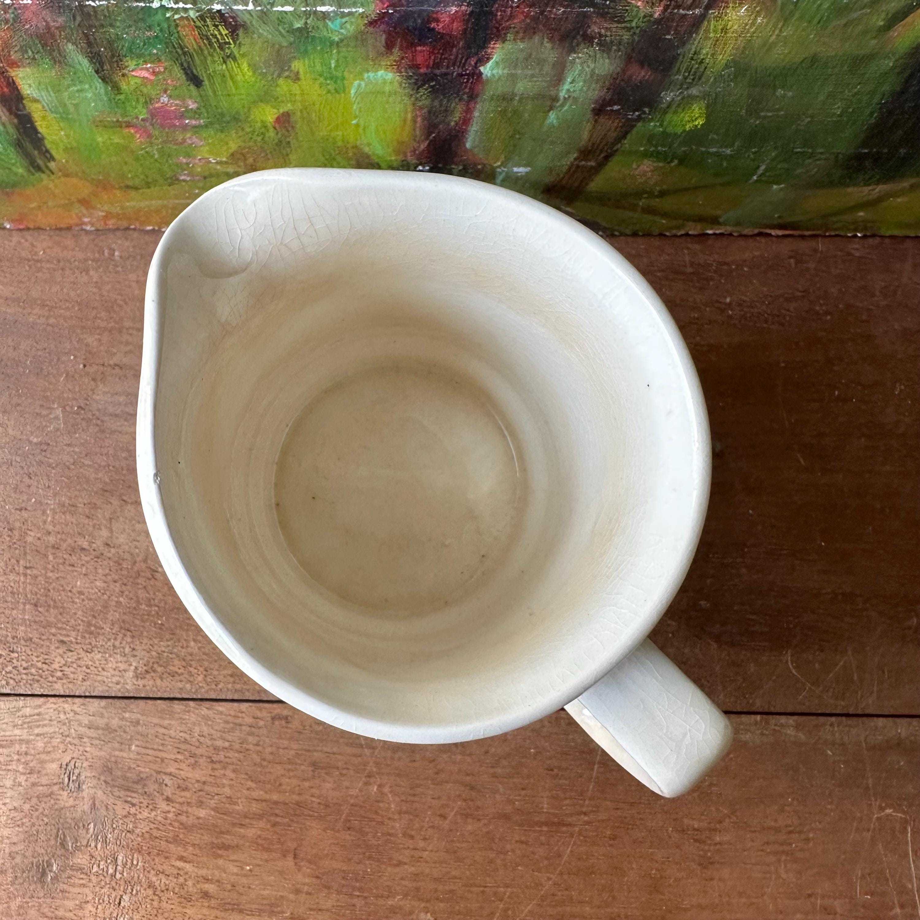 The pitcher is in good vintage condition for its age and use. It has general wear to the glazing inside and out. The glaze is crackled all over with some staining to the inside of the pitcher. There is one very small chip on the top rim but no cracks. The dessert plate is in great condition with no chips or cracks and minor discoloration to the bottom. The saucer is in good condition with some crackling to the glaze, especially on the bottom, and a very small hairline crack to the edge.