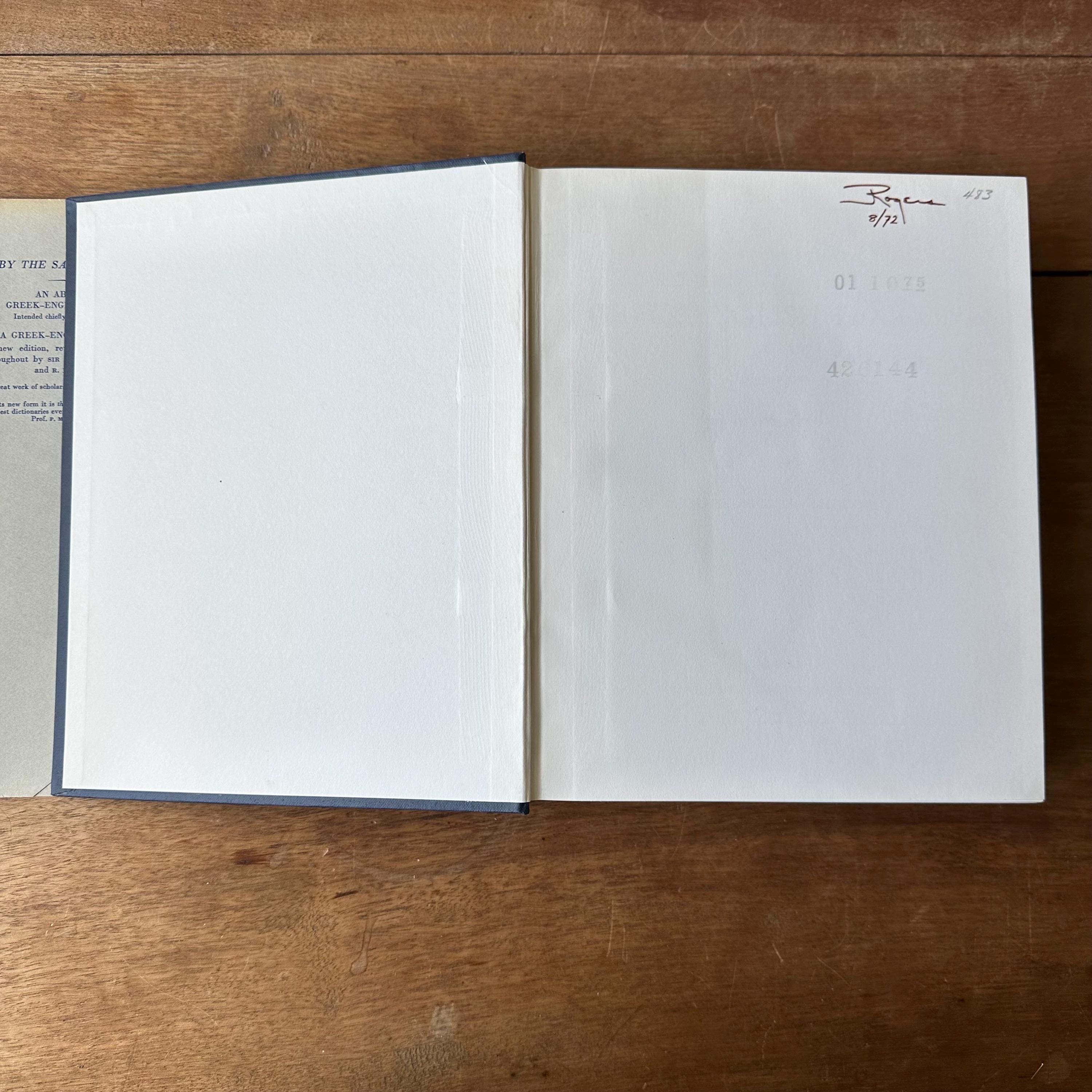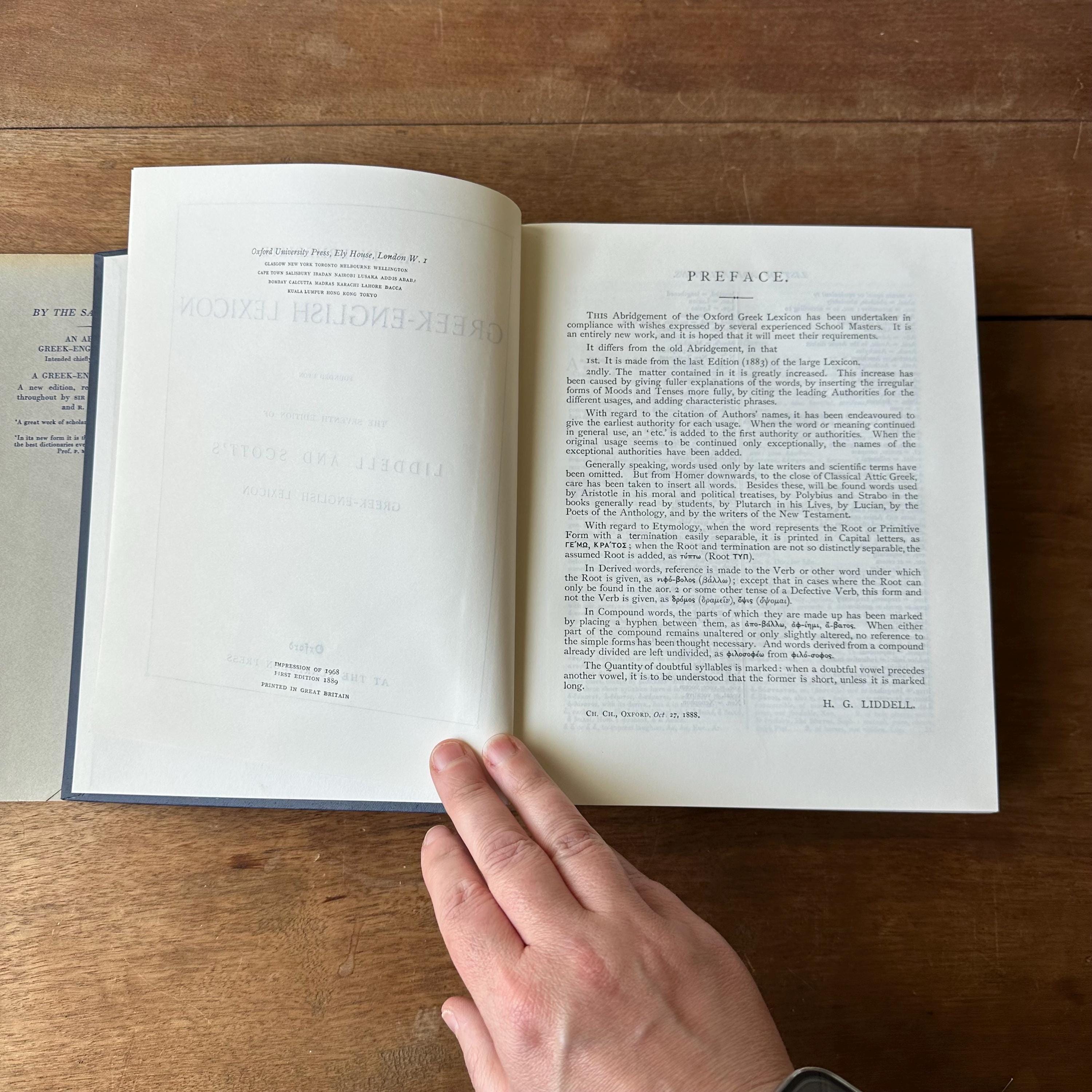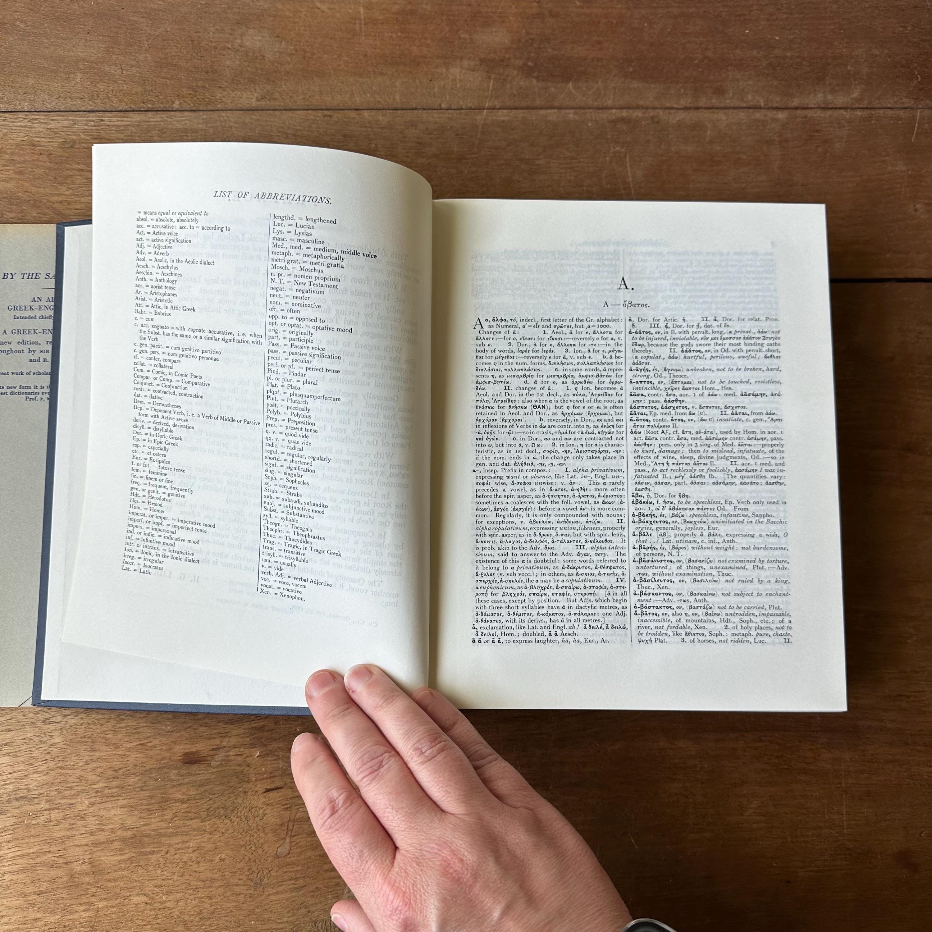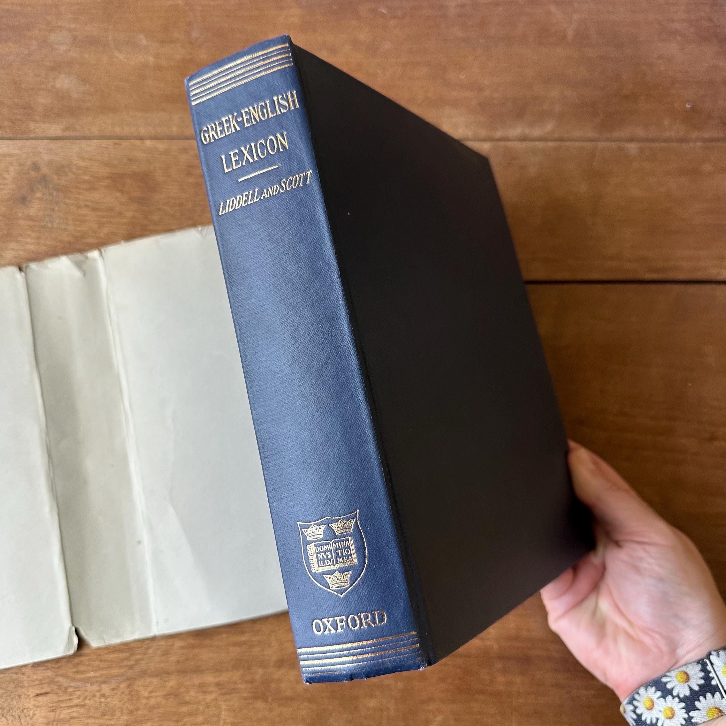 This is the 1968 edition of the Oxford Clarendon Press Greek-English Lexicon Founded Upon the Seventh Edition of Liddel and Scott's Greek-English Lexicon. It has the original gray dust jacket with blue lettering. The covers underneath are blue with gold lettering on the spine. This is a Greek to English dictionary, so all the words are in Greek letters with English translations. There are 910 pages with several black notes pages that follow.