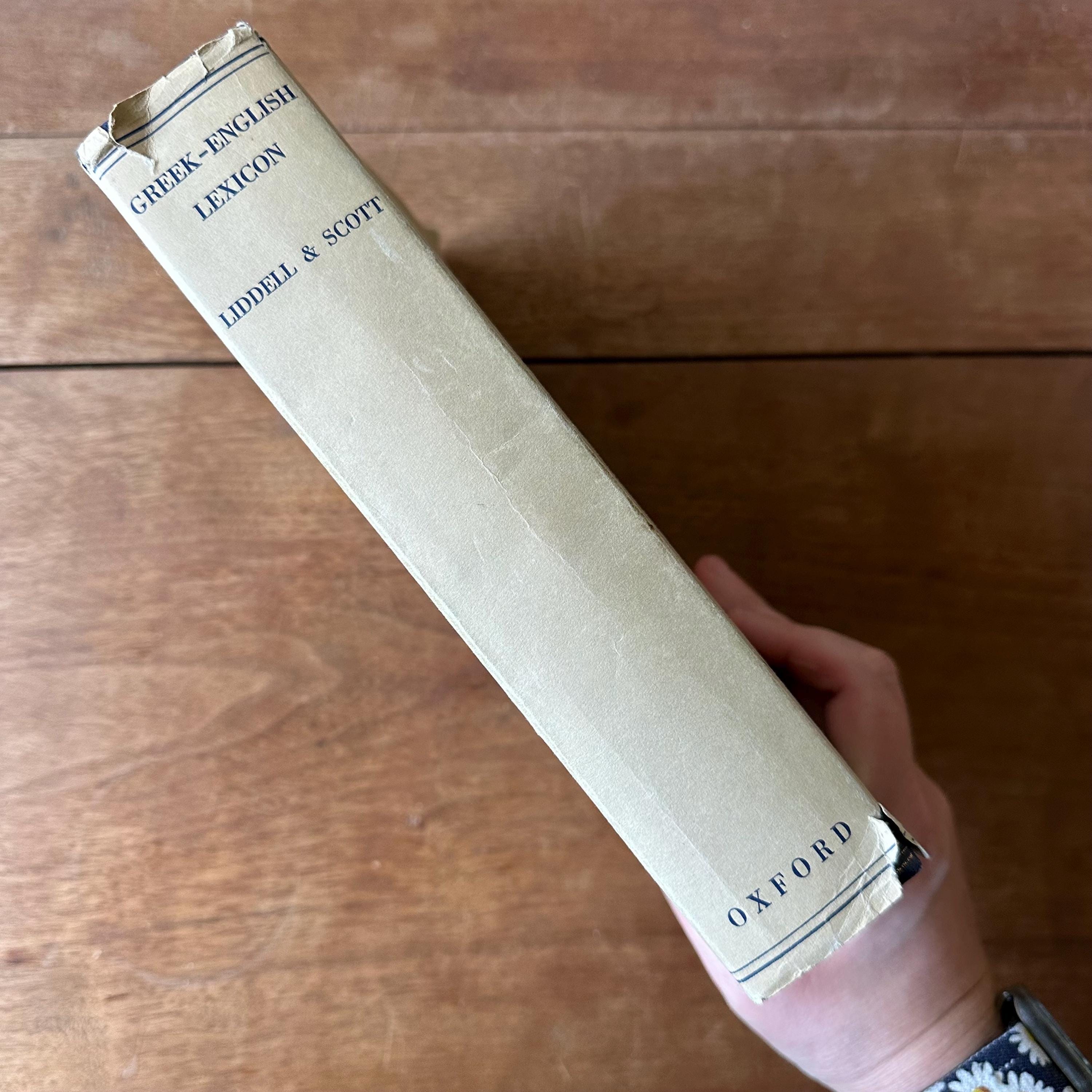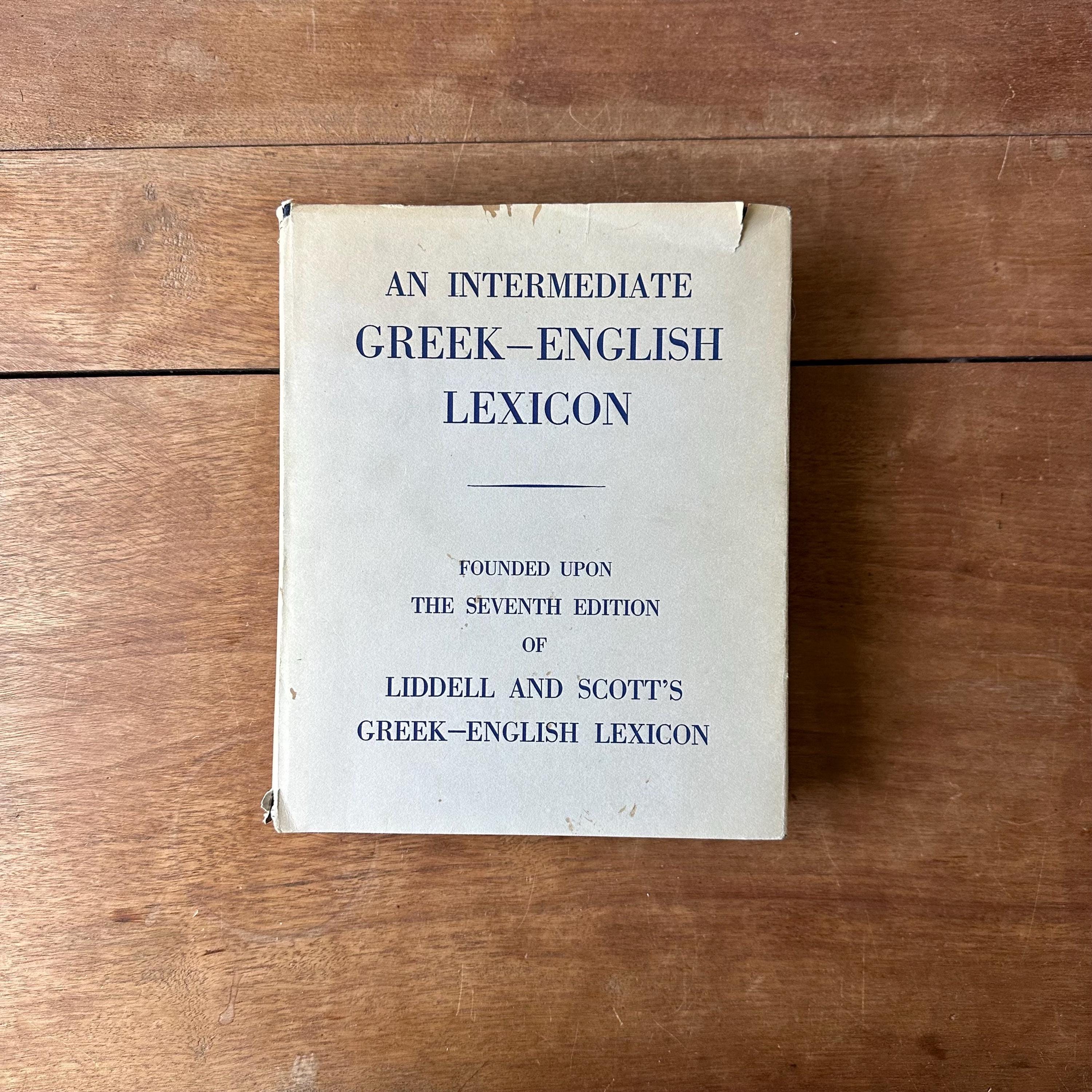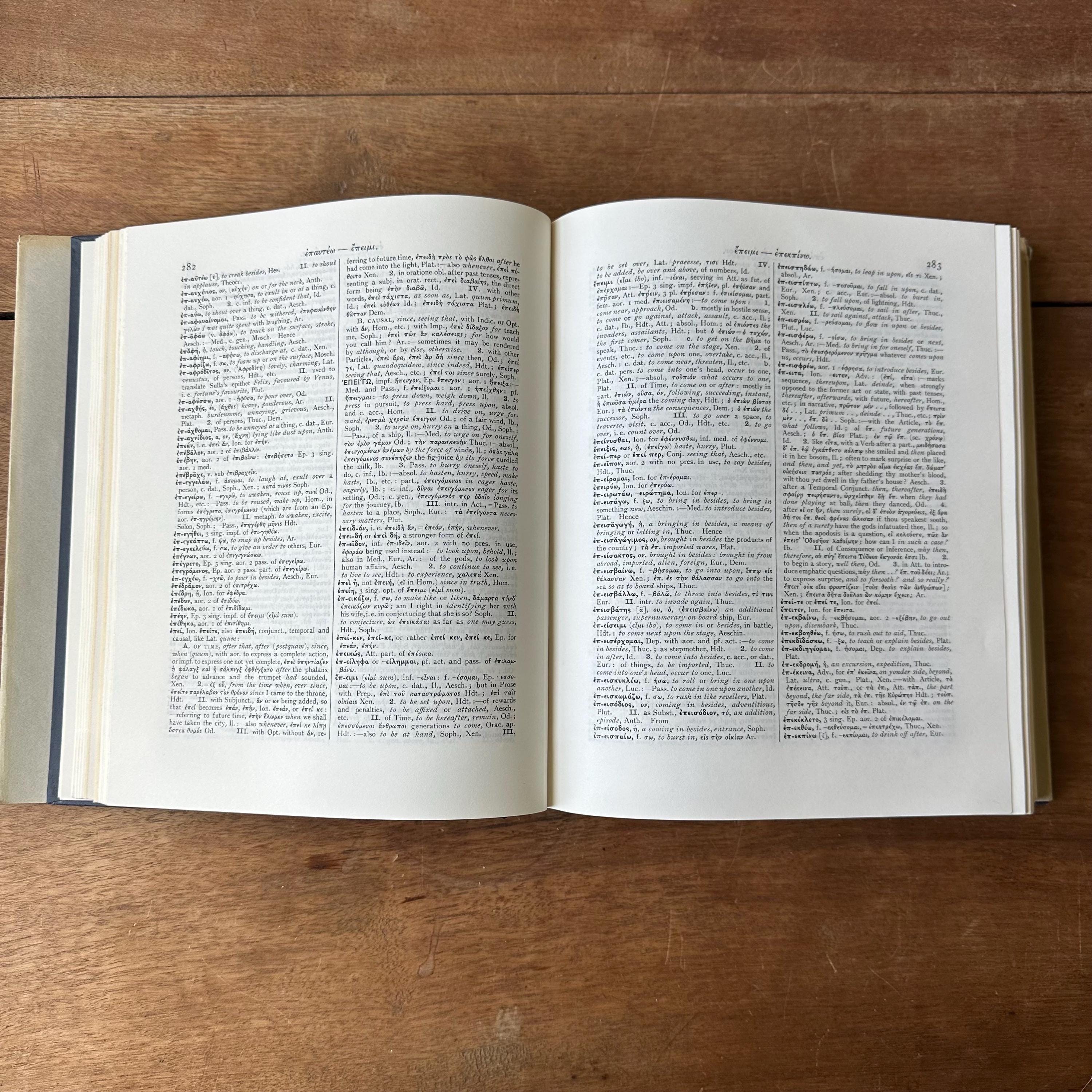 This is the 1968 edition of the Oxford Clarendon Press Greek-English Lexicon Founded Upon the Seventh Edition of Liddel and Scott's Greek-English Lexicon. It has the original gray dust jacket with blue lettering. The covers underneath are blue with gold lettering on the spine. This is a Greek to English dictionary, so all the words are in Greek letters with English translations. There are 910 pages with several black notes pages that follow.