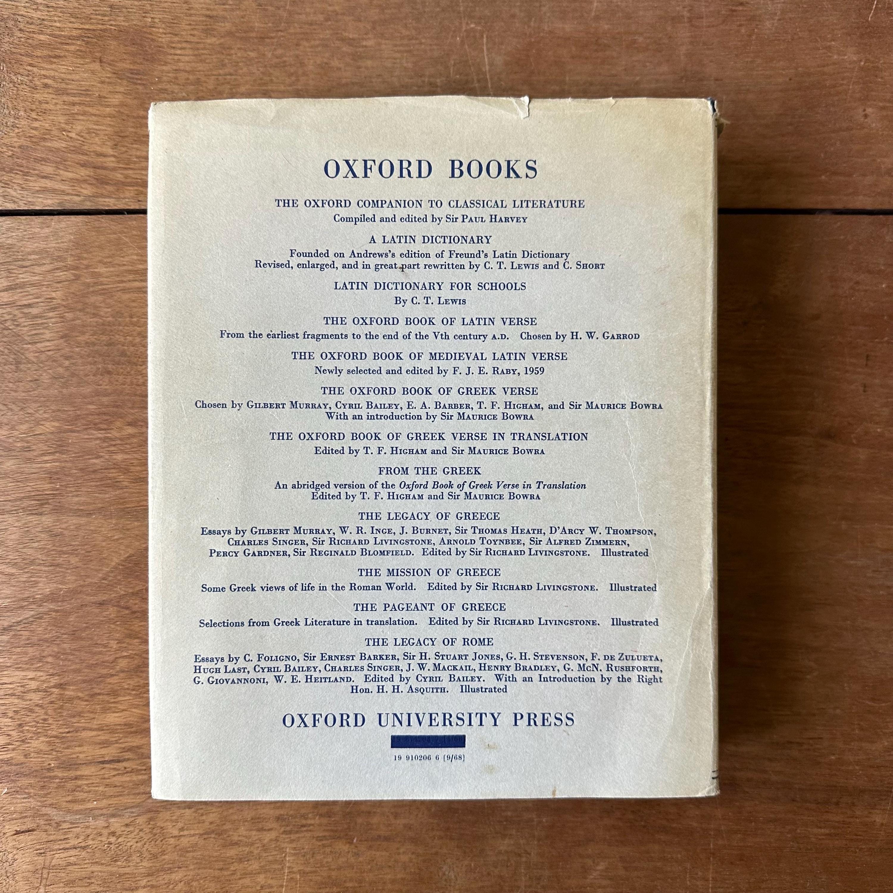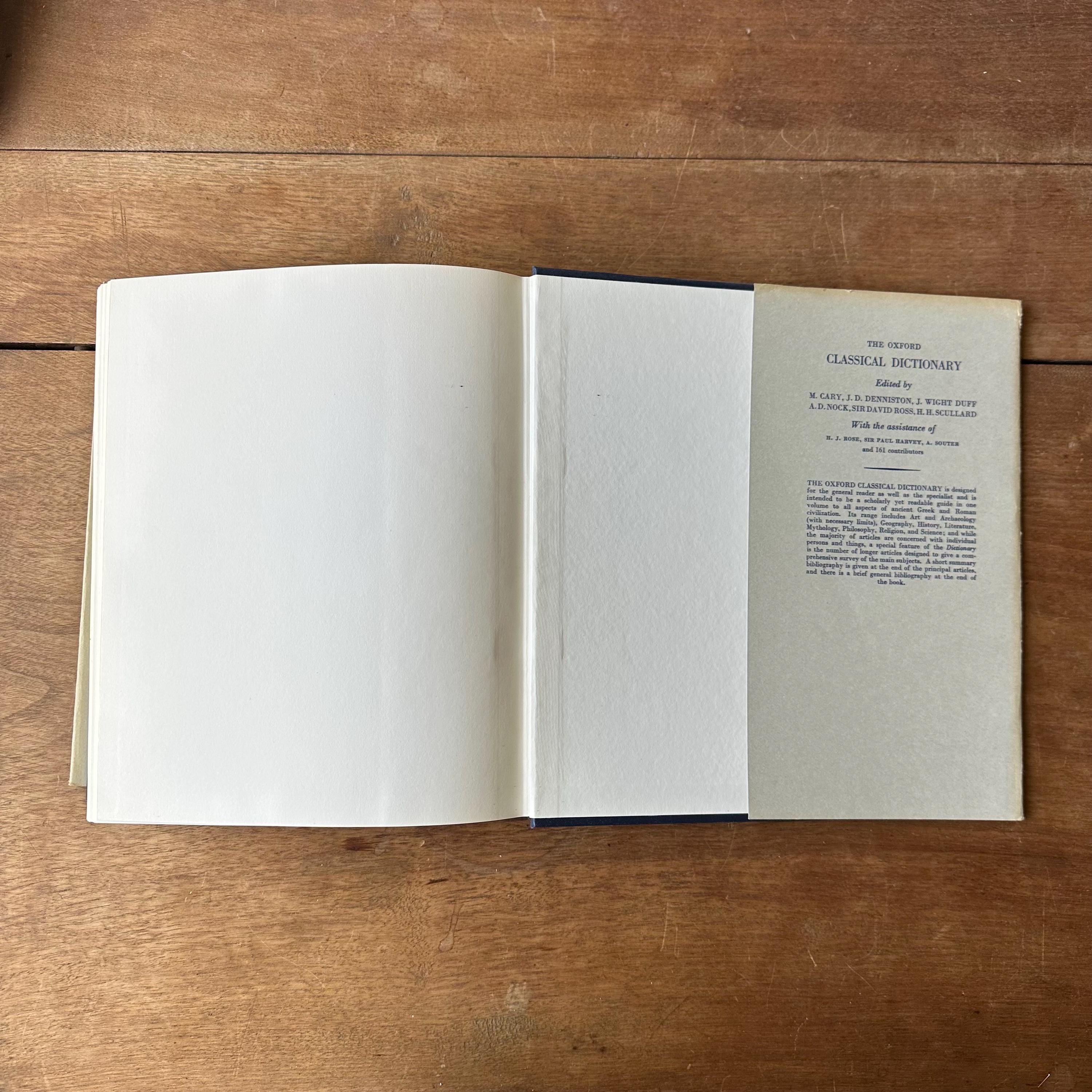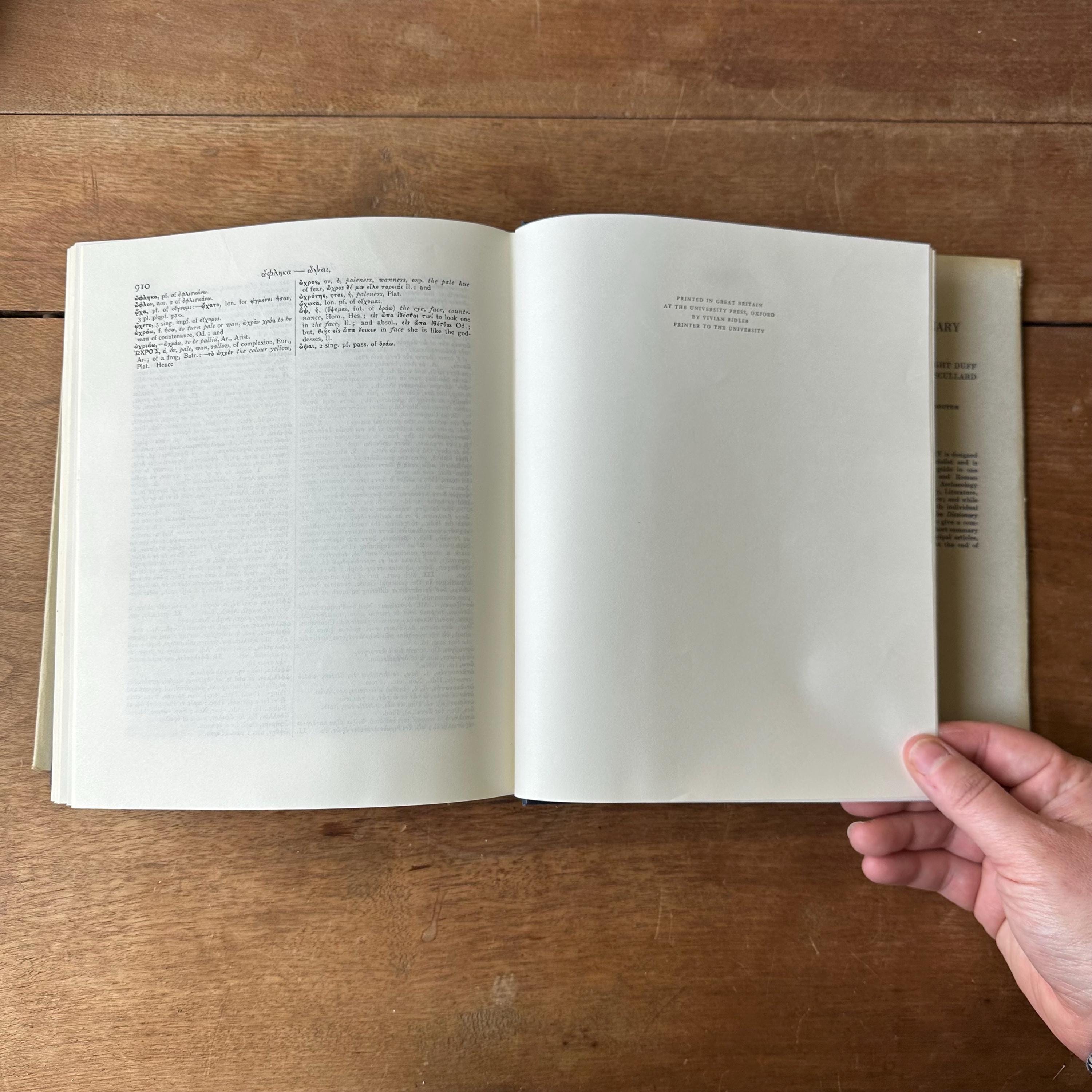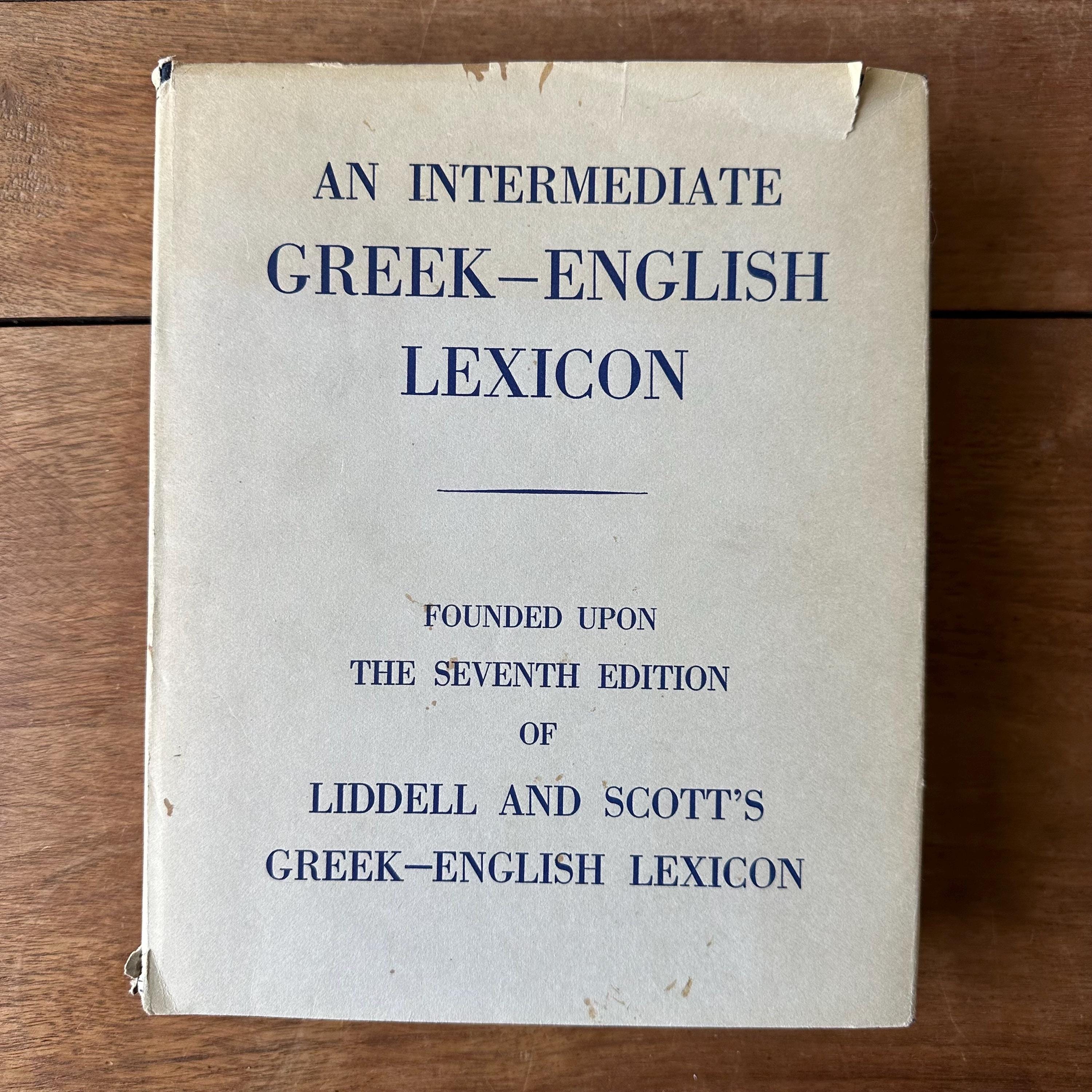 This is the 1968 edition of the Oxford Clarendon Press Greek-English Lexicon Founded Upon the Seventh Edition of Liddel and Scott's Greek-English Lexicon. It has the original gray dust jacket with blue lettering. The covers underneath are blue with gold lettering on the spine. This is a Greek to English dictionary, so all the words are in Greek letters with English translations. There are 910 pages with several black notes pages that follow.