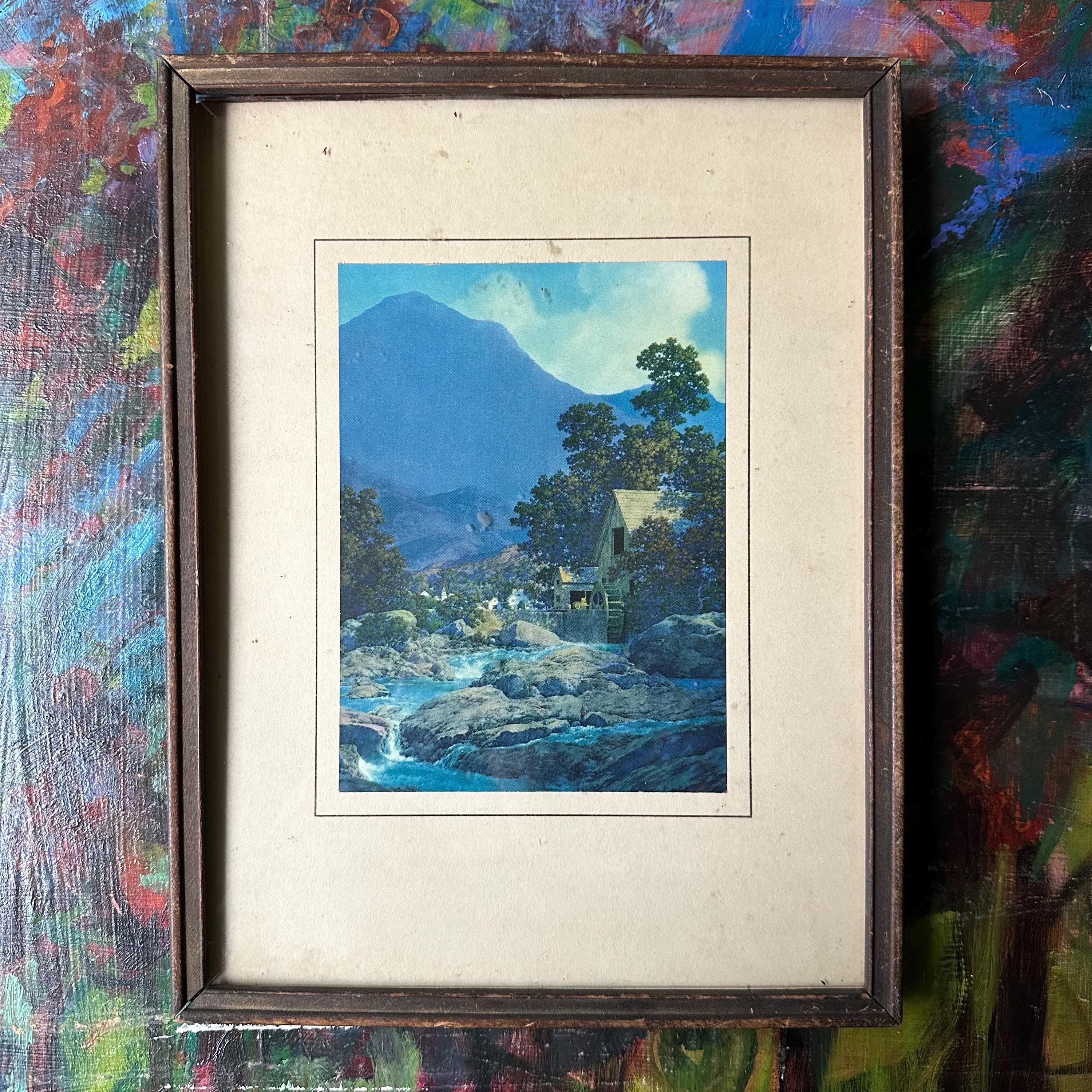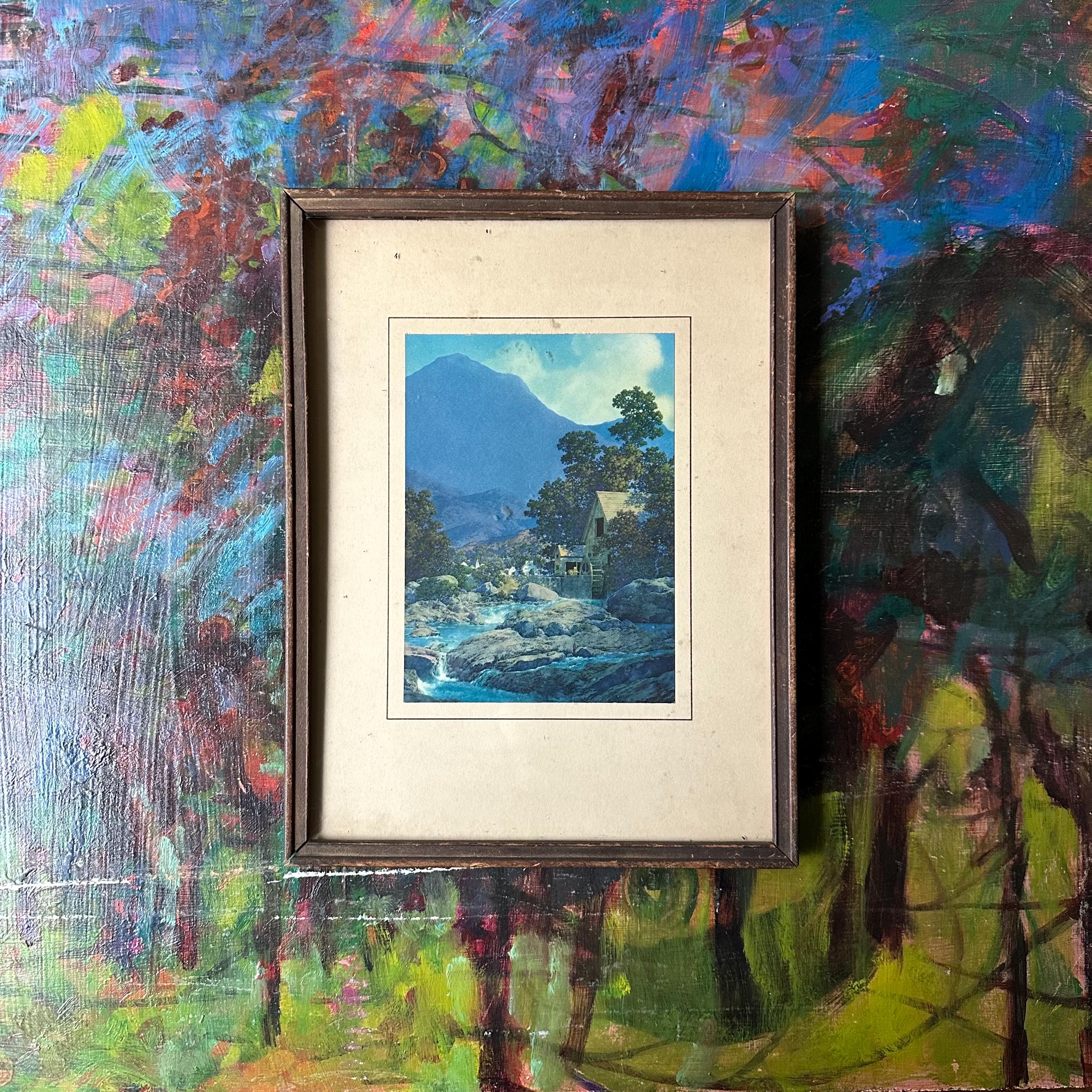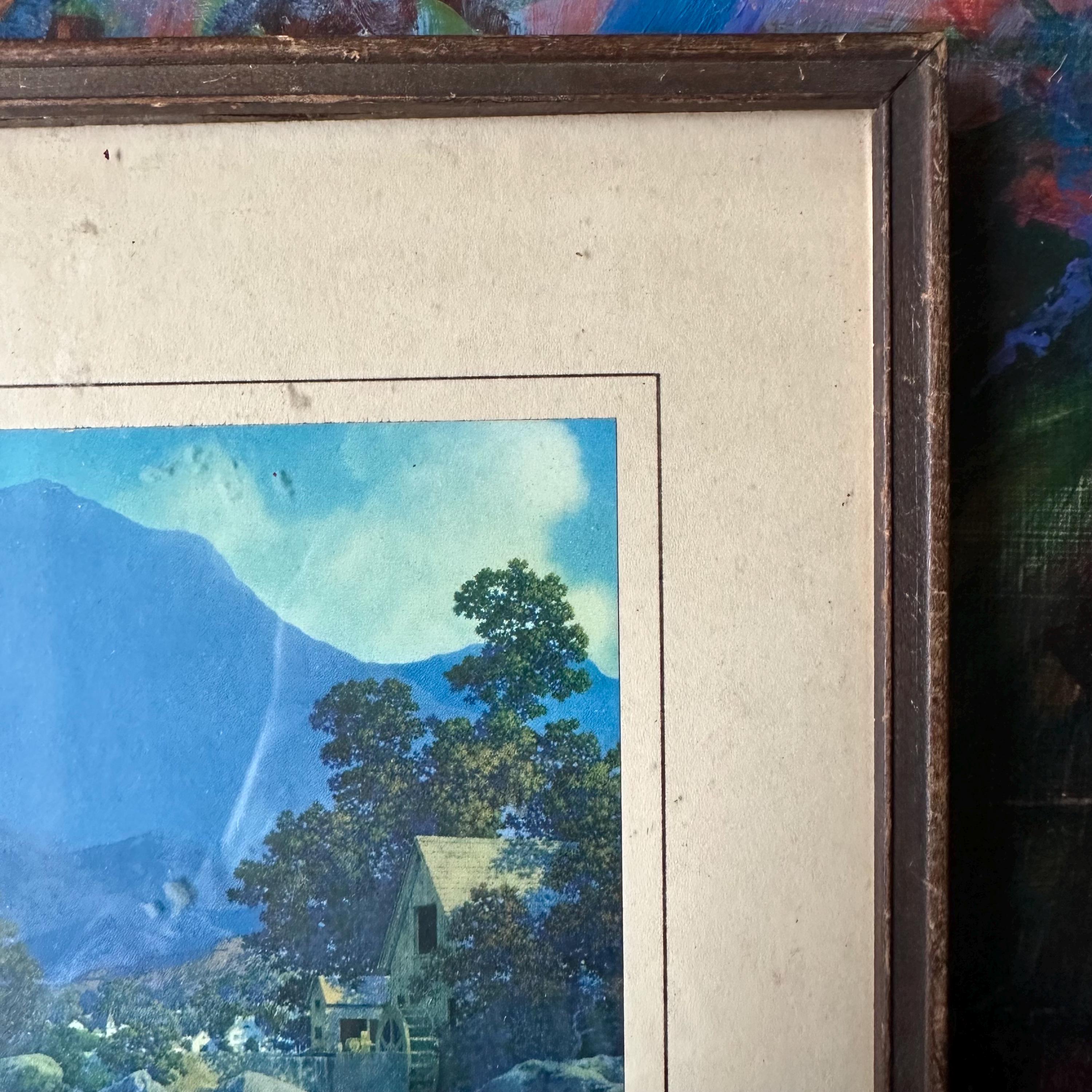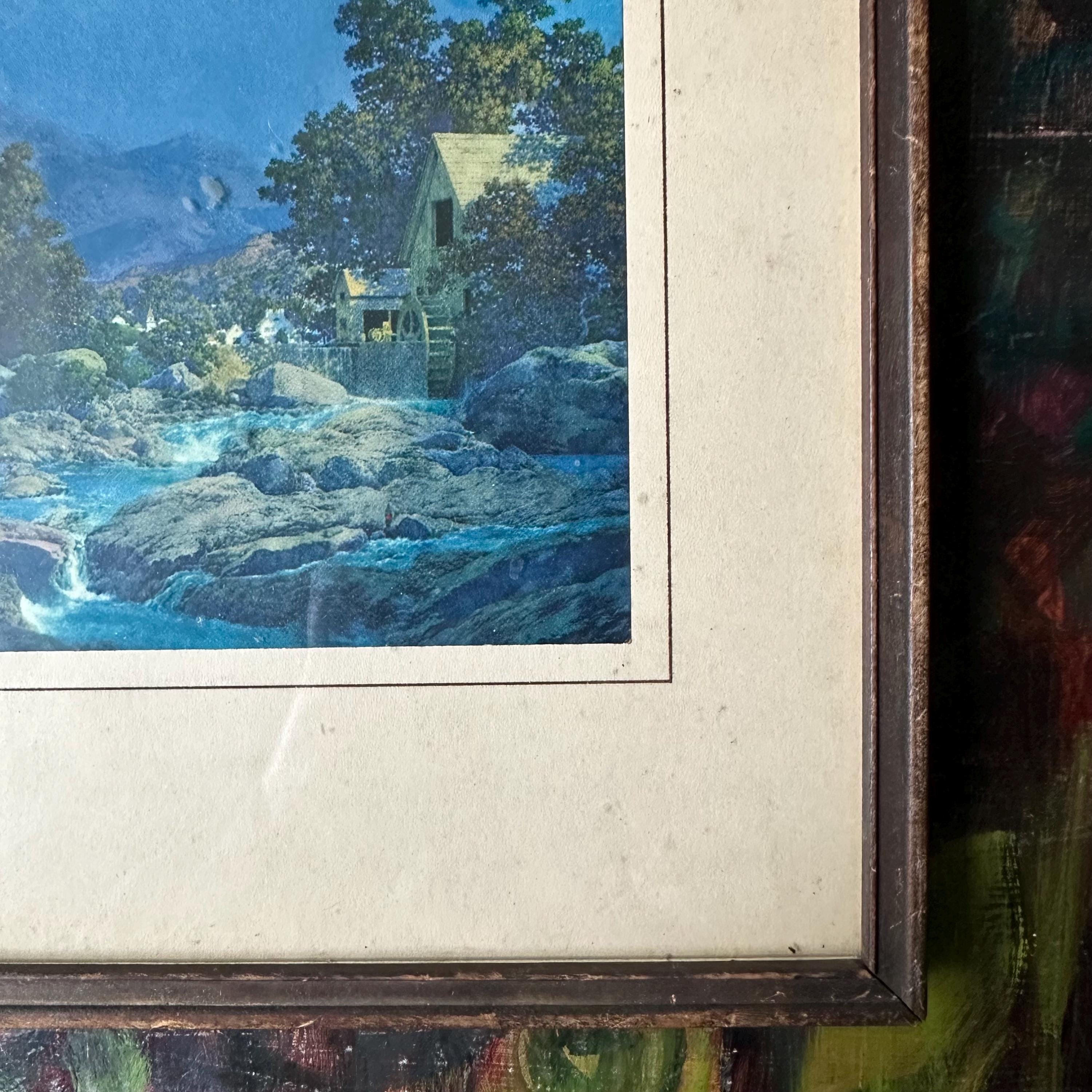This is a vintage framed print of Maxfield Parrish's Thy Rocks and Rills, also known as The Old Mill. It was featured in the 1944 edition of the Brown & Bigelow calendar and then became well-known again in the 1970s with more prints. This edition has a blue-saturated print of the original painting matted on a cream-colored mat with a thin brown border. The print is framed under glass in a simple inset wood frame. There is picture wire on the back.