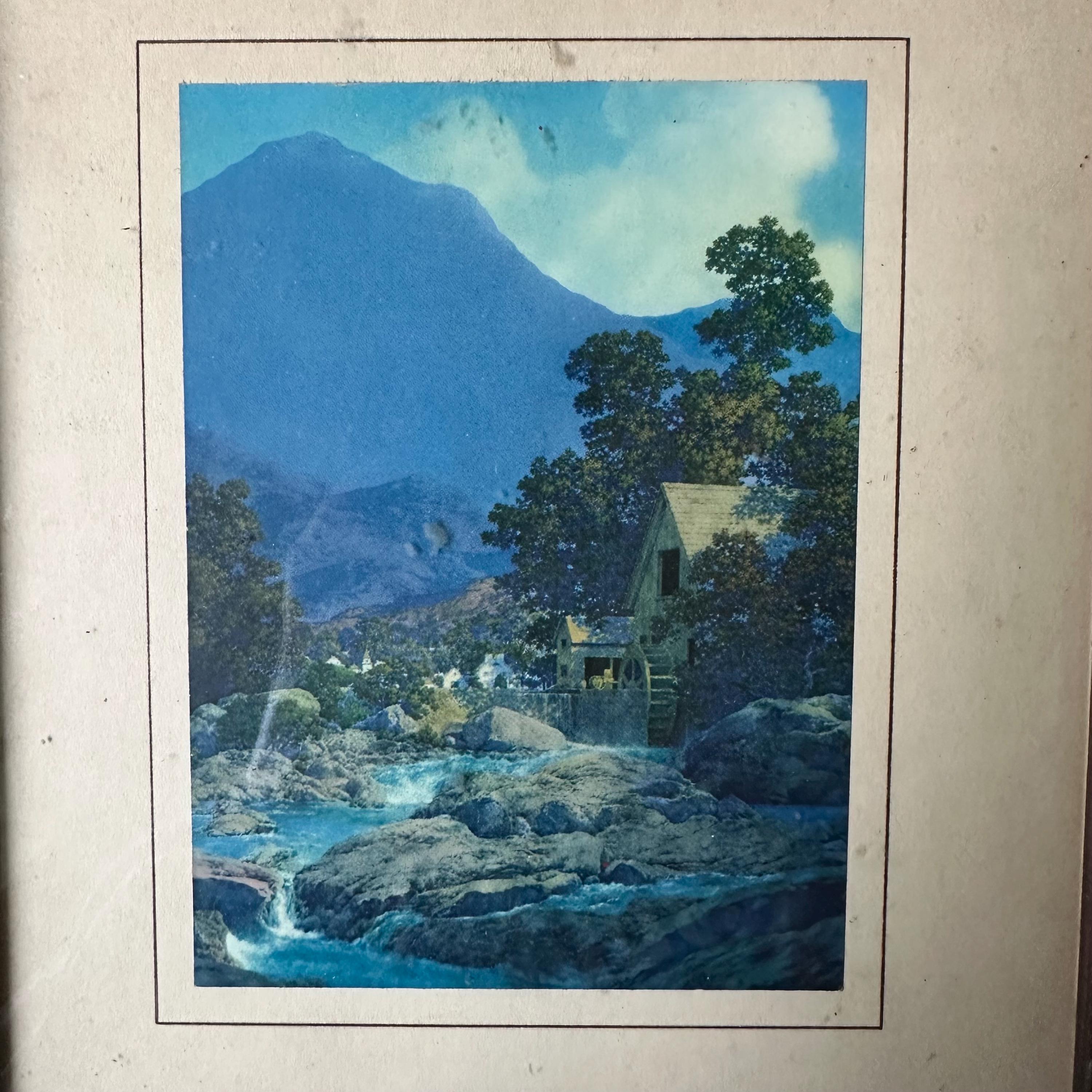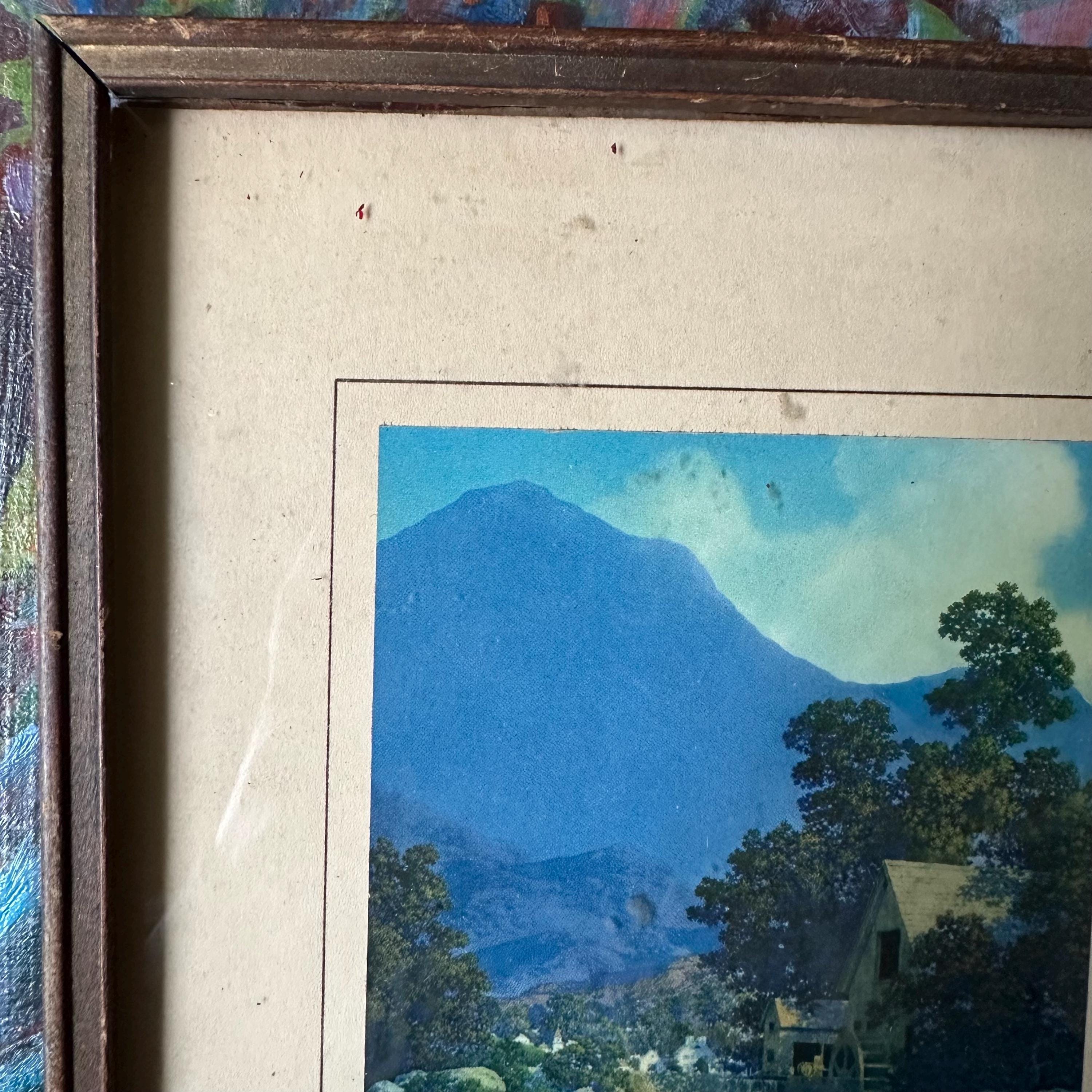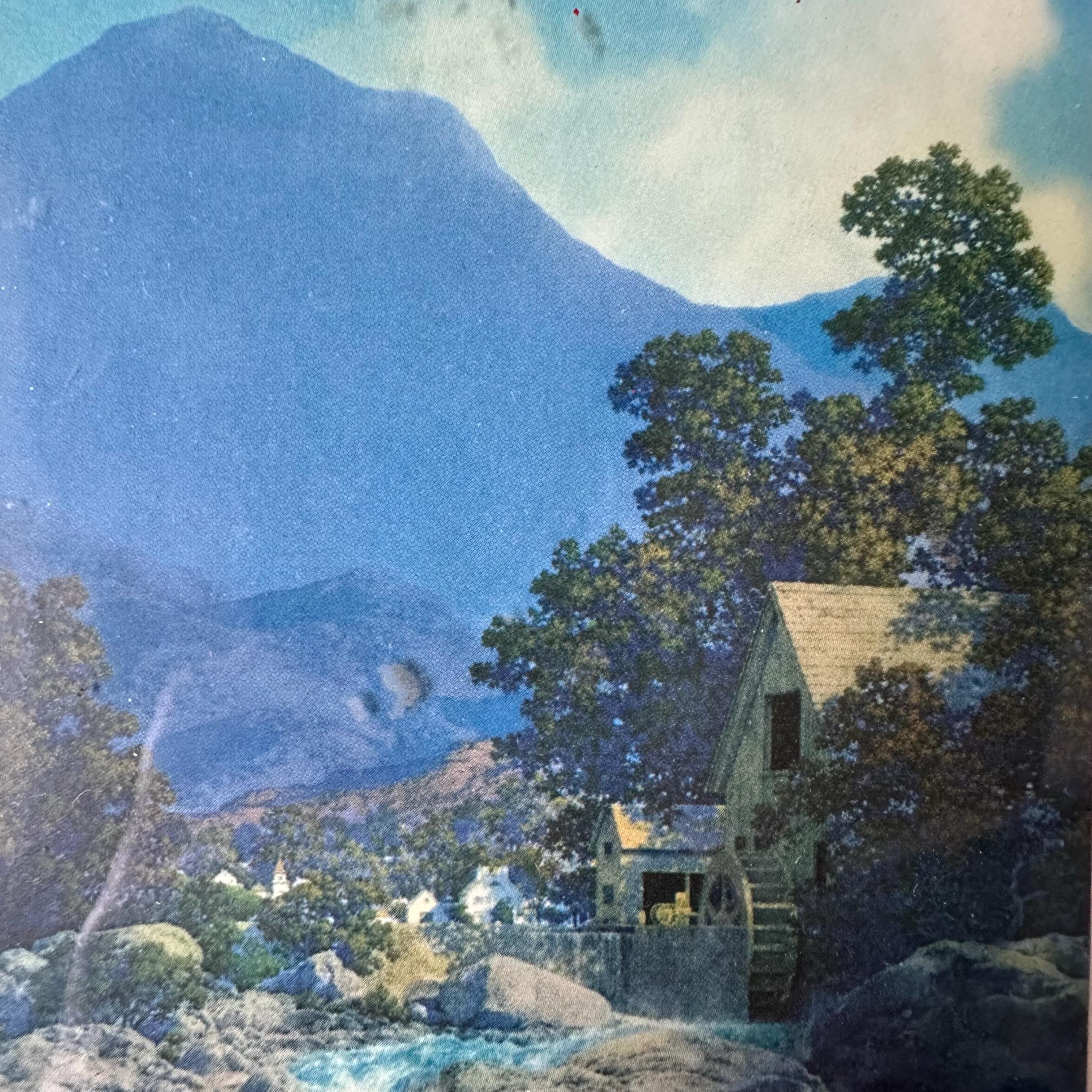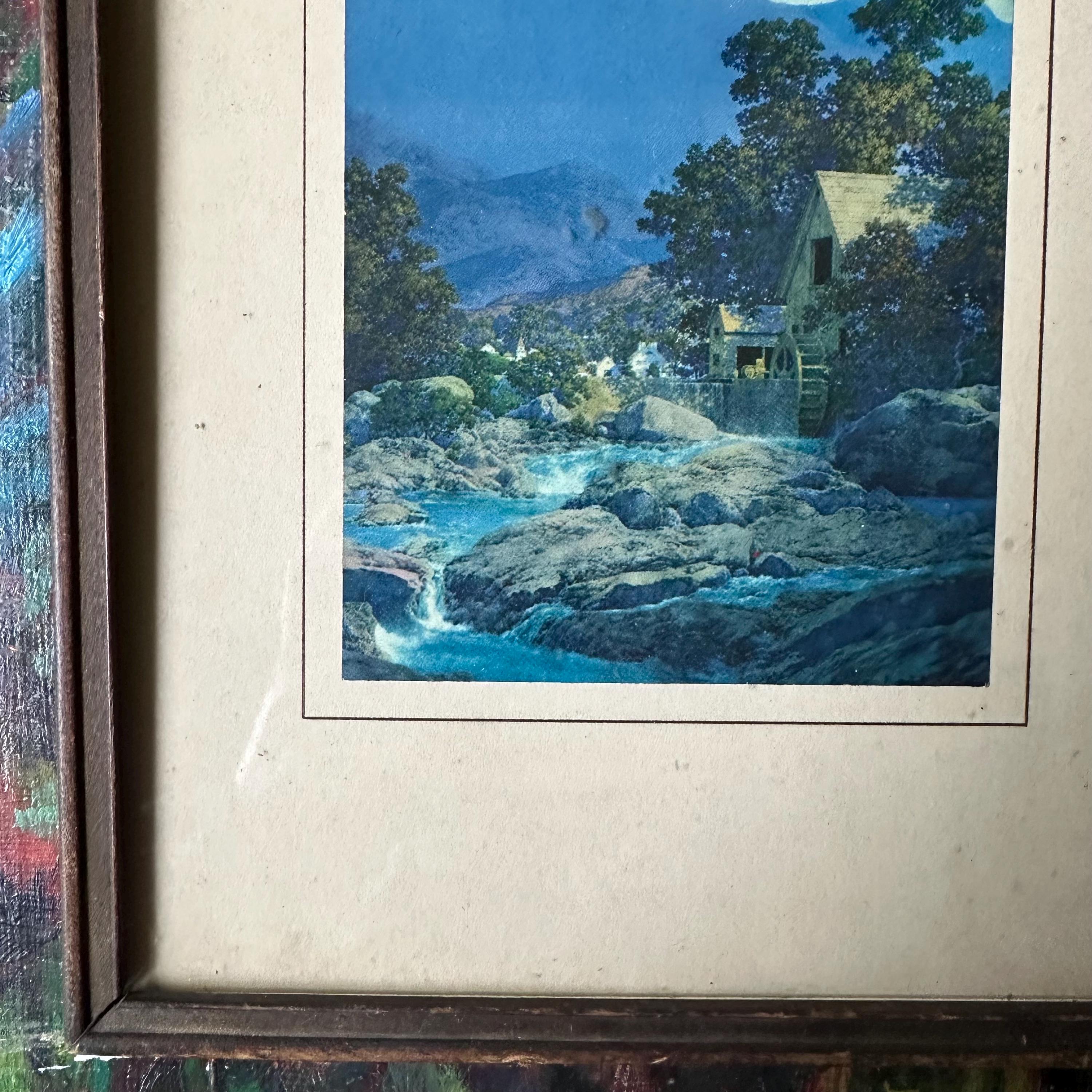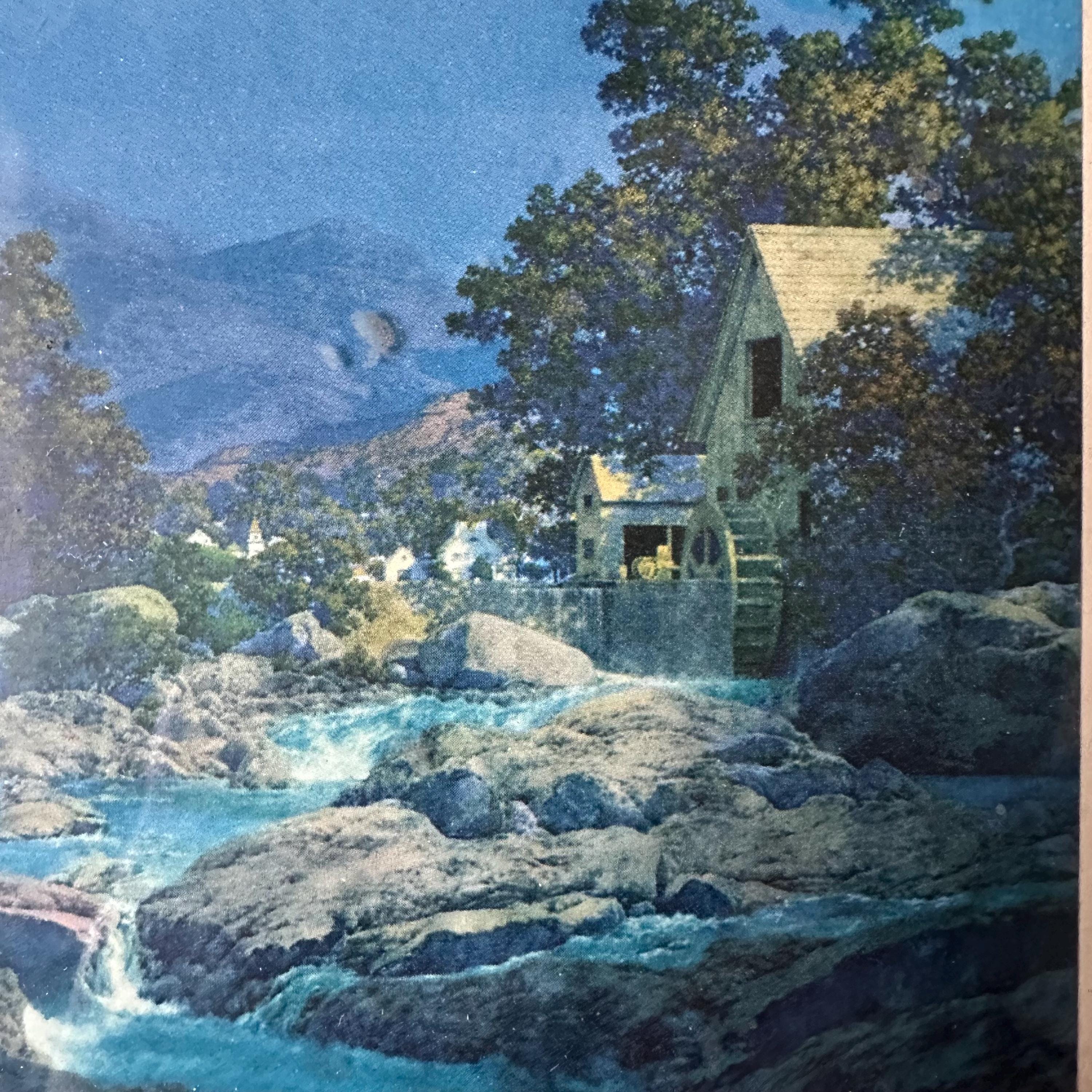This is a vintage framed print of Maxfield Parrish's Thy Rocks and Rills, also known as The Old Mill. It was featured in the 1944 edition of the Brown & Bigelow calendar and then became well-known again in the 1970s with more prints. This edition has a blue-saturated print of the original painting matted on a cream-colored mat with a thin brown border. The print is framed under glass in a simple inset wood frame. There is picture wire on the back.