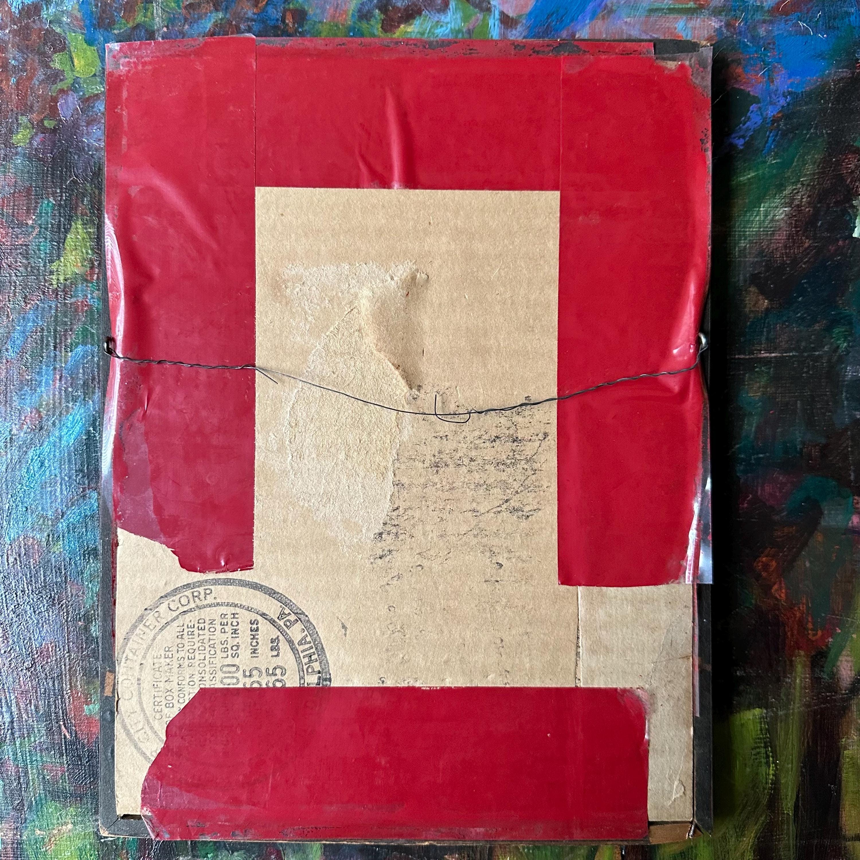 The print is in good vintage condition for its age and use. It is very blue; I'm not sure if this is original or aging to the print. The mat is slightly yellowed along the edges where it meets the frame. The glass is clear. The frame is intact with some slight separation at the corners. The frame is missing its back tabs or nails to hold in the glass. It is currently being held in by tape around all four sides, but the tape is beginning to lose its stick, causing the glass is to wobble in the frame.