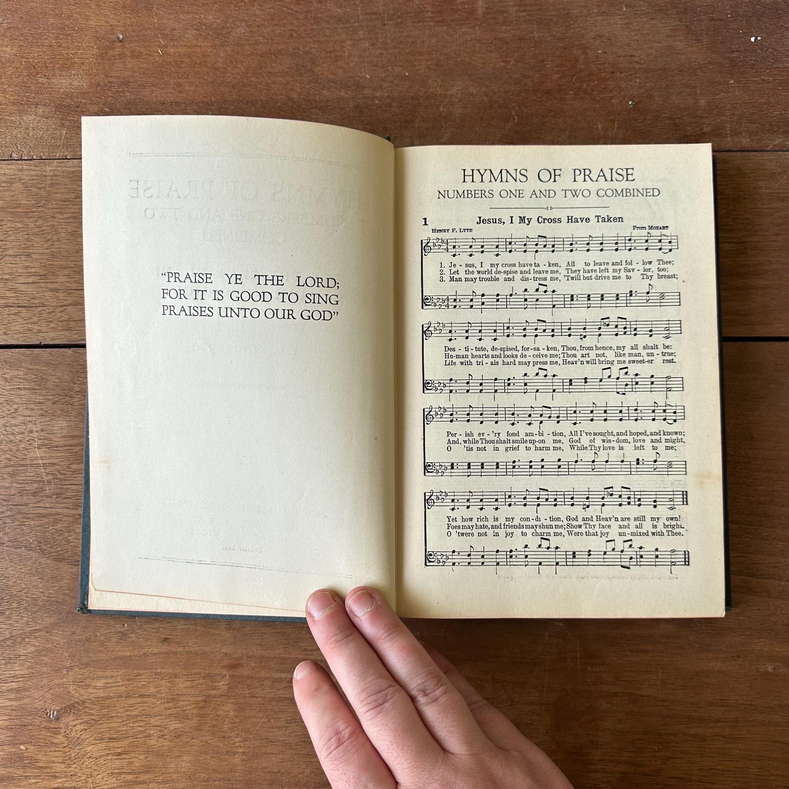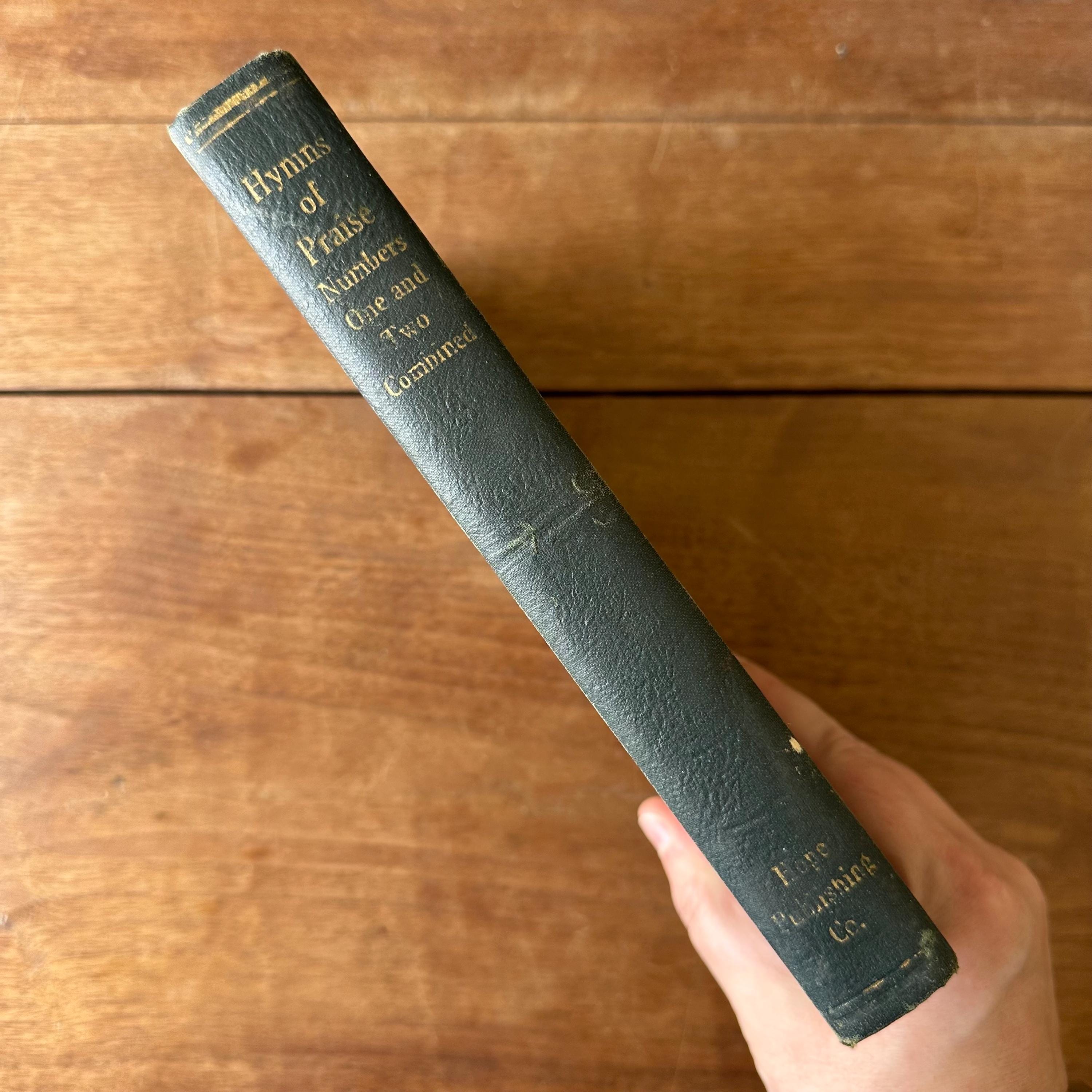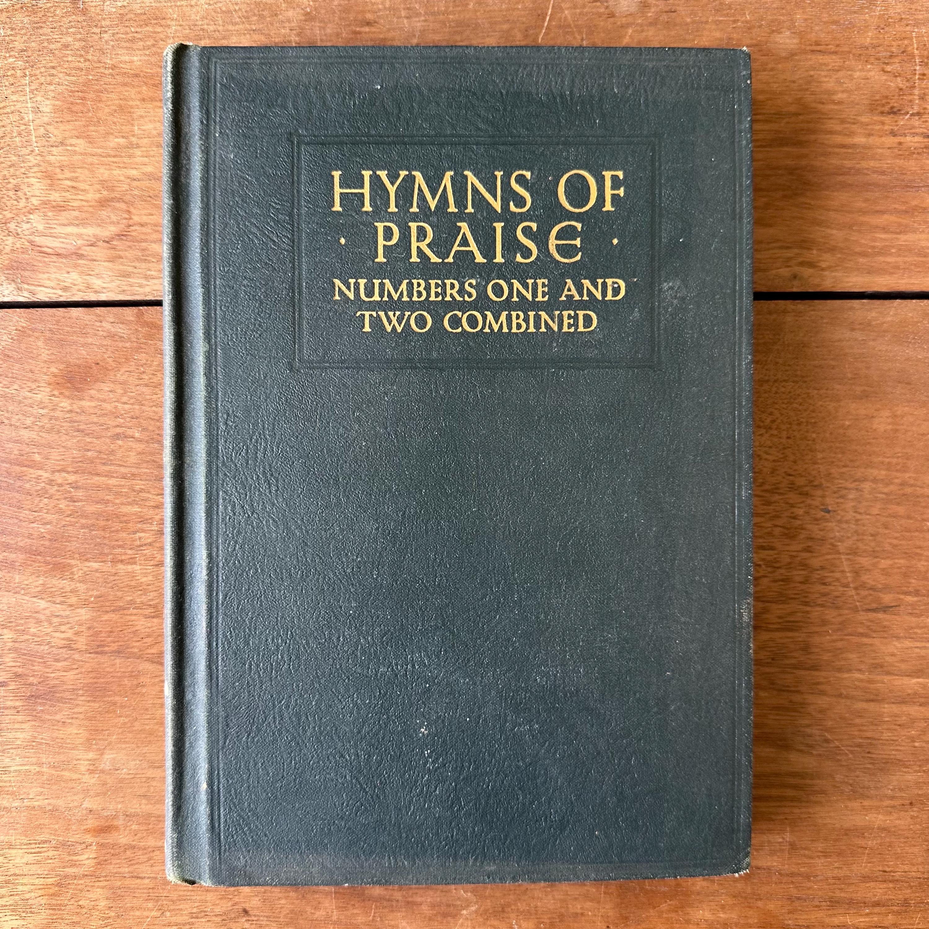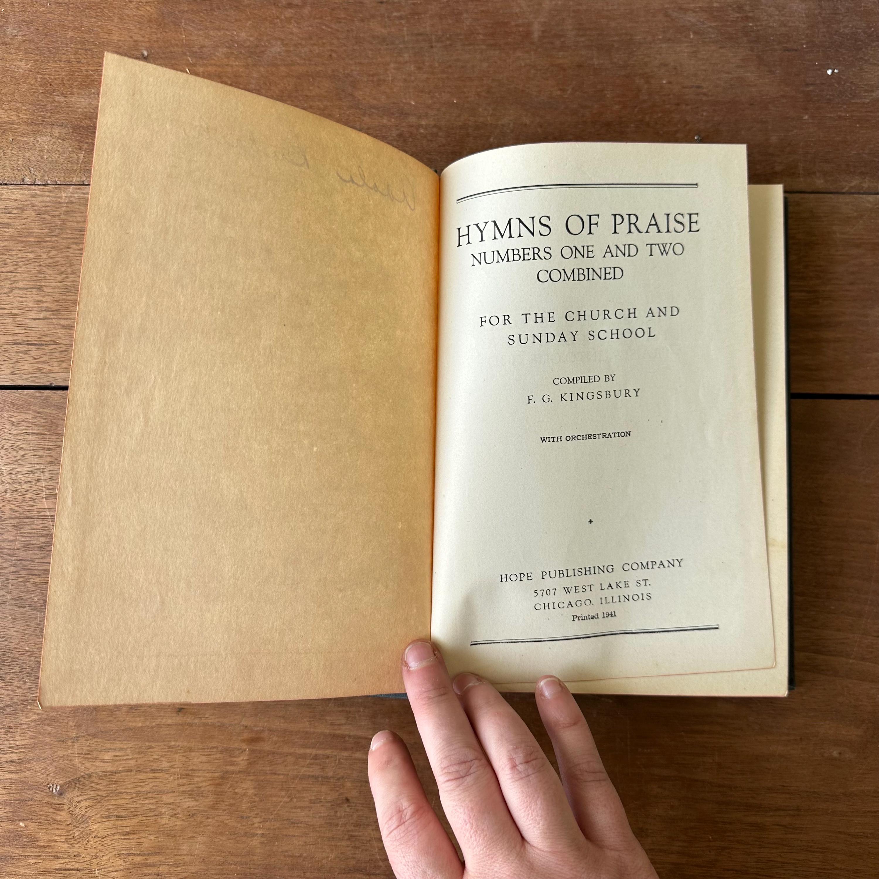 This is the 1944 edition of Hymns of Praise Numbers One and Two Combined For the Church and Sunday School, compiled by F.G. Kingsbury and published by the Hope Publishing Company. It has very dark green covers with gold lettering on both front cover and spine. The back is embossed with the Hope logo. It has red page ends. The pages are unnumbered but there are 447 numbered hymns.