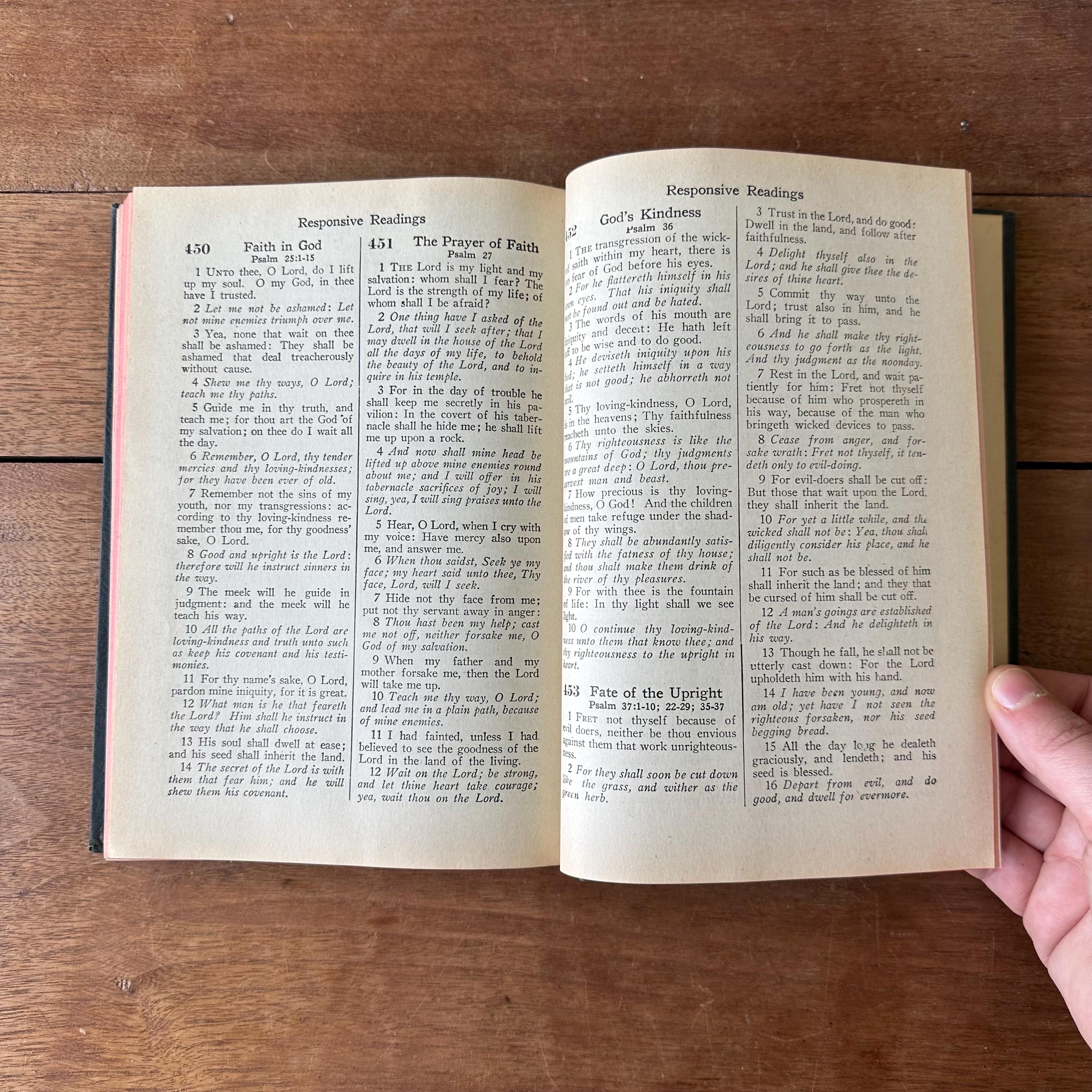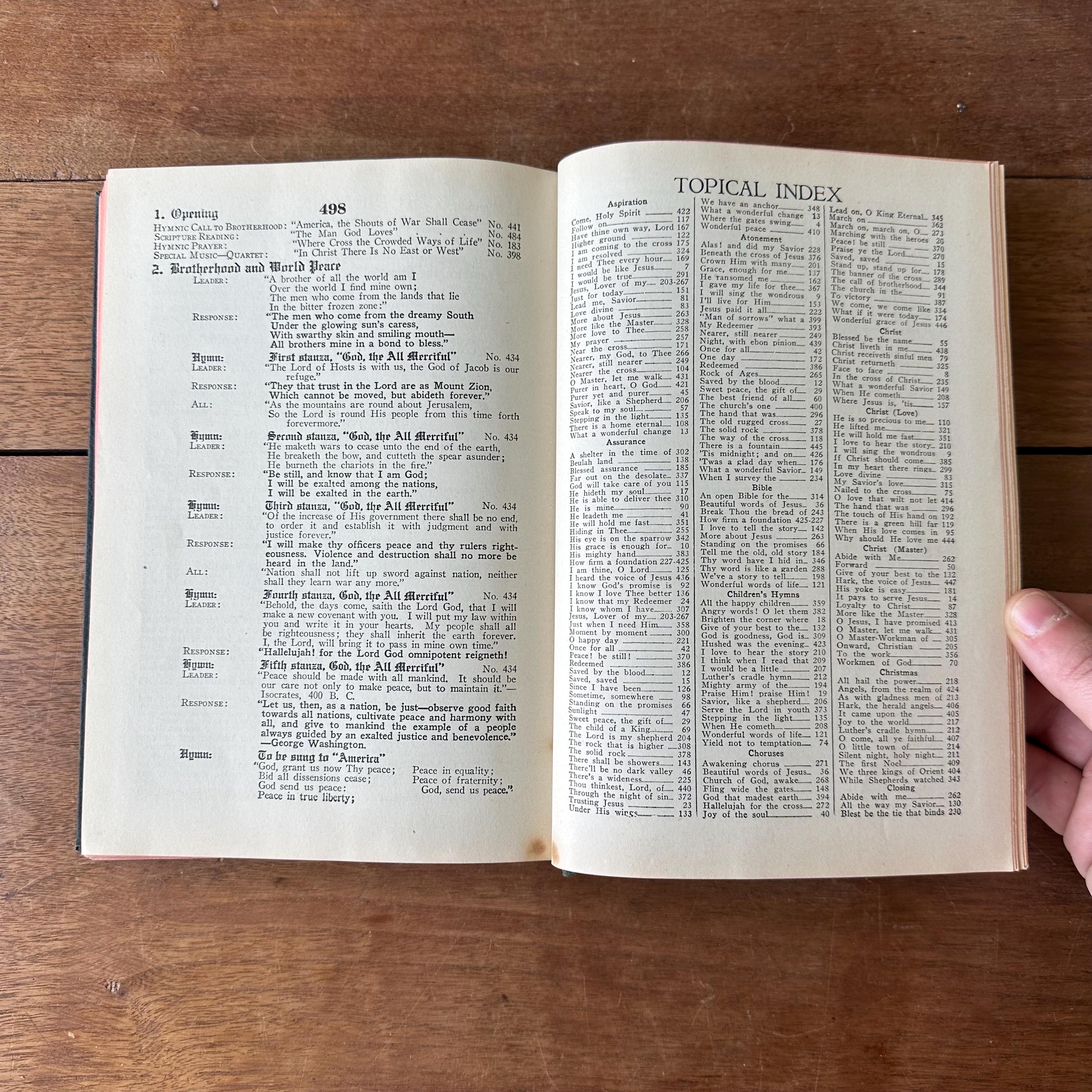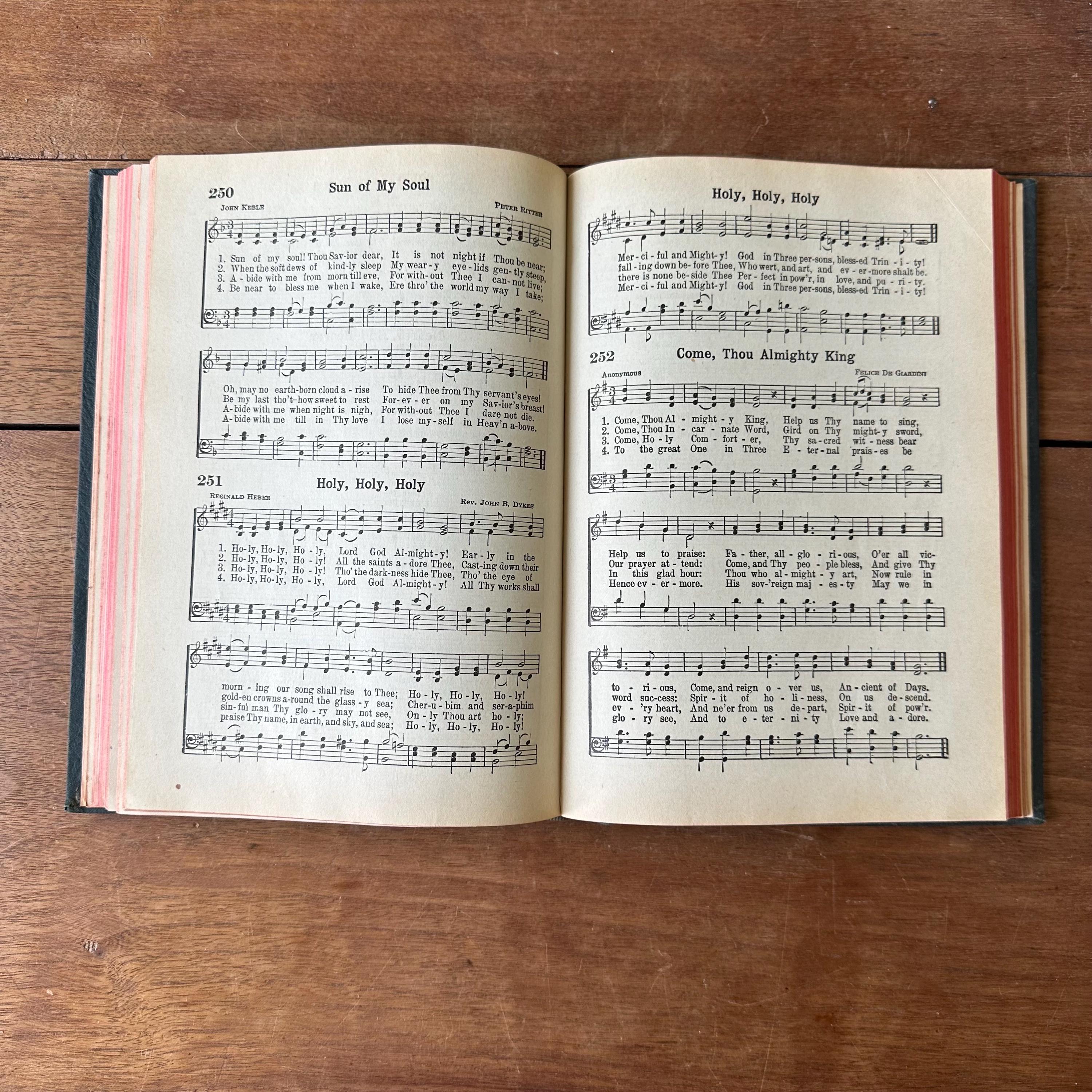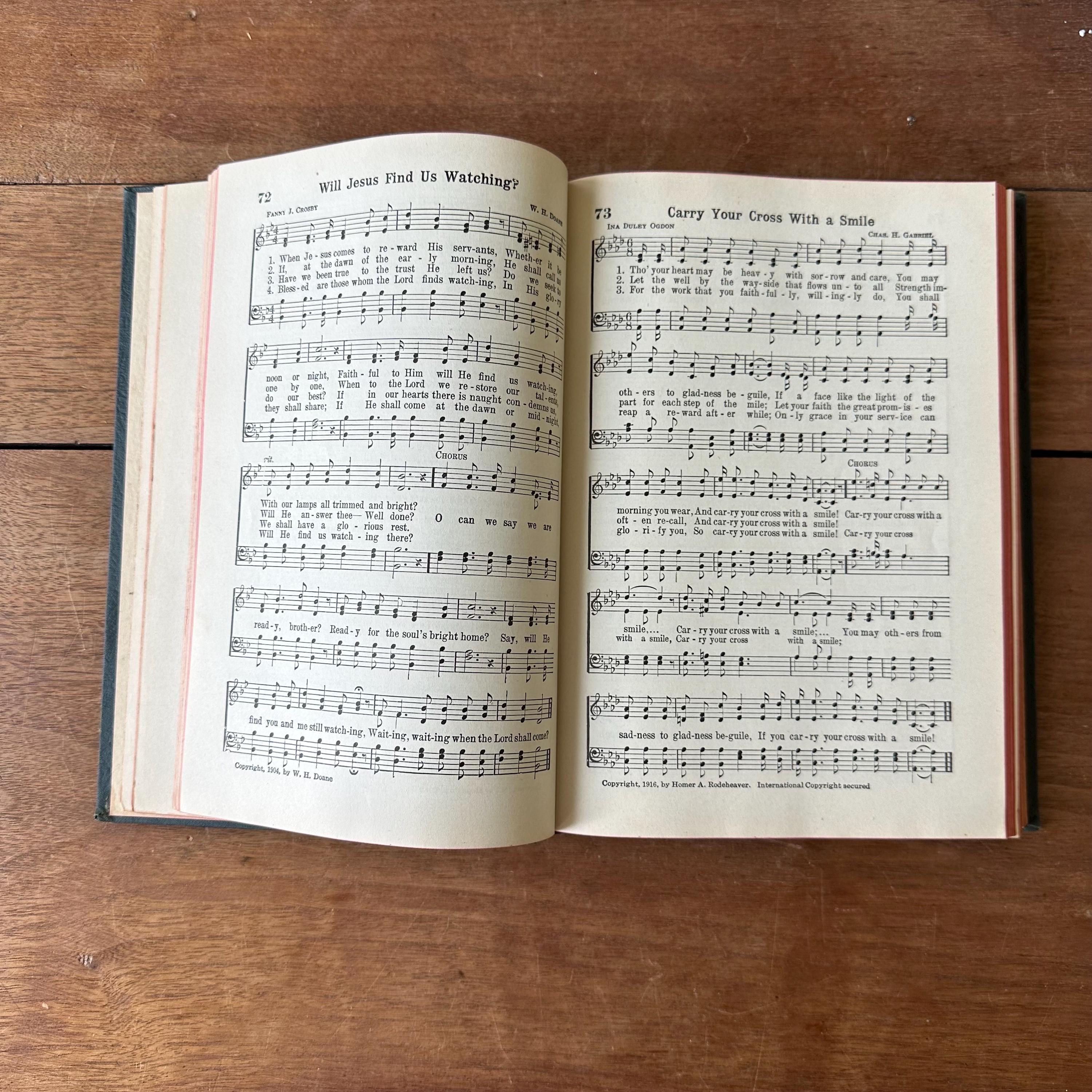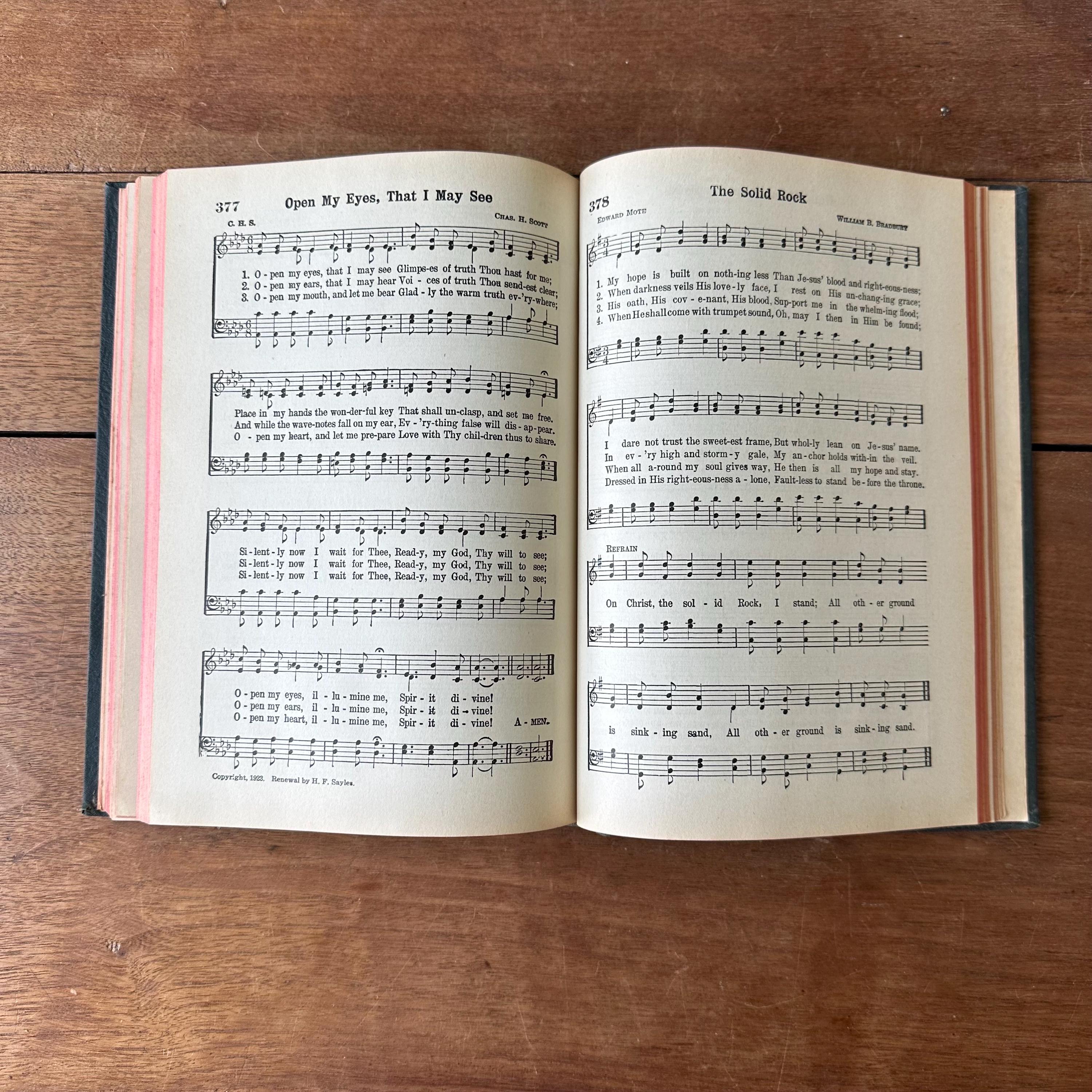 This is the 1944 edition of Hymns of Praise Numbers One and Two Combined For the Church and Sunday School, compiled by F.G. Kingsbury and published by the Hope Publishing Company. It has very dark green covers with gold lettering on both front cover and spine. The back is embossed with the Hope logo. It has red page ends. The pages are unnumbered but there are 447 numbered hymns.