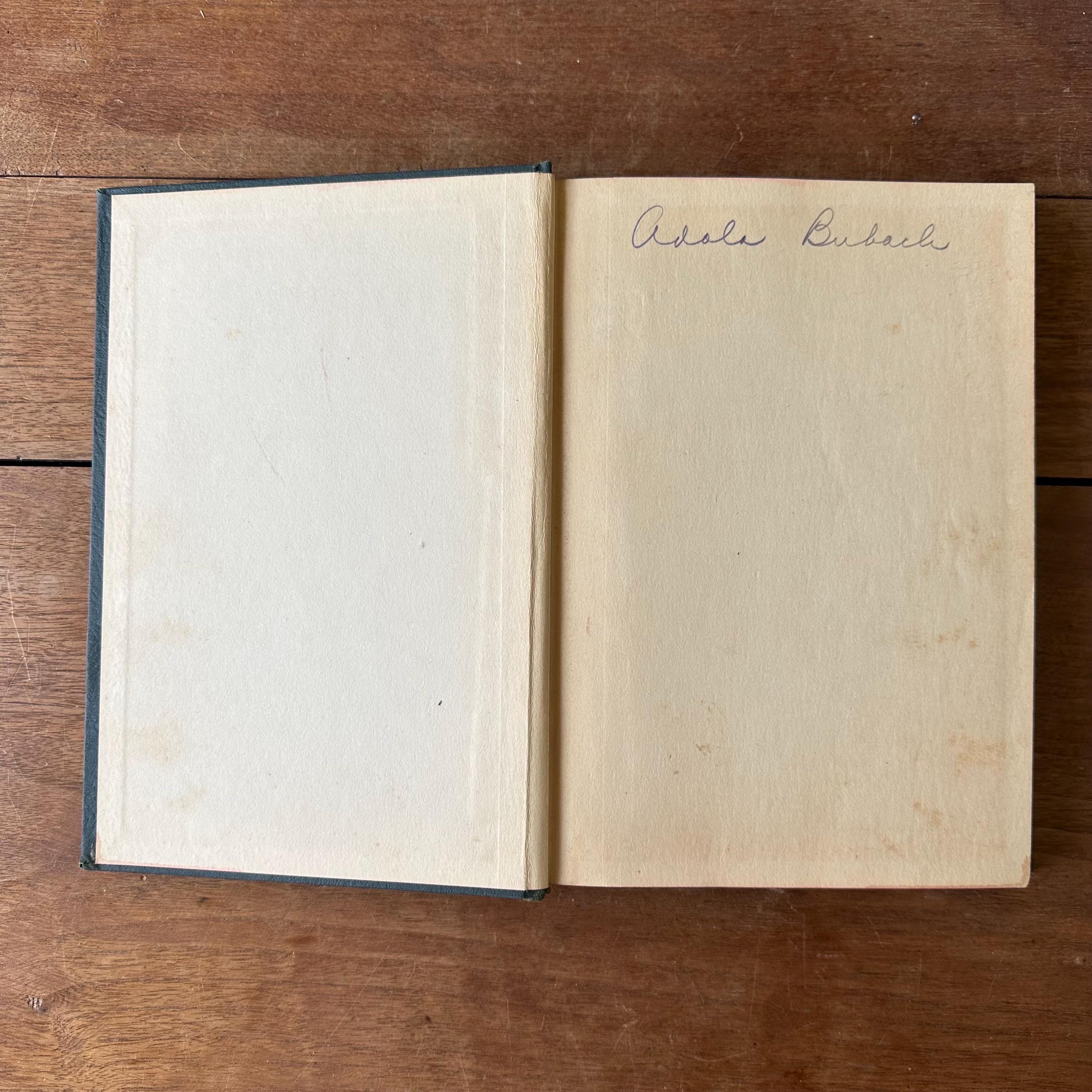 The hymnal is in good vintage condition for its age and use. The covers have general wear with some small staining and fraying to corners and edges. The covers are attached at the spine. Adola Bubach wrote her name in pencil inside the front cover. The page are yellowed.