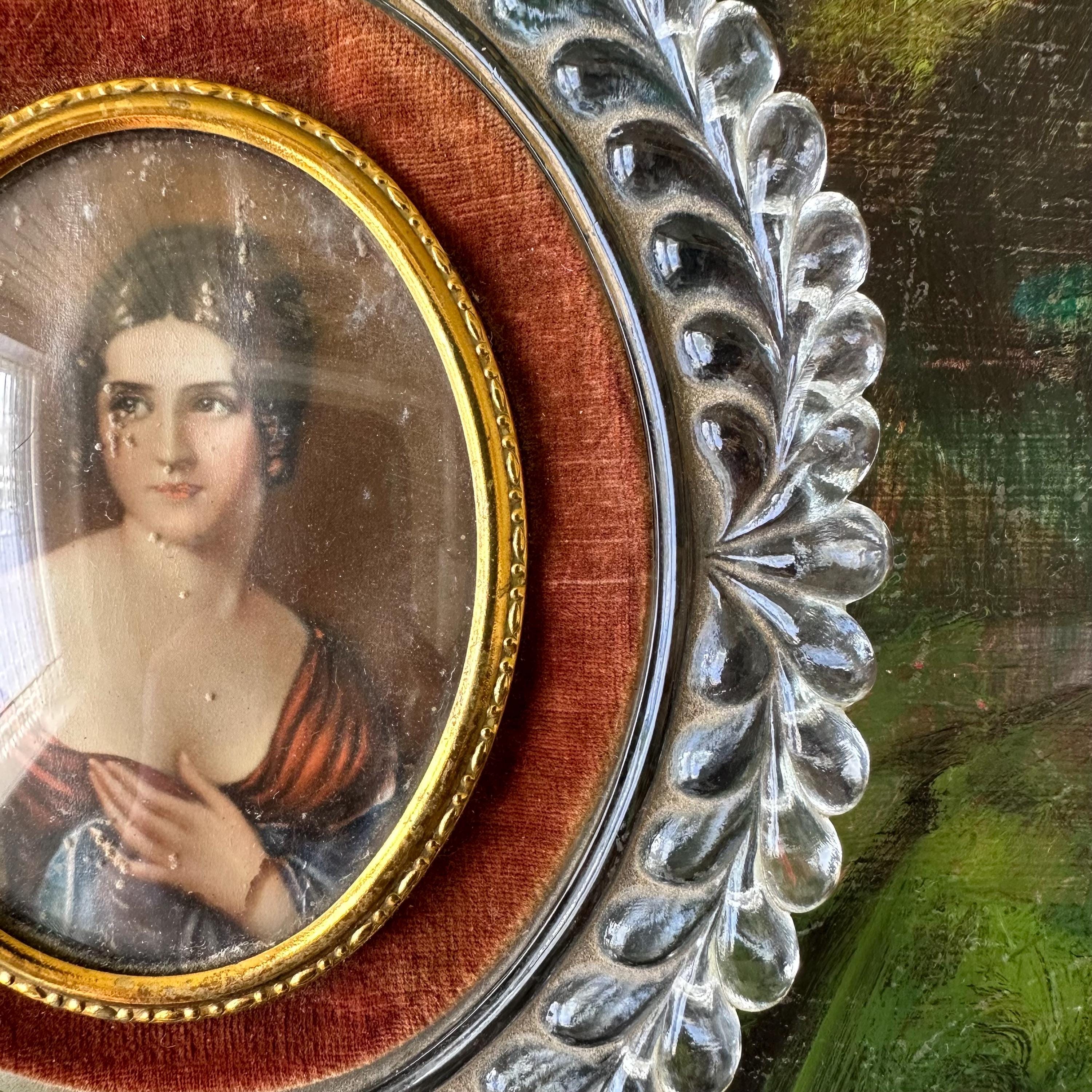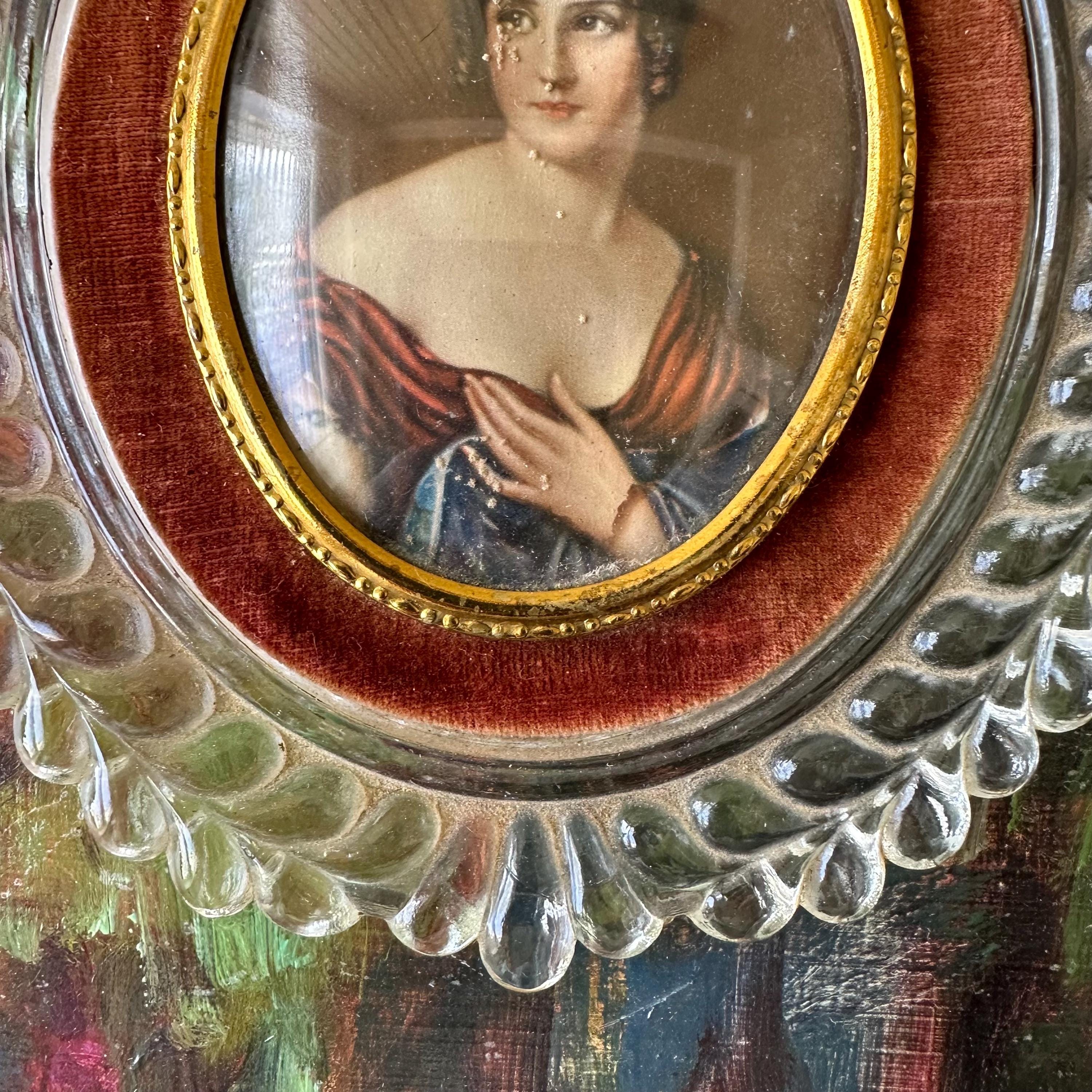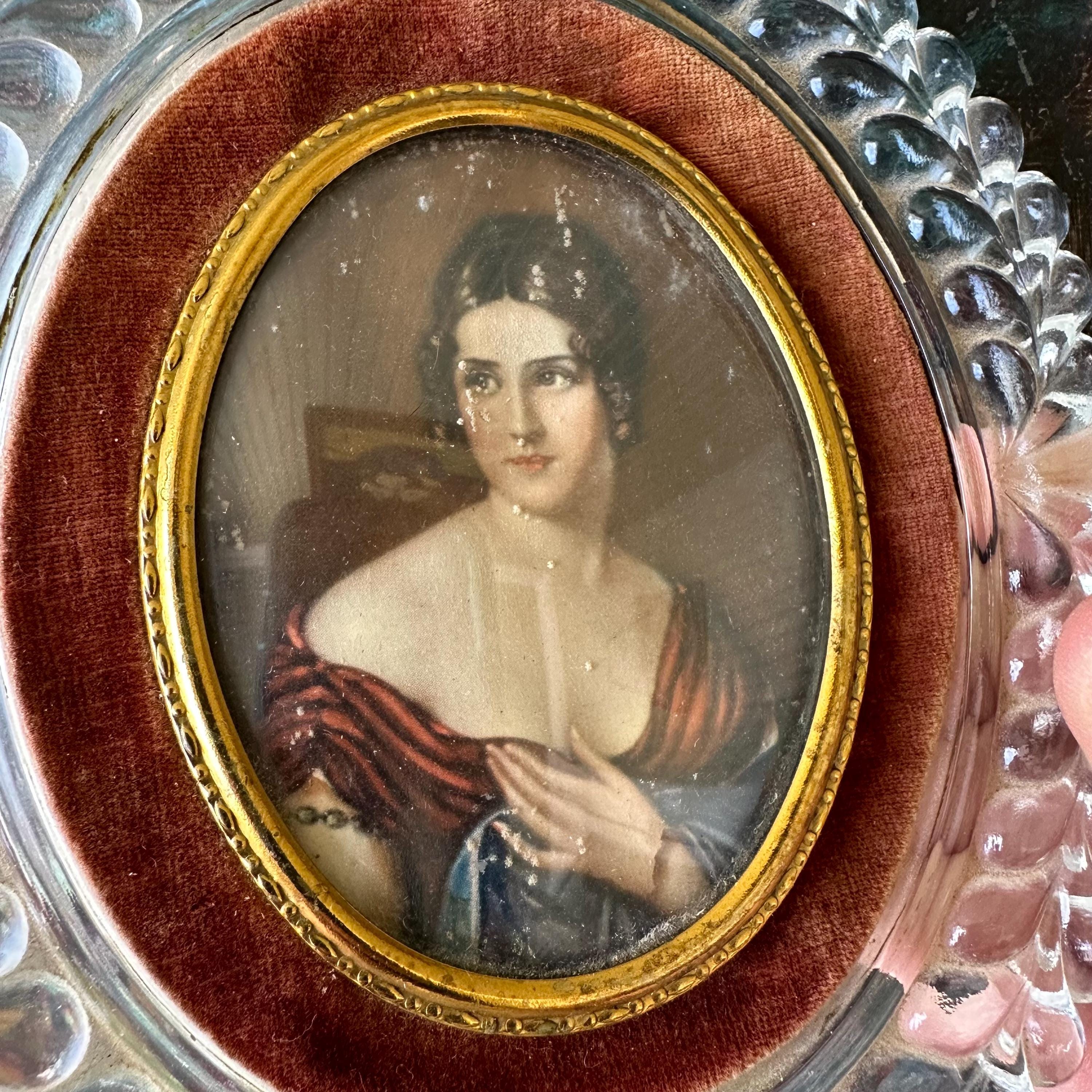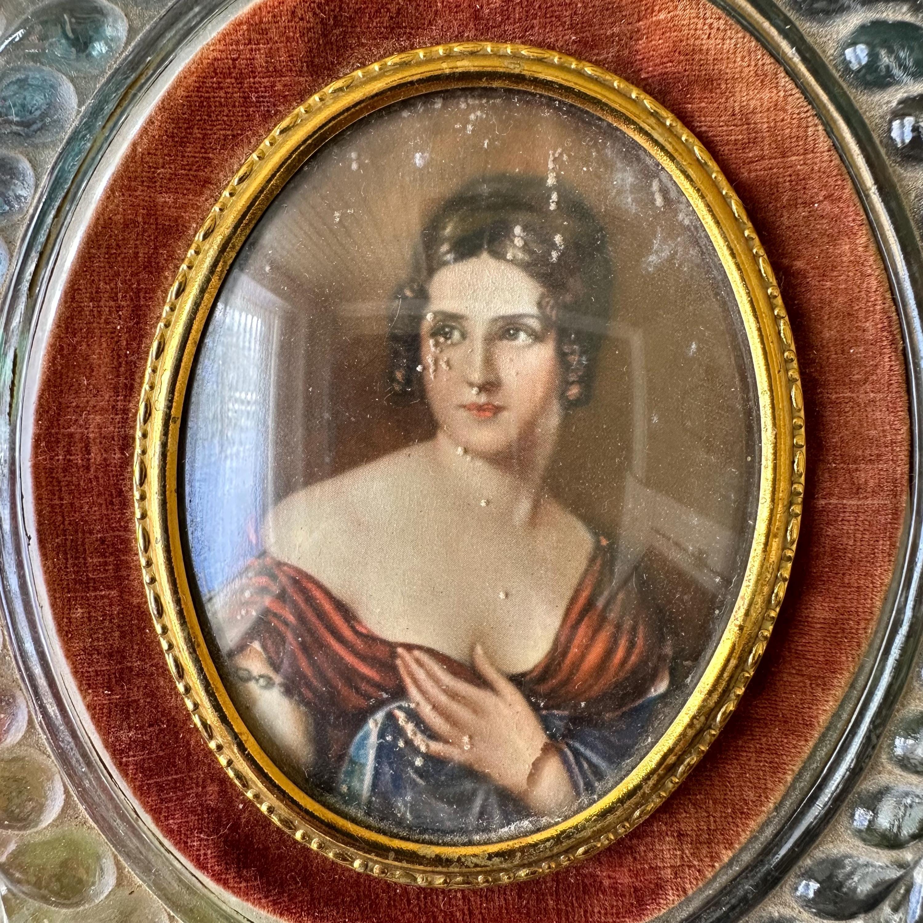 This is a portrait print of Pauline Bonaparte in a glass and velvet frame. The portrait print shows Pauline Bonaparte, Napoleon's sister, looking off to the left in her blue and burgundy gown. The portrait is inset in a thin gold metal frame with slight bubble glass covering. The portrait is surrounded by a border of light burgundy-brown velvet. The frame itself is glass formed to look like large vines with a top flourish. The back has a small hole for hanging the portrait.