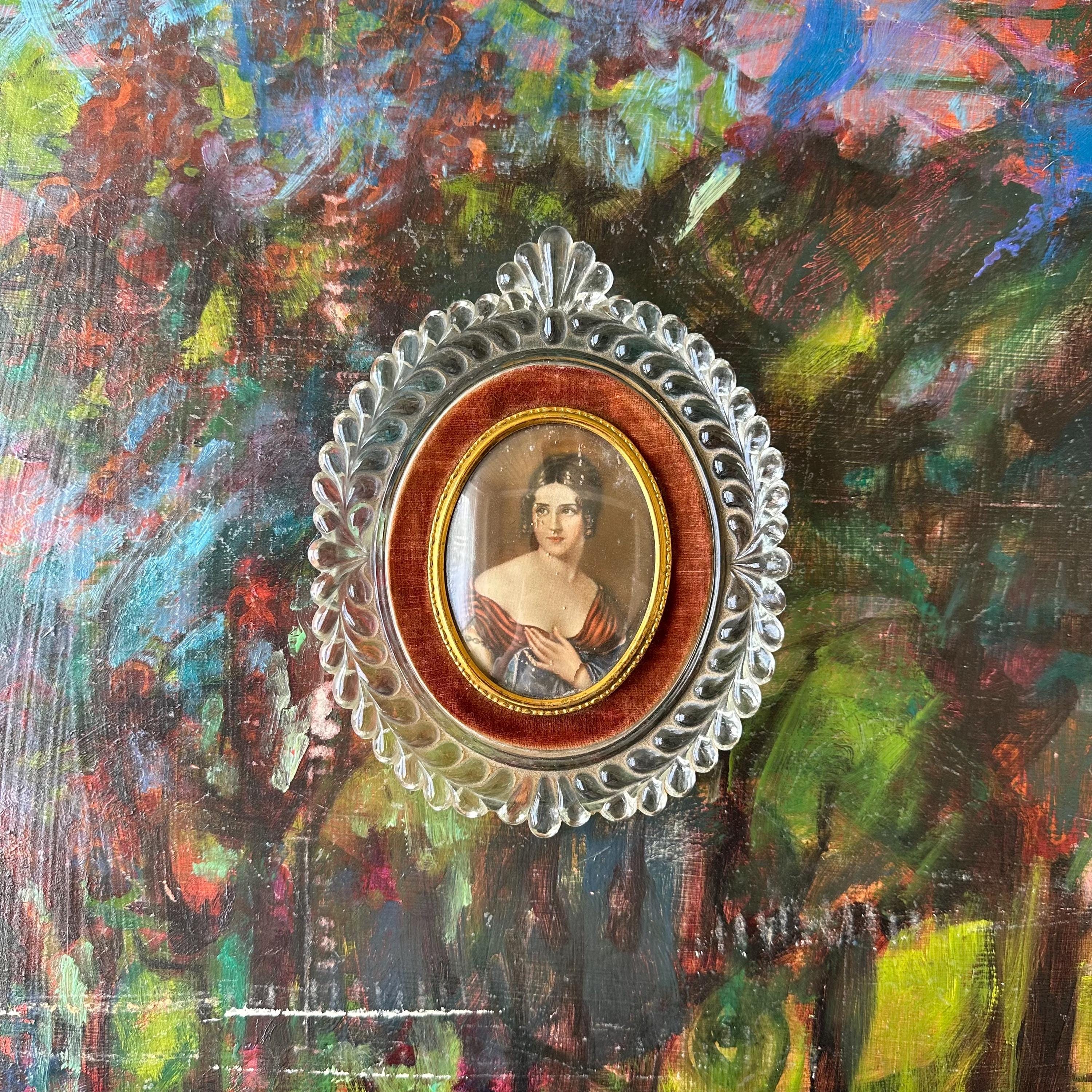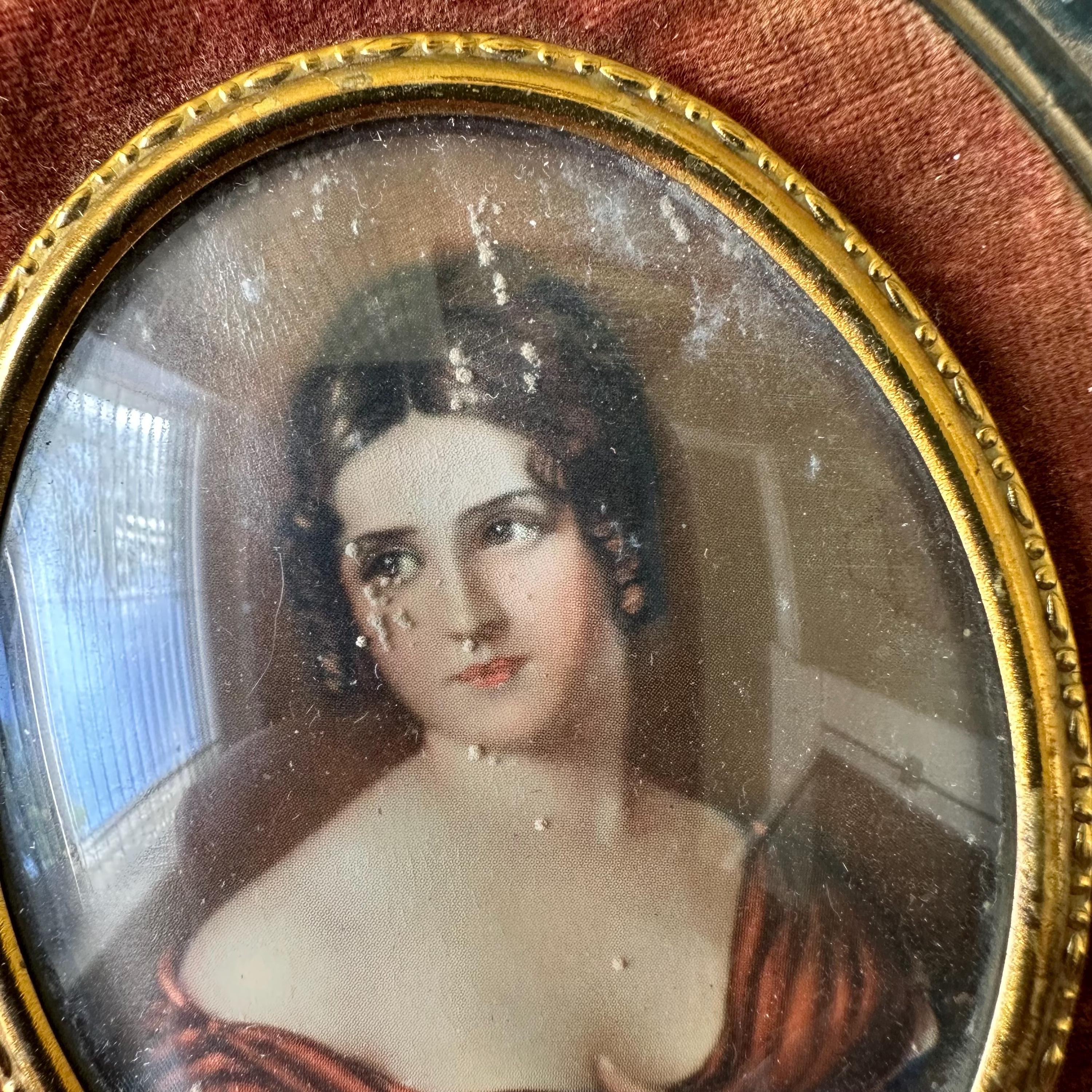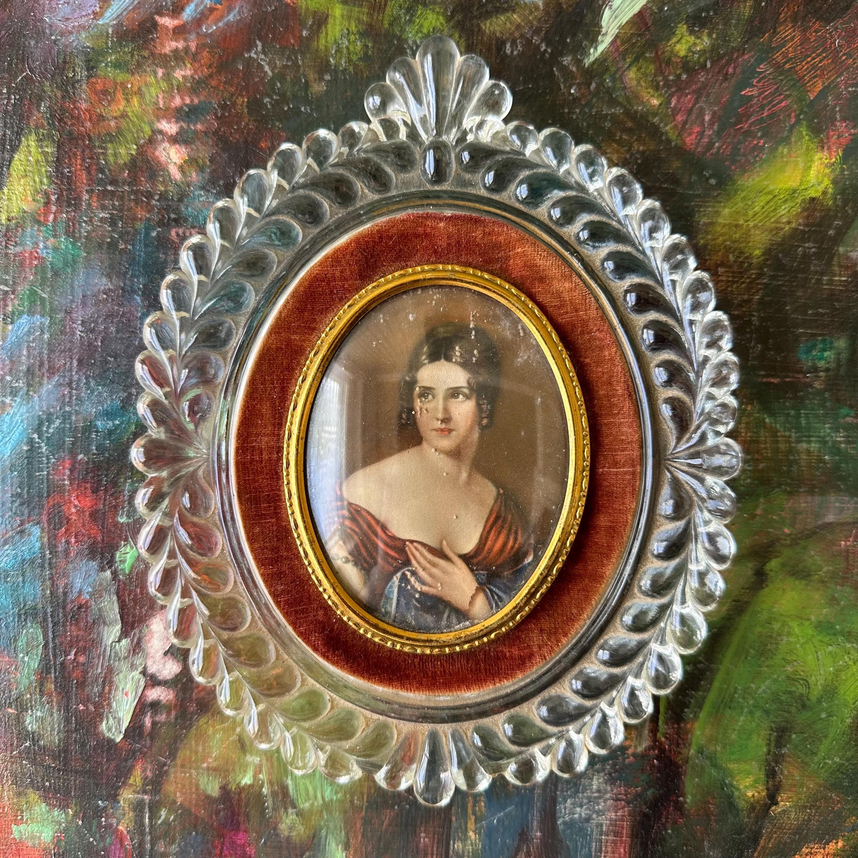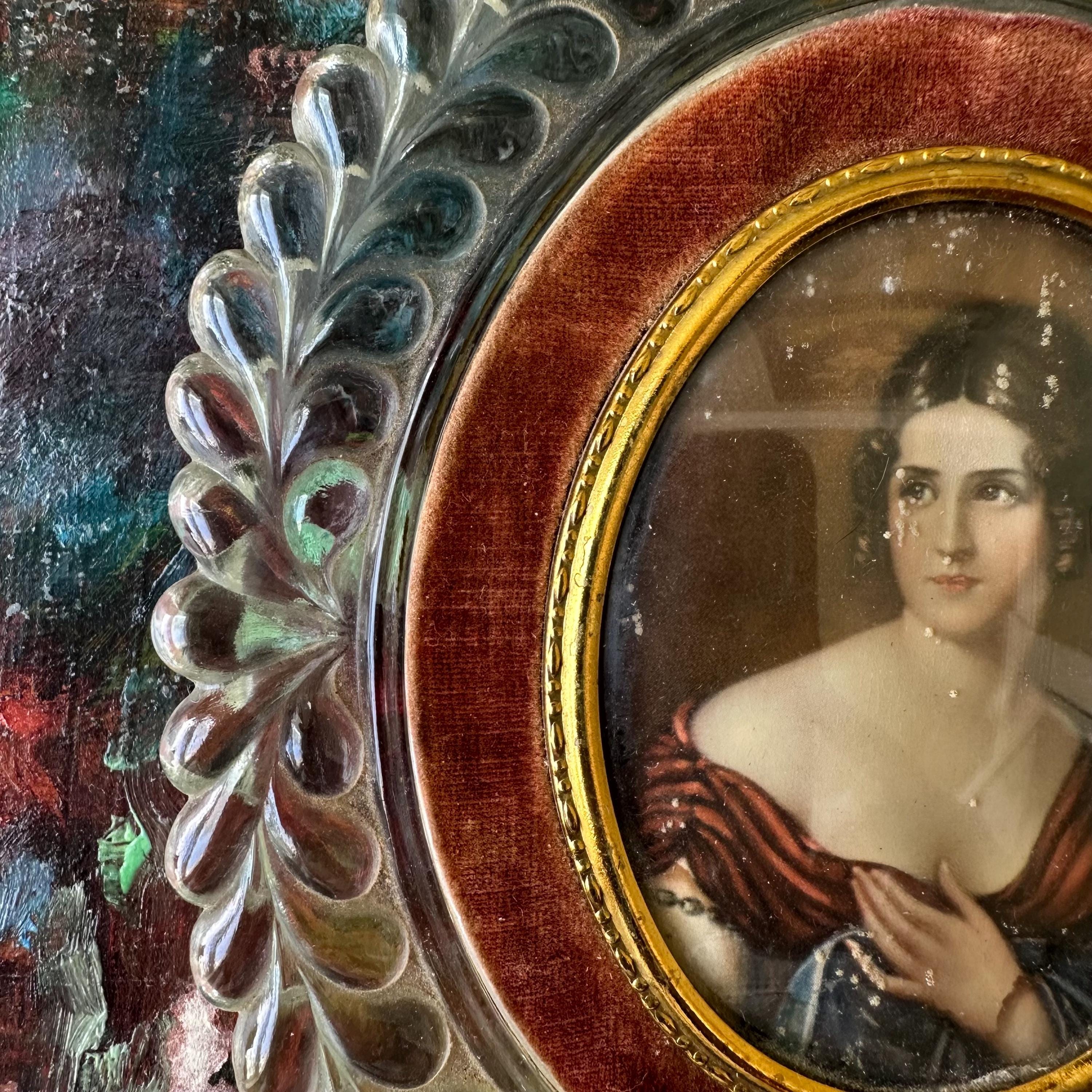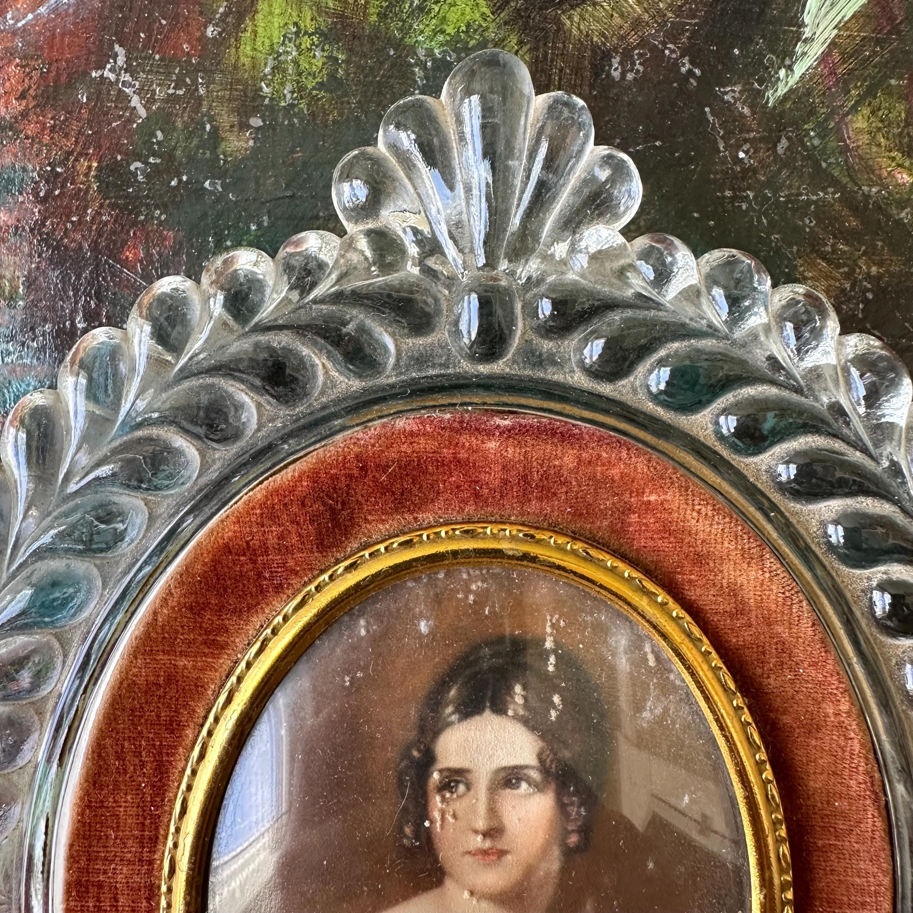 This is a portrait print of Pauline Bonaparte in a glass and velvet frame. The portrait print shows Pauline Bonaparte, Napoleon's sister, looking off to the left in her blue and burgundy gown. The portrait is inset in a thin gold metal frame with slight bubble glass covering. The portrait is surrounded by a border of light burgundy-brown velvet. The frame itself is glass formed to look like large vines with a top flourish. The back has a small hole for hanging the portrait.