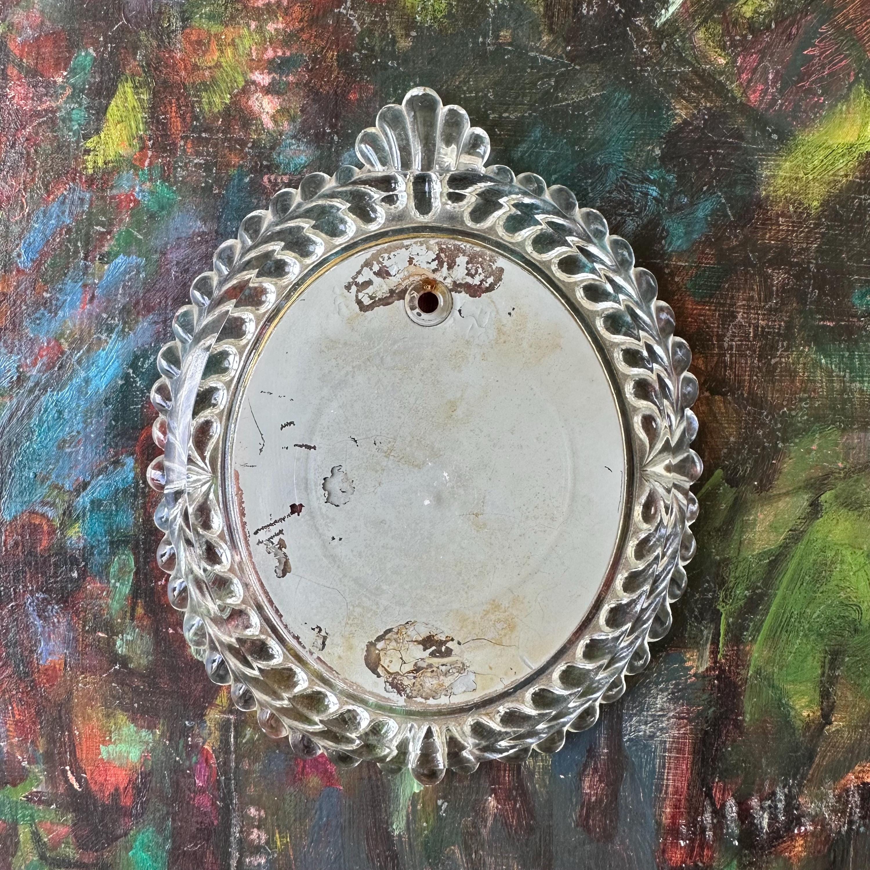 The portrait and frame are in good vintage condition for their age and use. The frame glass has some slight discoloration around the edge of the inner oval. There are no chips or cracks to the glass. The velvet is in good condition with some slight fading. The portrait glass is clear. The portrait under the glass has some areas of discoloration with a slight wave to the print.