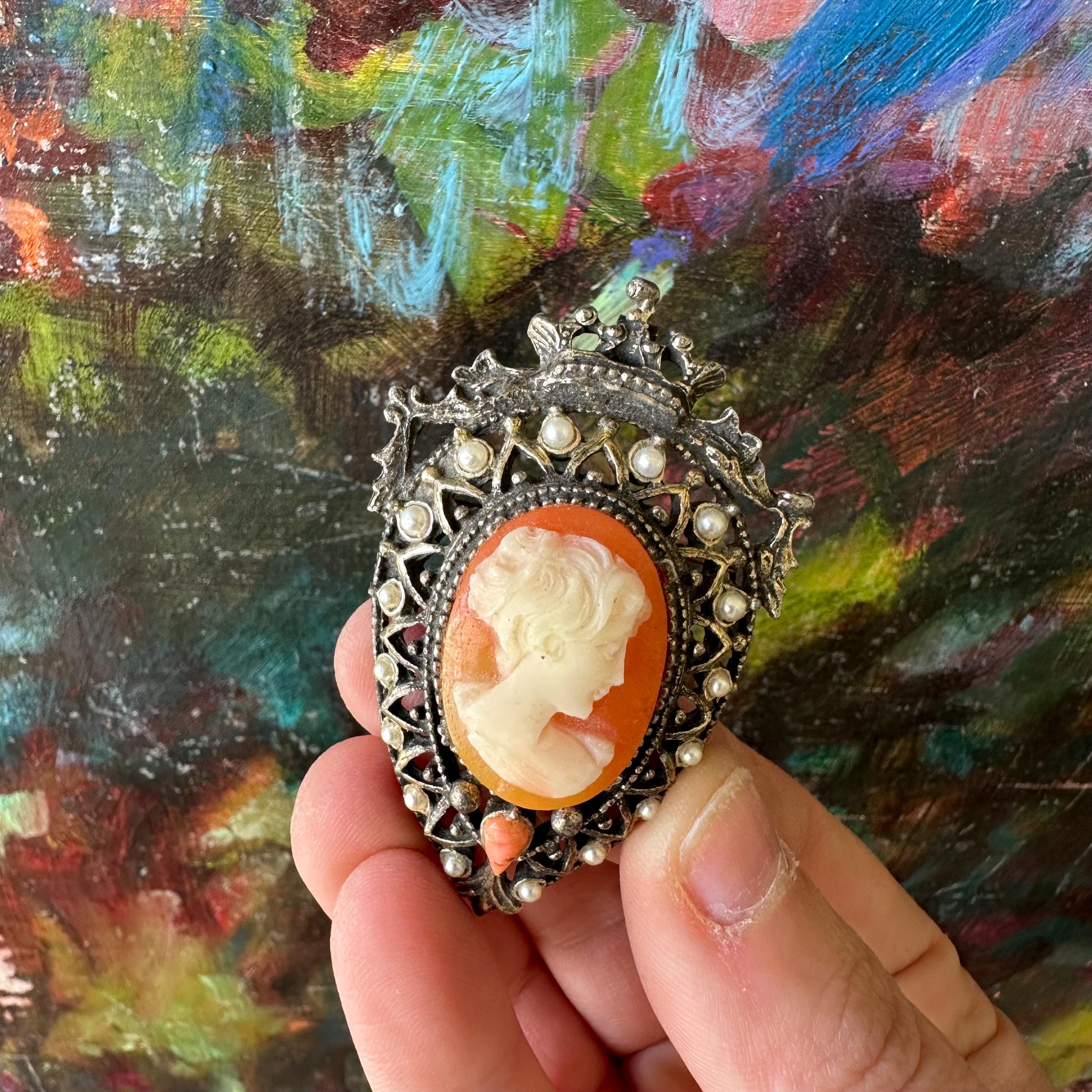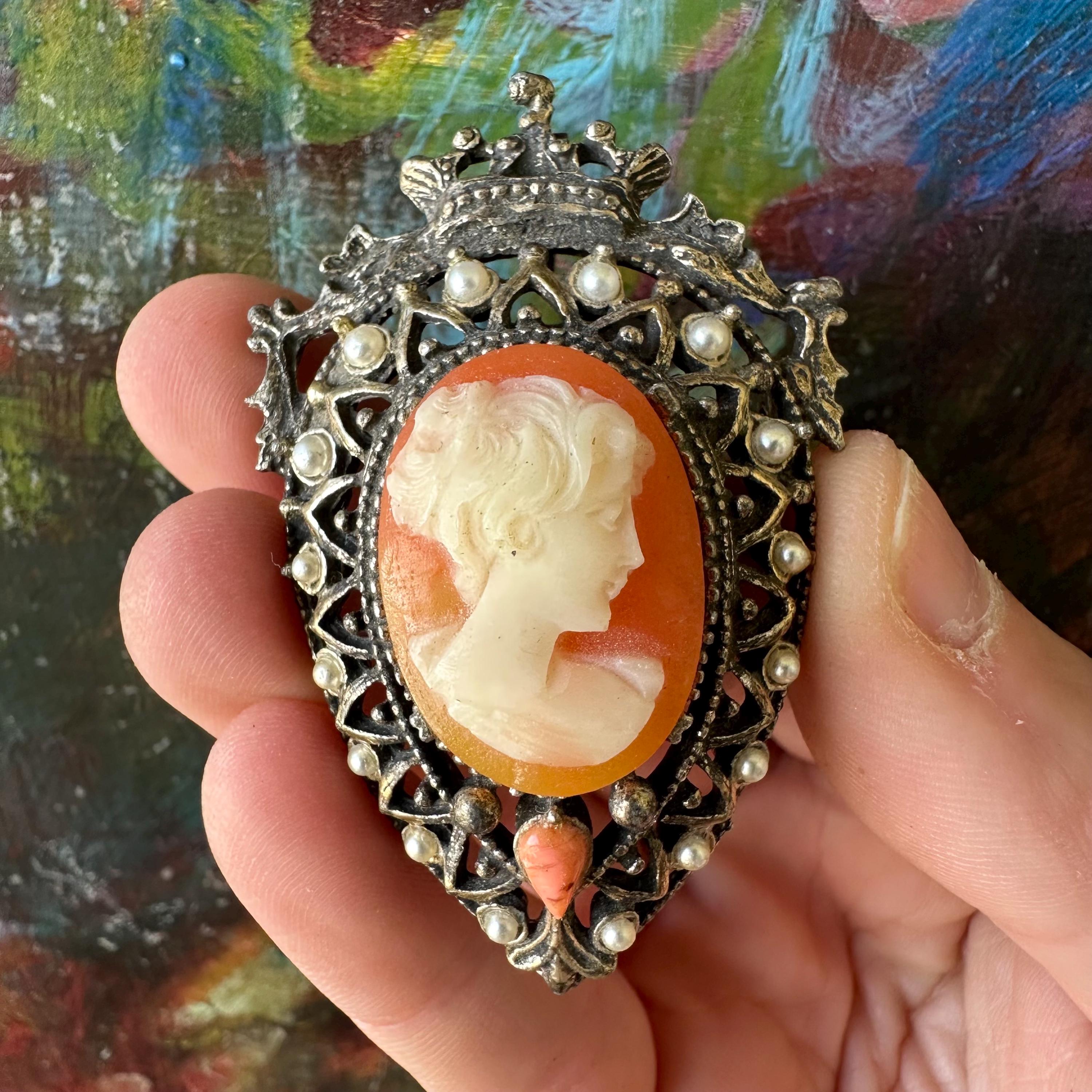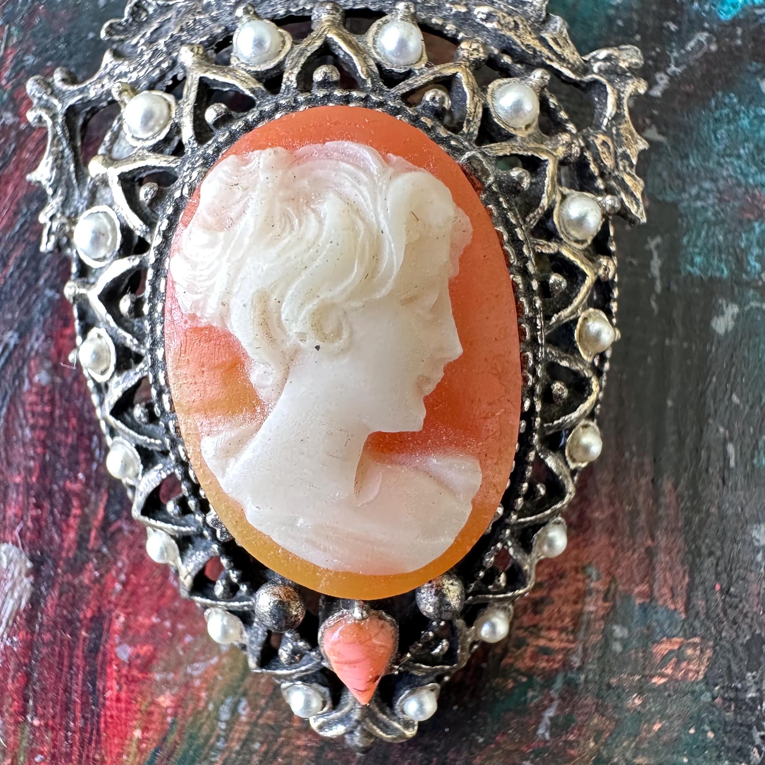 This is a silver metal and faux pearl cameo brooch from Florenza. The brooch is shaped like an upside-down teardrop with a crown and ribbon banner at the top. The cameo is white on a coral or pink colored background. Below the cameo is another pink upside-down teardrop shaped stone. The cameo is surrounded by faux pearls in the outer border. The back has both a bar pin to wear it as a brooch and a loop to turn it into a pendant.