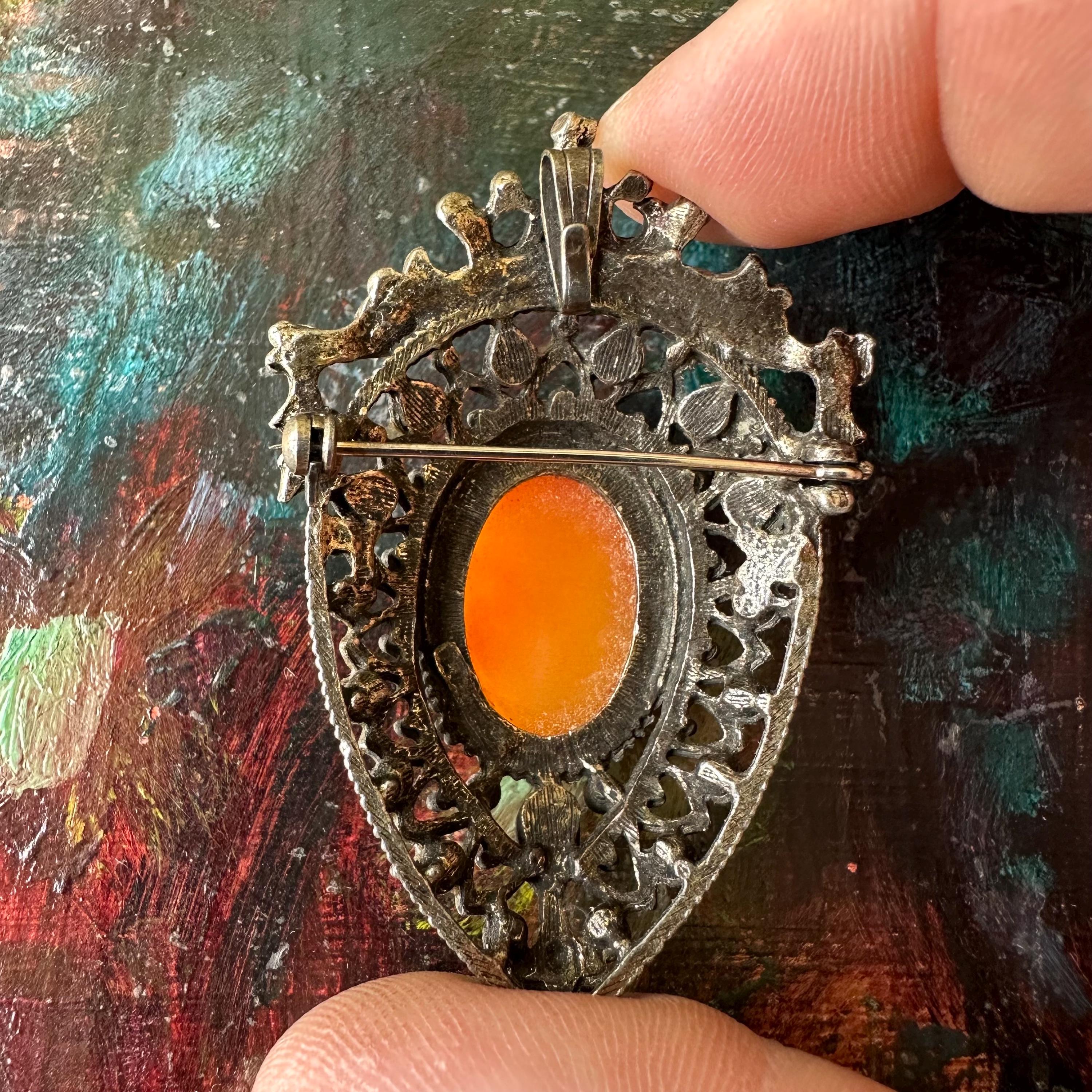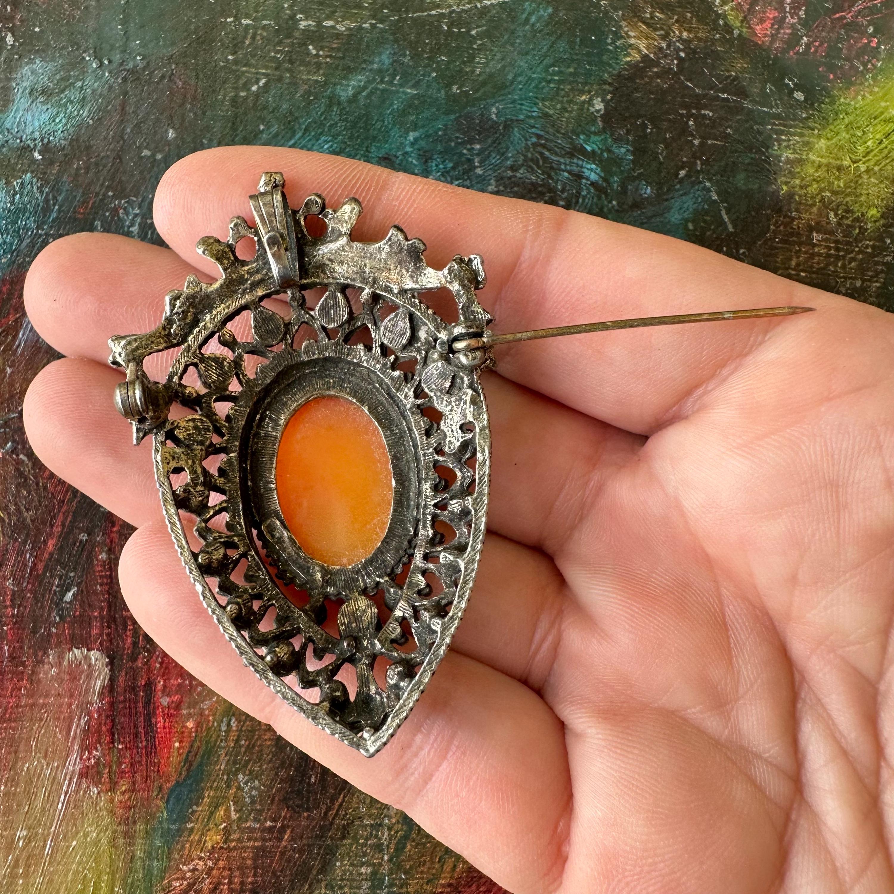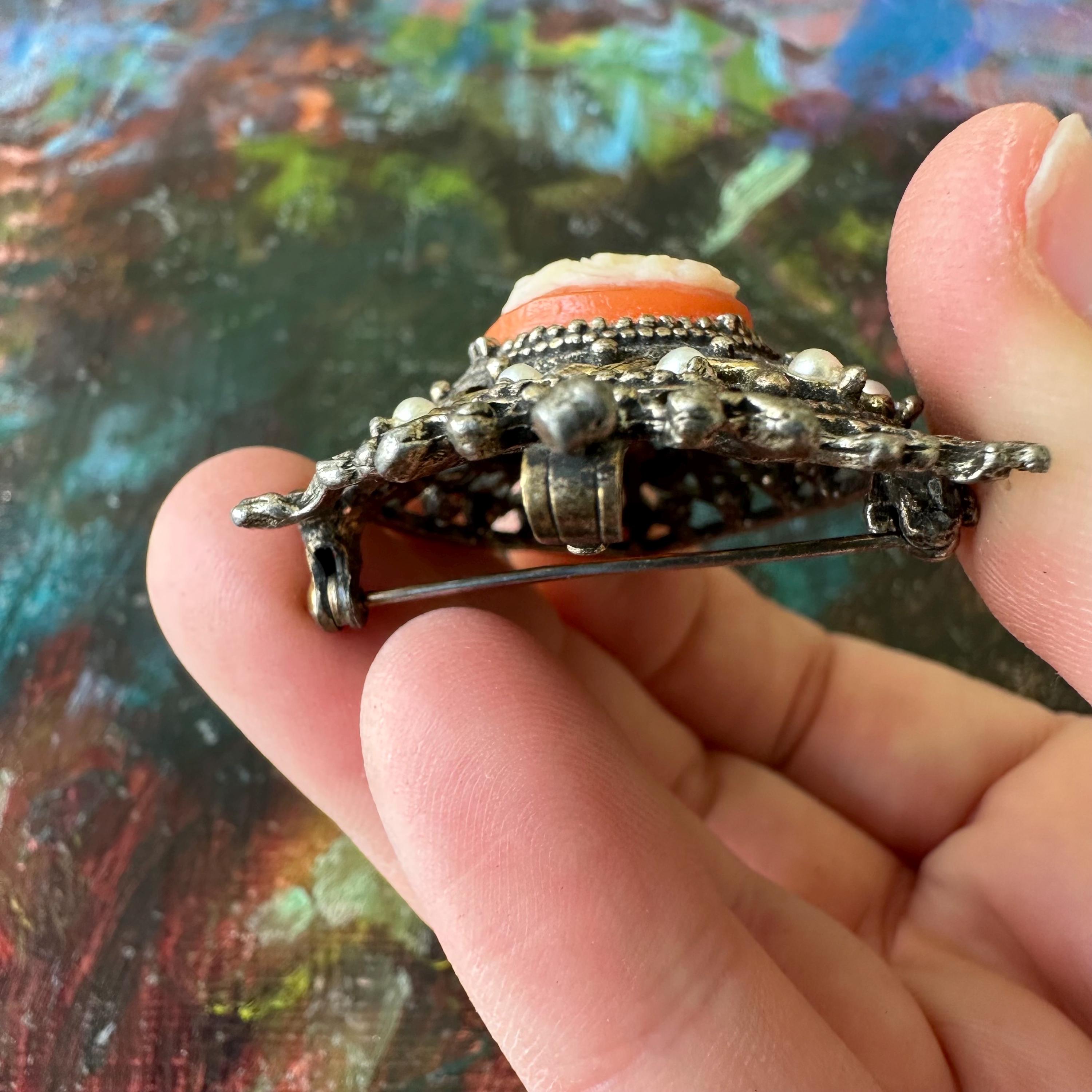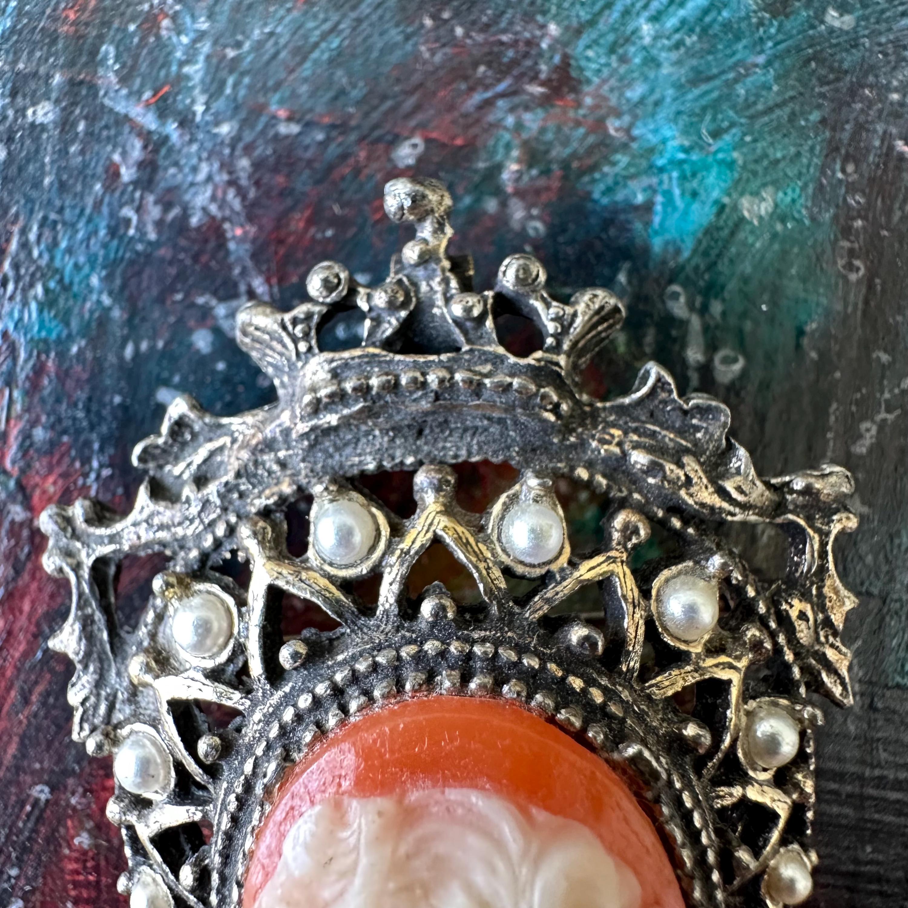 This is a silver metal and faux pearl cameo brooch from Florenza. The brooch is shaped like an upside-down teardrop with a crown and ribbon banner at the top. The cameo is white on a coral or pink colored background. Below the cameo is another pink upside-down teardrop shaped stone. The cameo is surrounded by faux pearls in the outer border. The back has both a bar pin to wear it as a brooch and a loop to turn it into a pendant.