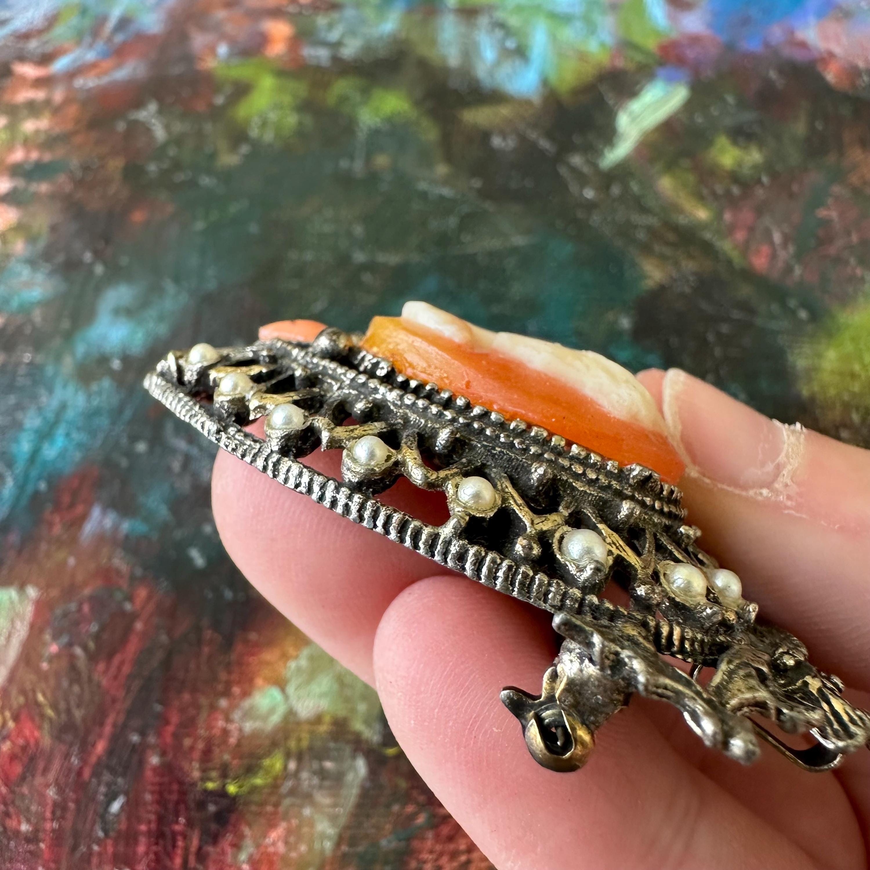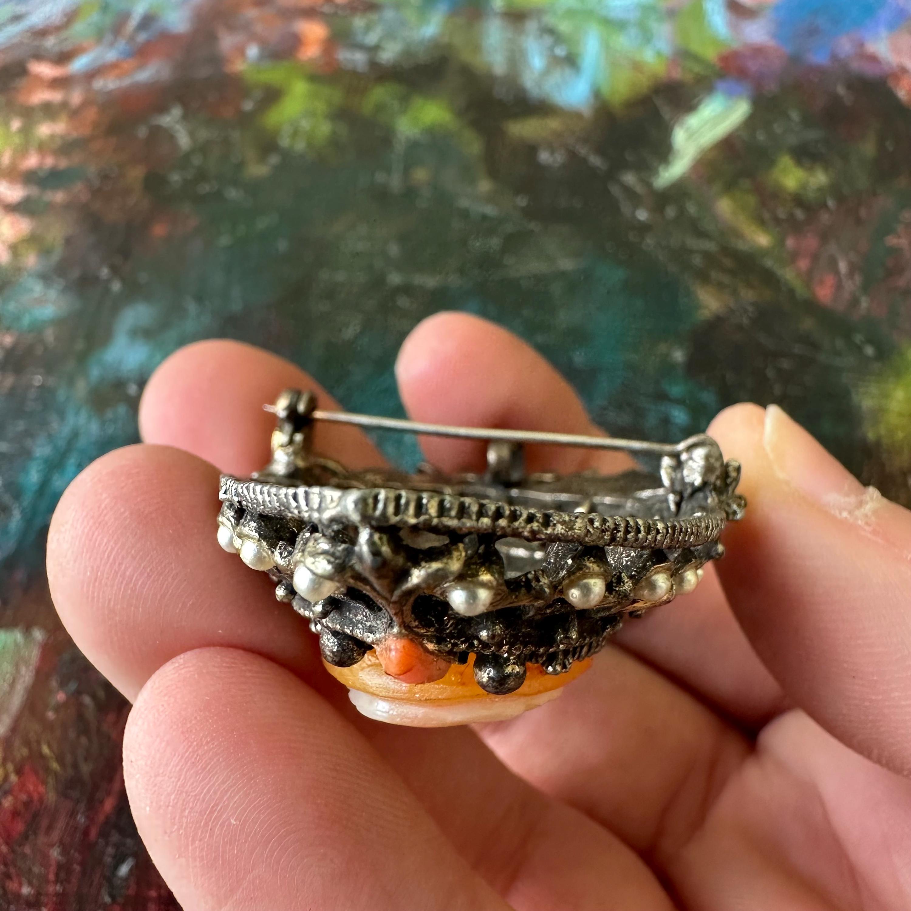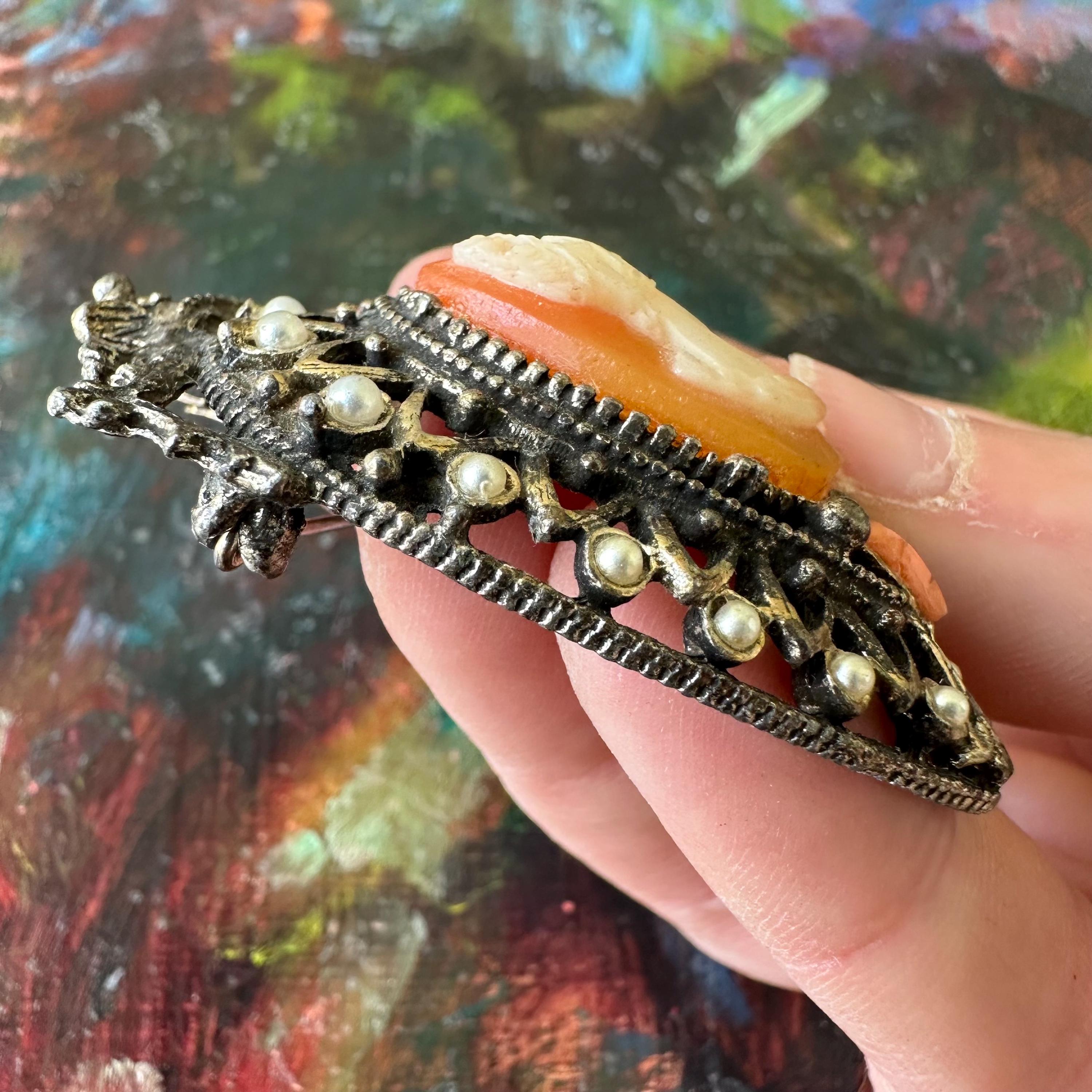 The brooch is in great vintage condition for its age and use. The metal has darkened, giving it a lovely patina. The stones are all intact with no missing stones or pearls. Florenza is marked on the back but it has nearly all faded away.